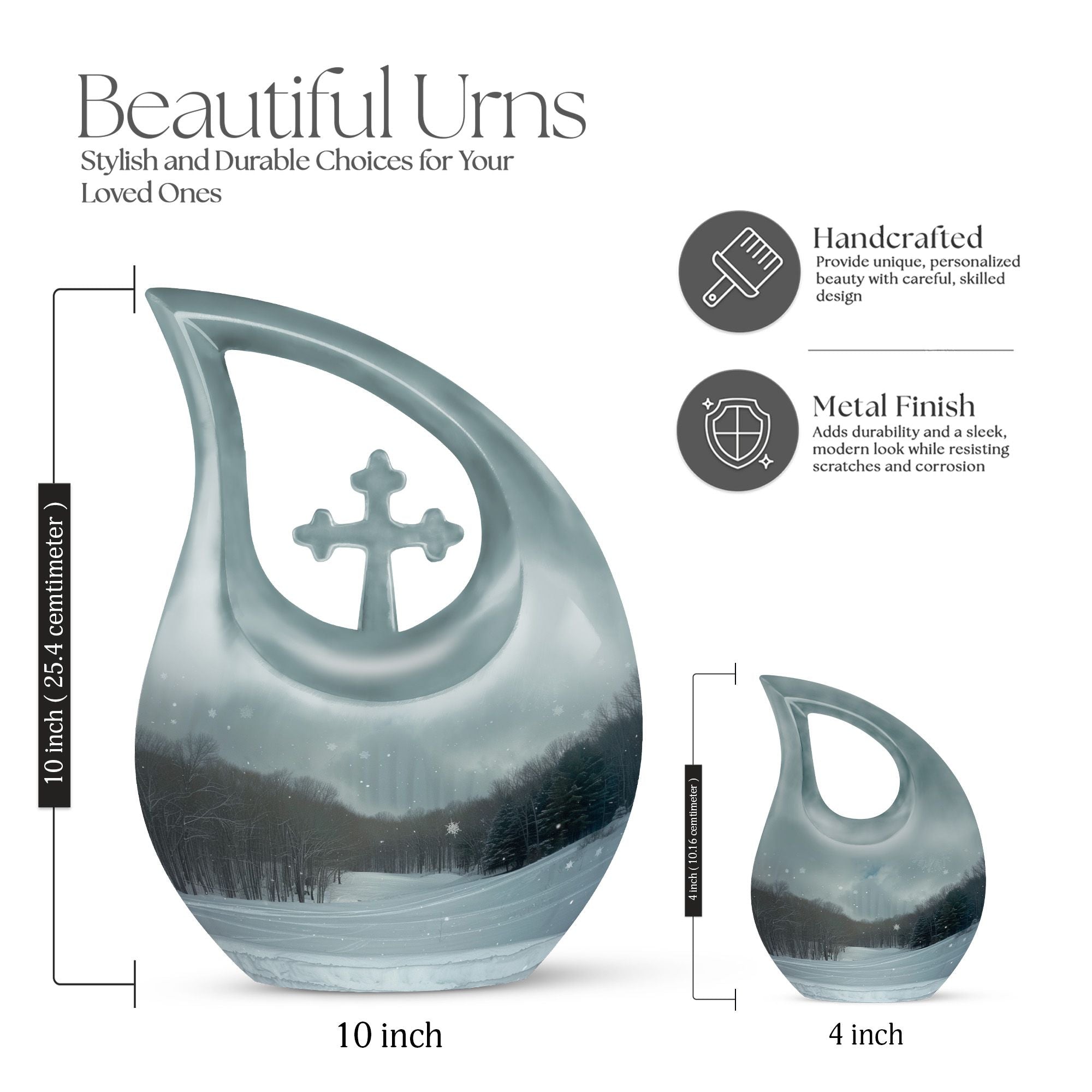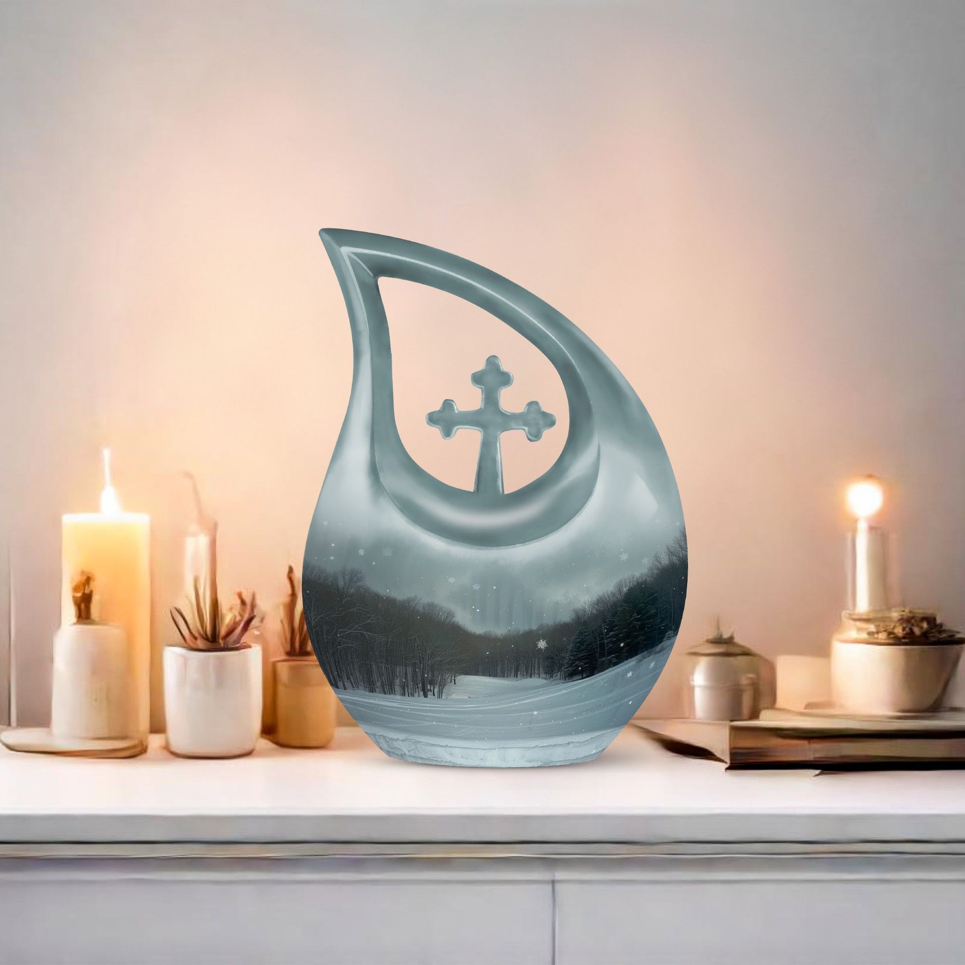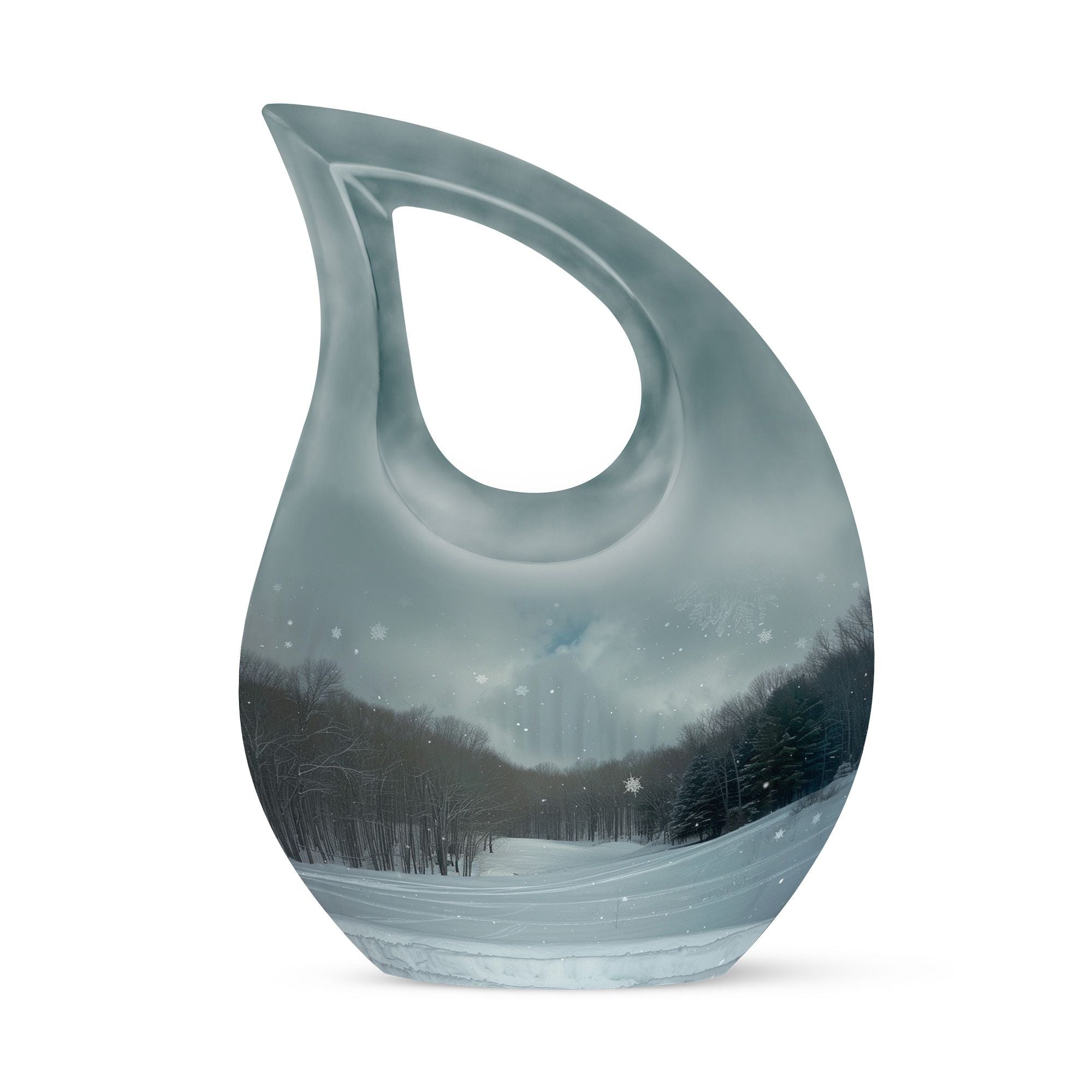 Expertly handcrafted from durable aluminum, this urn blends art with function. The shimmering snow scene and subtle hues add a touch of serenity to any room, making it suitable for home display or memorial services. This large urn for adult ashes is meticulously designed for long-lasting preservation, offering both strength and elegance. Its polished finish and sturdy build make it one of the most exquisite large human urns for cherished memories.