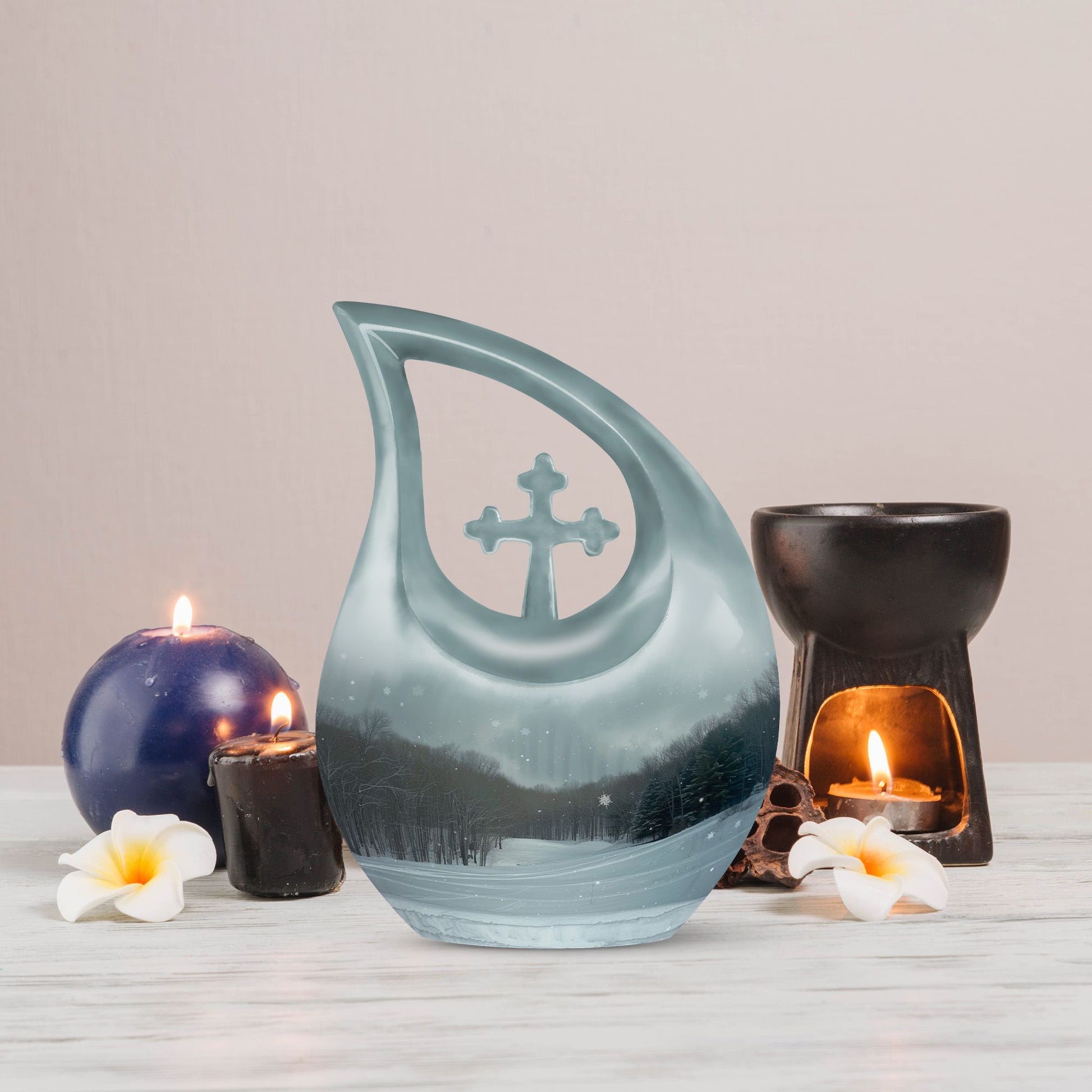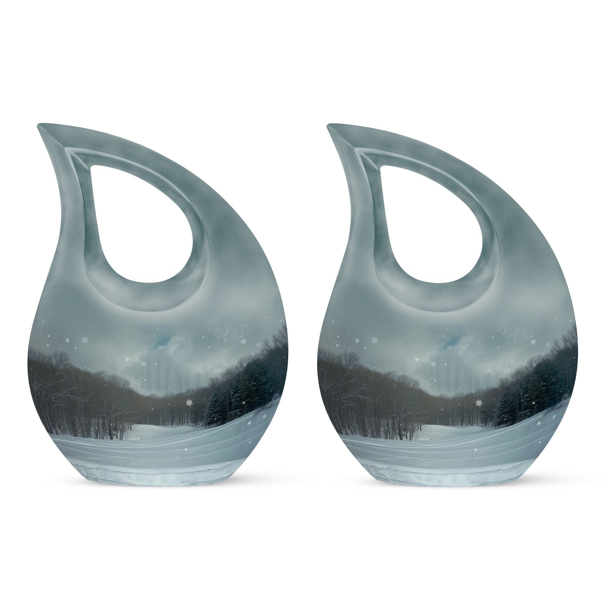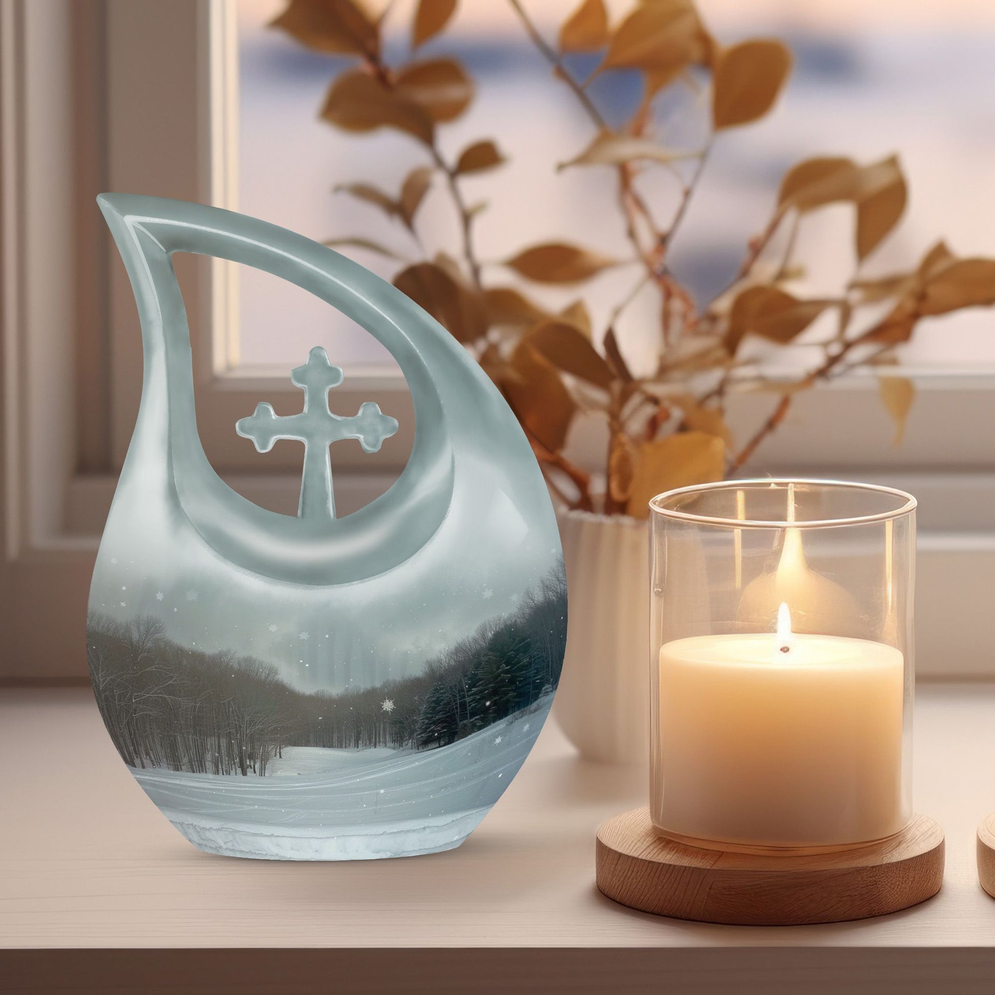 Expertly handcrafted from durable aluminum, this urn blends art with function. The shimmering snow scene and subtle hues add a touch of serenity to any room, making it suitable for home display or memorial services. This large urn for adult ashes is meticulously designed for long-lasting preservation, offering both strength and elegance. Its polished finish and sturdy build make it one of the most exquisite large human urns for cherished memories.