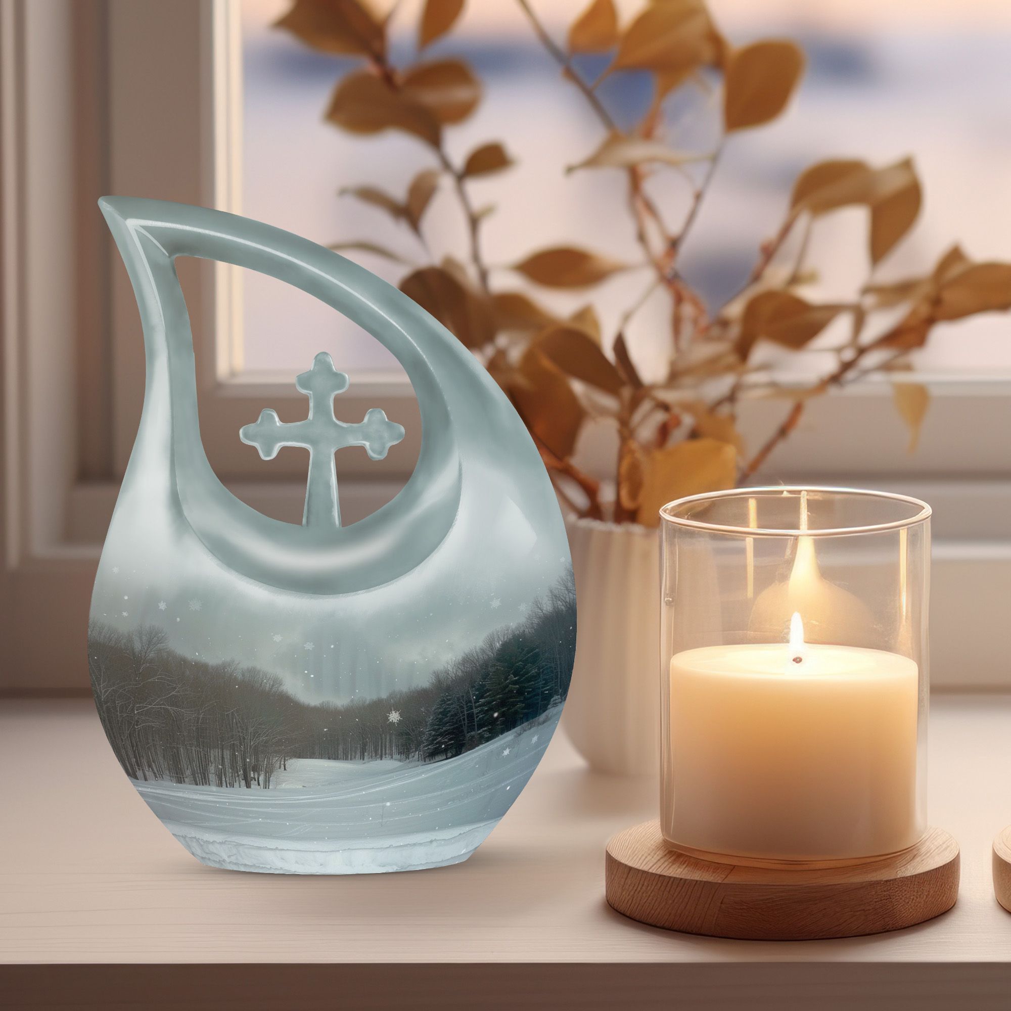 Let the beauty of the winter season symbolize eternal peace and fond remembrance. With its unique scenic detail and superior craftsmanship, this large urn mom or dad serves as a touching tribute, reminding us that love endures through every season of life.