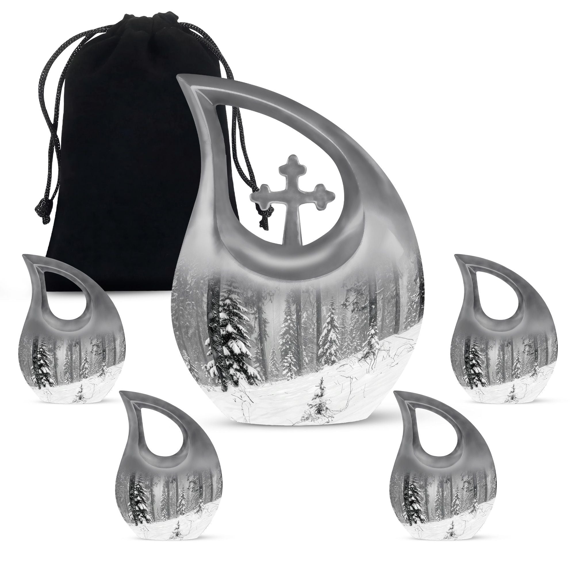 Crafted from durable aluminum, this urn features a smooth black finish accented with a delicate winter forest design. Its secure lid ensures the ashes are preserved safely, making it a reliable and timeless urn for cremations. Available in standard and cremation urns small sizes, it can also be part of a set of small urns for human ashes keepsake pieces for family members who wish to share in honoring a loved one. Each detail is made with care, offering both strength and beauty among the finest human cremation urns adult selections.