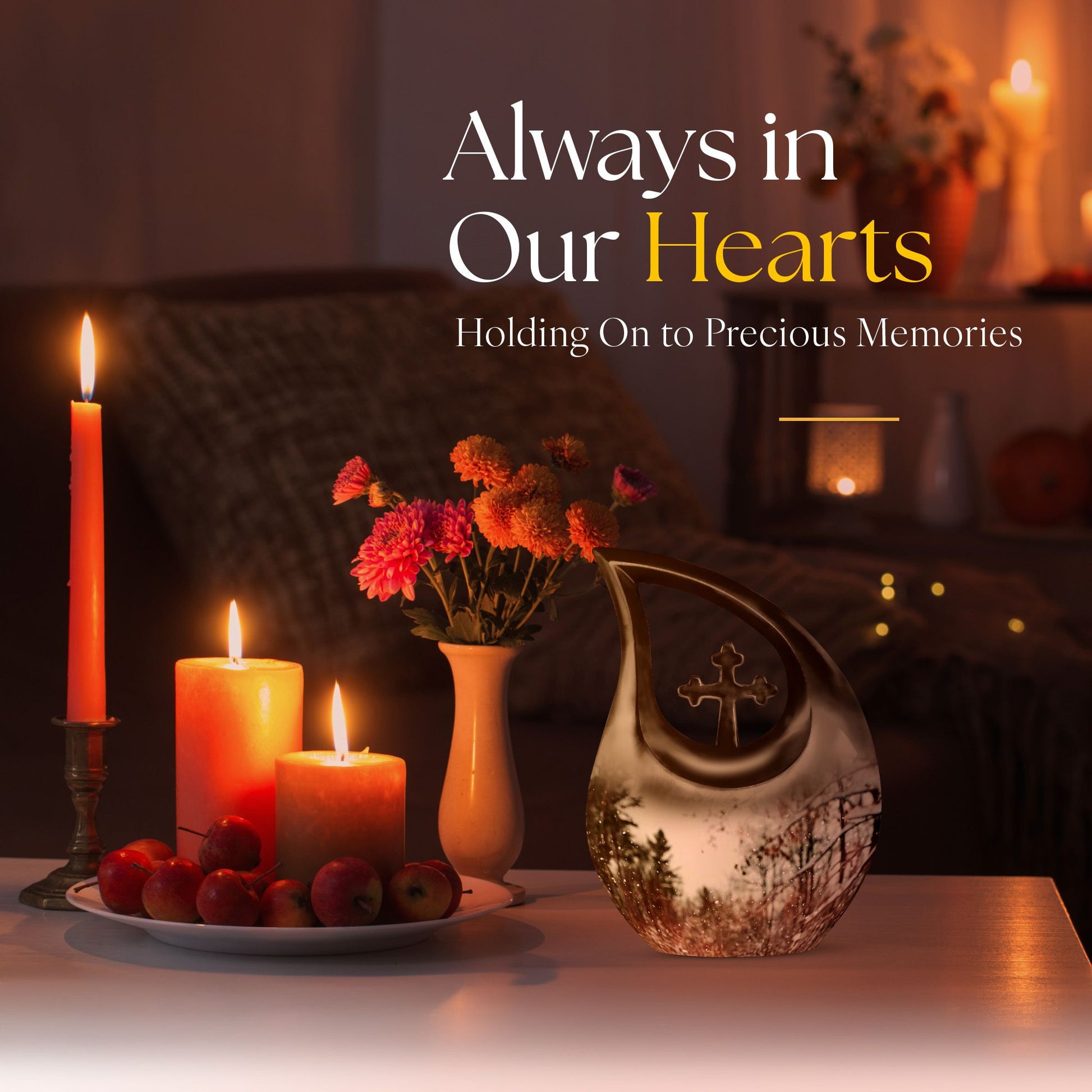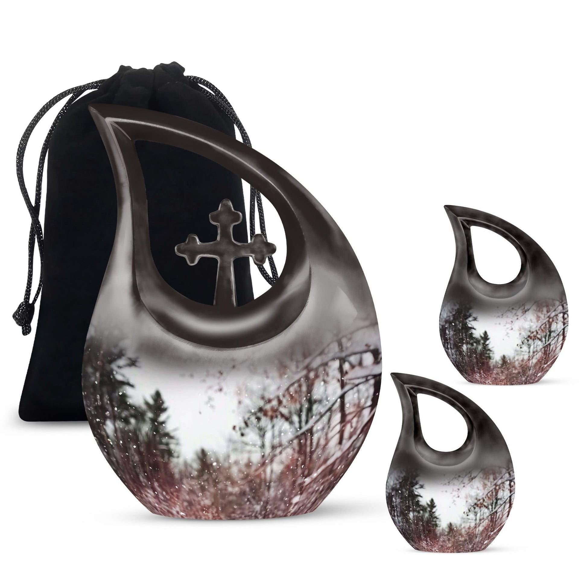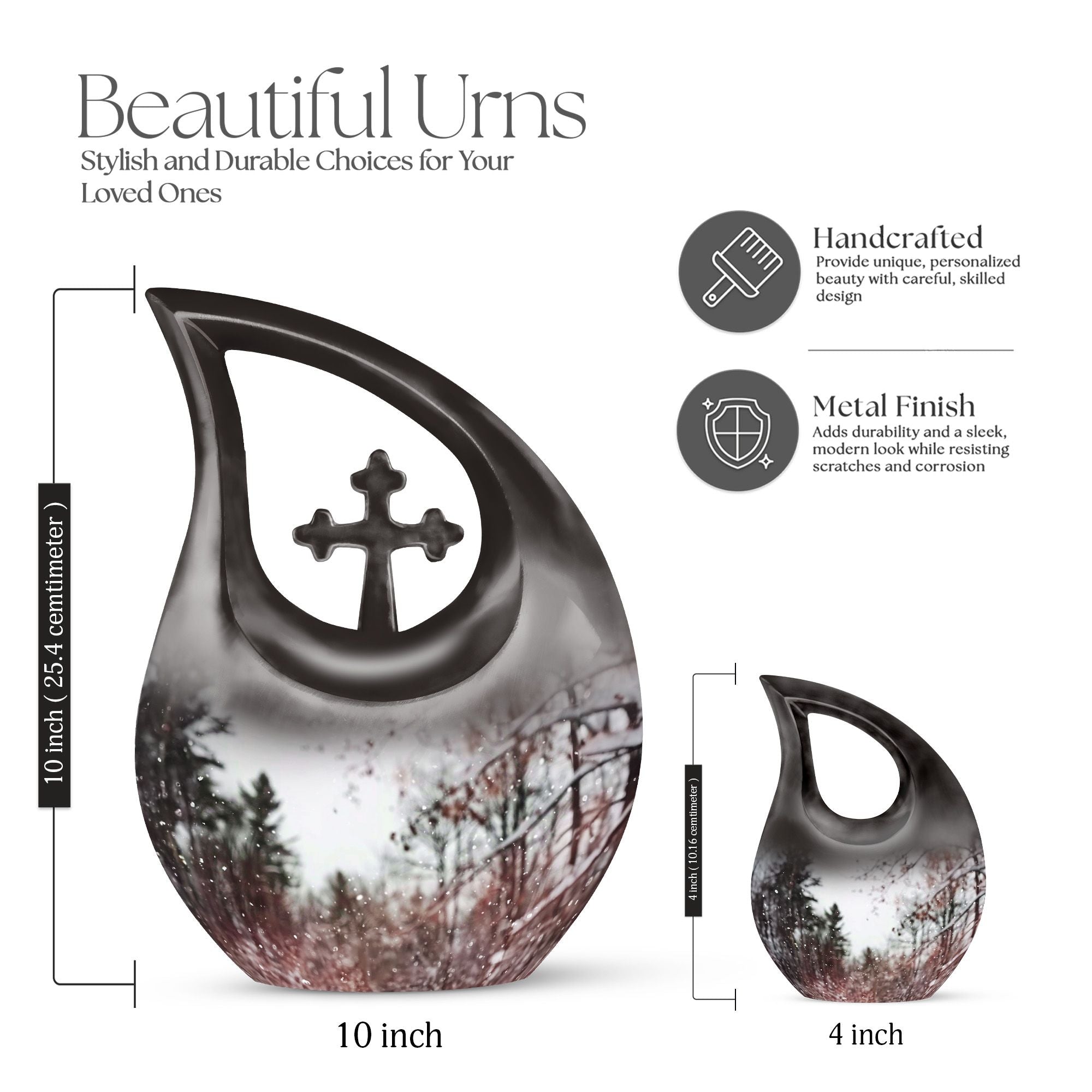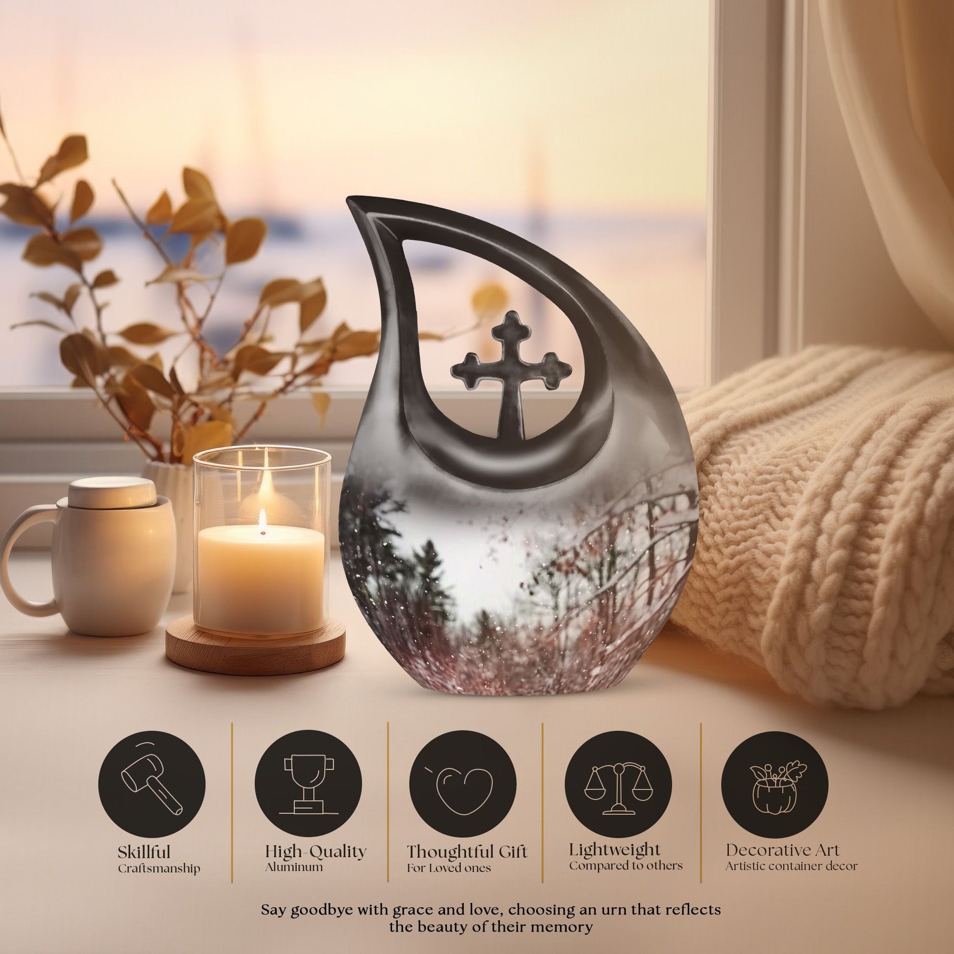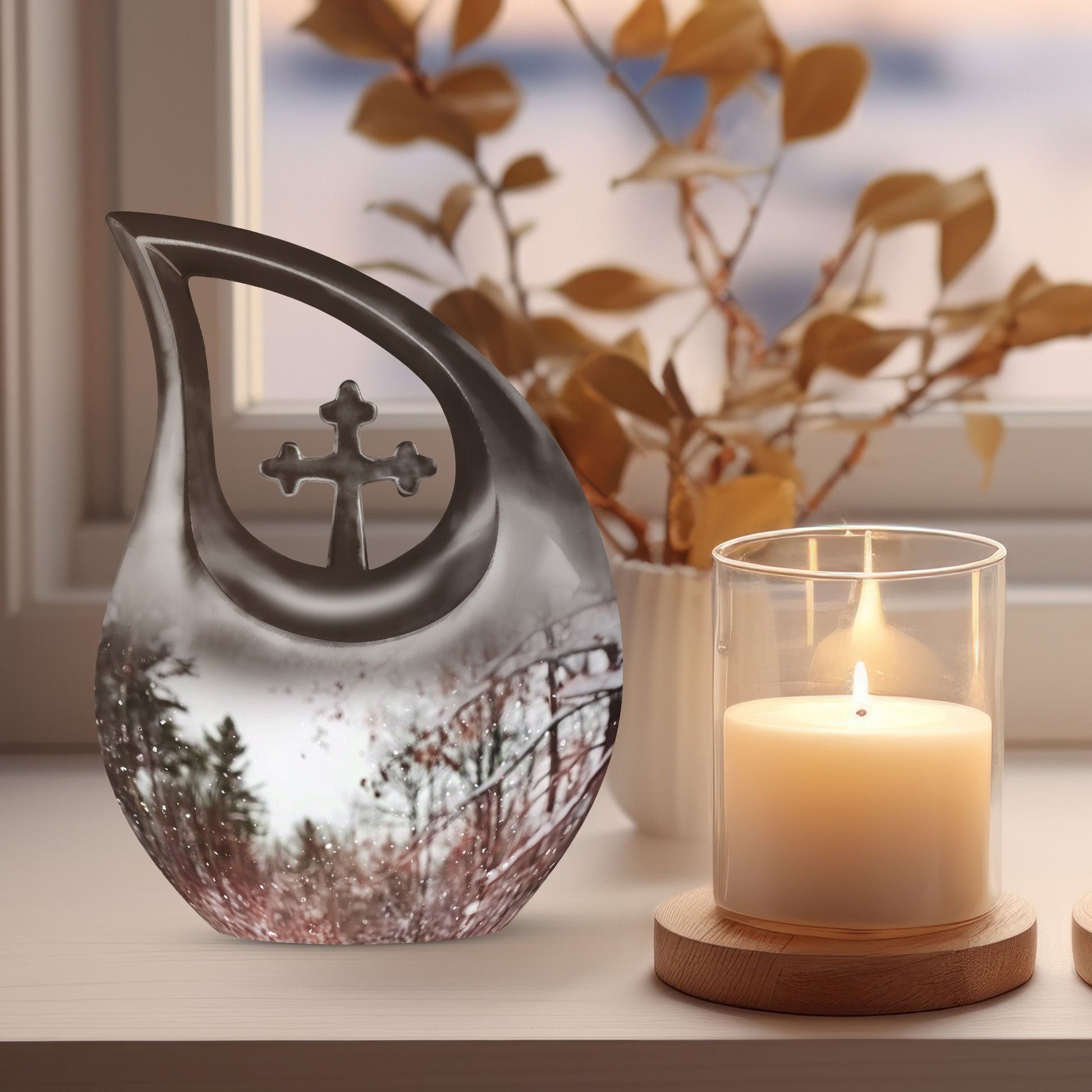 Expertly crafted from premium aluminum, this large cremation urn showcases intricate detailing and a smooth, polished surface that reflects care and craftsmanship. The snowy forest design gives it a natural yet elegant appearance, making it a stunning display piece at home or a serene centerpiece at a memorial service. Ideal as urns for ashes adult male large or large urns for human ashes adult female, it ensures durability and security with its high-quality finish and structure. Each urn is meticulously made to serve both beauty and purpose, a true symbol of everlasting love.