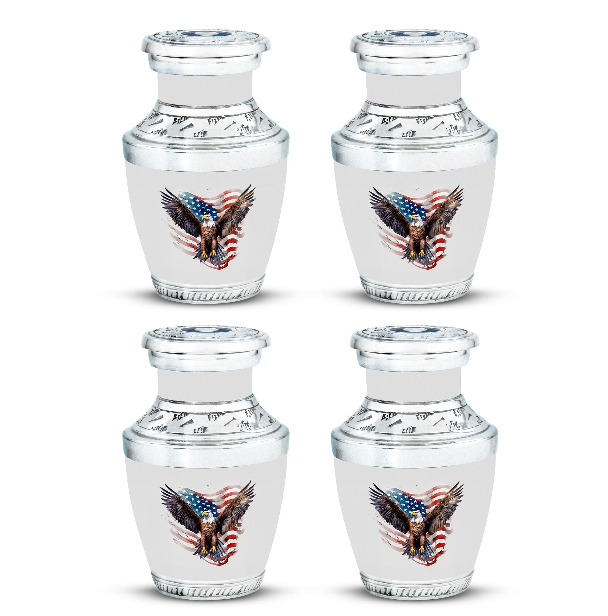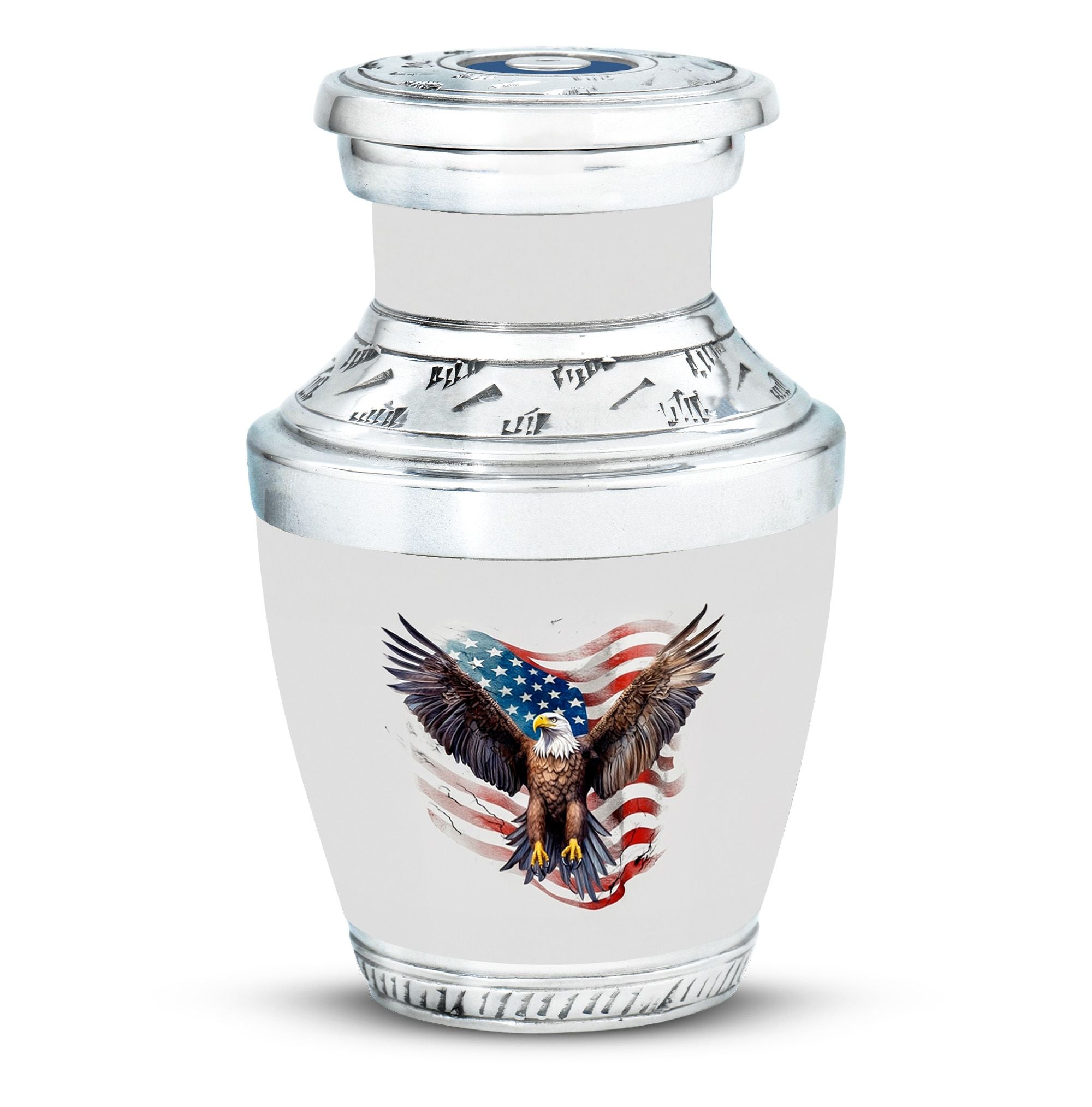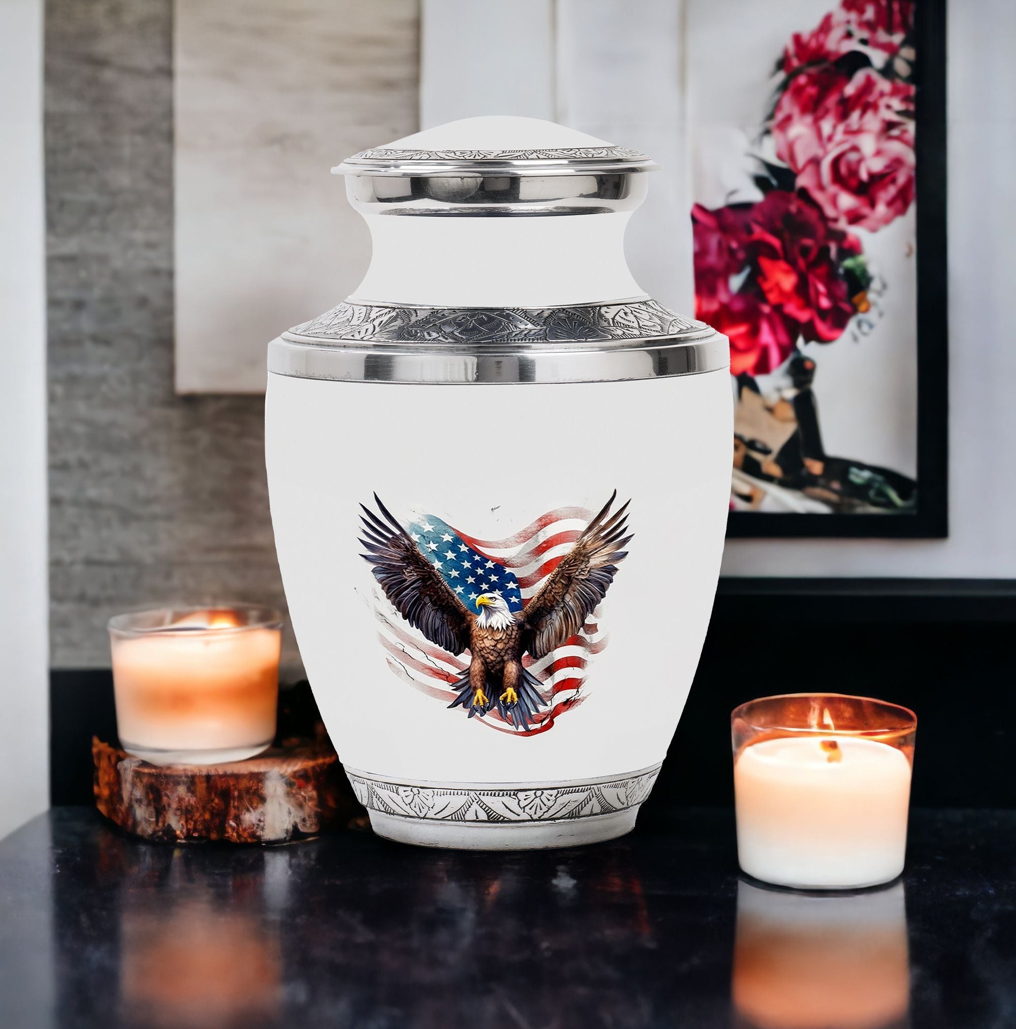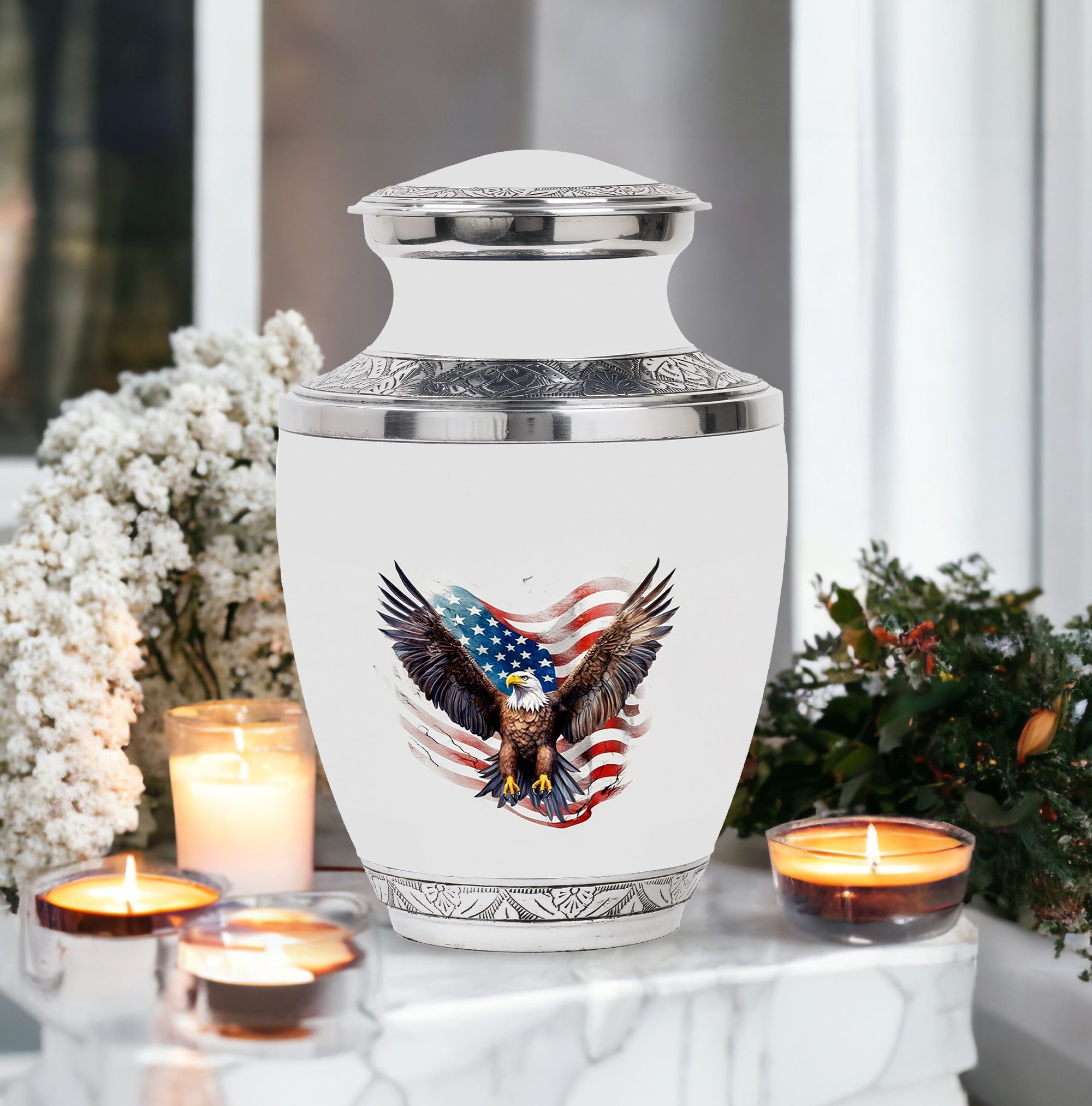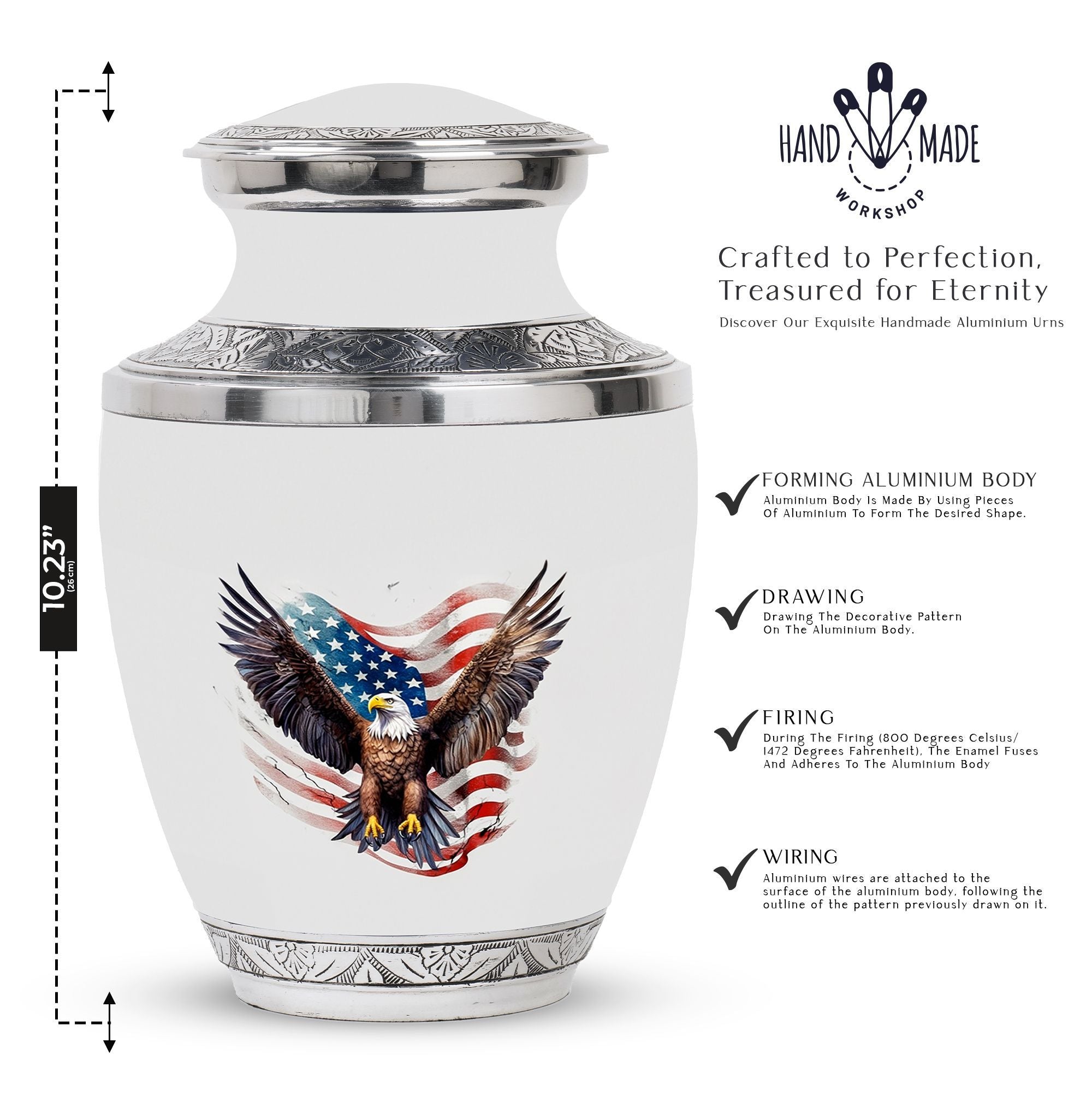 Imbued with deep symbolism and intricate craftsmanship, our 'Eagle Urns for Human Ashes' are an exemplary choice for safekeeping your loved ones unforgettable remains. Our large urns, truly a bespoke memorial urns, boast a size of 3 inches and an imposing weight of 3.3 pounds. With dignifying dimensions of 10 inches in height and an impressive capacity of 200 cubic inches, these aluminium urns ensure ample room and lasting durability for preserving human remains. Alongside, a tastefully designed velvet pouch accompanies our urns, serving as an elegant containment for ashes. What sets our urns apart is the customization feature allowing for personalized engraving of names, elevating the urns beyond mere containment vessels and into cherished mementoes. Suitable as Urns for Ashes for Dad, or as Decorative Urns for Ashes, these products blend compelling aesthetics with heartfelt sentiment. Note, design services are not included in package content.