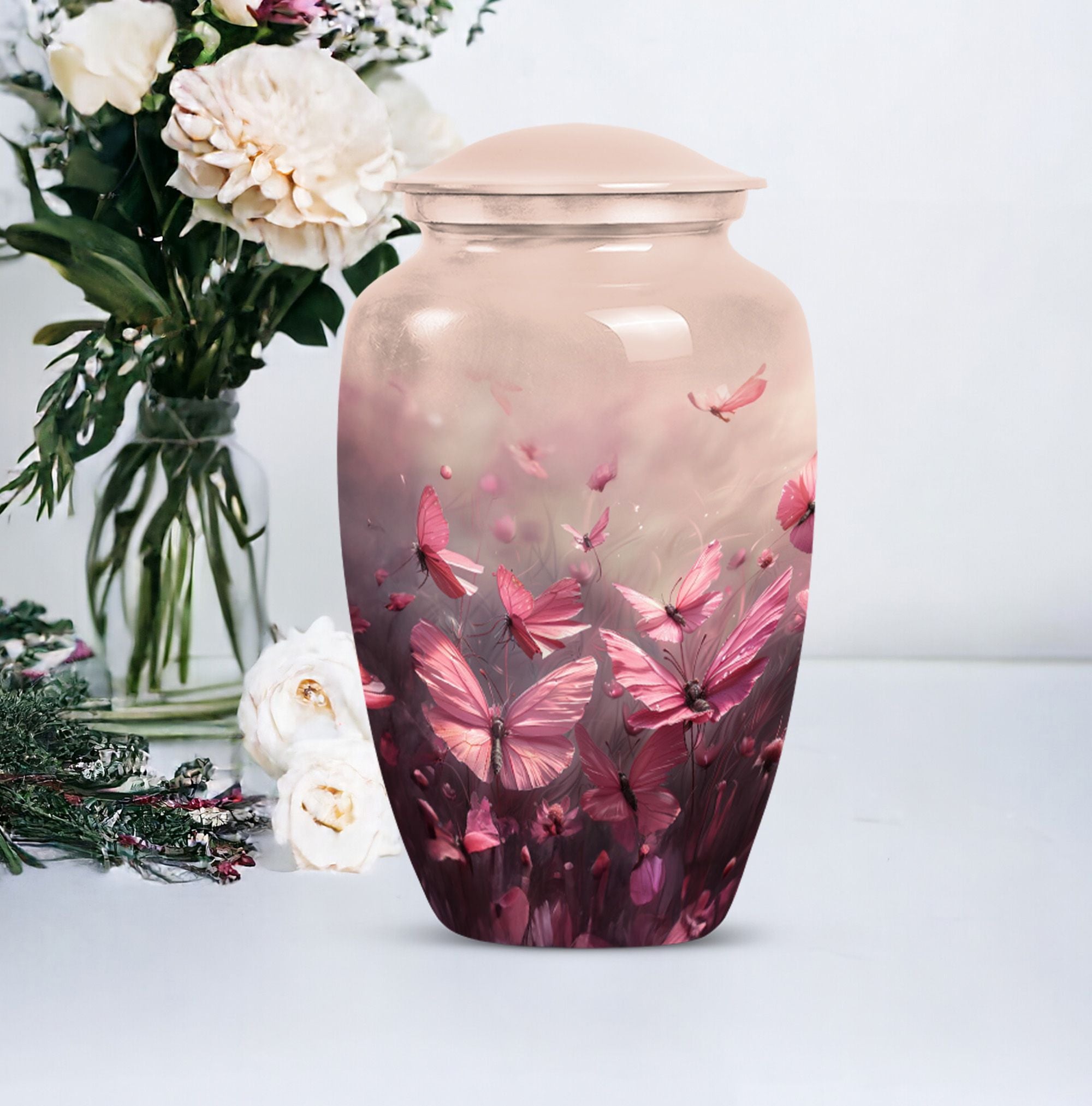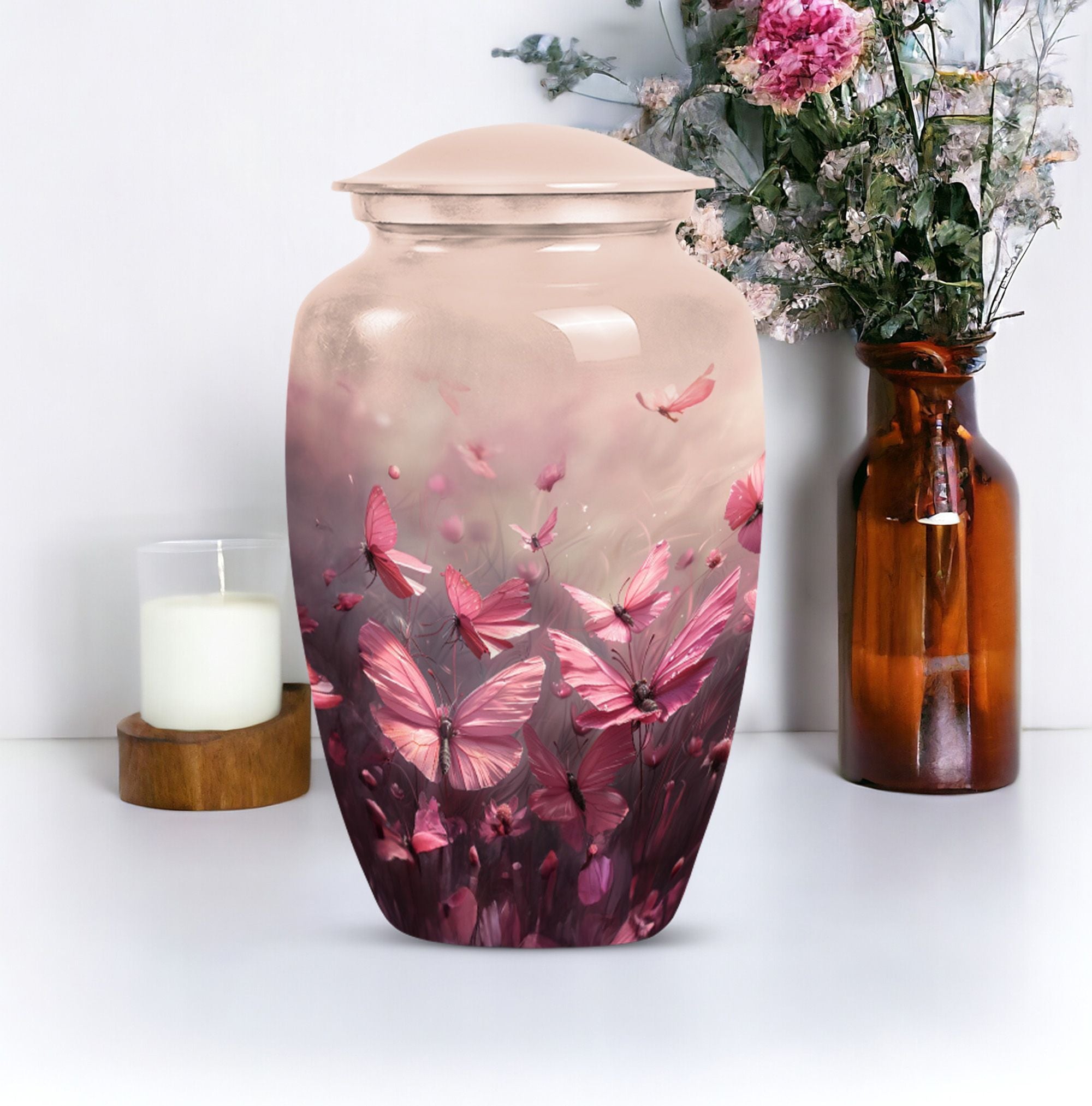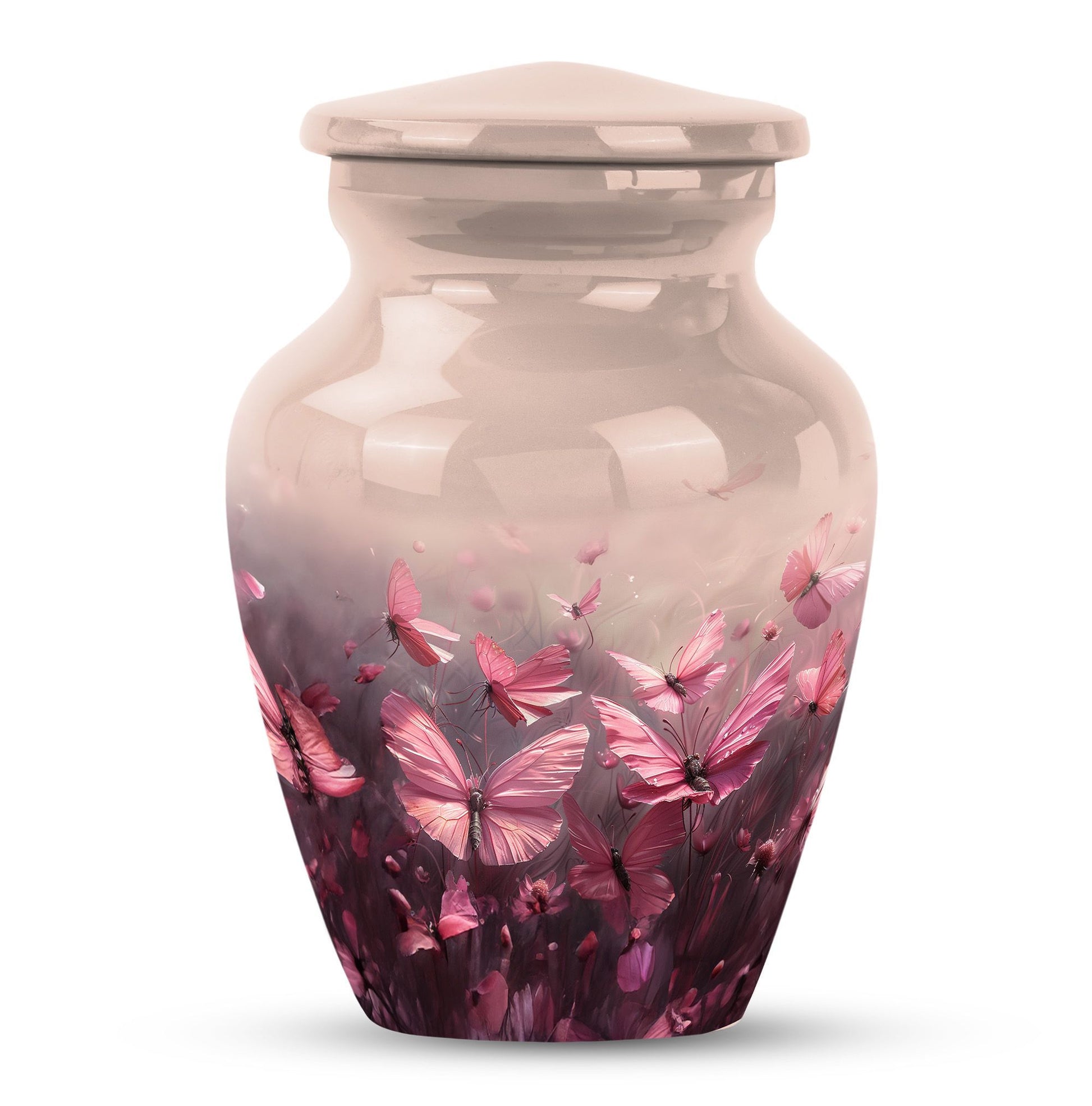 Crafted from durable aluminum, this pink butterfly urn features a soft pink finish with detailed butterfly accents. The secure screw lid ensures ashes are safely preserved, making it ideal as urns for ashes adult male large, urn for ashes adult female, or mini urn for ashes for women.