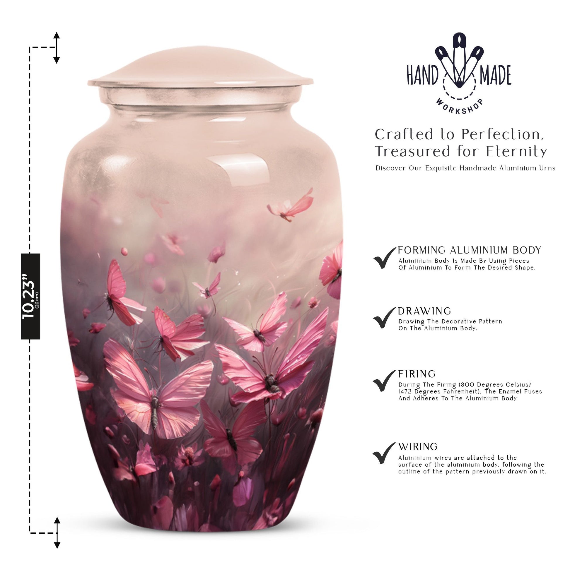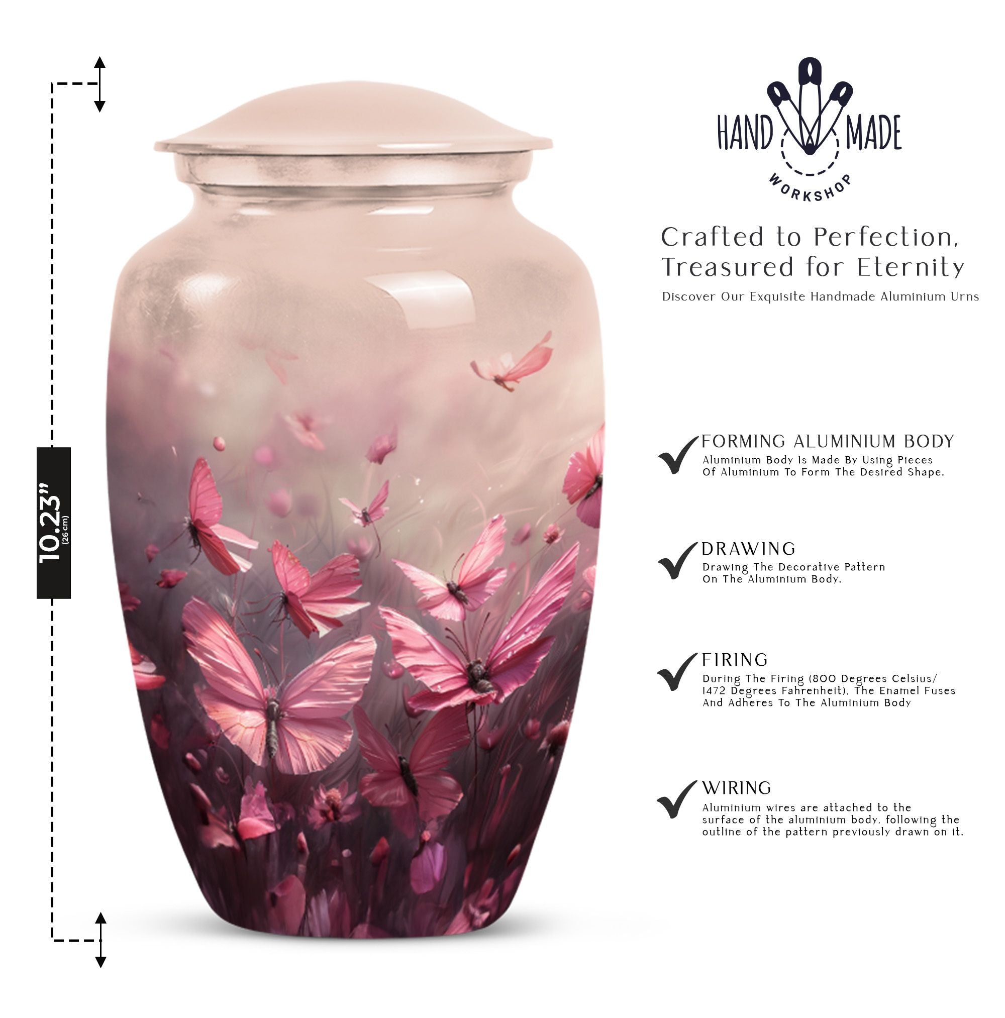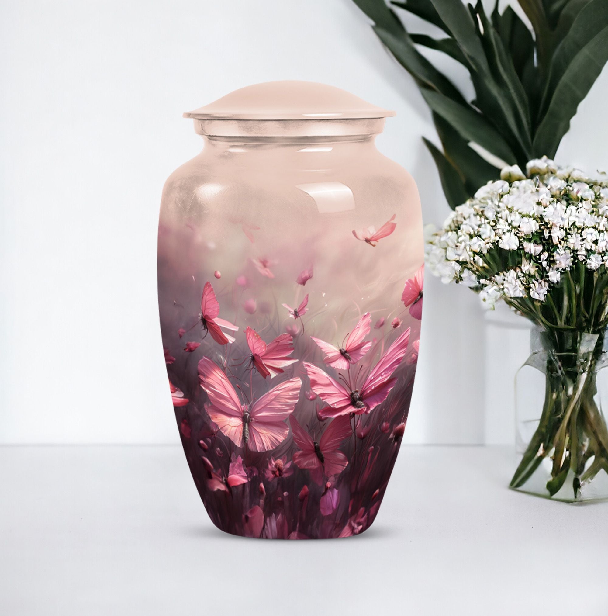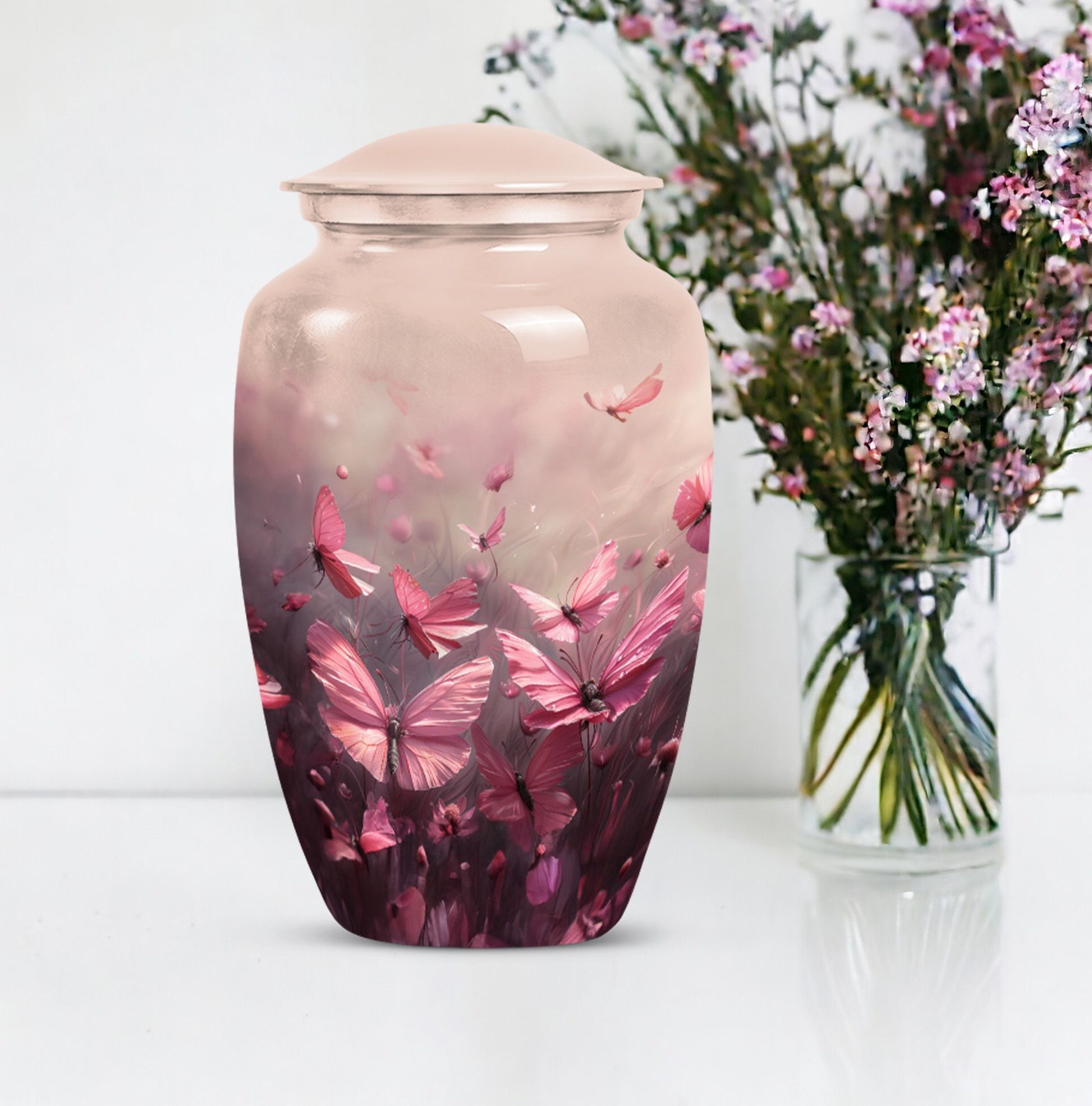 Crafted from durable aluminum, this pink butterfly urn features a soft pink finish with detailed butterfly accents. The secure screw lid ensures ashes are safely preserved, making it ideal as urns for ashes adult male large, urn for ashes adult female, or mini urn for ashes for women.