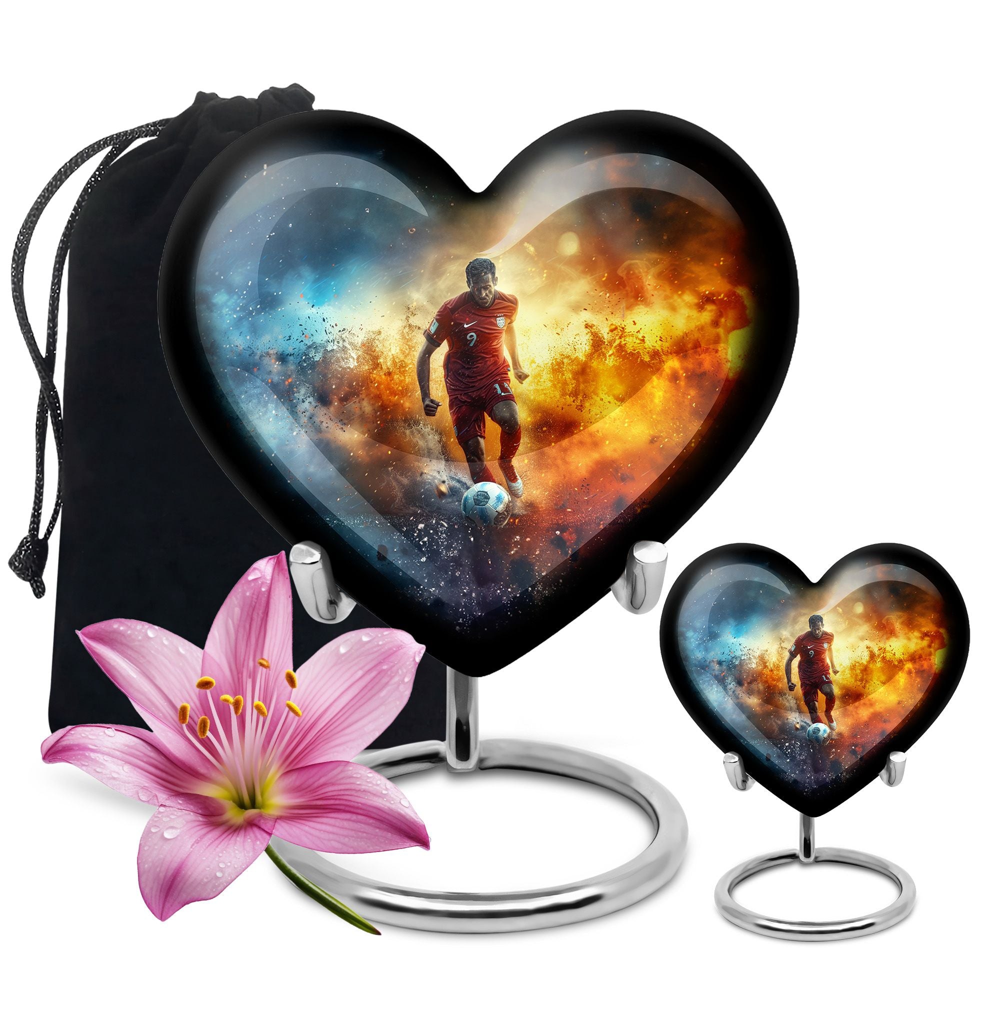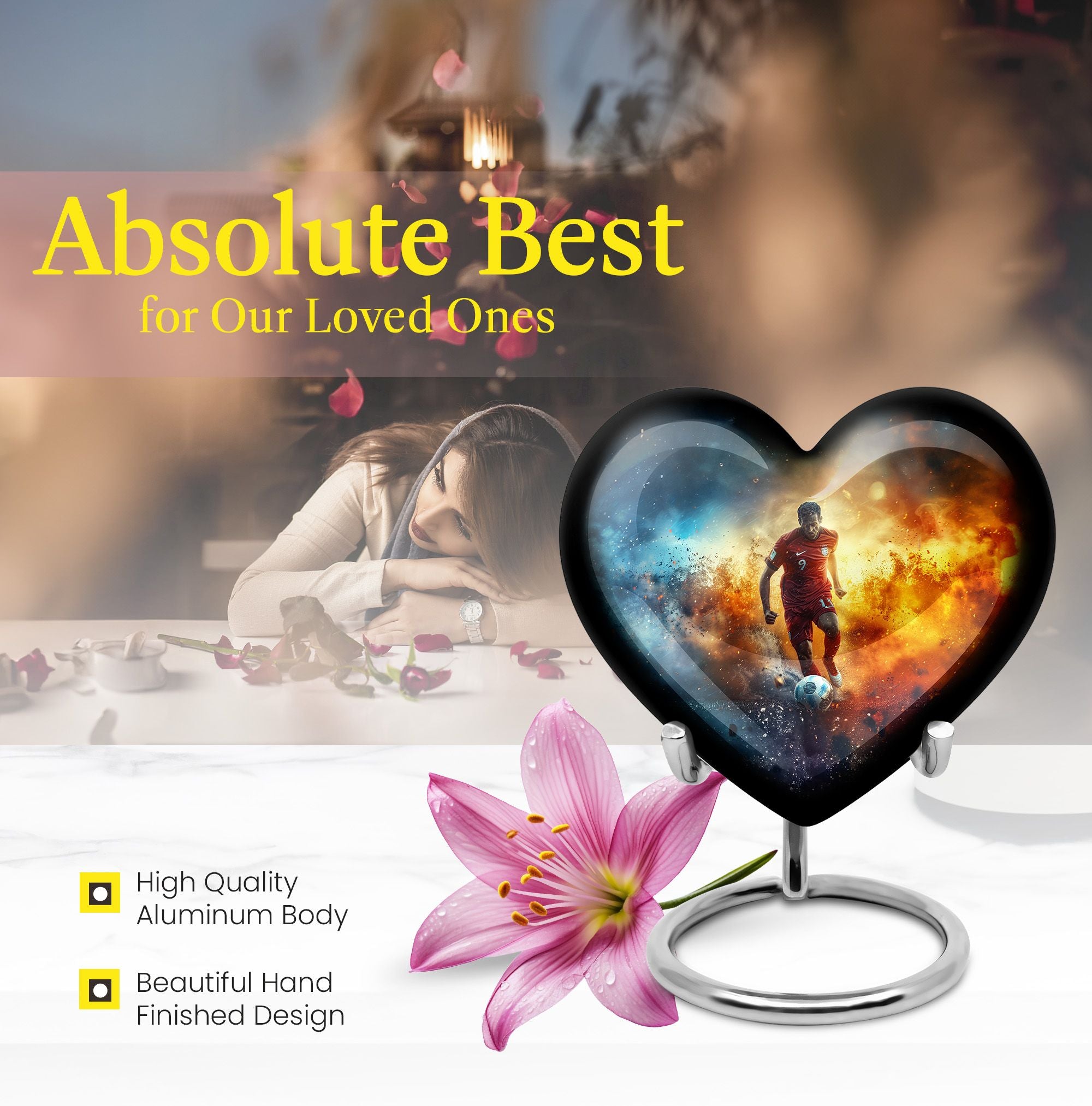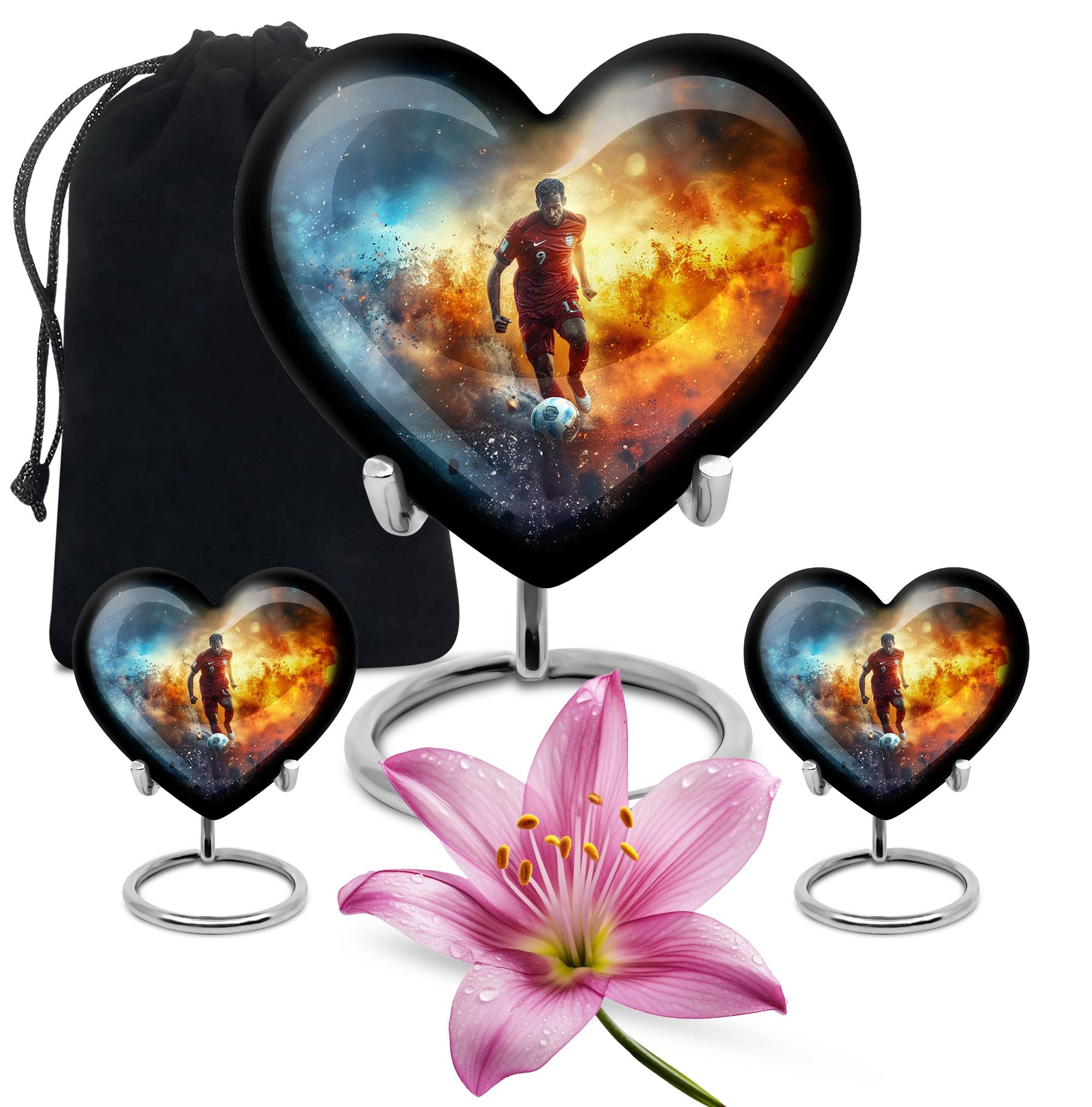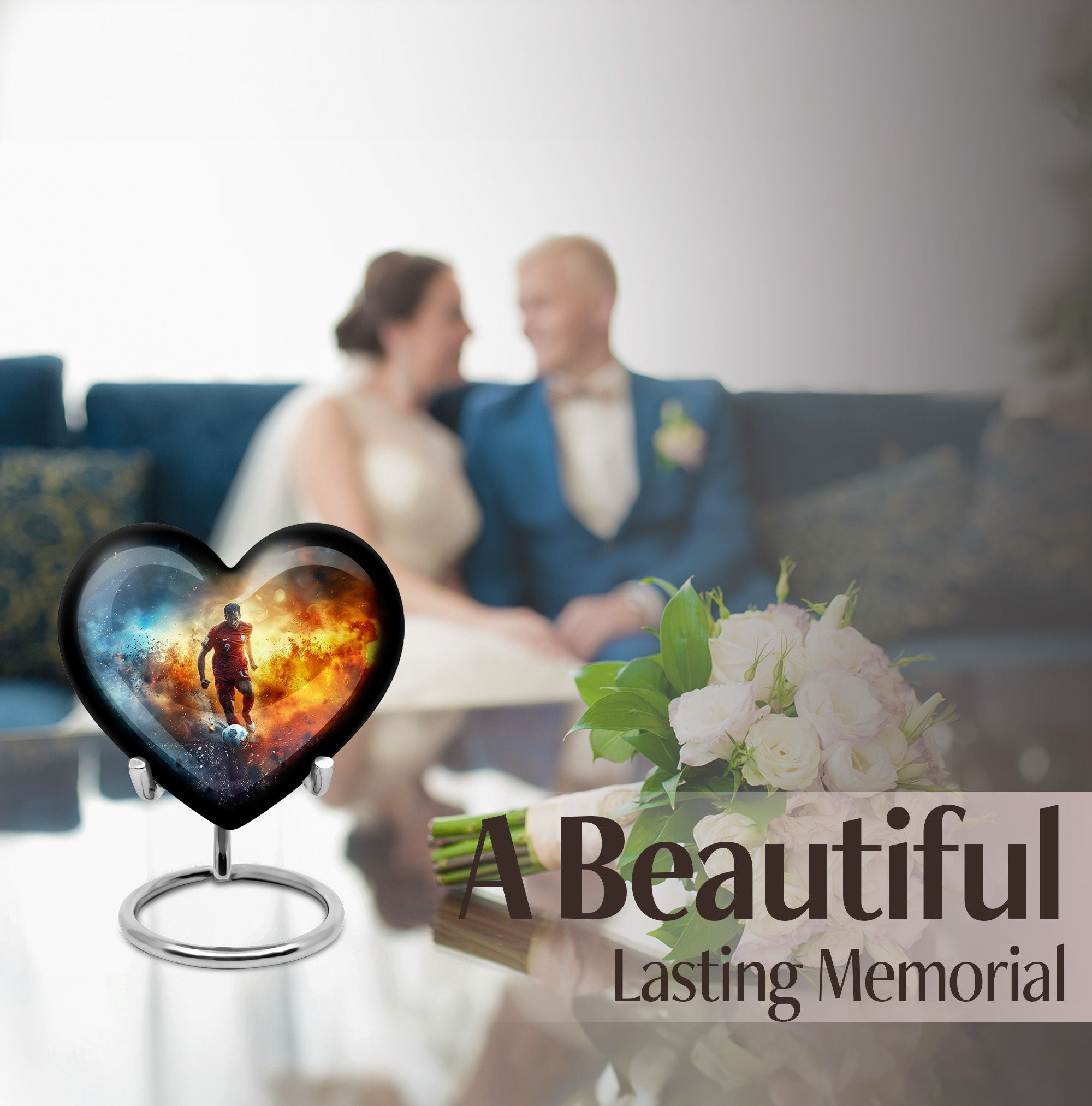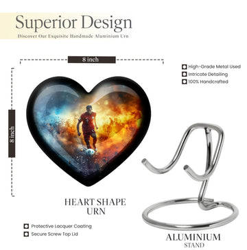 Honor your dearly departed with a remarkable tribute - our 'Heart' Soccer Urn. Measuring at an impressive 10 inches, this exquisite and tactile Large Urn has been crafted from durable Aluminium, ensuring it remains untouched by the passage of time. Weighing only 3.3 pounds, this urn is effortlessly portable, making it the perfect choice for those who have travels planned. Its capacity accommodate up to 200 cubic inches of ashes, and it comes complete with a velvet pouch for secure containment. Taking cues from the abstract and greatly admired, the 'Heart' Soccer Urn stands out as a fine choice among cremation urns for adult males. For that unique touch, take advantage of our personalization service by engraving your loved one's name onto the urn. This item perfectly encapsulates the essence of memorial urns, embodying sentimentality with a modern approach.