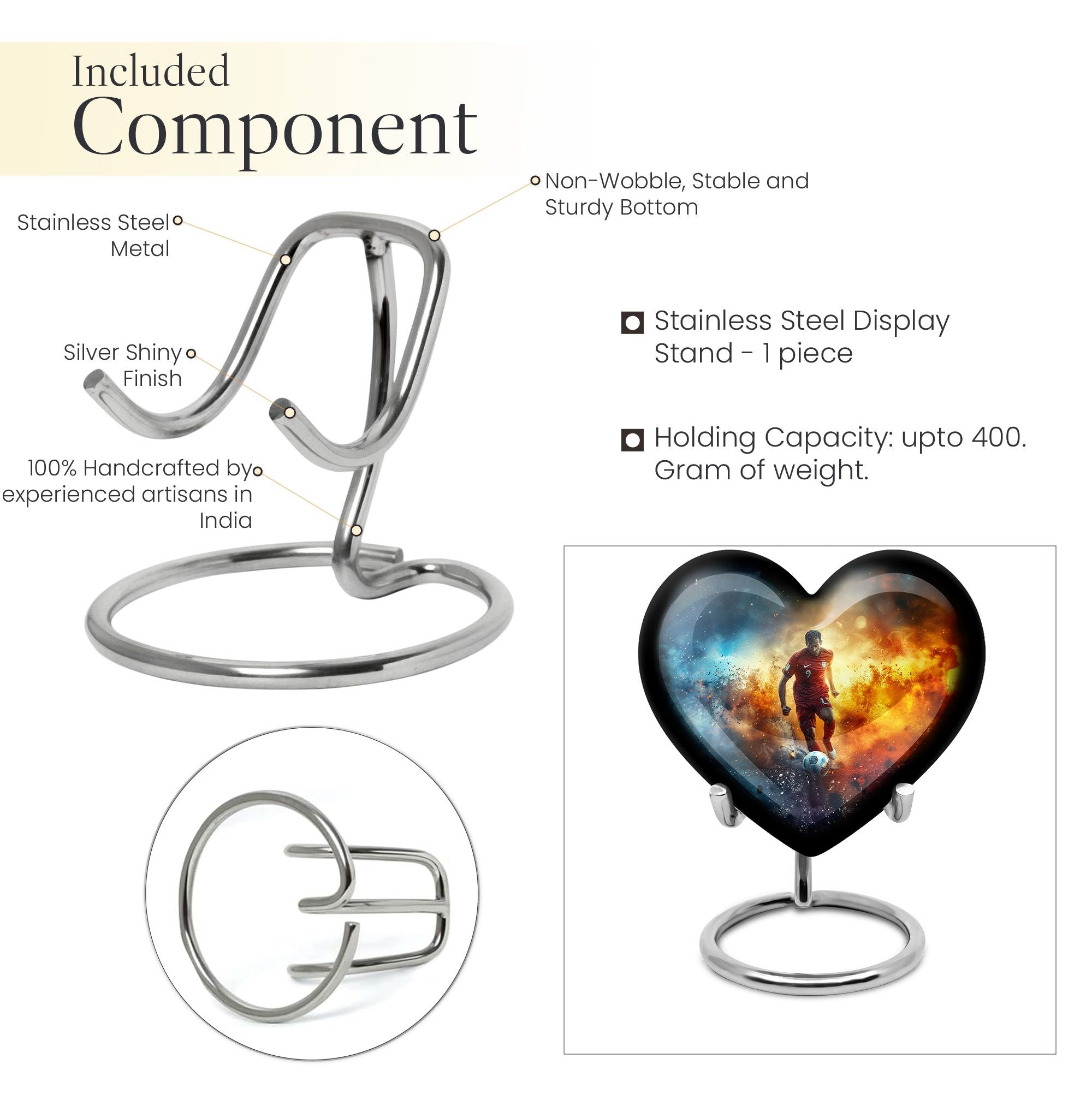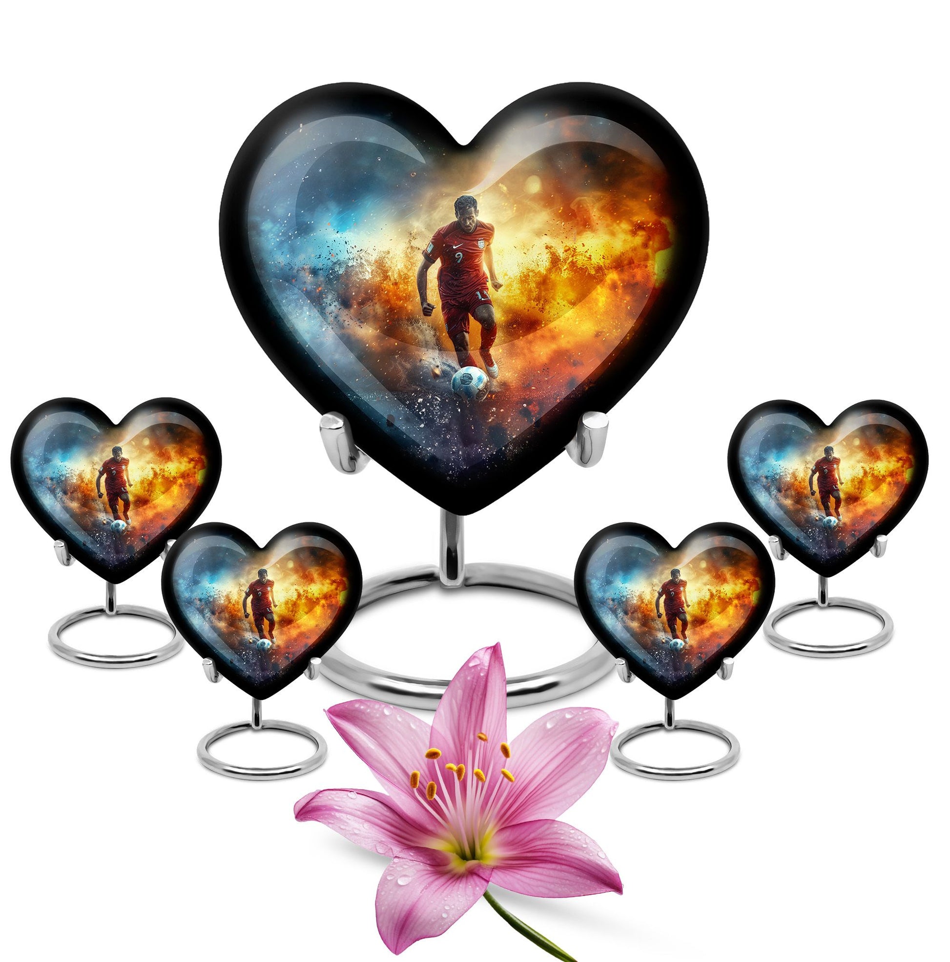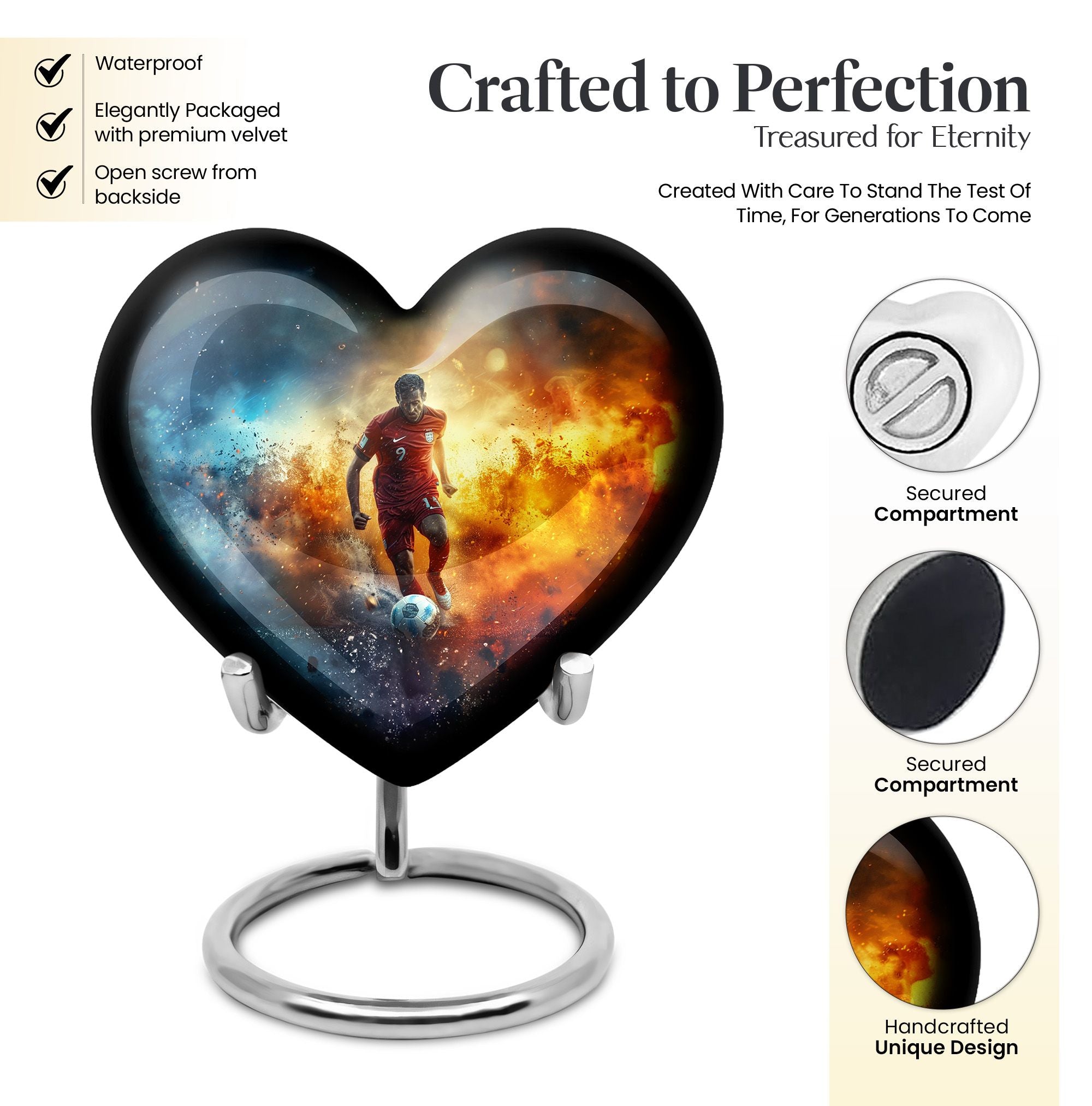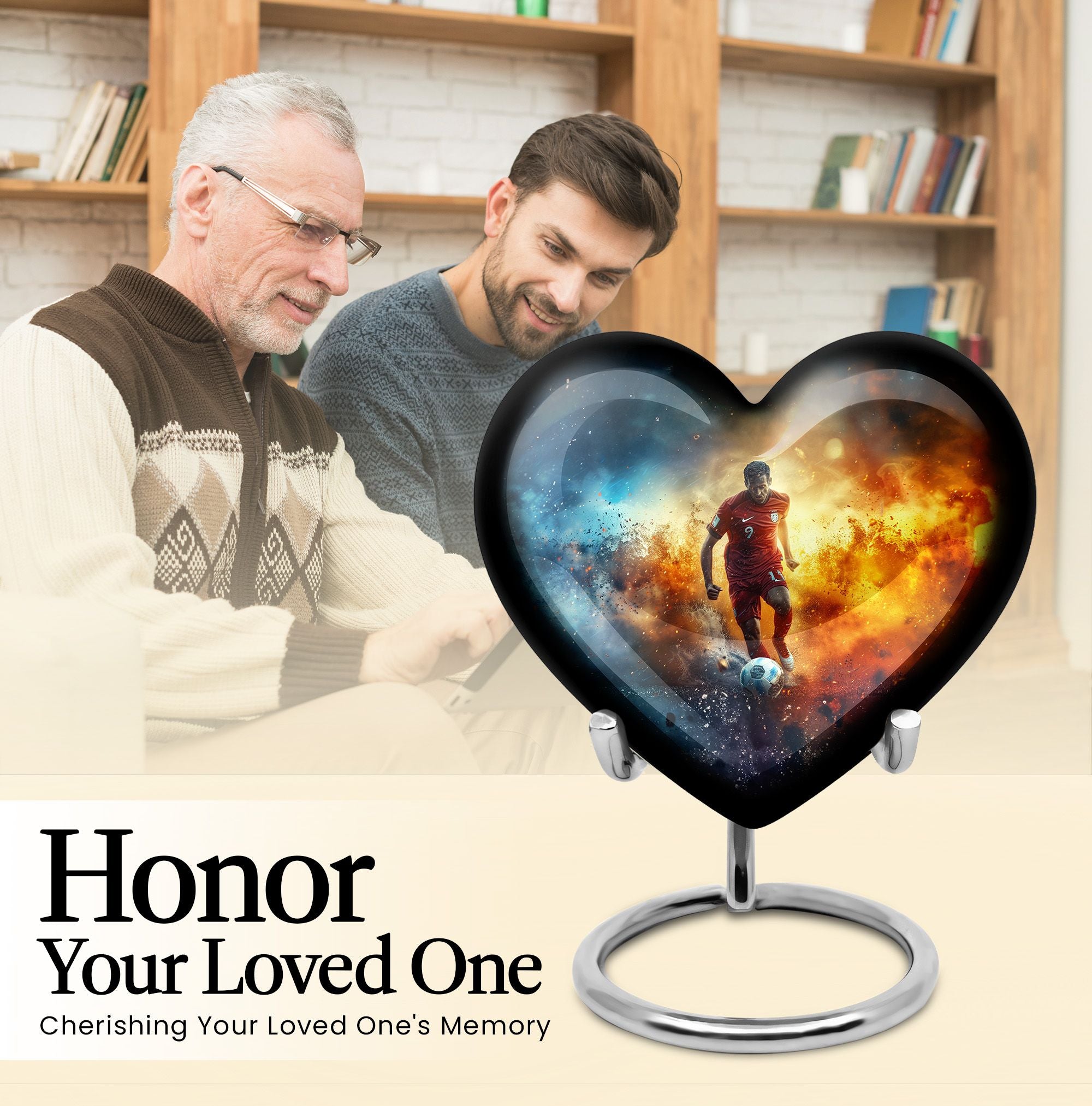 Honor your dearly departed with a remarkable tribute - our 'Heart' Soccer Urn. Measuring at an impressive 10 inches, this exquisite and tactile Large Urn has been crafted from durable Aluminium, ensuring it remains untouched by the passage of time. Weighing only 3.3 pounds, this urn is effortlessly portable, making it the perfect choice for those who have travels planned. Its capacity accommodate up to 200 cubic inches of ashes, and it comes complete with a velvet pouch for secure containment. Taking cues from the abstract and greatly admired, the 'Heart' Soccer Urn stands out as a fine choice among cremation urns for adult males. For that unique touch, take advantage of our personalization service by engraving your loved one's name onto the urn. This item perfectly encapsulates the essence of memorial urns, embodying sentimentality with a modern approach.