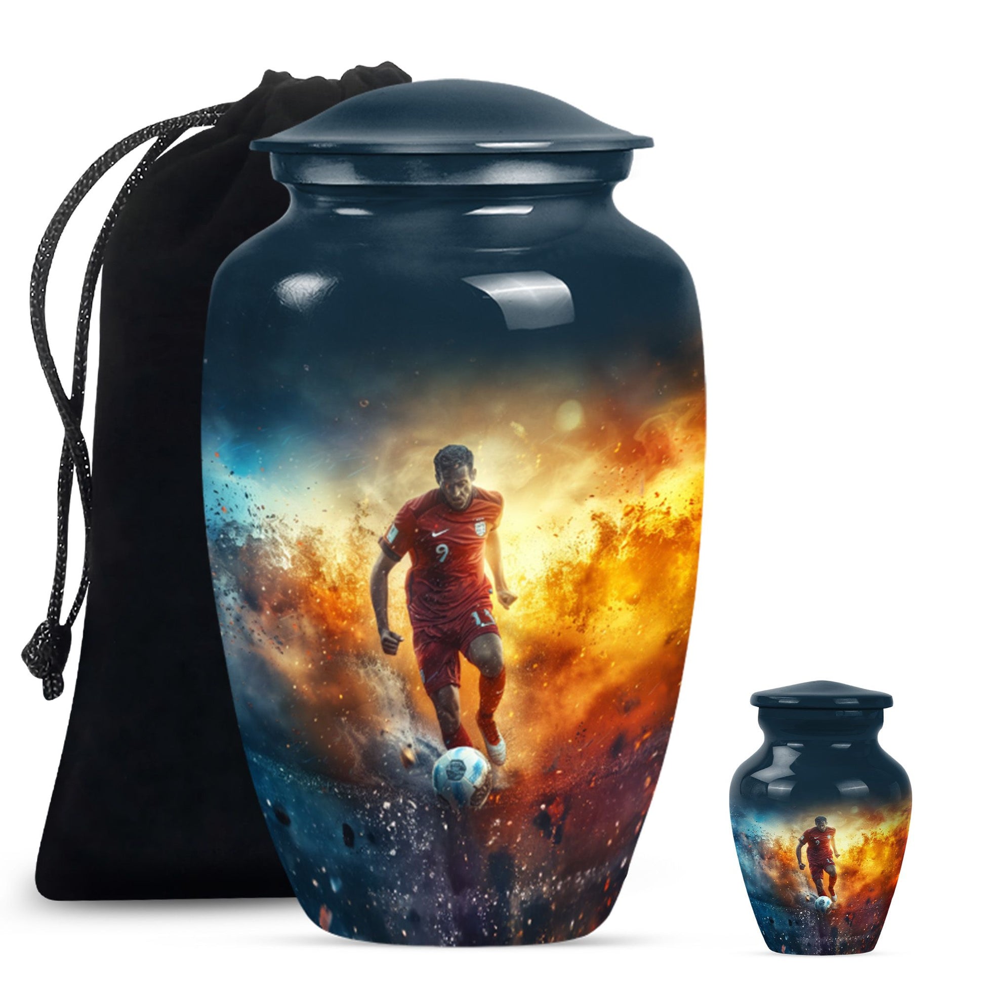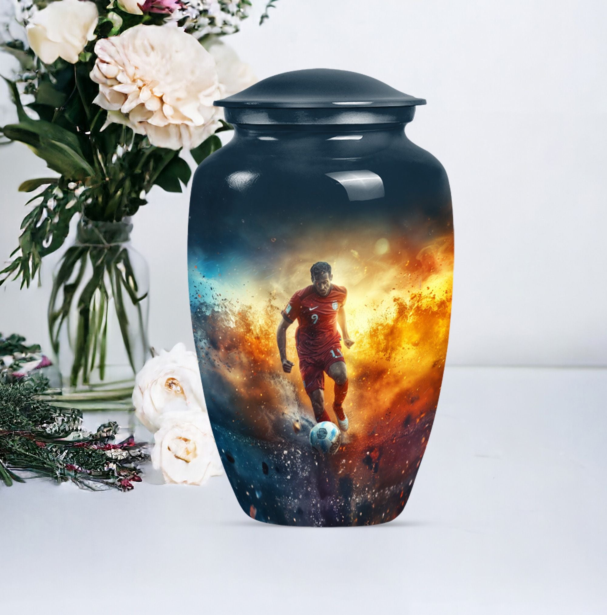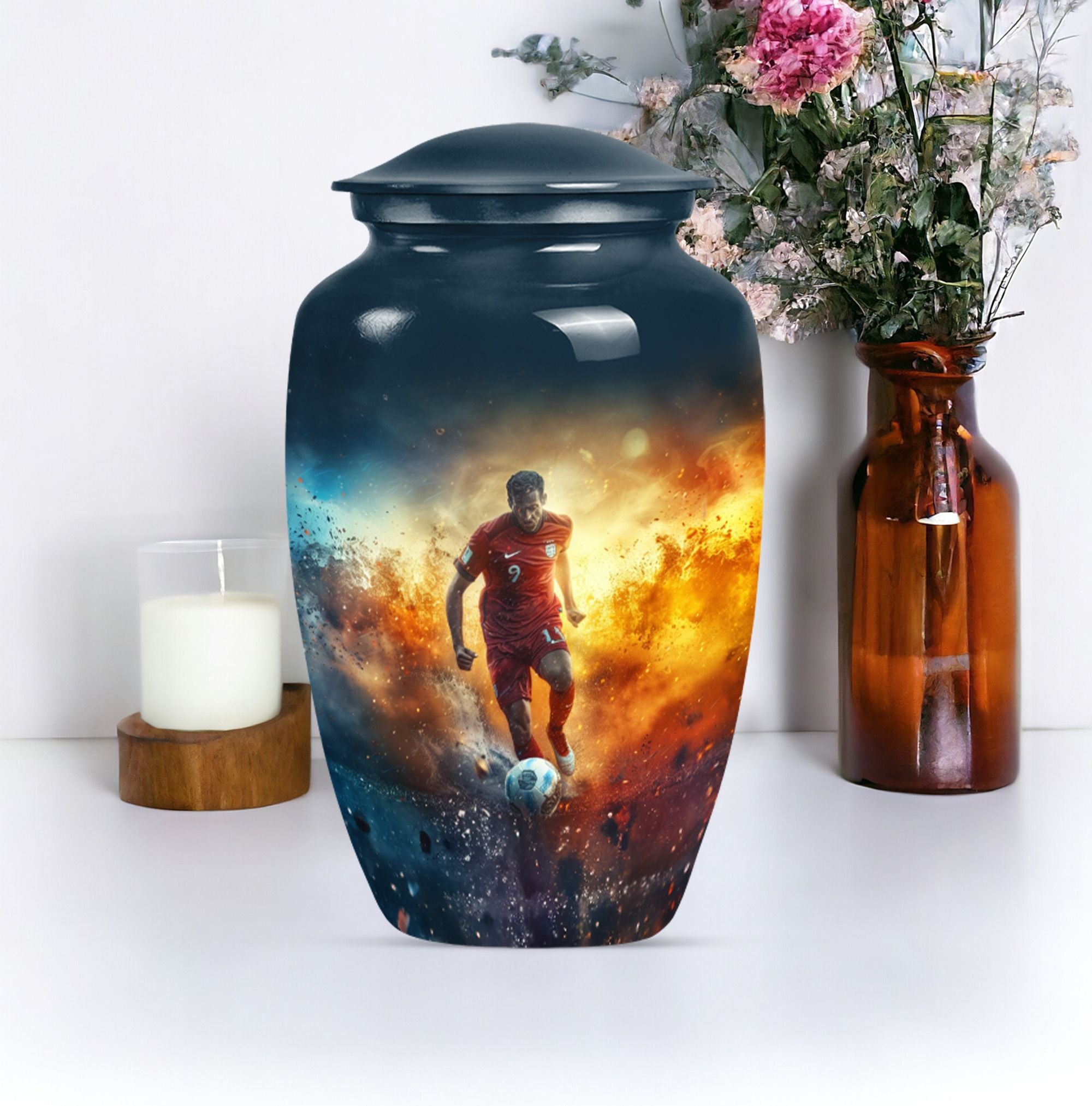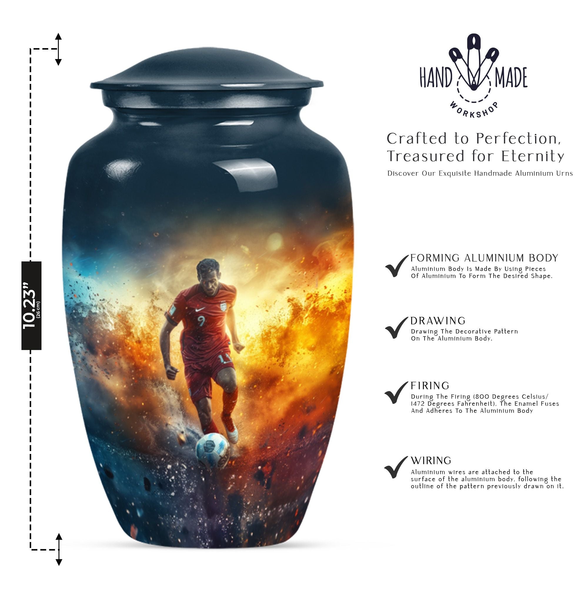 Dignify the memory of a lost loved one with this 10-inch Soccer Urn, artfully crafted from sturdy aluminium for a timeless feel. This large urn, with its abstract theme, adds a layer of tribute and remembrance to any memorial arrangement. Built to hold up to 200 cubic inches of cremated remains, this monument brings a certain level of solace, with its superior capacity, to families during the grieving process of adult males. It is not only a testament to the dearly departed but also a token of love and honor, that can be carried for travels. With a weight of 3.3 pounds, this towering urn offers sturdiness for a lasting remembrance. The urn comes with a velvet pouch for containment of ashes, bringing an earthly touch to the solemn farewell. With a personalizable engraved name customization, this large urn brings an intimate touch to the somber ceremony. With a homage to the timeless Classic Urn, each urn becomes a significant part of the healing process.