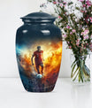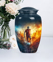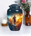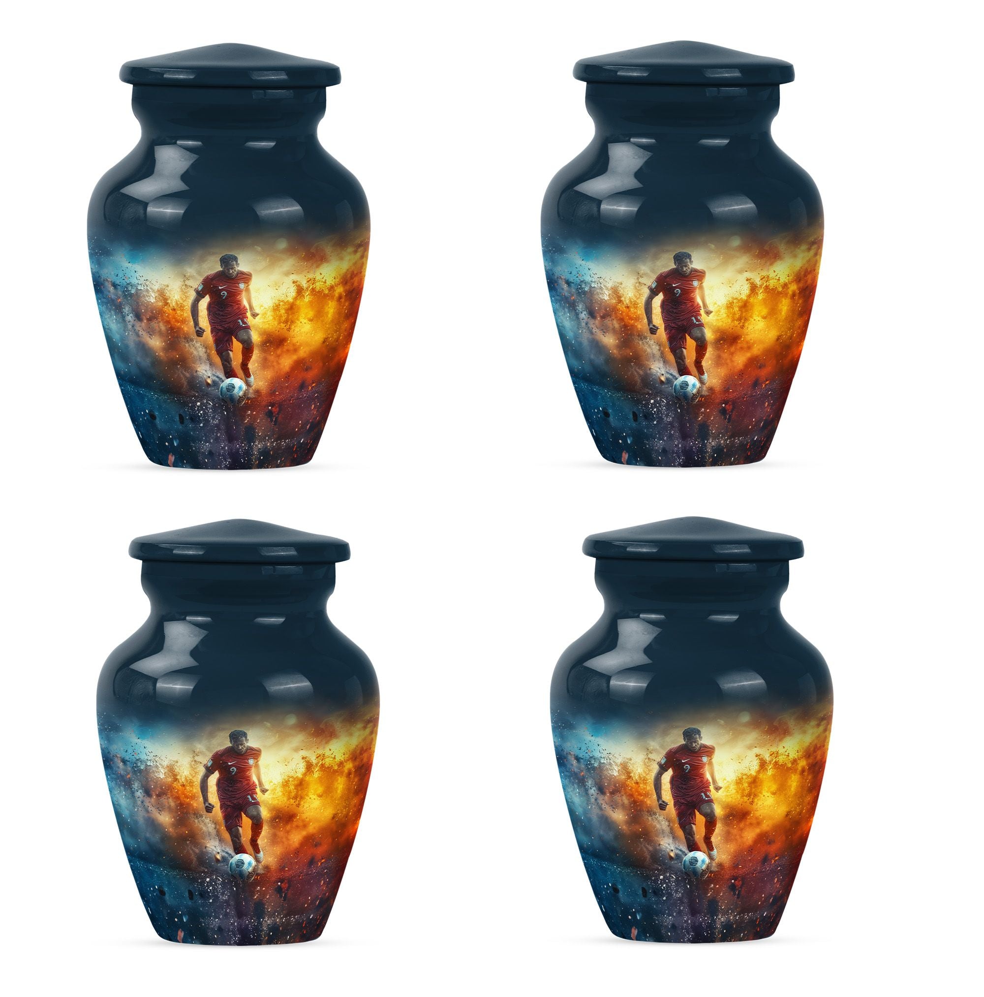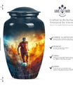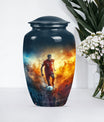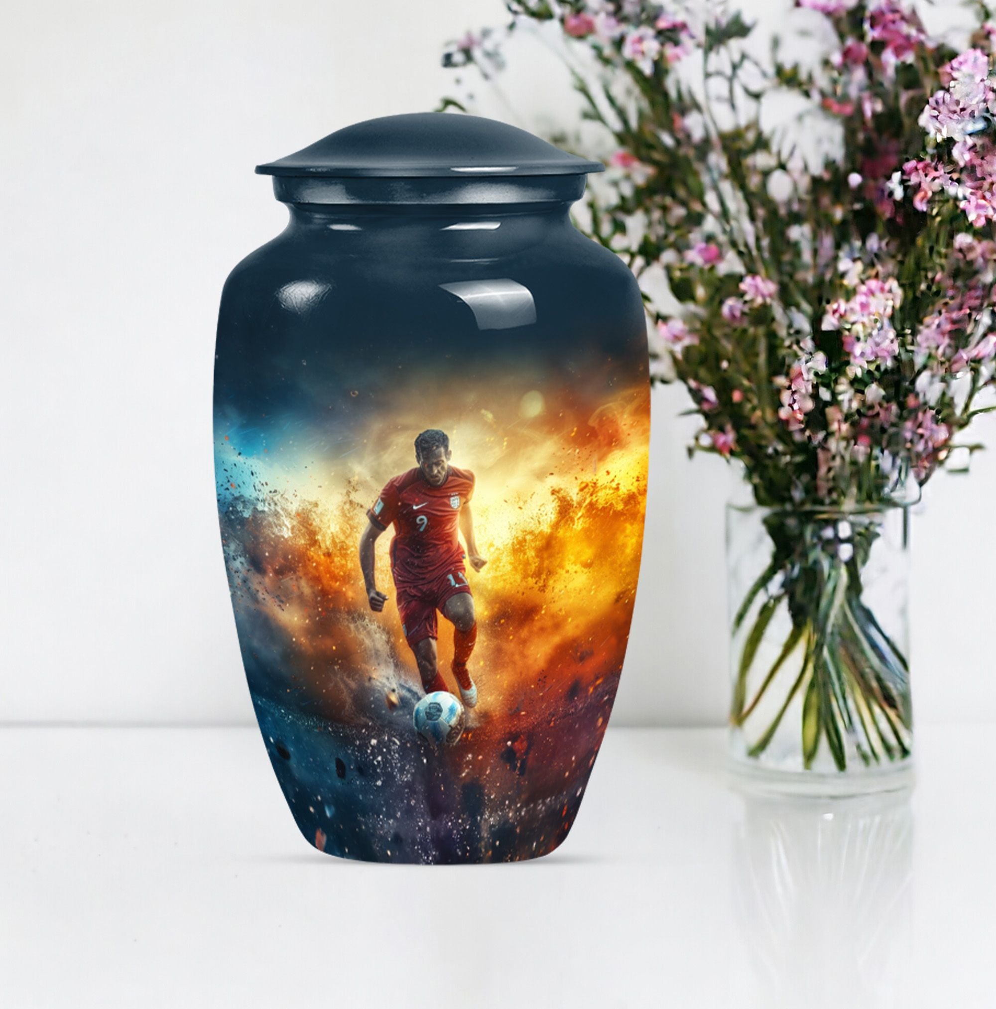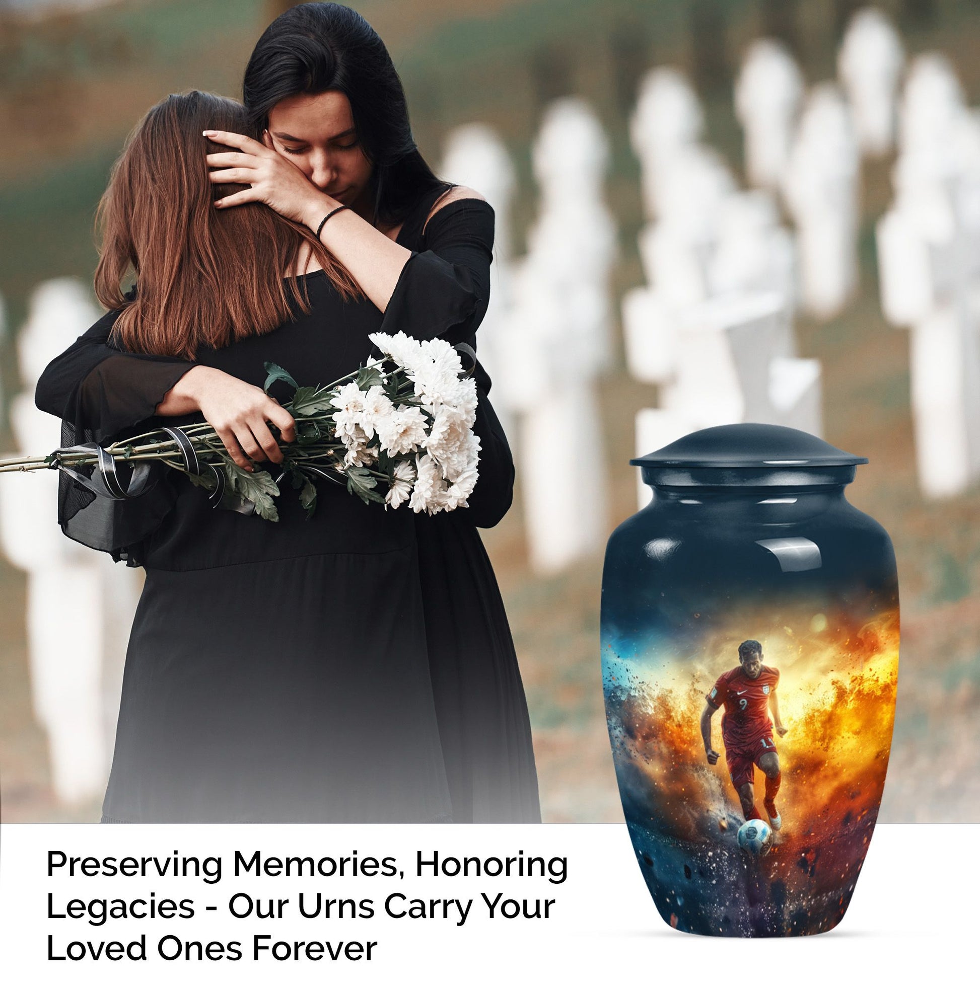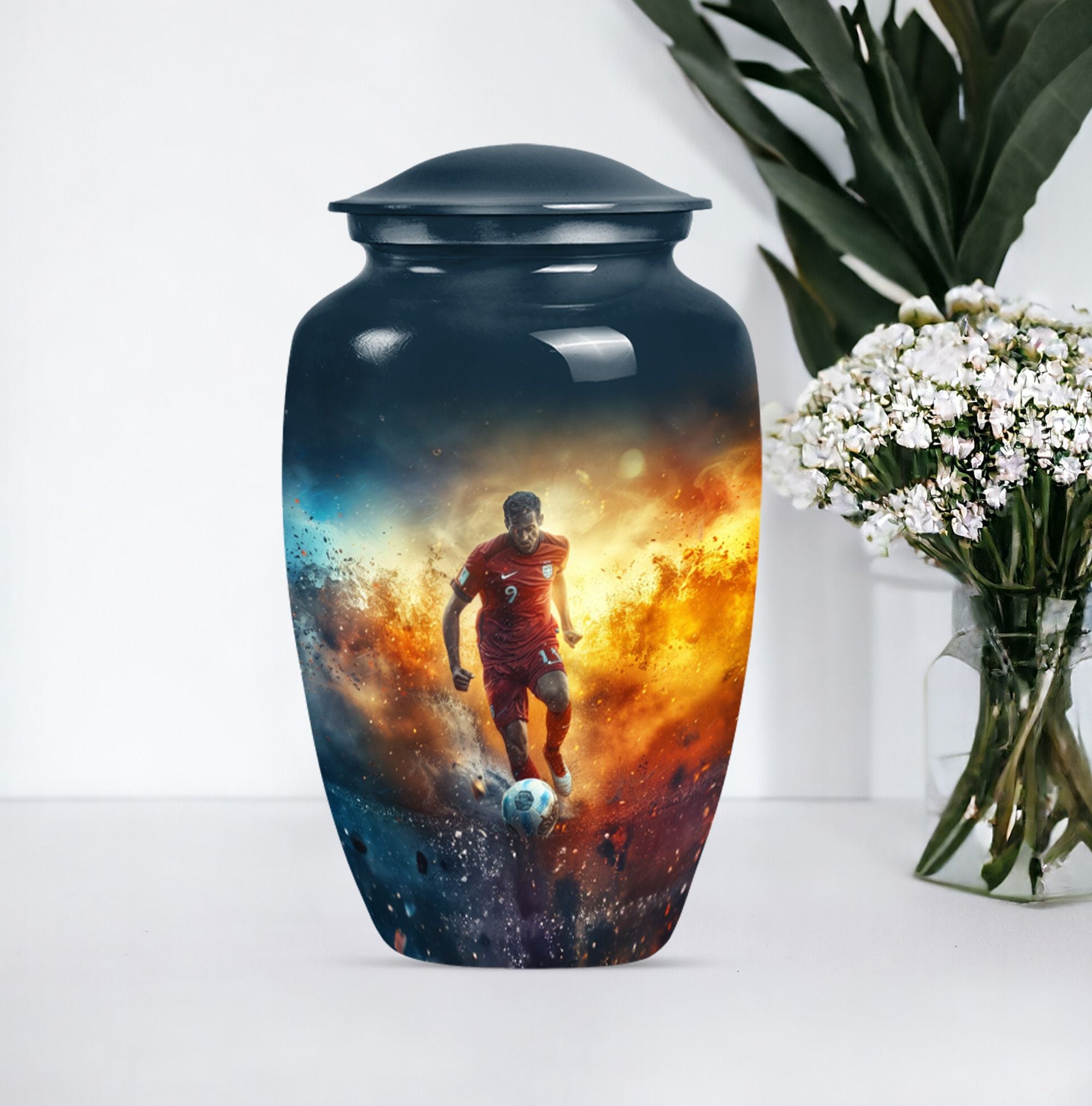 Dignify the memory of a lost loved one with this 10-inch Soccer Urn, artfully crafted from sturdy aluminium for a timeless feel. This large urn, with its abstract theme, adds a layer of tribute and remembrance to any memorial arrangement. Built to hold up to 200 cubic inches of cremated remains, this monument brings a certain level of solace, with its superior capacity, to families during the grieving process of adult males. It is not only a testament to the dearly departed but also a token of love and honor, that can be carried for travels. With a weight of 3.3 pounds, this towering urn offers sturdiness for a lasting remembrance. The urn comes with a velvet pouch for containment of ashes, bringing an earthly touch to the solemn farewell. With a personalizable engraved name customization, this large urn brings an intimate touch to the somber ceremony. With a homage to the timeless Classic Urn, each urn becomes a significant part of the healing process.