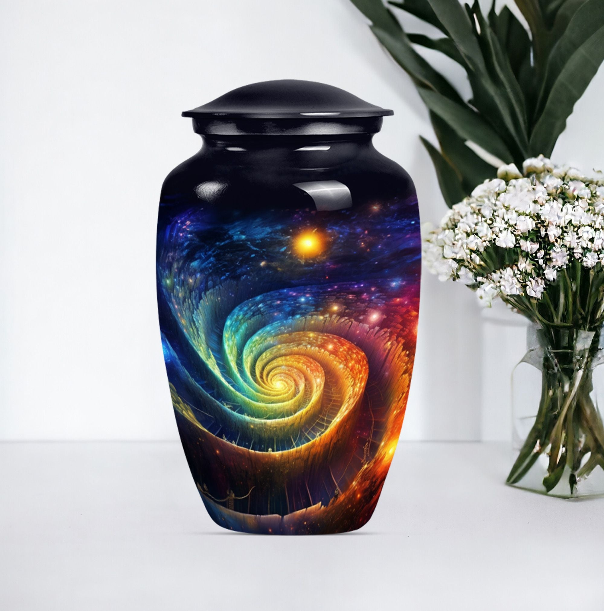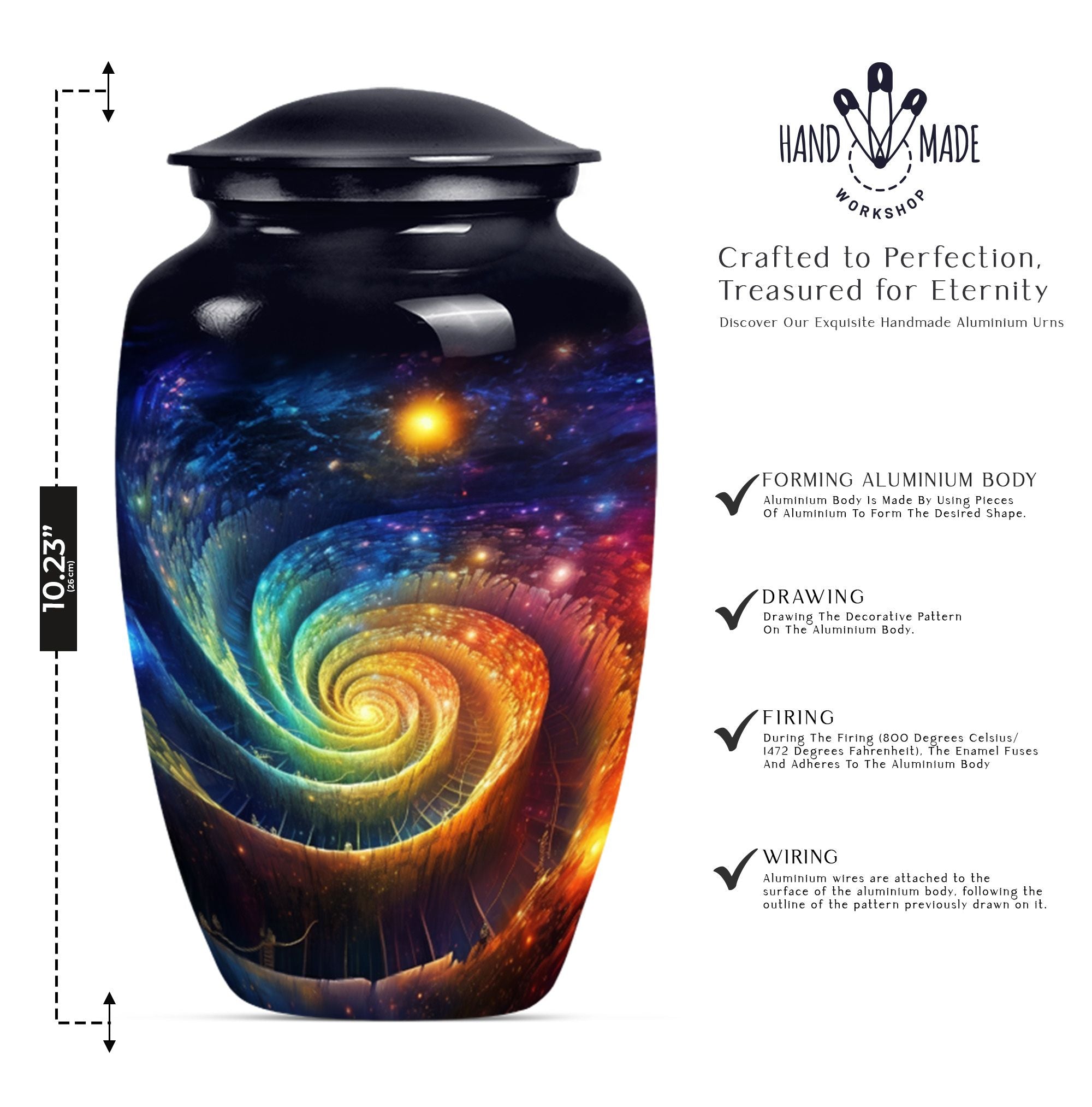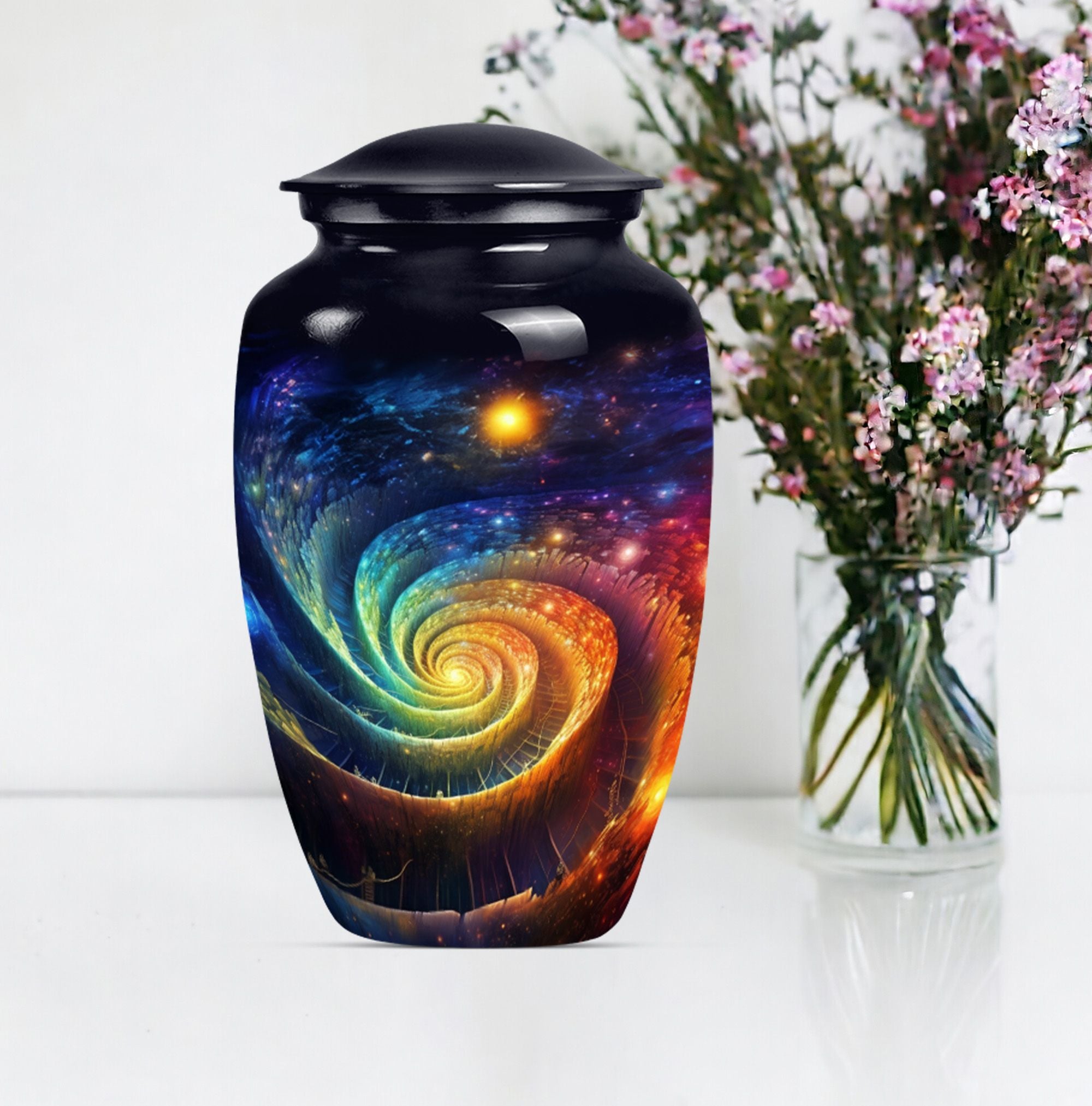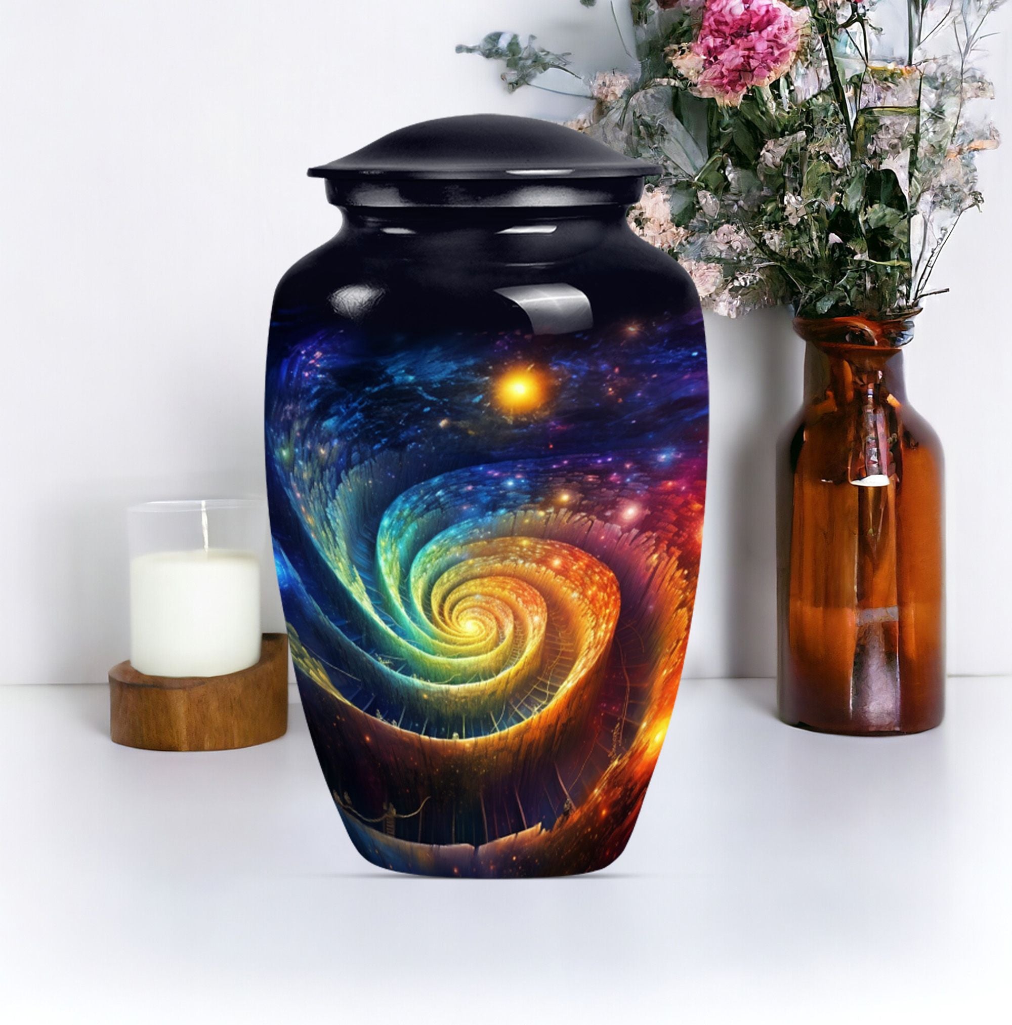 Immerse yourself in the poignant beauty of memorial remembrance with this enchanting 10 inch Galaxy Urn. A comforting tribute for the significant men in your life, it beautifully combines the strength and beauty of Aluminum. Weighing a modest 3.3 pounds, this urn is as substantial as it is minimalistic. Its classic design is tastefully accentuated with a vibing 'Purple Meadow' theme that lays beautiful on its large urn profile. Its capacity holds a generous 200 cubic inches of ashes, offering ample space to preserve the memory of your loved one. Along with the Galaxy Urn, the package also contained a velvet pouch for safe containment of those precious ashes. Adding a profoundly personal touch, the urn can be customized with engraved names. Celebrate their legacy and transform their final resting place into one of elegance with these stylish funeral urns for men's ashes. This work of art is not just a decorative urn but a piece that cherishes the precious moments you shared with them.