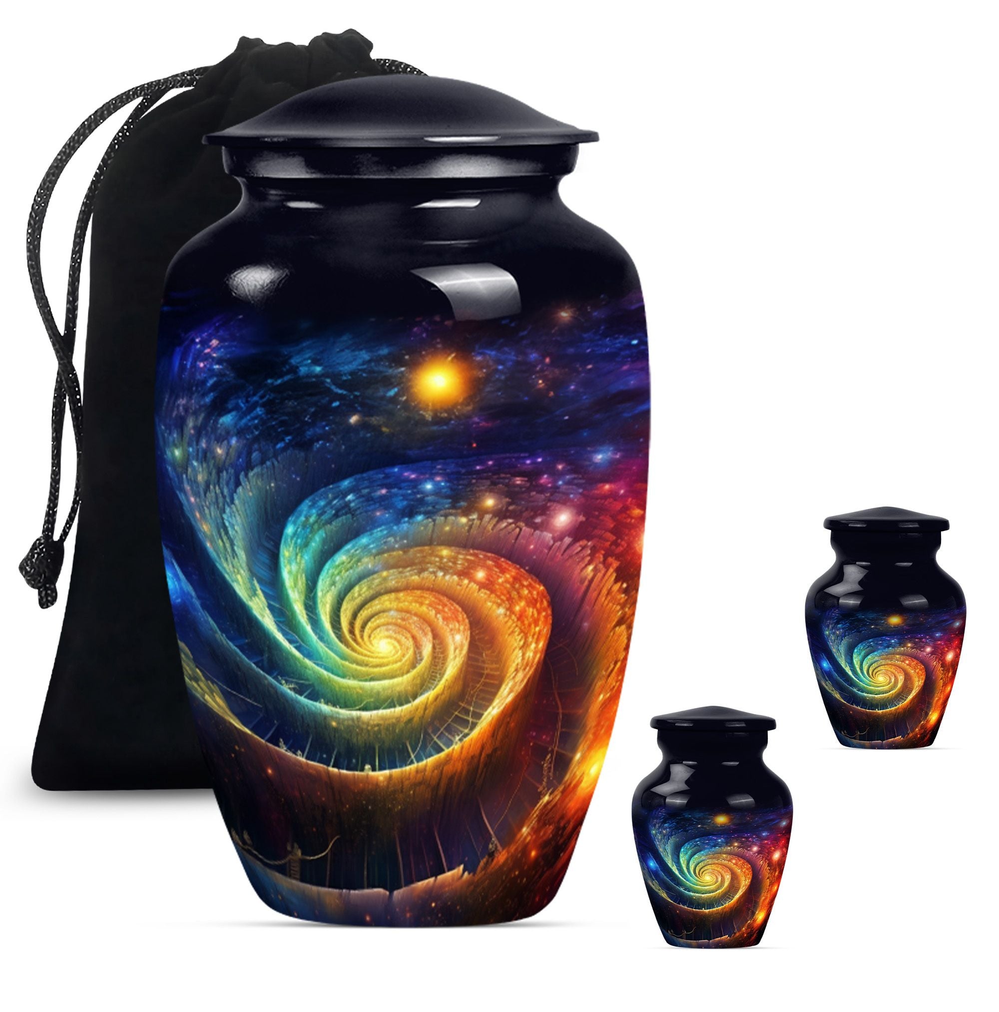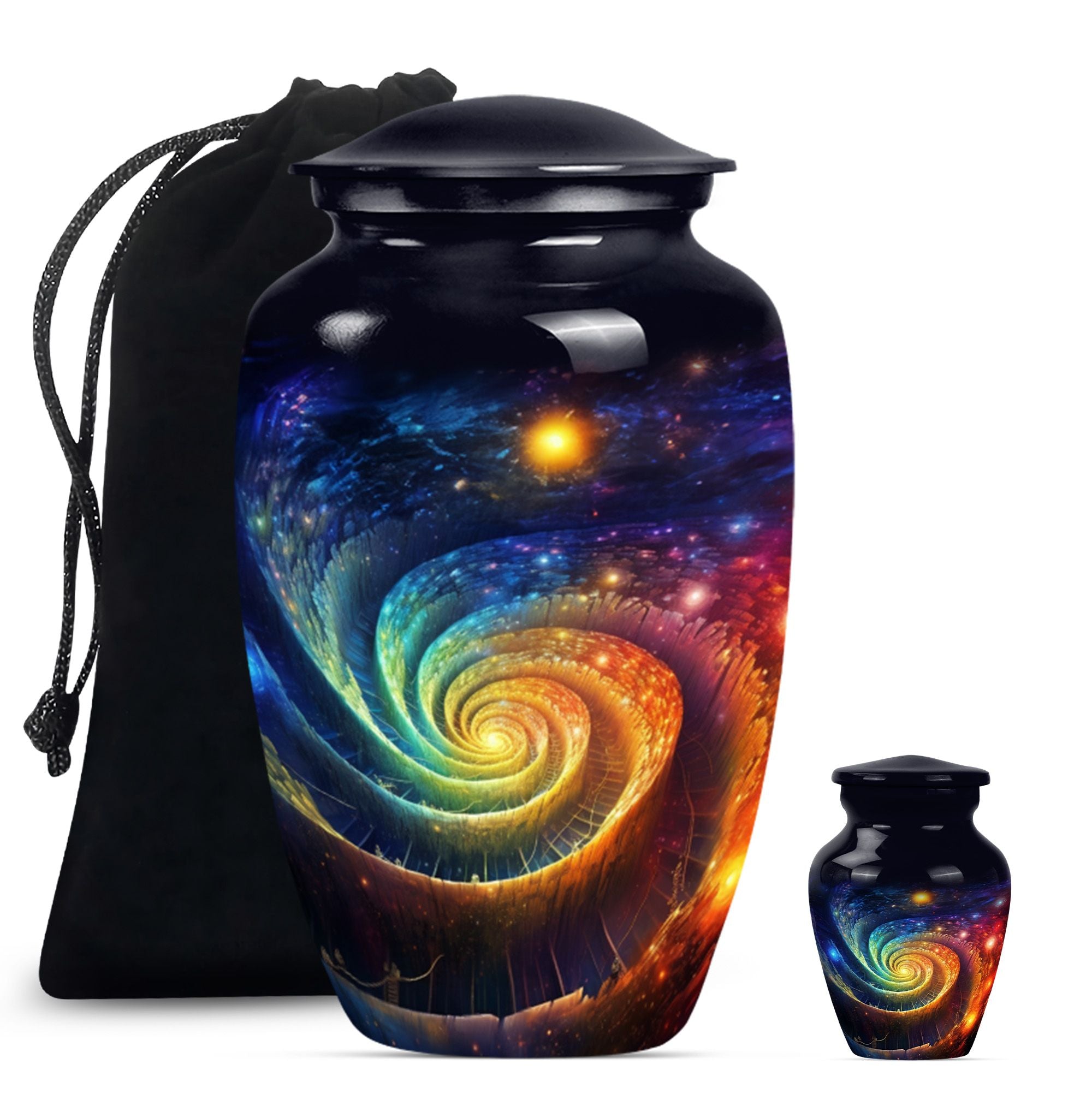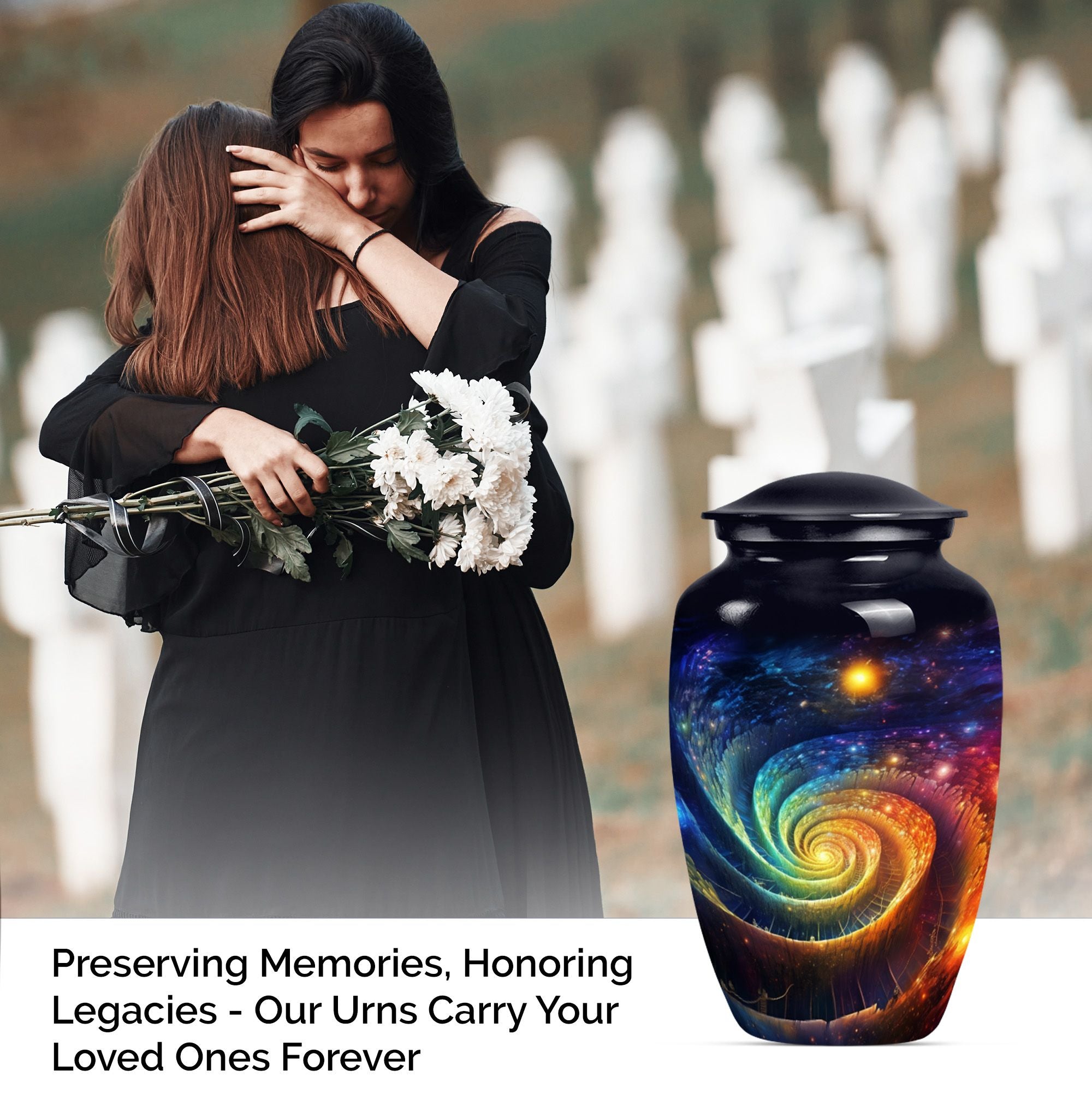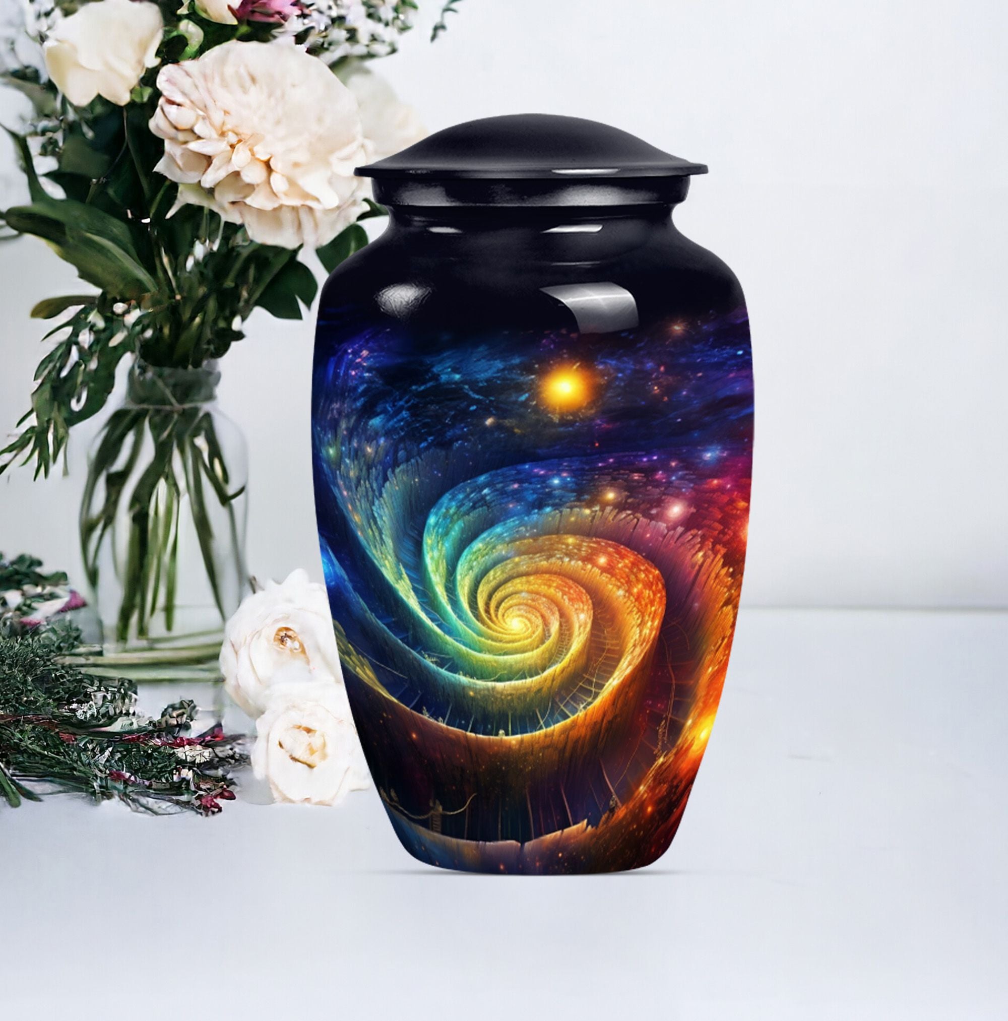 Immerse yourself in the poignant beauty of memorial remembrance with this enchanting 10 inch Galaxy Urn. A comforting tribute for the significant men in your life, it beautifully combines the strength and beauty of Aluminum. Weighing a modest 3.3 pounds, this urn is as substantial as it is minimalistic. Its classic design is tastefully accentuated with a vibing 'Purple Meadow' theme that lays beautiful on its large urn profile. Its capacity holds a generous 200 cubic inches of ashes, offering ample space to preserve the memory of your loved one. Along with the Galaxy Urn, the package also contained a velvet pouch for safe containment of those precious ashes. Adding a profoundly personal touch, the urn can be customized with engraved names. Celebrate their legacy and transform their final resting place into one of elegance with these stylish funeral urns for men's ashes. This work of art is not just a decorative urn but a piece that cherishes the precious moments you shared with them.