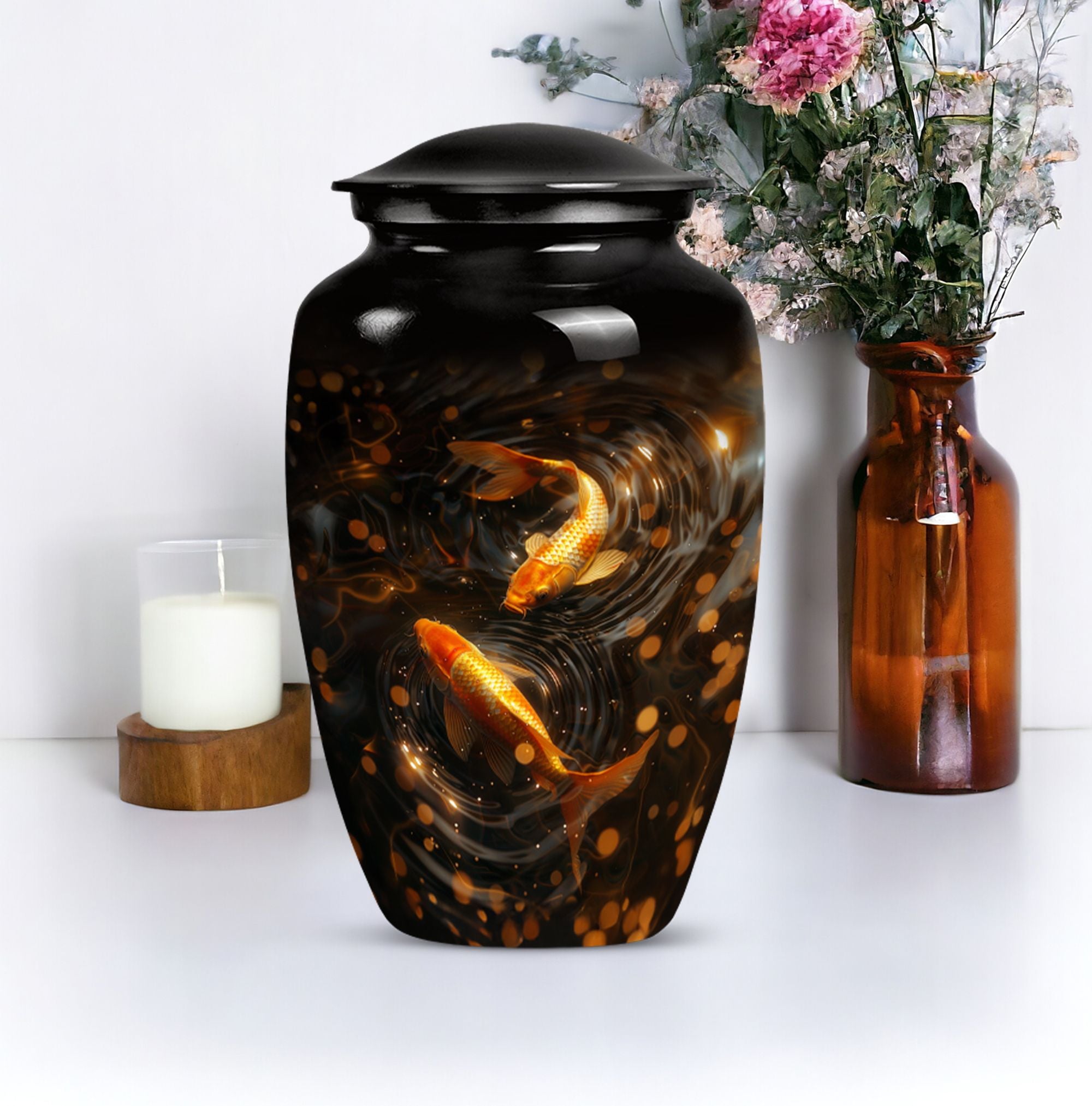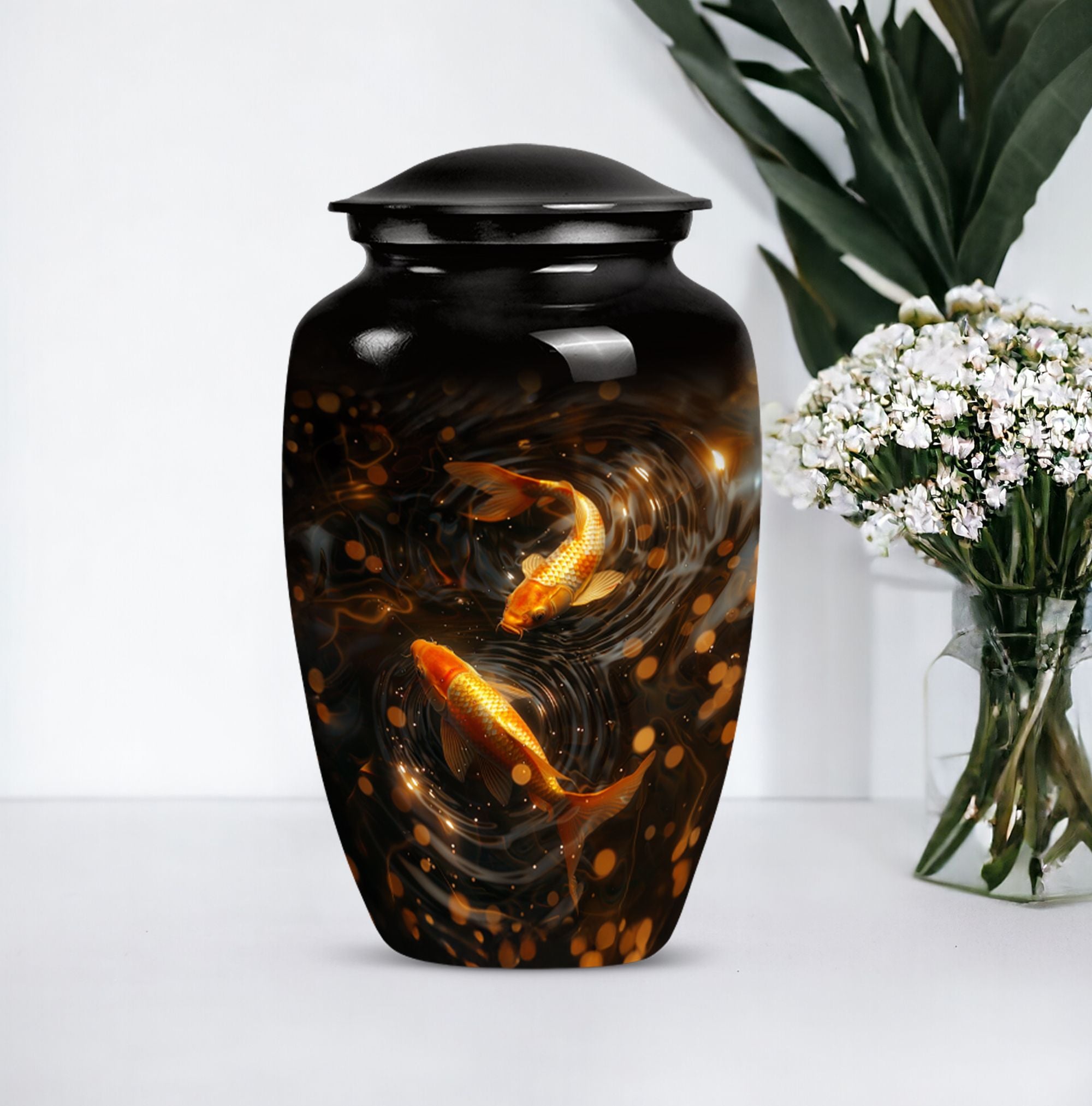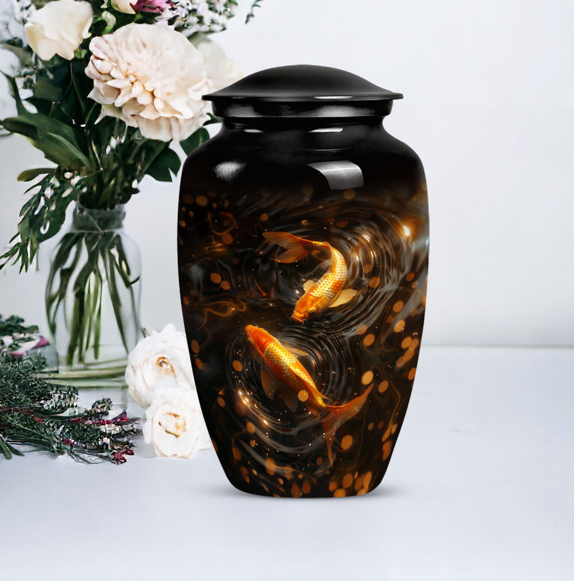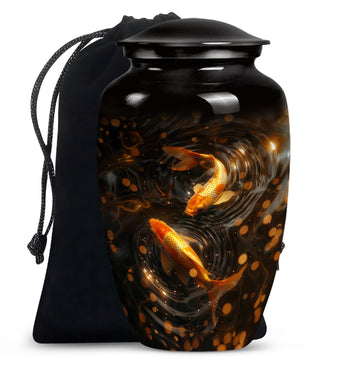 Immerse yourself in the eternal love and memories of your departed loved one with this classic 10-inch gold fish urn. Crafted from durable aluminum, this cremation urn has a weight of 3.3 pounds and remains a symbol of everlasting care. As part of the package, you get a velvet pouch for the containment of ashes. The urn's capacity is generous, accommodating up to 200 cubic inches of ash, making it a fitting tribute for your adult female family member or friend. Our large urn features an elaborate butterfly theme, reflecting the metamorphosis and elevating of the spirit towards heaven. It can be further personalized with engraved names, adding a unique touch and making every piece one of a kind. Uncommon keyword phrases such as 'cremation medium urns for human ashes', 'human ash adult', and 'shape boxes for gifts' are an important reflection of our product. Whether you're on a mission for meaningful funeral cremation urns or an aesthetic vessel to cherish memories, our urn provides a heartwarming closure to the physical existence of dearly departed.