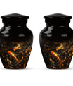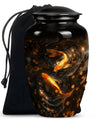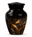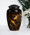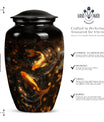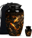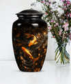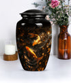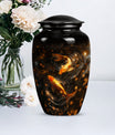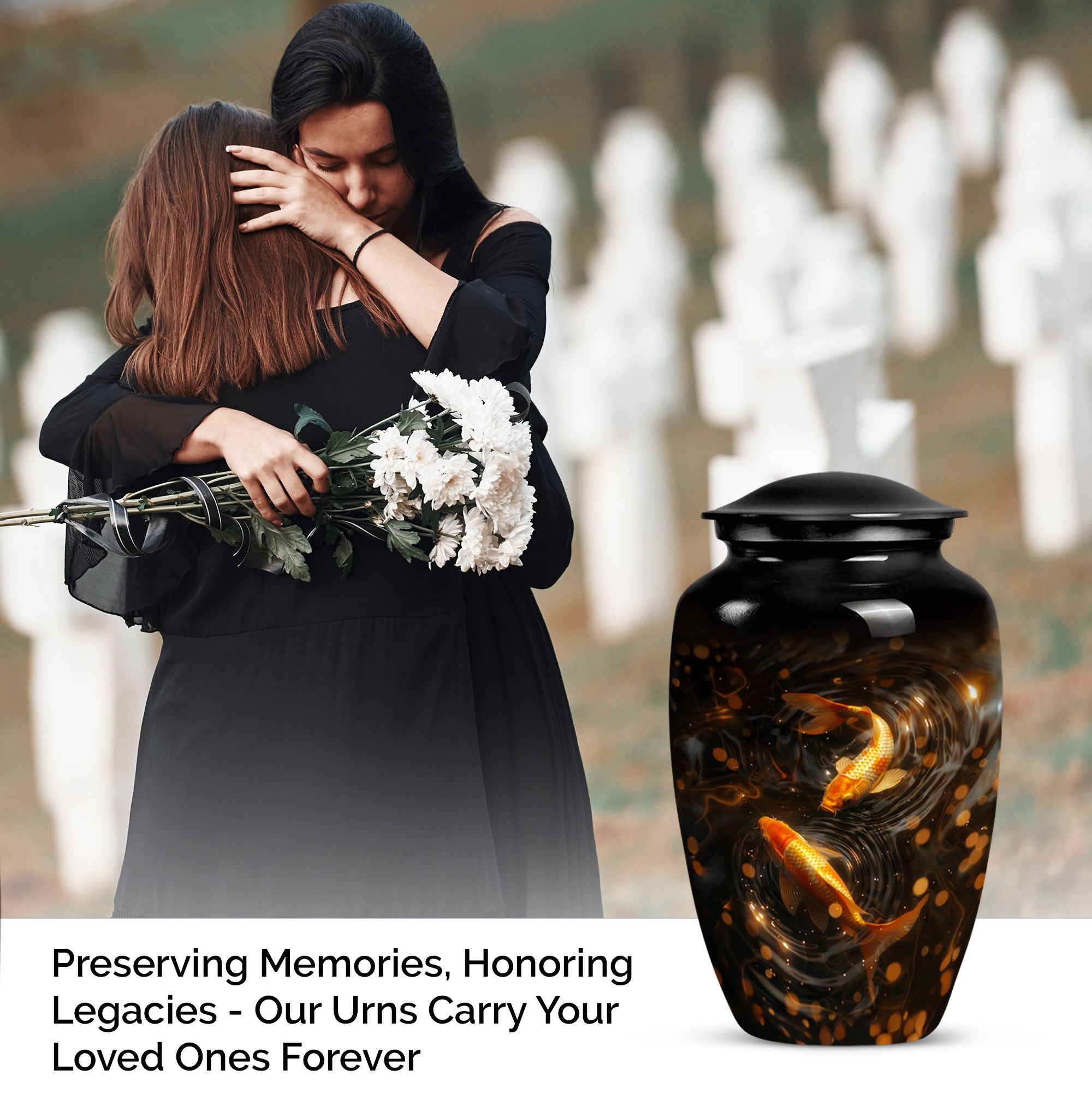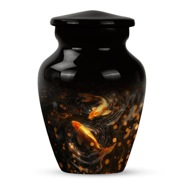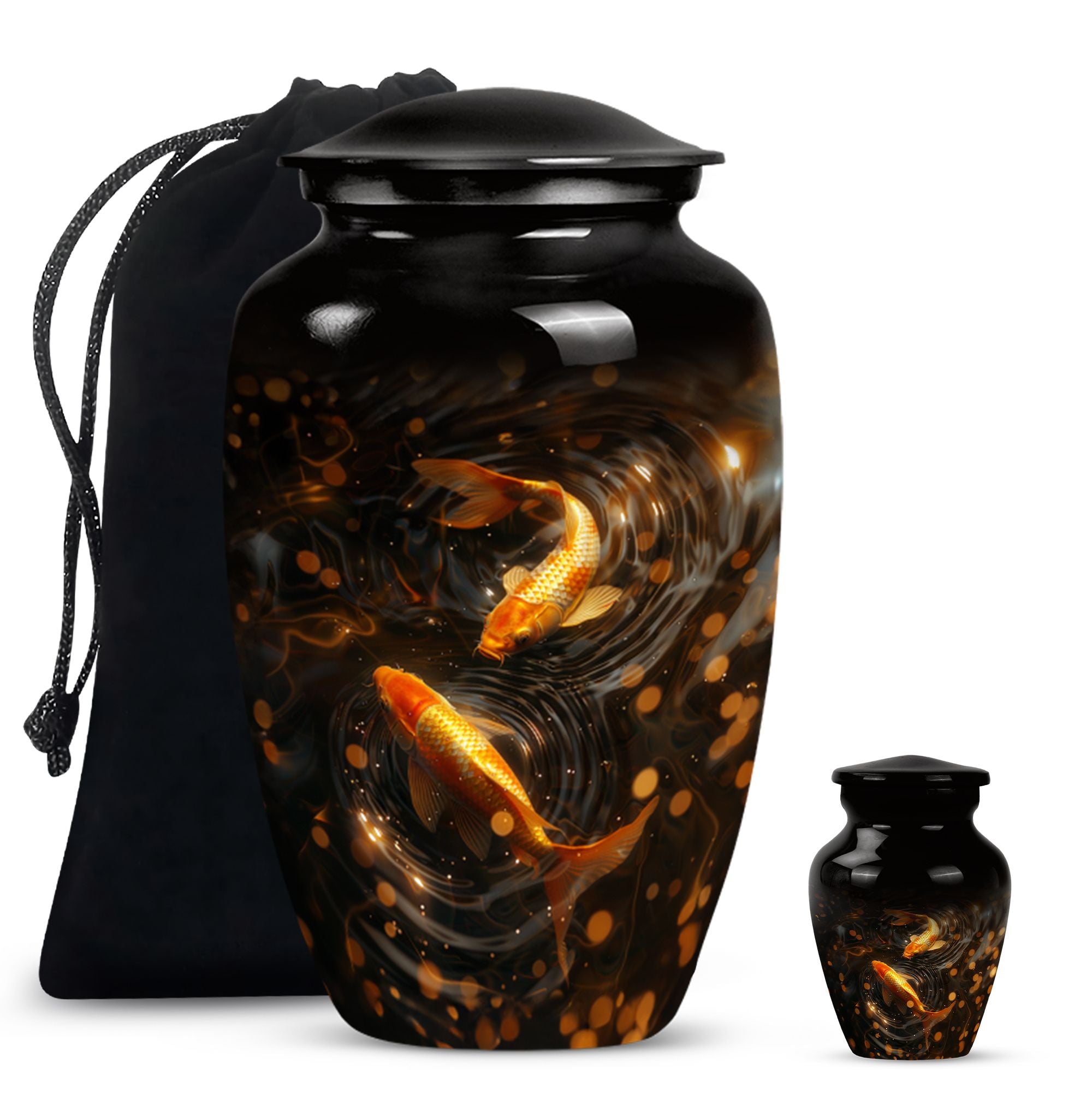 Immerse yourself in the eternal love and memories of your departed loved one with this classic 10-inch gold fish urn. Crafted from durable aluminum, this cremation urn has a weight of 3.3 pounds and remains a symbol of everlasting care. As part of the package, you get a velvet pouch for the containment of ashes. The urn's capacity is generous, accommodating up to 200 cubic inches of ash, making it a fitting tribute for your adult female family member or friend. Our large urn features an elaborate butterfly theme, reflecting the metamorphosis and elevating of the spirit towards heaven. It can be further personalized with engraved names, adding a unique touch and making every piece one of a kind. Uncommon keyword phrases such as 'cremation medium urns for human ashes', 'human ash adult', and 'shape boxes for gifts' are an important reflection of our product. Whether you're on a mission for meaningful funeral cremation urns or an aesthetic vessel to cherish memories, our urn provides a heartwarming closure to the physical existence of dearly departed.