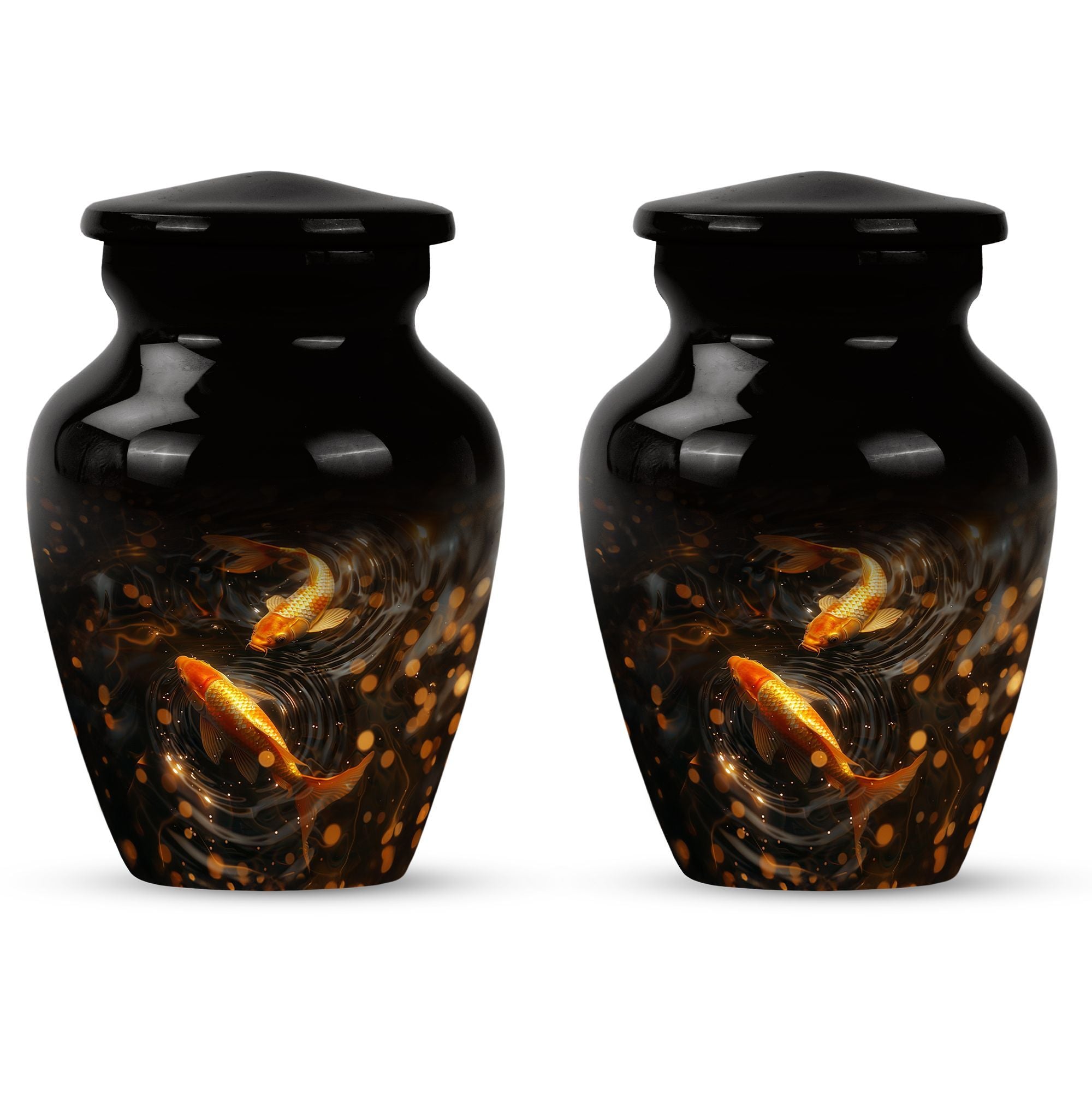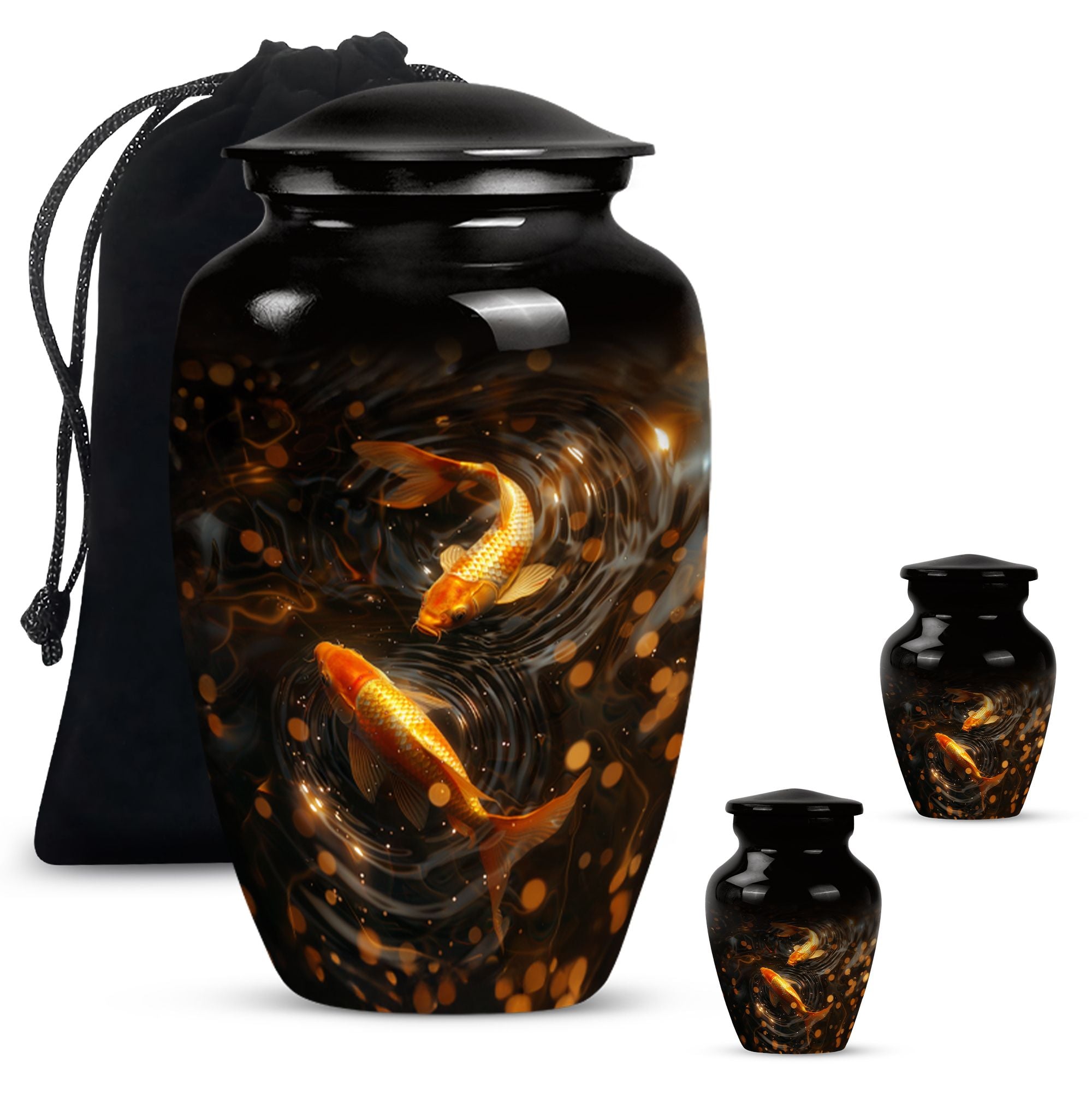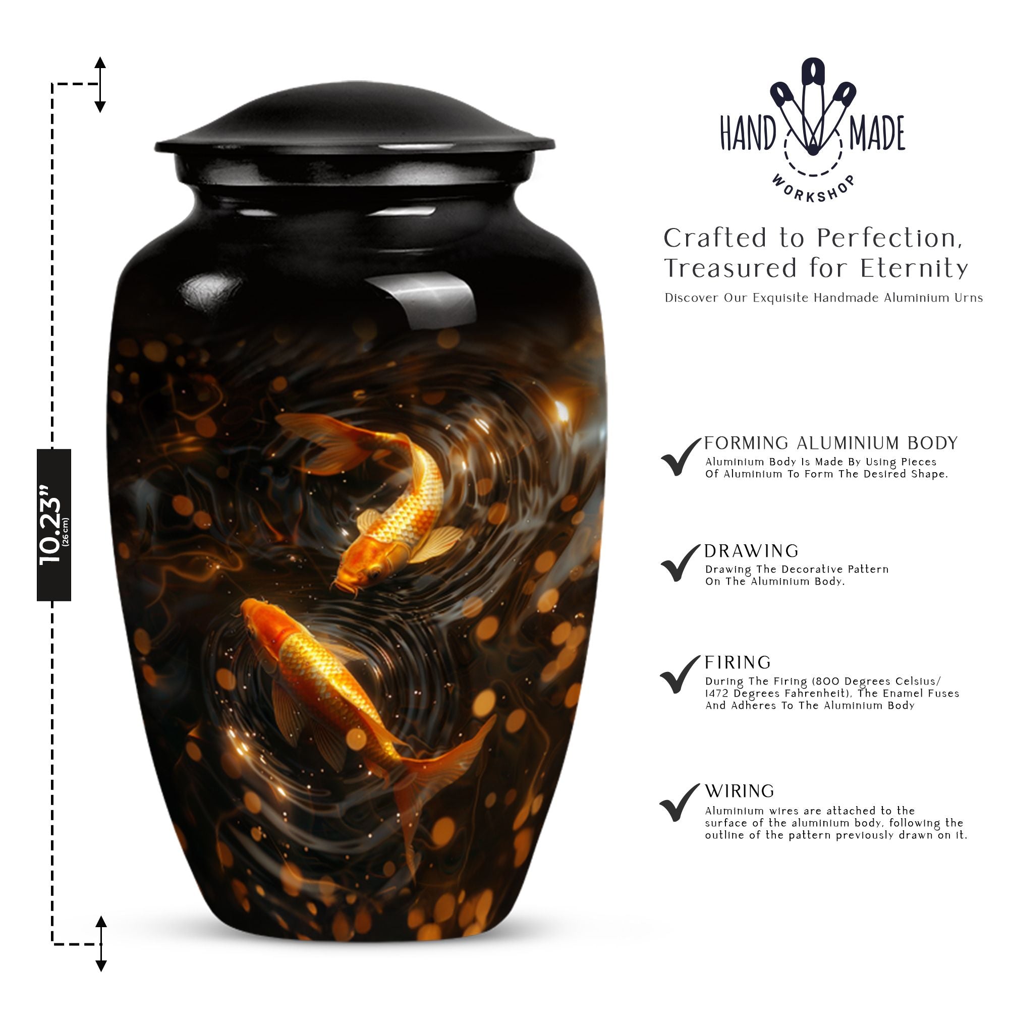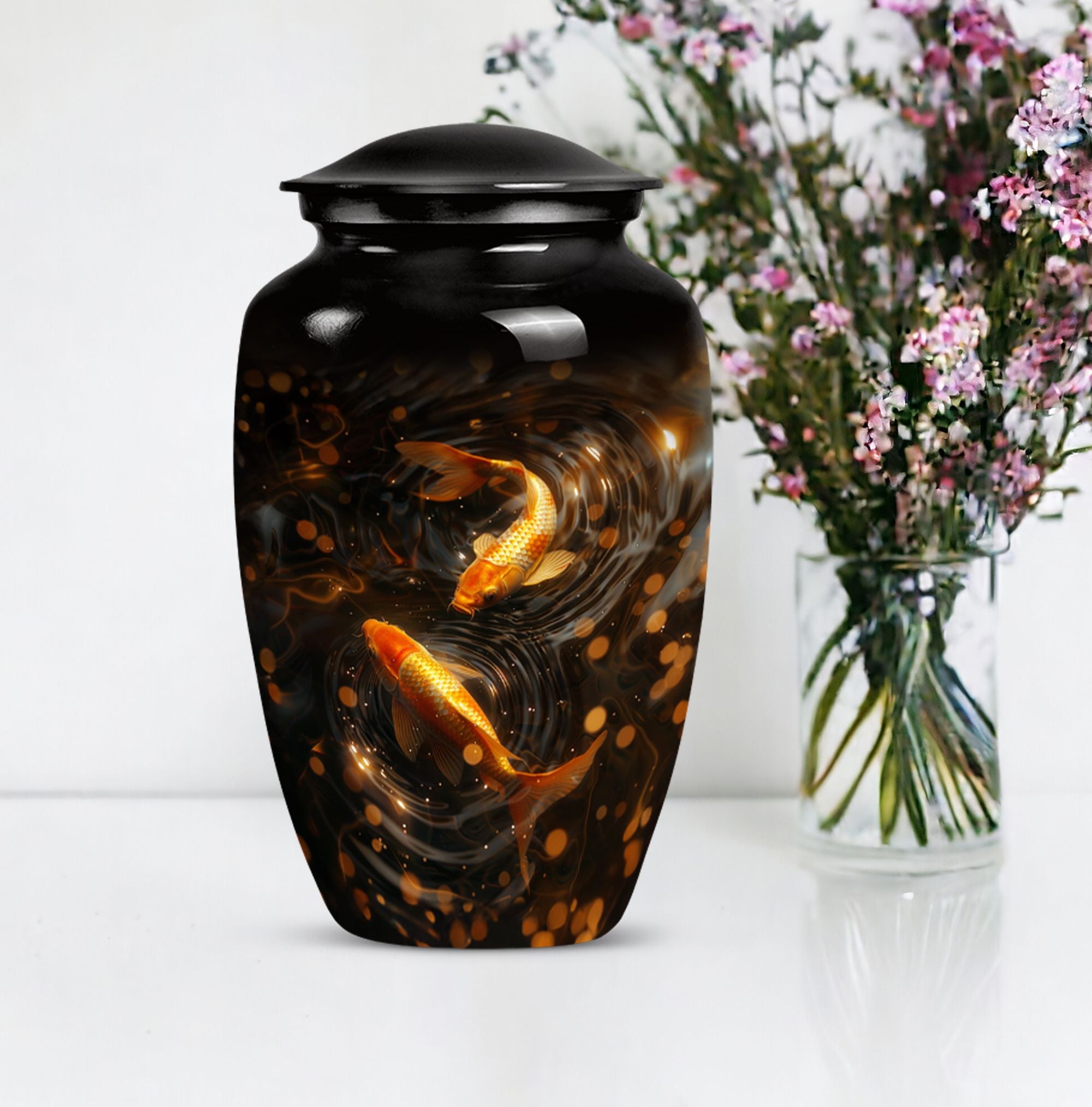 Immerse yourself in the eternal love and memories of your departed loved one with this classic 10-inch gold fish urn. Crafted from durable aluminum, this cremation urn has a weight of 3.3 pounds and remains a symbol of everlasting care. As part of the package, you get a velvet pouch for the containment of ashes. The urn's capacity is generous, accommodating up to 200 cubic inches of ash, making it a fitting tribute for your adult female family member or friend. Our large urn features an elaborate butterfly theme, reflecting the metamorphosis and elevating of the spirit towards heaven. It can be further personalized with engraved names, adding a unique touch and making every piece one of a kind. Uncommon keyword phrases such as 'cremation medium urns for human ashes', 'human ash adult', and 'shape boxes for gifts' are an important reflection of our product. Whether you're on a mission for meaningful funeral cremation urns or an aesthetic vessel to cherish memories, our urn provides a heartwarming closure to the physical existence of dearly departed.