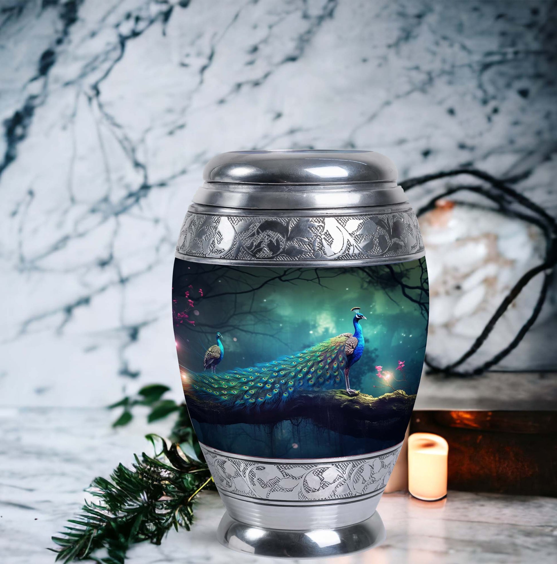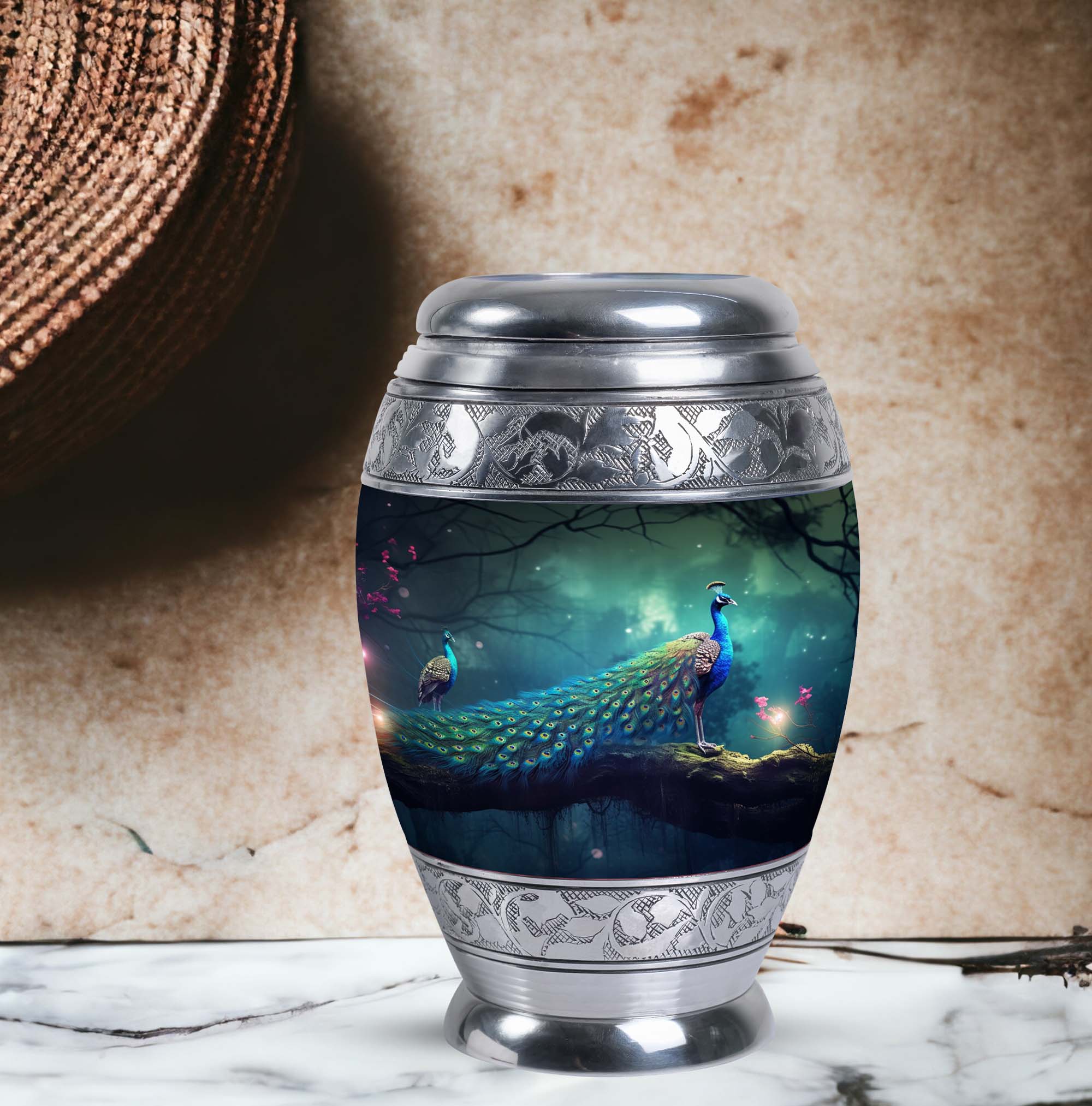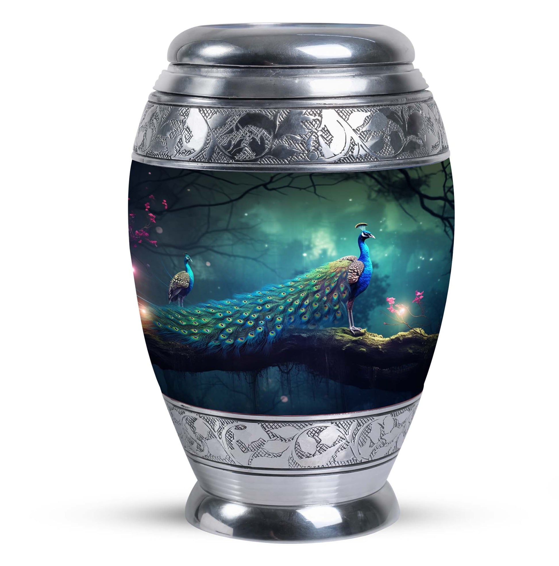 Embrace the memory of your loved ones with dignity and elegance with our Large Peacock Urn, a distinguished selection in our impressive catalog of urns for cremation. With a height of 10 inches, a size of 3 inches, and a weight of 3.3 pounds, this classic urn is crafted from high-quality aluminium, ensuring both beauty and durability. Either used as a decorative artifact or for the storage of ashes, its capacity of 200 cubic inches ensures ample space for containment. The package also includes a soft velvet pouch to keep the ashes secure and safe. Personalize this memorial urn with engraved names, adding a touch of unique sentiment to the representation of your beloved. Excluded from the common display of urns, our Peacock Urn is a perfect fusion of traditional craftsmanship and modern aesthetics. Ideal for those searching for Metal Urns for Human Ashes, Custom Cremation Urns, Funeral Ashes Containers, and Modern Urns for Ashes. Bear in mind forefront connotation of your beloved with our Peacock Urn.