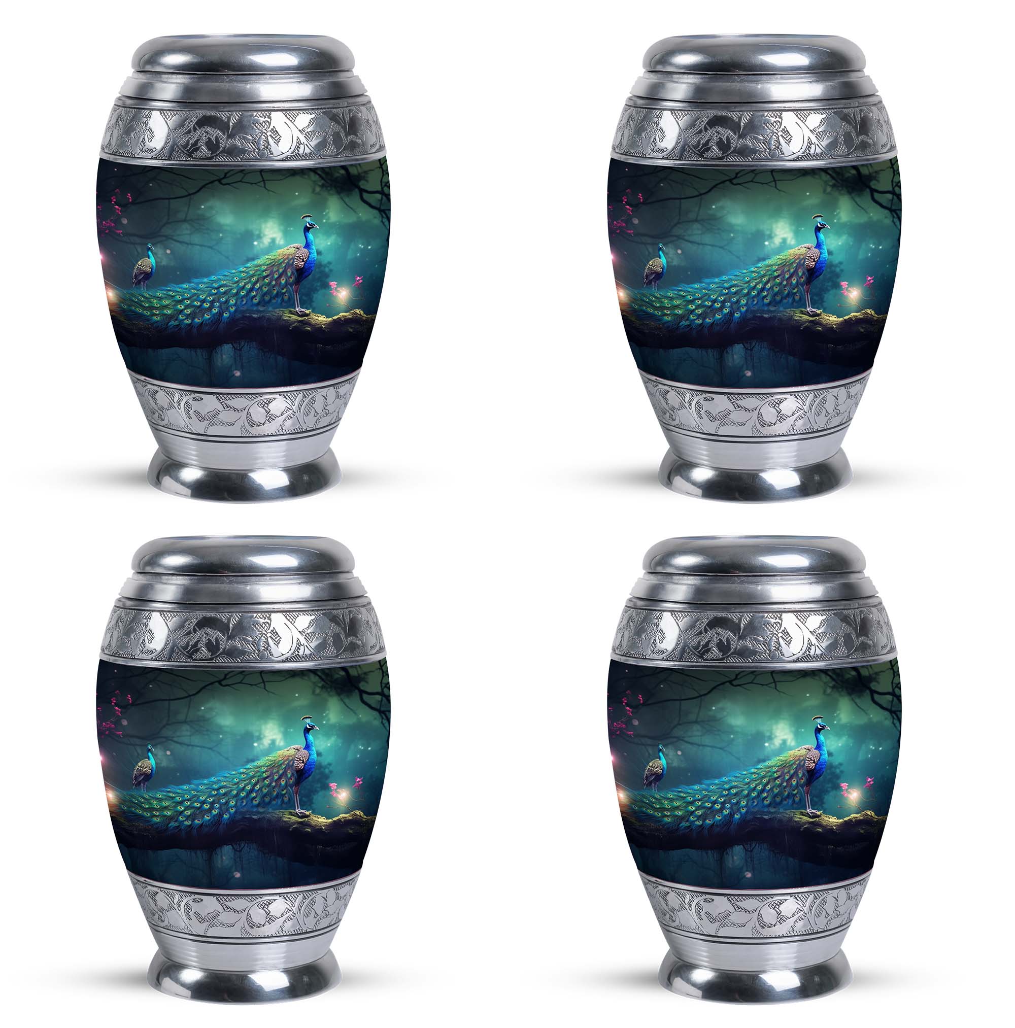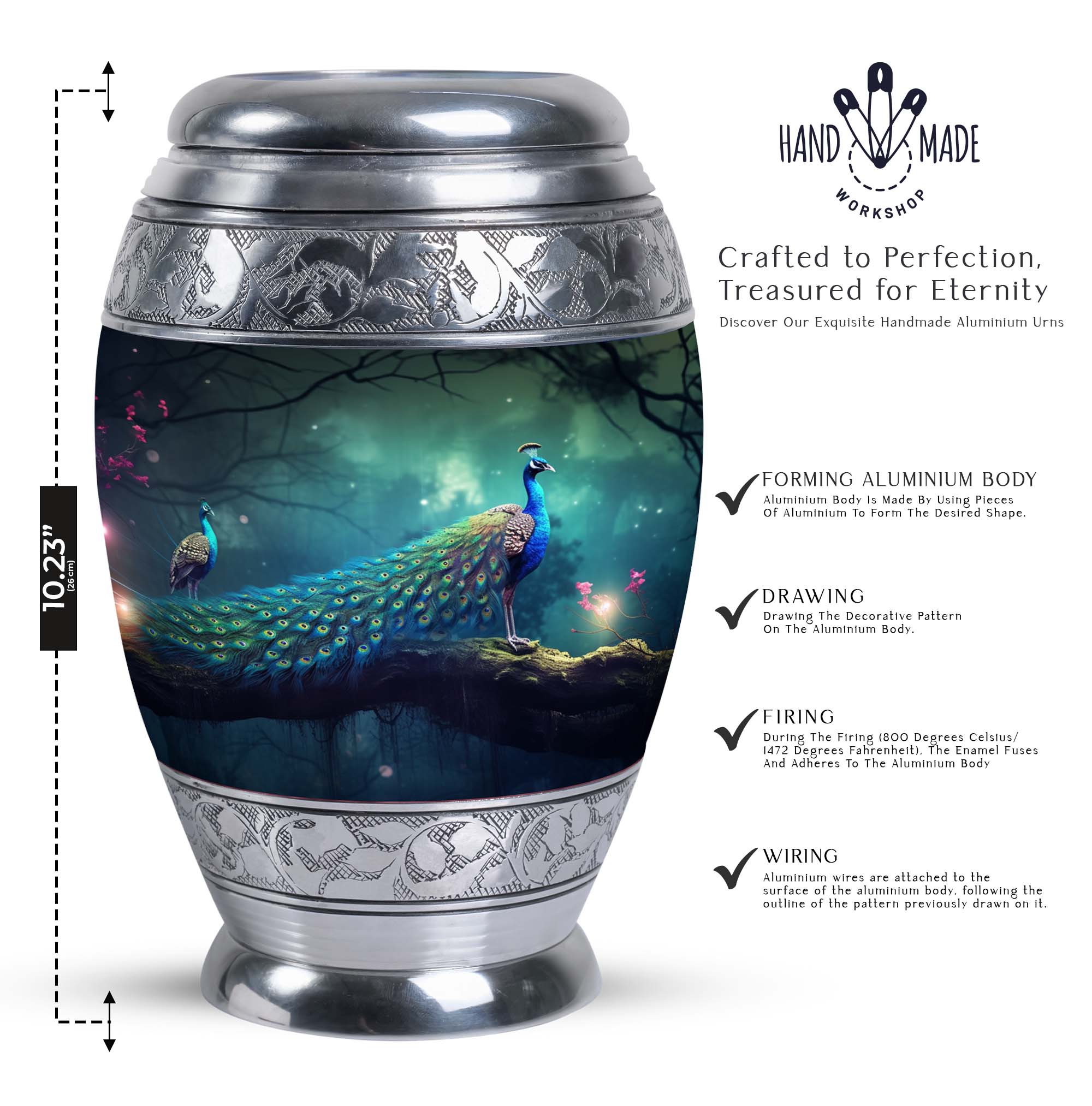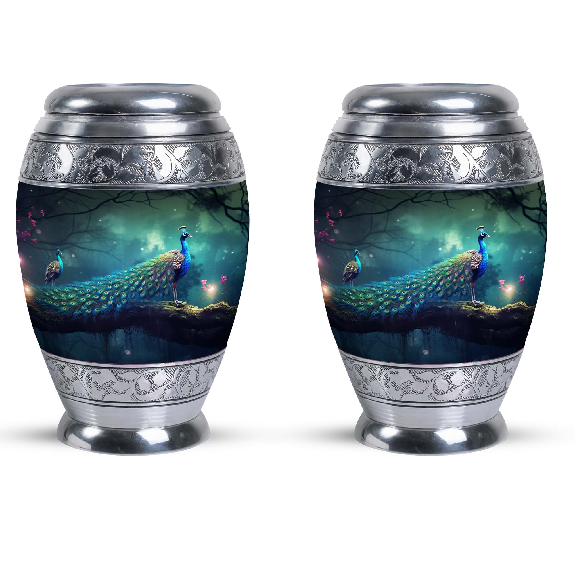 Embrace the memory of your loved ones with dignity and elegance with our Large Peacock Urn, a distinguished selection in our impressive catalog of urns for cremation. With a height of 10 inches, a size of 3 inches, and a weight of 3.3 pounds, this classic urn is crafted from high-quality aluminium, ensuring both beauty and durability. Either used as a decorative artifact or for the storage of ashes, its capacity of 200 cubic inches ensures ample space for containment. The package also includes a soft velvet pouch to keep the ashes secure and safe. Personalize this memorial urn with engraved names, adding a touch of unique sentiment to the representation of your beloved. Excluded from the common display of urns, our Peacock Urn is a perfect fusion of traditional craftsmanship and modern aesthetics. Ideal for those searching for Metal Urns for Human Ashes, Custom Cremation Urns, Funeral Ashes Containers, and Modern Urns for Ashes. Bear in mind forefront connotation of your beloved with our Peacock Urn.
