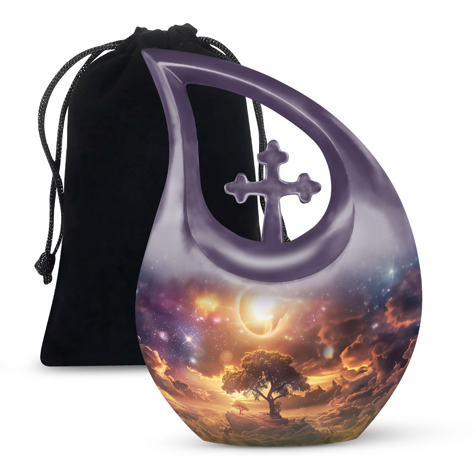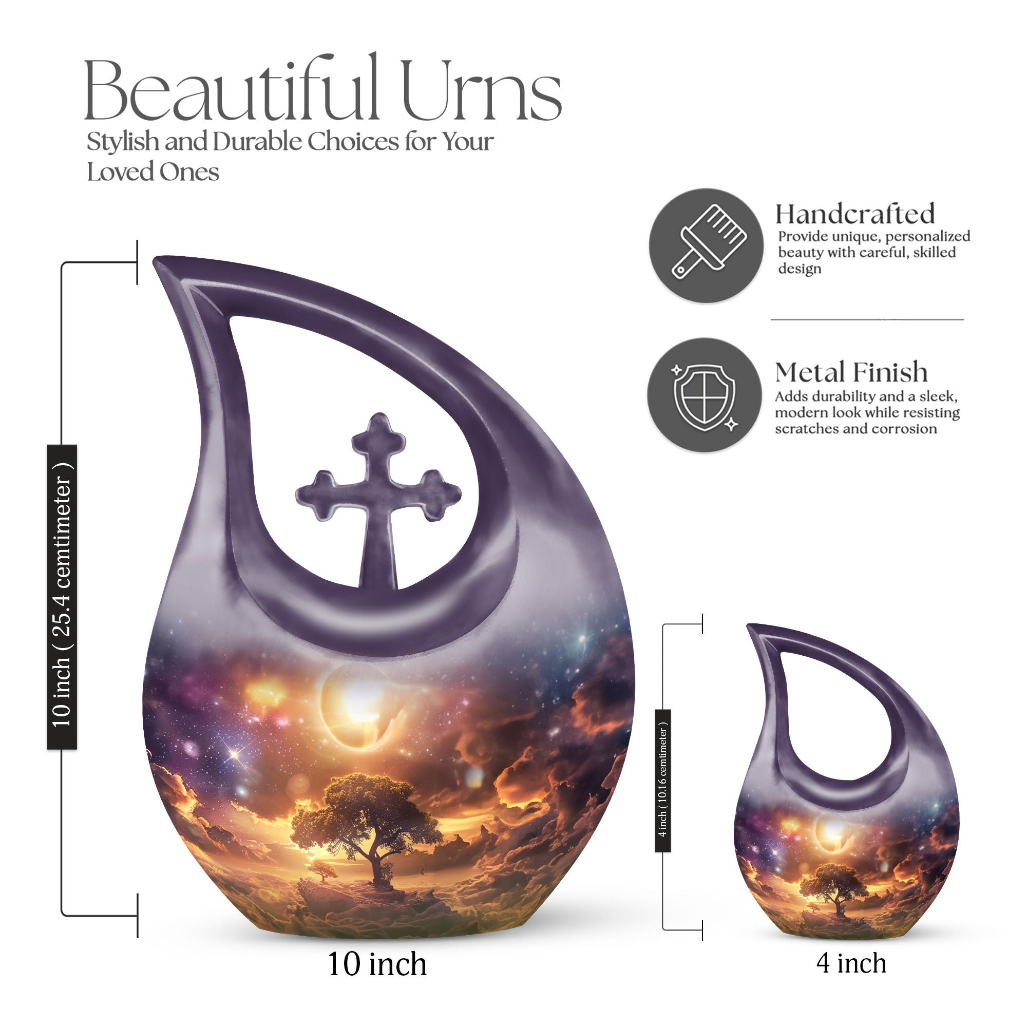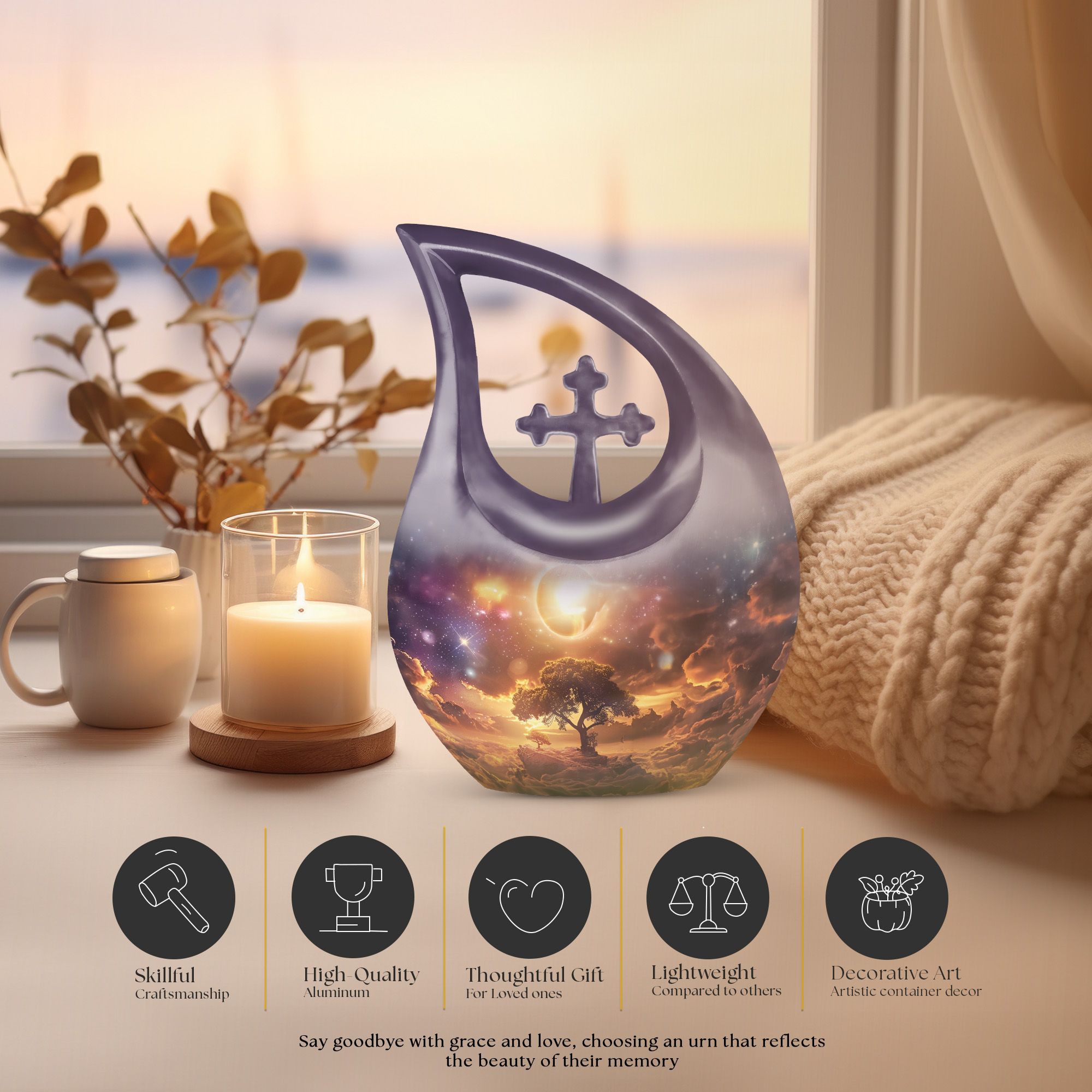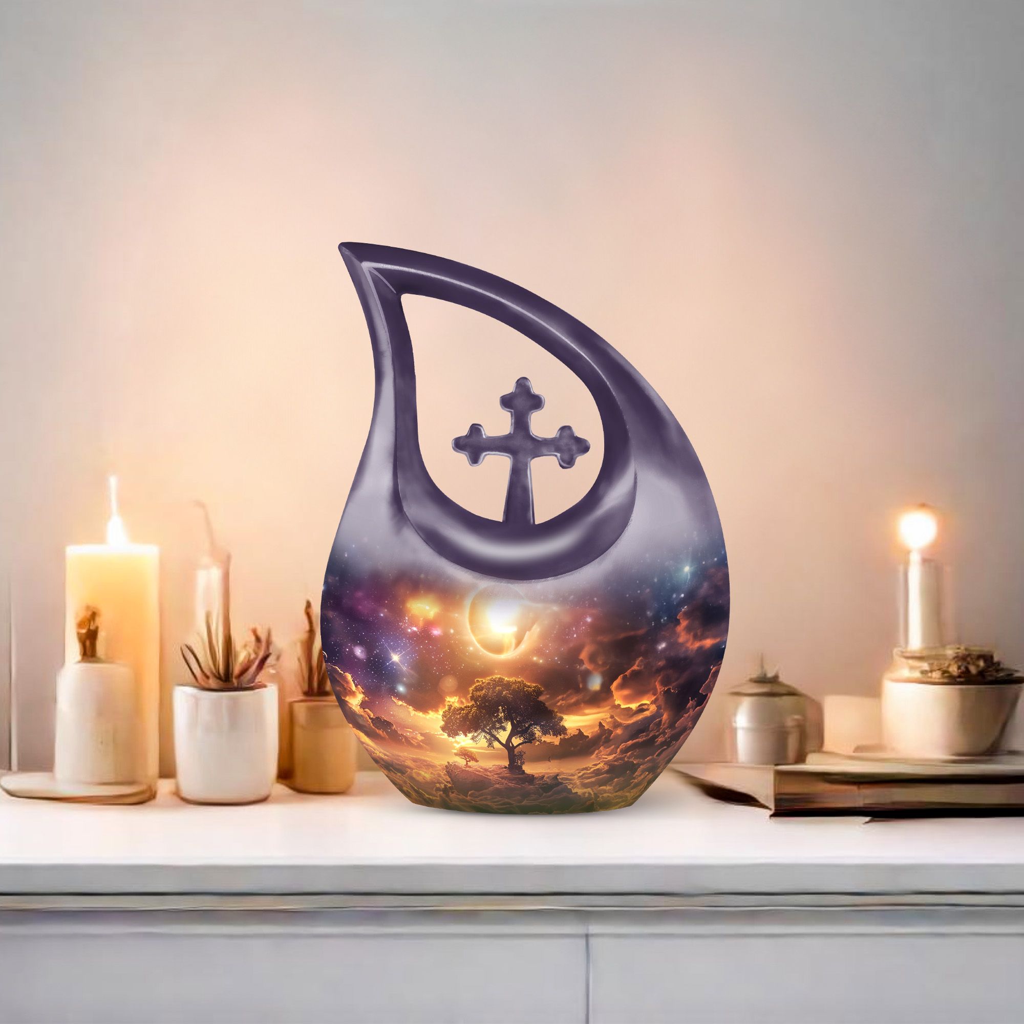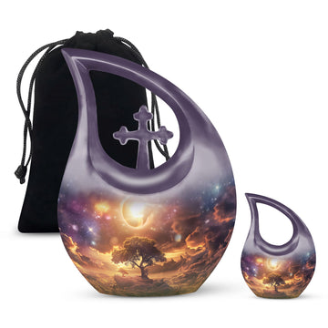 With a unique concept of remembrance, our Solar Symphony Urn is an emotionally striking choice among Decorative Urns for Human Ashes, bringing solace and comfort during a time of bereavement. The design, a Cross Drop symbol, adds an element of gravity and nobility. Crafted from high-quality Aluminum, this Large Urn has a weight of 3.3 pounds and stands tall at 10 inches, with the capacity of 200 cubic inches, suitable for any adults. A velvet pouch accompanies the urn for the safe containment of ashes, adding another layer of respect and modesty. Complementing the dignity of the urn is the personalization feature that allows for engraved names, creating a unique heartfelt tribute. Whether you're in search of Personalized Urns ideal for Mom, or XL Urns for Human Ashes, or Small Memorial Urns, our stand-out Solar Symphony Urn ties it all together with a beautiful and solemn final resting place for your loved ones.
