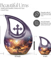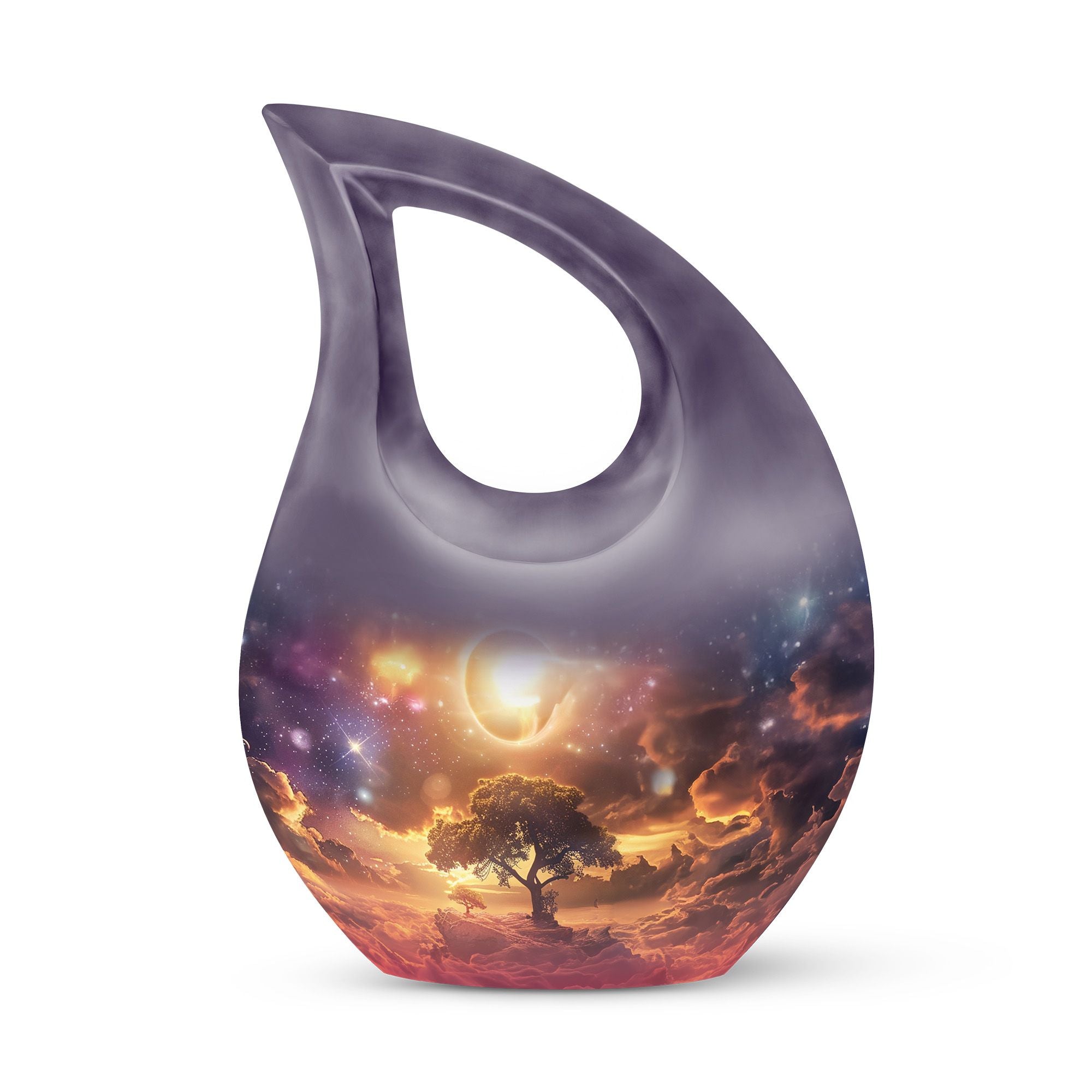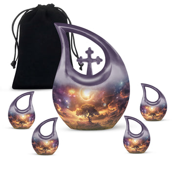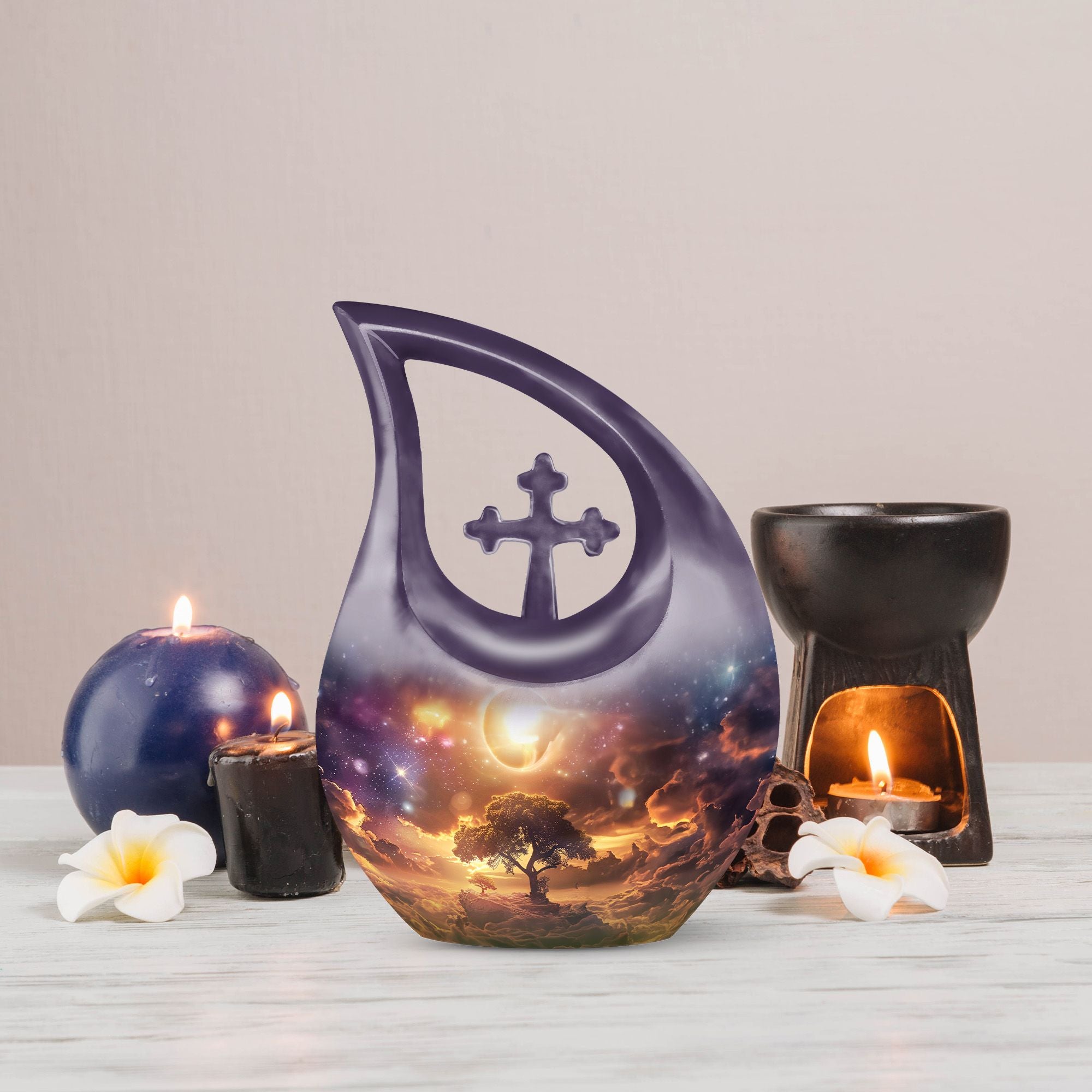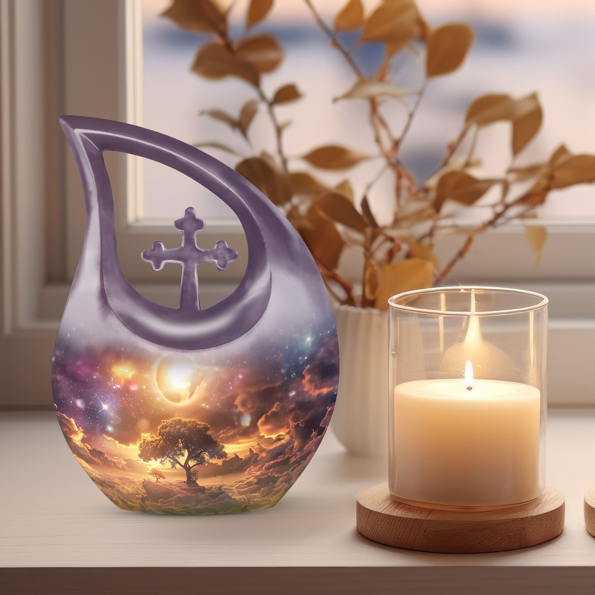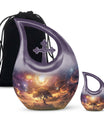 With a unique concept of remembrance, our Solar Symphony Urn is an emotionally striking choice among Decorative Urns for Human Ashes, bringing solace and comfort during a time of bereavement. The design, a Cross Drop symbol, adds an element of gravity and nobility. Crafted from high-quality Aluminum, this Large Urn has a weight of 3.3 pounds and stands tall at 10 inches, with the capacity of 200 cubic inches, suitable for any adults. A velvet pouch accompanies the urn for the safe containment of ashes, adding another layer of respect and modesty. Complementing the dignity of the urn is the personalization feature that allows for engraved names, creating a unique heartfelt tribute. Whether you're in search of Personalized Urns ideal for Mom, or XL Urns for Human Ashes, or Small Memorial Urns, our stand-out Solar Symphony Urn ties it all together with a beautiful and solemn final resting place for your loved ones.