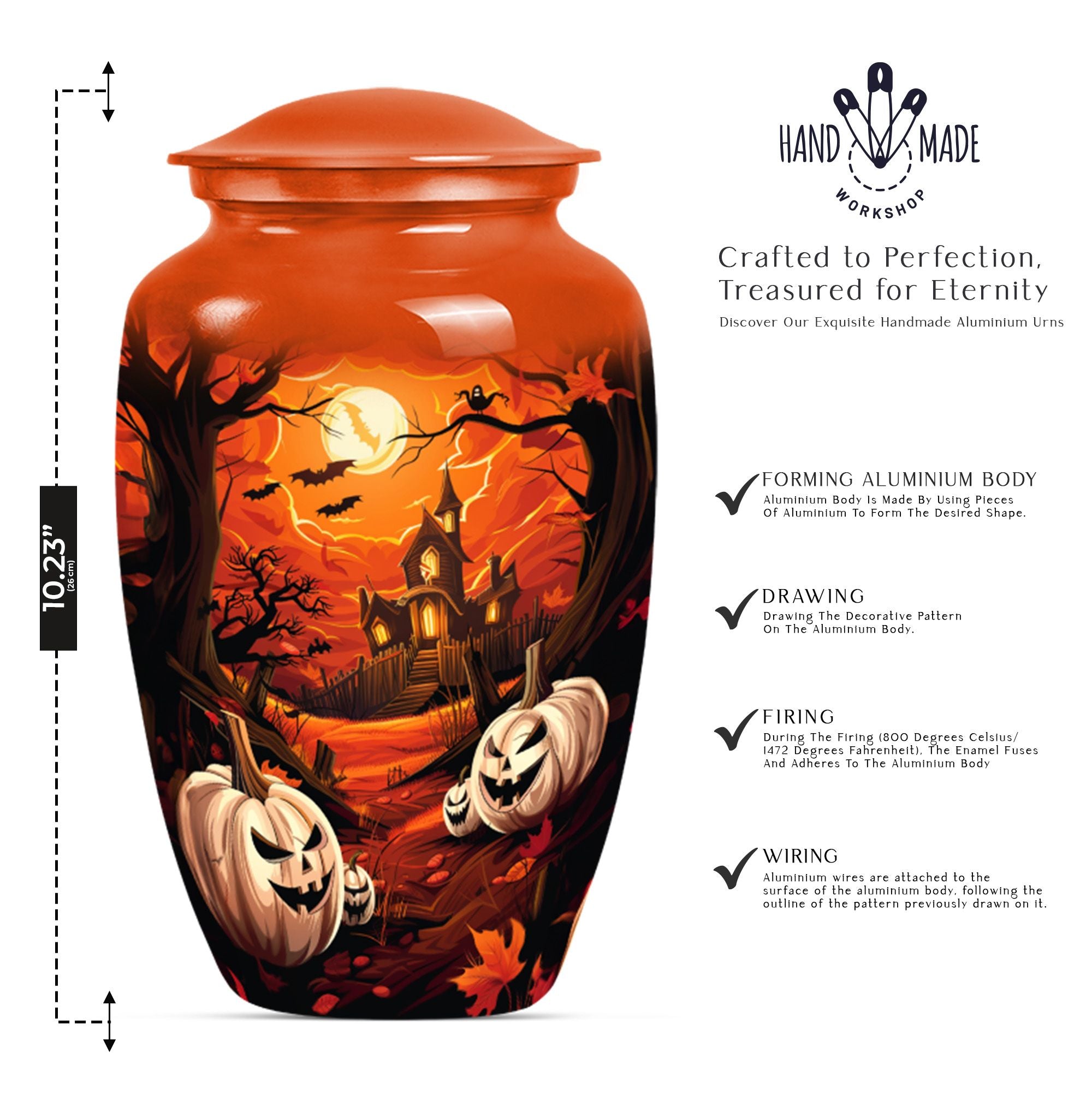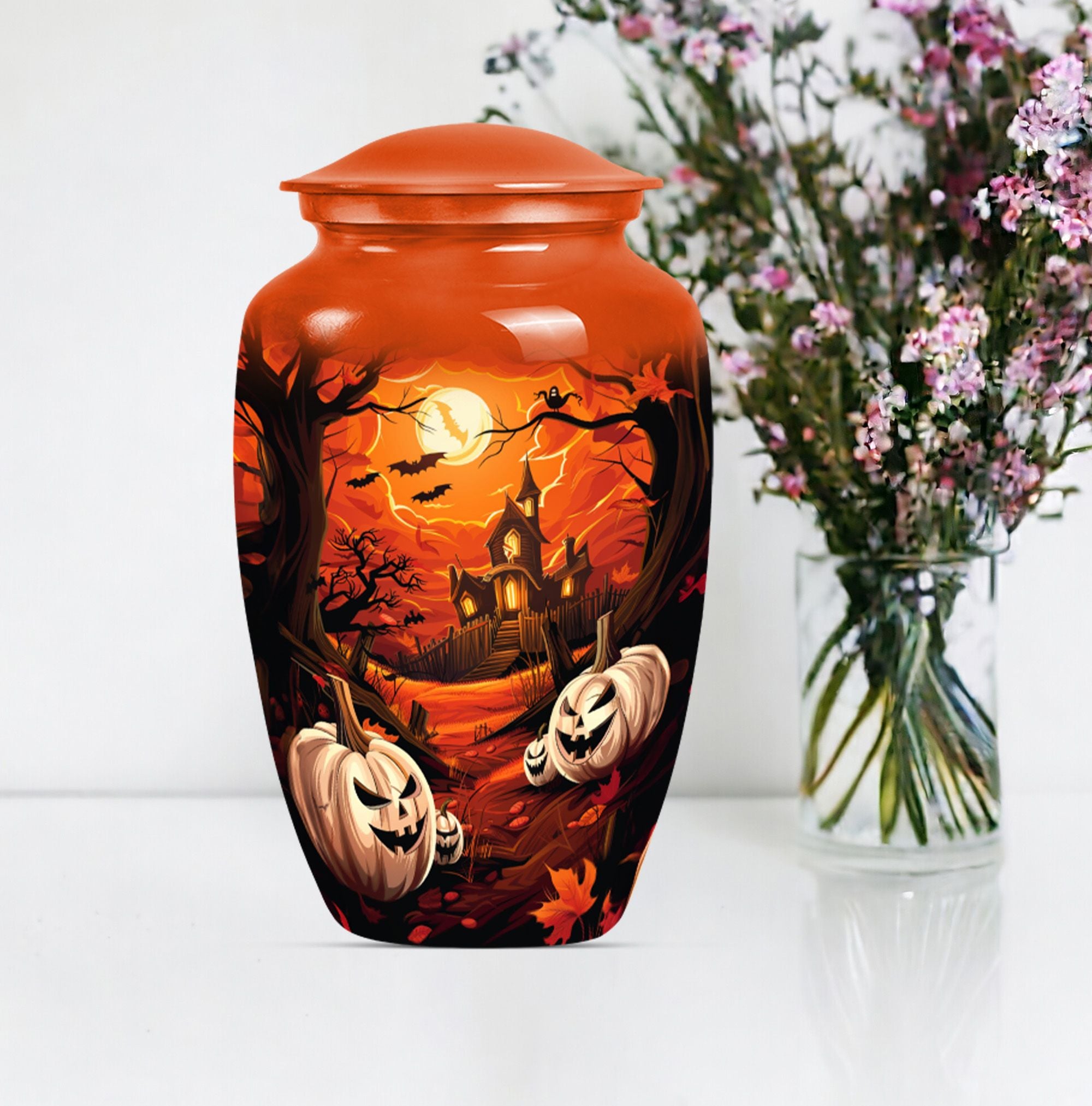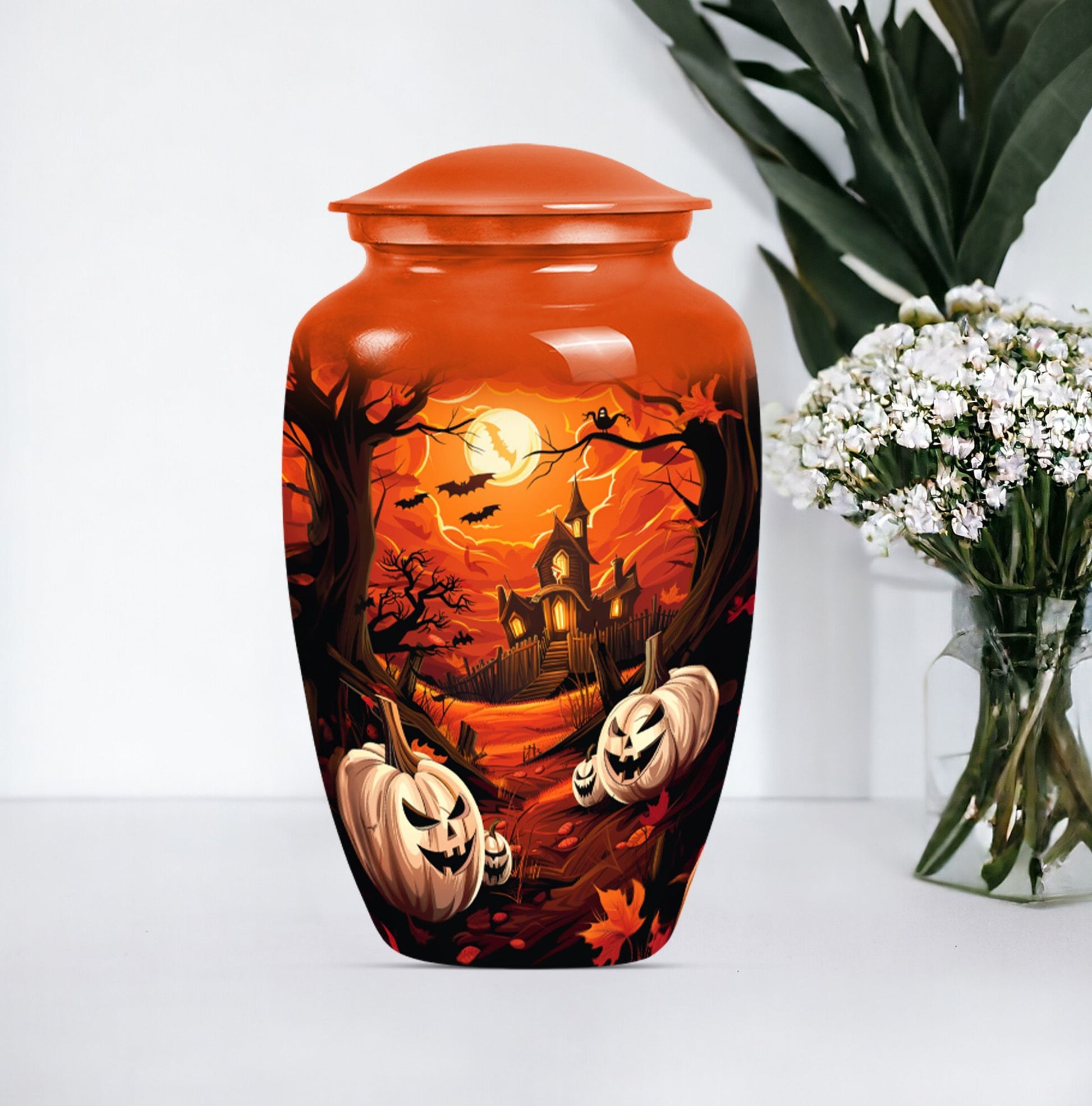 Preserve the memory of your loved ones with our stunning 10-inch 'Halloween Urn', a meticulously crafted example of large urns designed for burials. This offers a capacity of a generous 200 cubic inches catering to adult male or females ashes, making it an exceptional selection among funeral extra large urns. The aluminium construction ensures transportability due to its weight of just 3.3 pounds. The Classic Urn exterior echoes the resilience of your affection for the departed, enriched by a charming flower theme for a serene, comforting presence. The package includes a velvet pouch for secure containment of ashes. Moreover, this urn allows for customization where you can personalize it with engraved names, enabling a sentimental connection unlike any other. Similarly to all cremation urns, this purposeful urn symbolizes peace, love, and eternity, helping you to keep human urn ashes in a dignified manner. This urn is not just a product but an embodiment of love and care for those who were the closest to your heart.