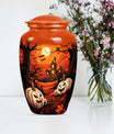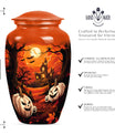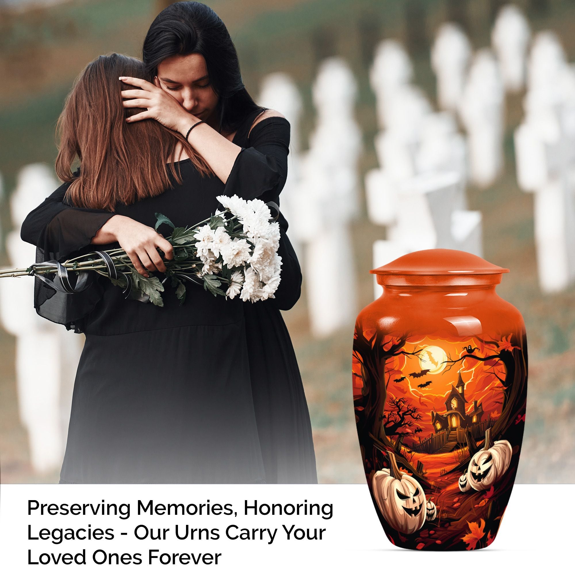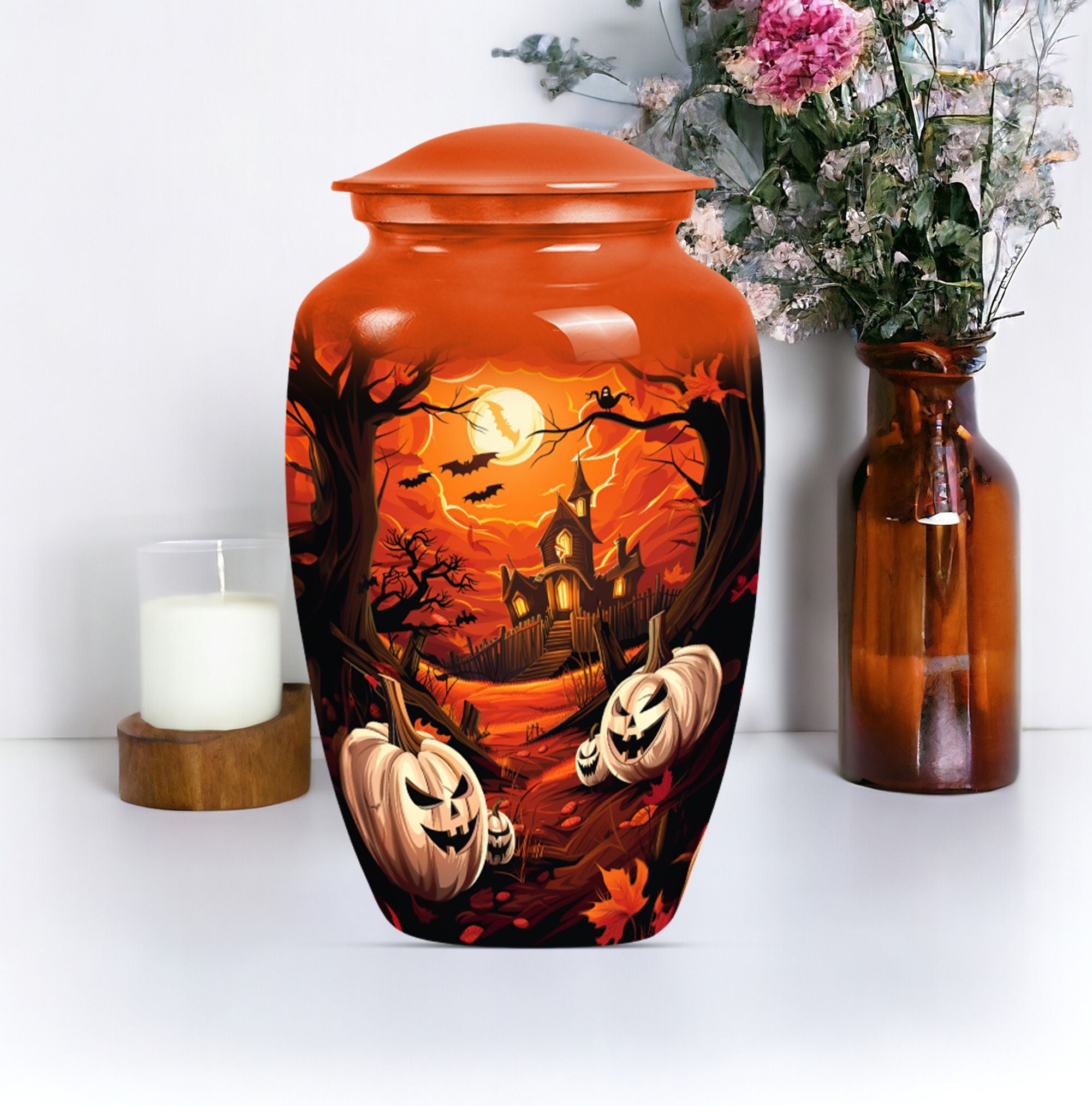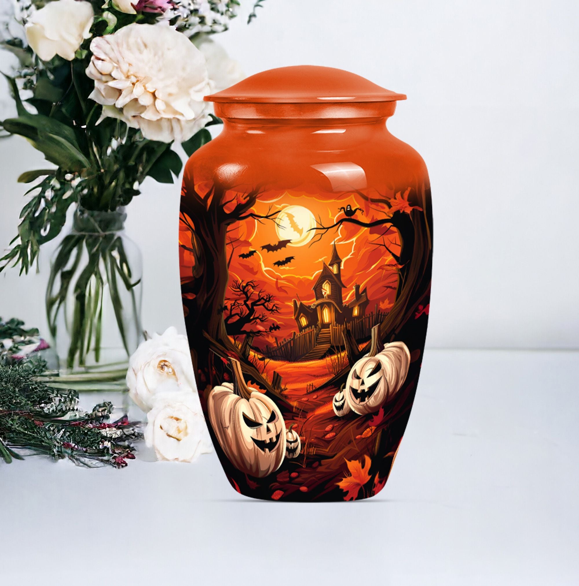 Preserve the memory of your loved ones with our stunning 10-inch 'Halloween Urn', a meticulously crafted example of large urns designed for burials. This offers a capacity of a generous 200 cubic inches catering to adult male or females ashes, making it an exceptional selection among funeral extra large urns. The aluminium construction ensures transportability due to its weight of just 3.3 pounds. The Classic Urn exterior echoes the resilience of your affection for the departed, enriched by a charming flower theme for a serene, comforting presence. The package includes a velvet pouch for secure containment of ashes. Moreover, this urn allows for customization where you can personalize it with engraved names, enabling a sentimental connection unlike any other. Similarly to all cremation urns, this purposeful urn symbolizes peace, love, and eternity, helping you to keep human urn ashes in a dignified manner. This urn is not just a product but an embodiment of love and care for those who were the closest to your heart.