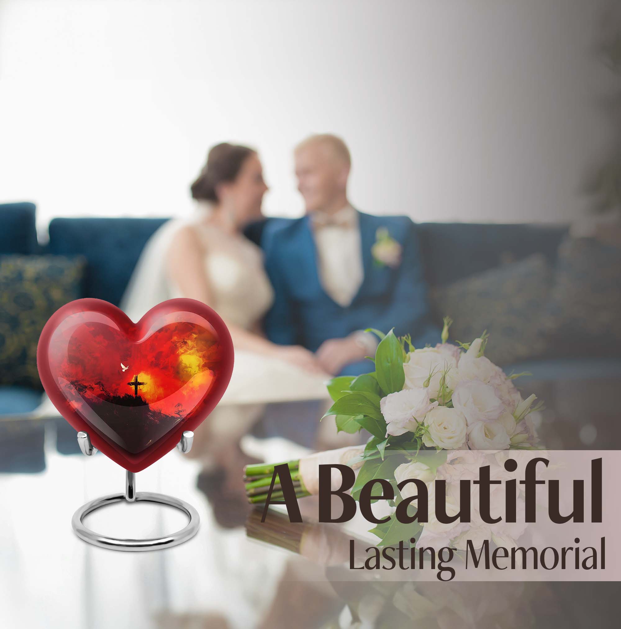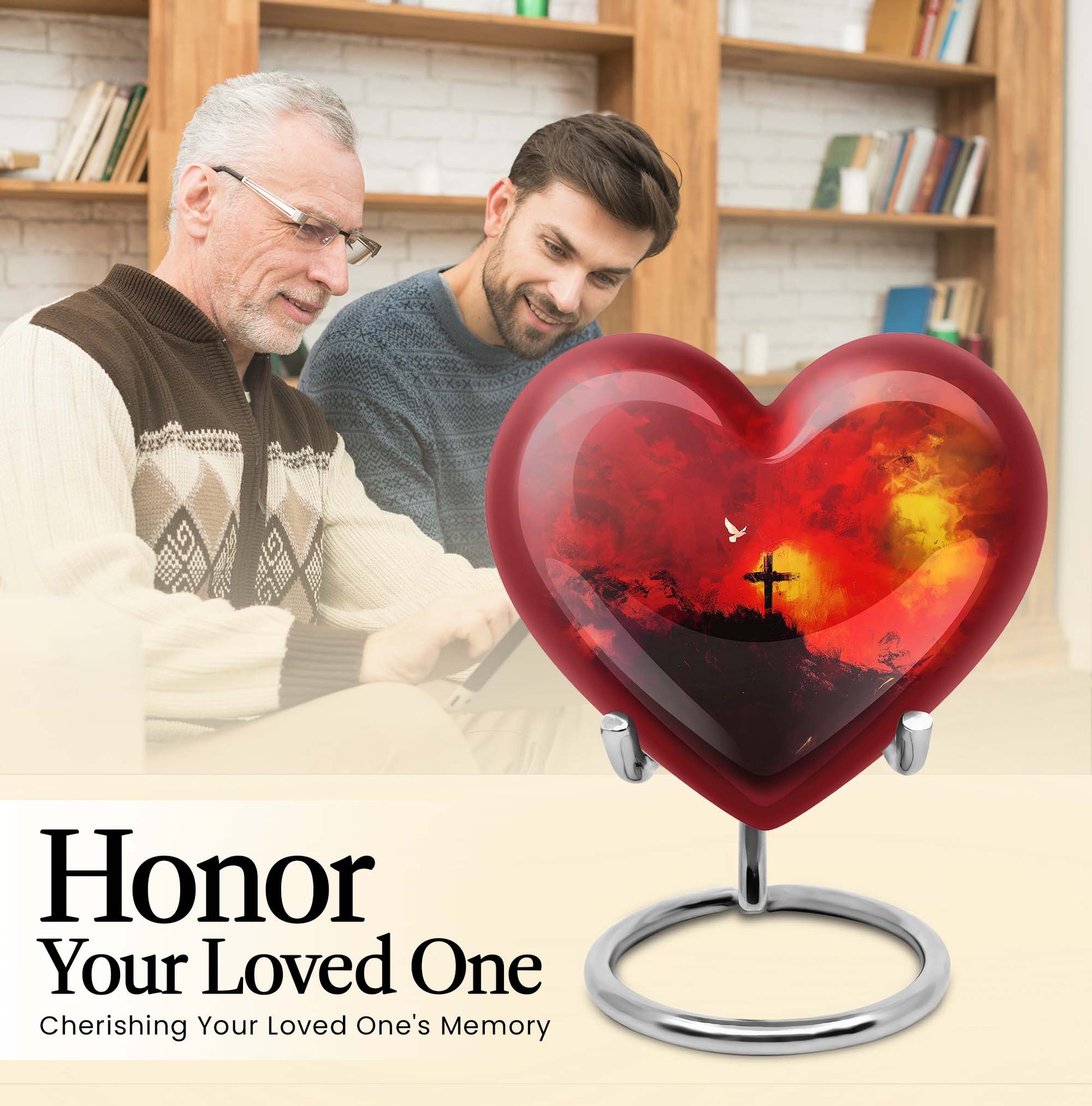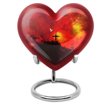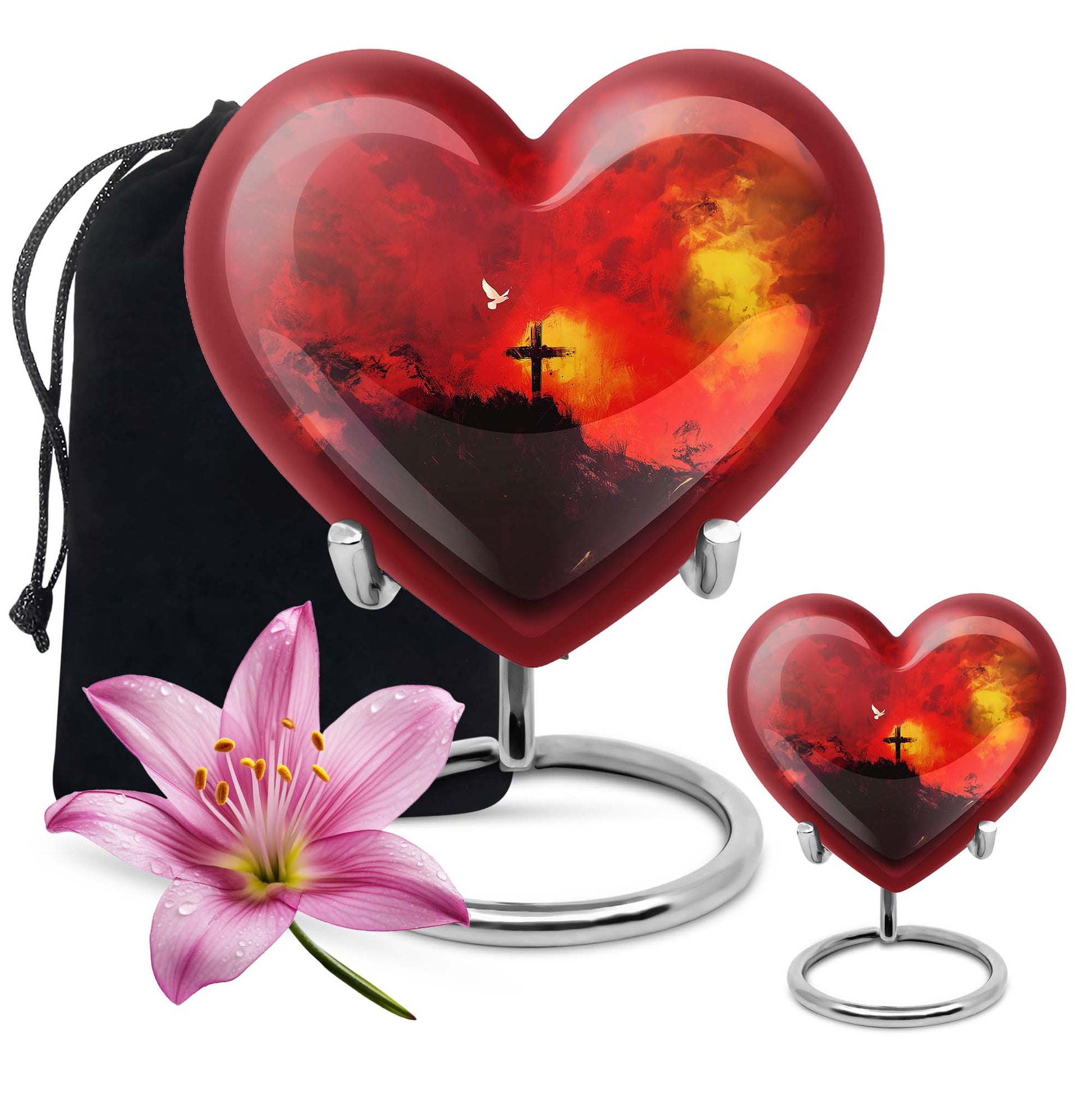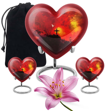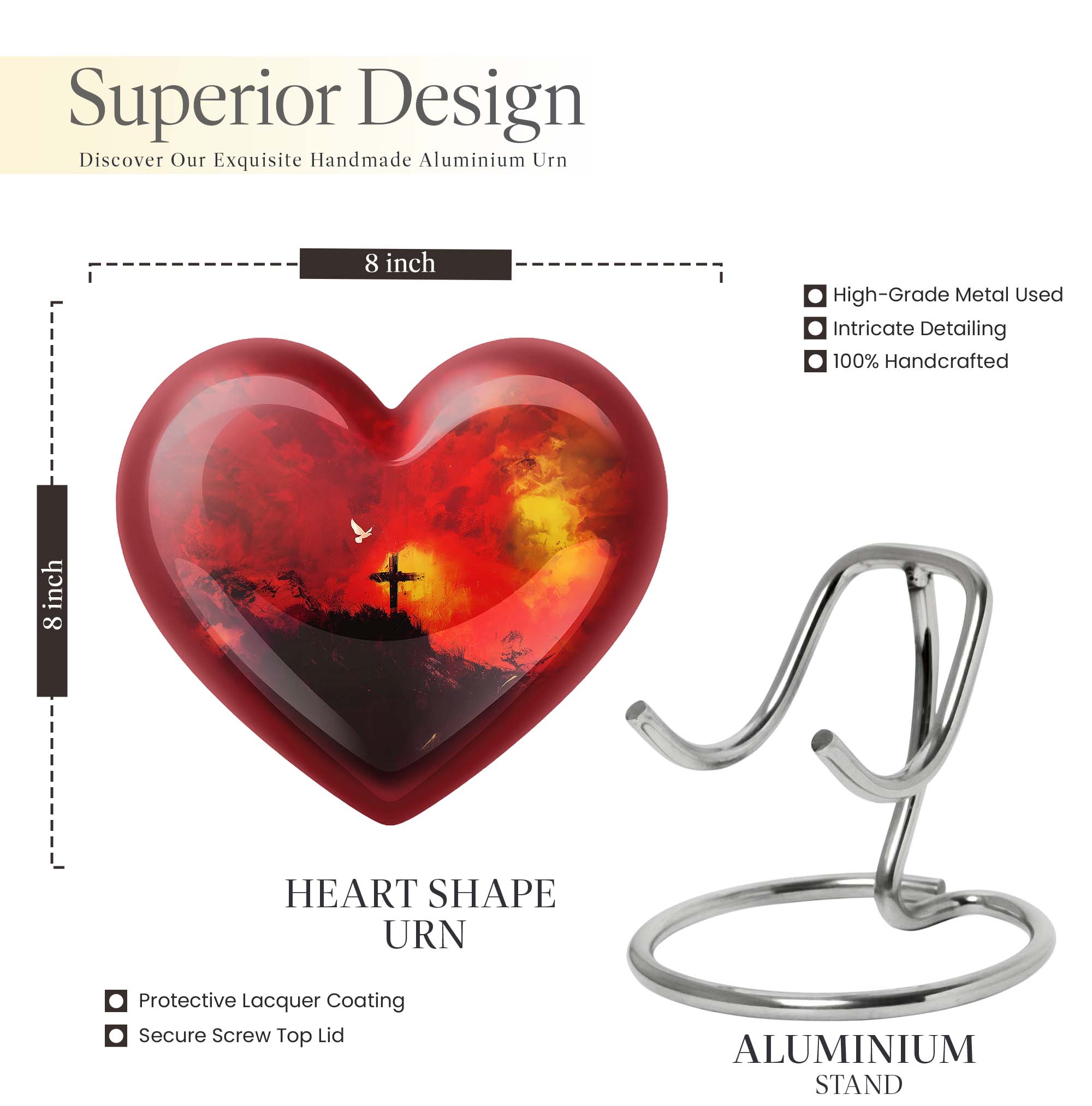 Convey your love and thoughts towards your departed loved ones with this elegant 10-inch 'Heart Urn'. Specially created for a memorable and heartfelt tribute, this cremation urn is crafted with exceptional quality aluminium, providing longevity and durability. With a weight of 3.3 pounds and dimensions of 10 inches in height, it can contain up to 200 cubic inches of ash. This large urn for human ashes beautifully captures the radiant essence of the Aurora Borealis theme, adding an ethereal touch to your memorial ceremony. The product comes with a velvet pouch for tasteful containment of the ashes. You can also personalize this cross urn by engraving names for a more tender and personal remembrance. This urn for mom, aptly termed as a 'forever urn,' sparks a beacon of solace and offers a comforting representation of life's journey that goes beyond the realm of the mortal world. Rest assured, this funeral adult urn serves as an intimate portrayal of respect and love, making it an essential item of memorial ceremony supplies.