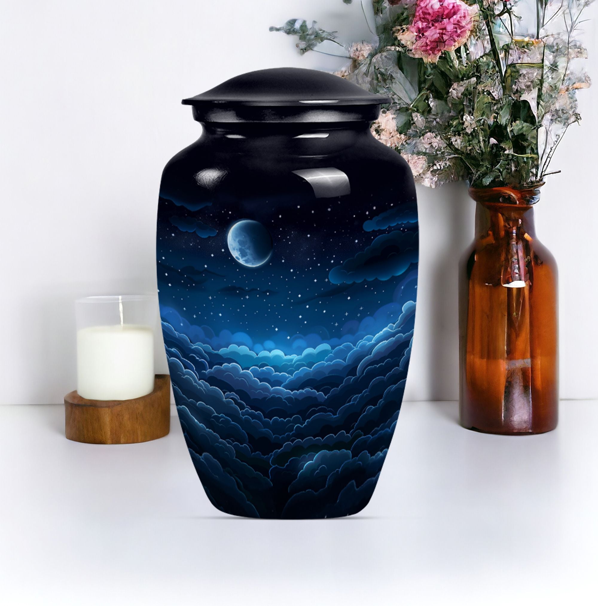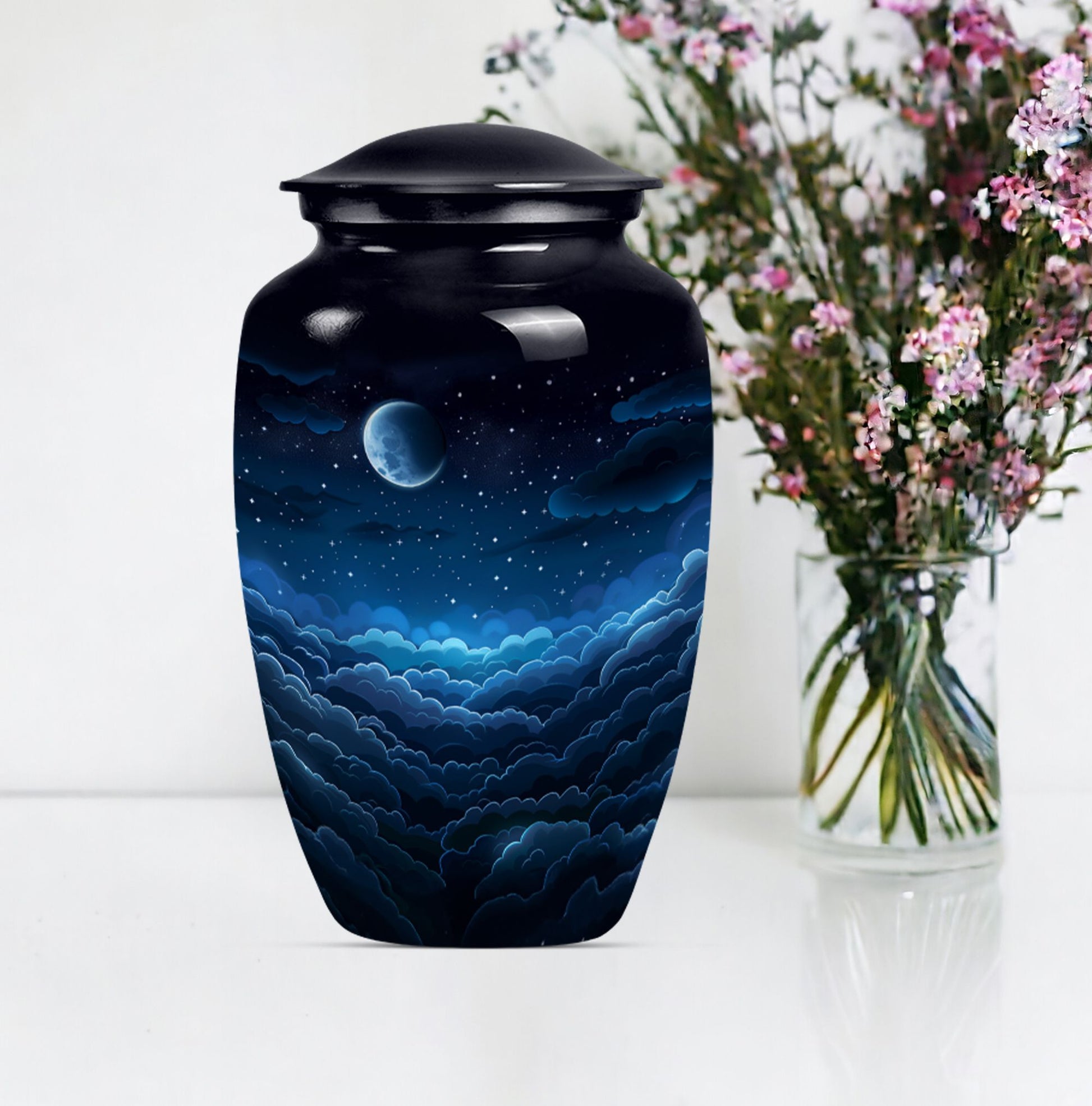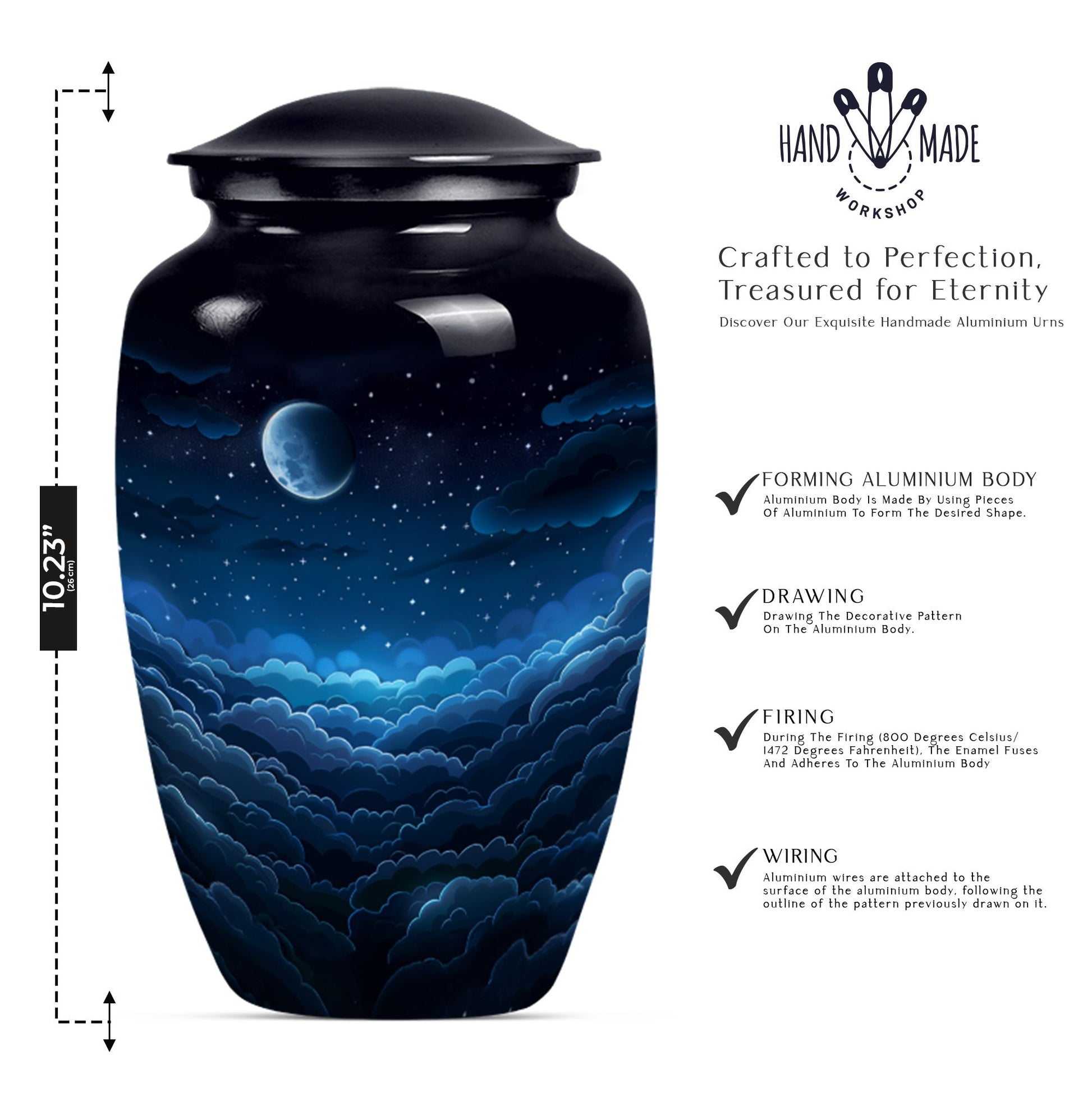 Immerse in remembering your loved ones with our captivating 10-inch Clouds Urn. Inspired by the harmony of the heavens, this 'Urns for Adult Cremation Ashes' is a respectful, significant piece for preserving your beloved's essence. Crafted from robust, everlasting aluminium, the weight of 3.3 pounds reflects the enduring demonstration of your abiding love and memory. Sized at 10 inches in height, this large urn holds a capacity of 200 cubic inches, ensuring your loved one's entirety is embraced. Additionally, the offer includes a plush velvet pouch for respectfully containing the ashes. Moreover, there is an exclusive opportunity to personalize this transferable generational heirloom with engraved names, creating an enduring family treasure. Our butterfly-themed urn creates a serene, restful cornerstone in your memorial space. Stay connected with the departed using our burial ash urns for humans - an eloquent centrepiece for cherishing those meaningful memories.