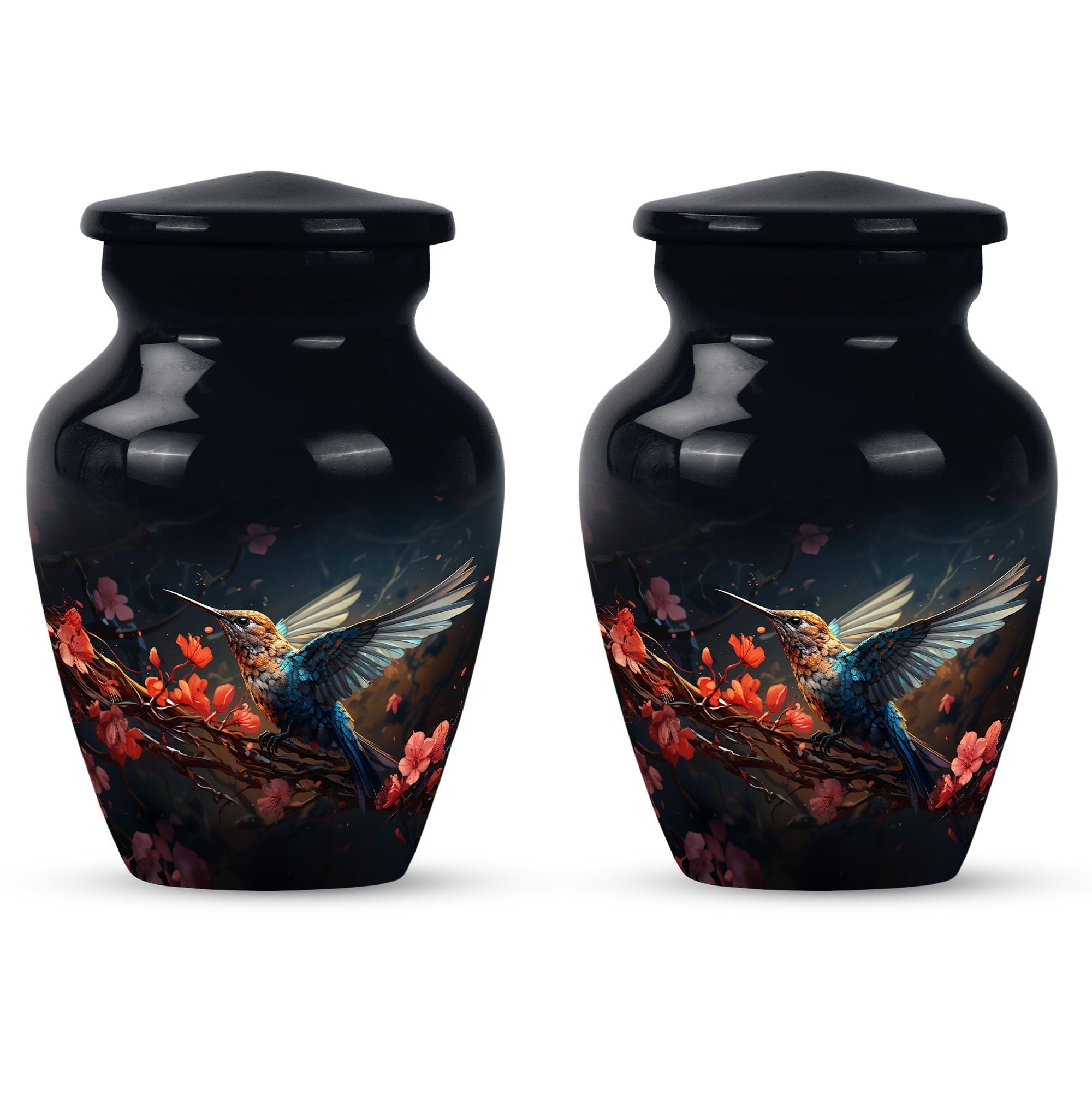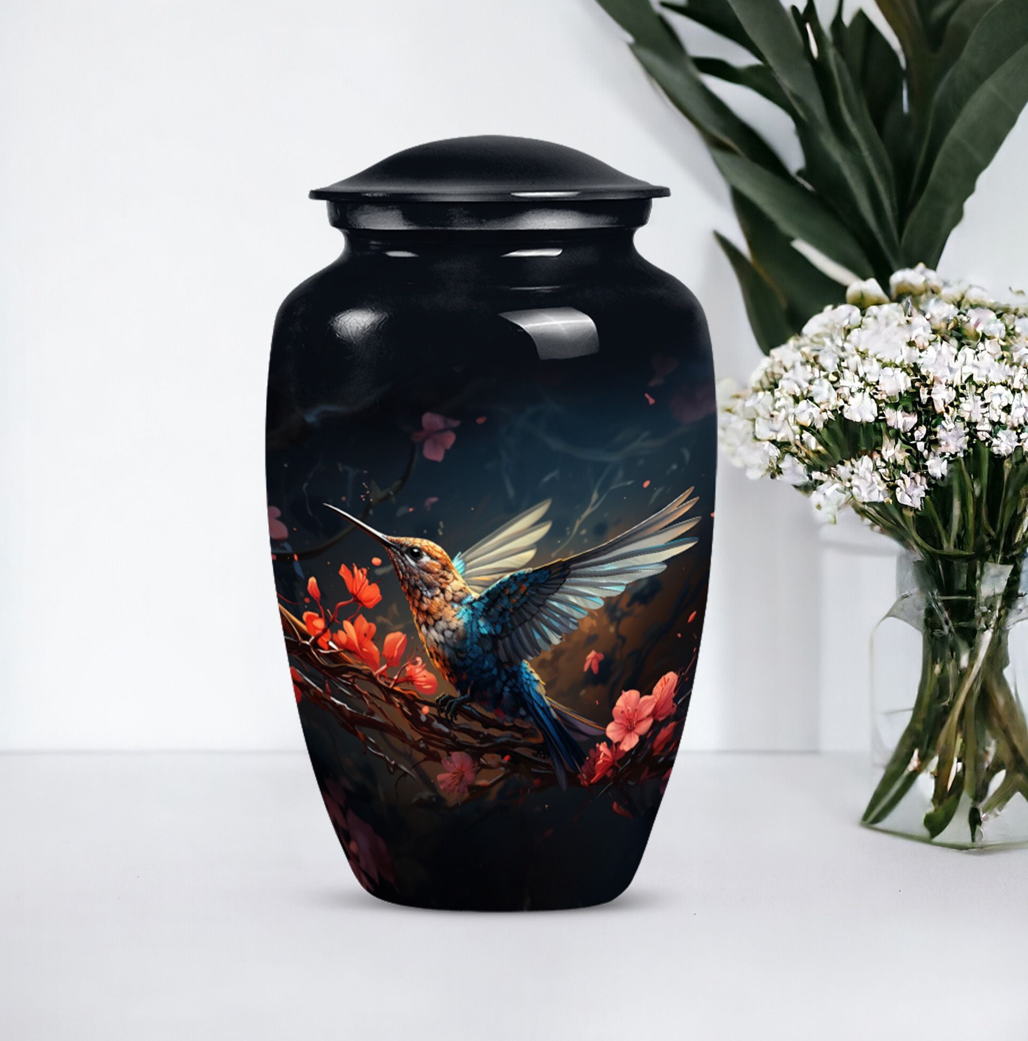 Crafted from high-quality aluminium, this 'Humming Bird Urn' offers functionality and style that combines elegance with the honor of remembrance. Suitable for both adults and seniors looking to purchase religious memorial ceremony supplies, our medium-size cremation urn measures 10 inches tall, easily containing 200 cubic inches of your loved one's cherished remains, securely encased in a tastefully provided velvet pouch. With an abstract theme, this large urn weighs in at a solid 3.3 pounds and offers a unique way to honour your loved one - our Personalized Engraved Names feature. This classic and timeless 'Large Urn' is not only a fitting testament to a life lived but will serve as a cherished memento for the loved ones left behind. Keywords this product associates with include: 'memorial urns', 'burial cremation urns', 'human cremation', 'shaped to go containers', and 'funeral urns for human ashes adult'.