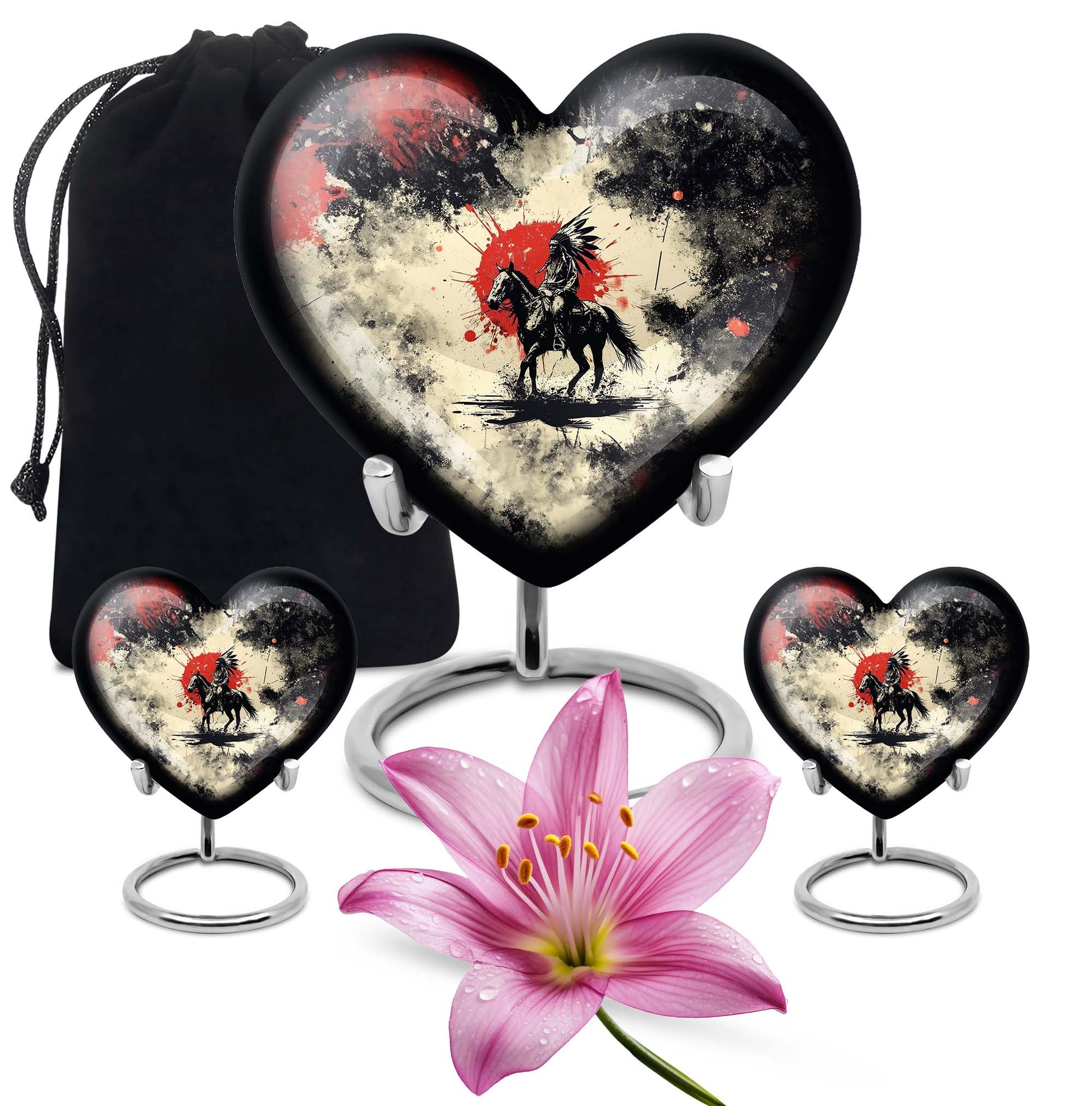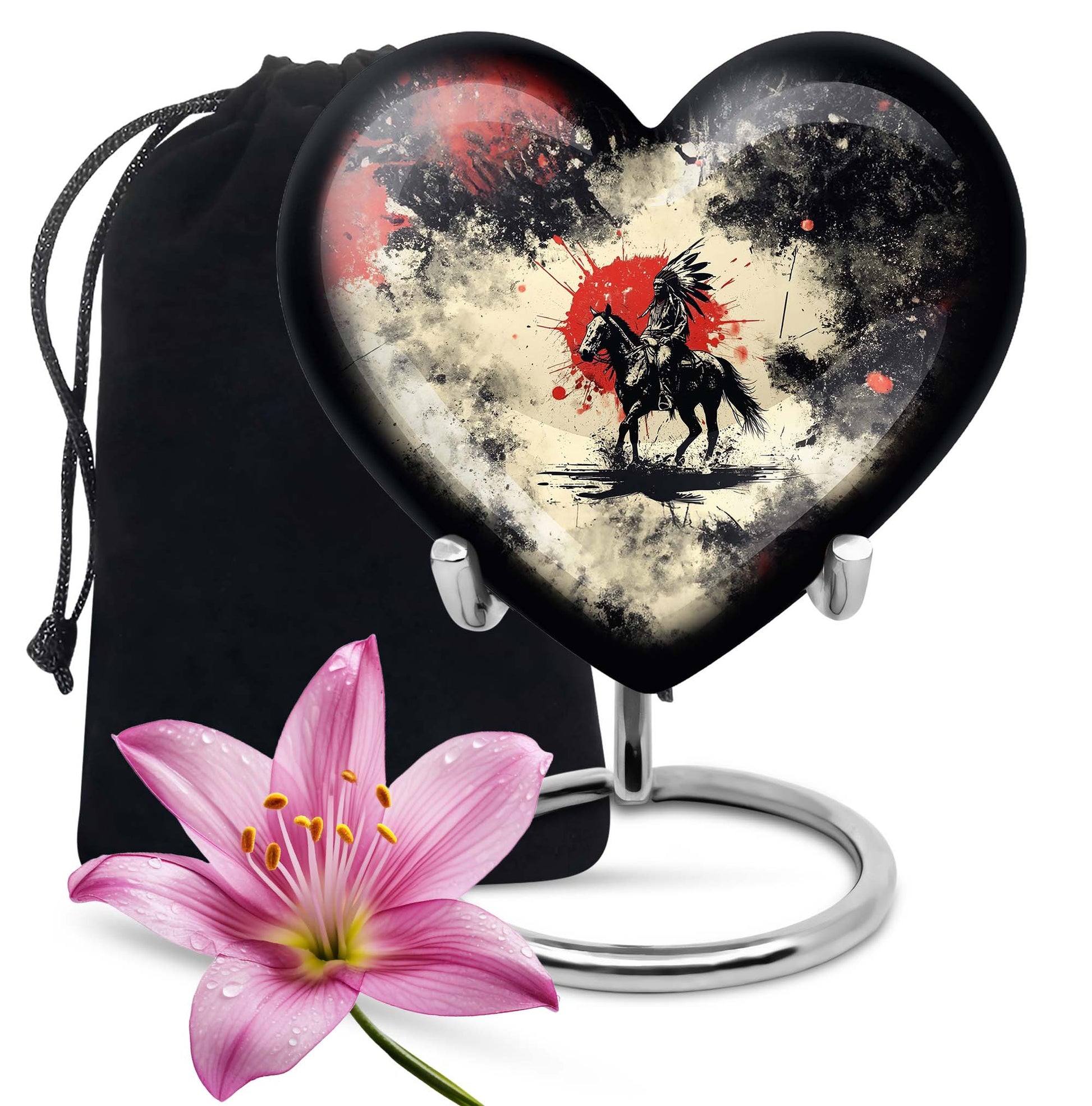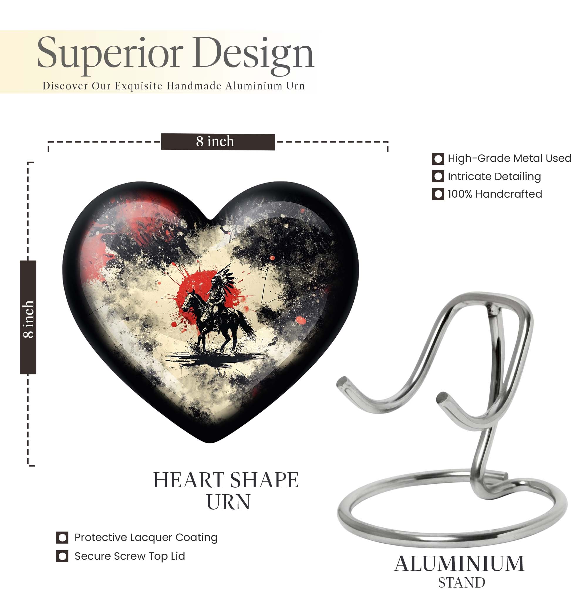 This Native American urn, while equally befitting as an adult male cremation urn, carries an abstract yet unmistakable theme of enduring love. Its large size and ethereal Heart Urn design express deep feelings of love and respect for your departed loved one. Standing tall at 10 inches in height, this aluminum crafted memorial urn serves as a sentimental, long-lasting tribute to honor human ashes. Weighing 3.3 pounds, the urn is voluminous, having a storage capacity of 200 cubic inches. Personalize this burial vessel to stand as a unique testament of your cherished memories, allowing you to engrave names meaningfully. Complementing the package is a velvet pouch that serves as a snug condition for safe-keeping the cherished remains. Taken as a whole, this funeral or cremation urn for adult ashes, women or men, redefines our perception of memorial urns, introducing a sensitive touch to a time of sorrow.