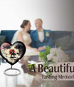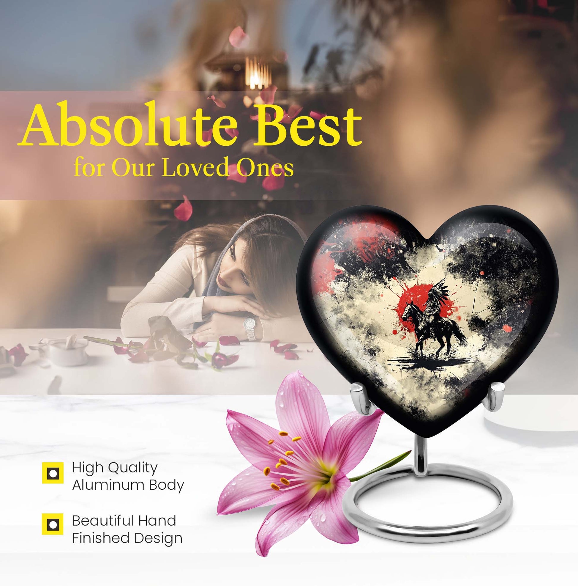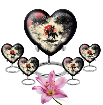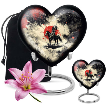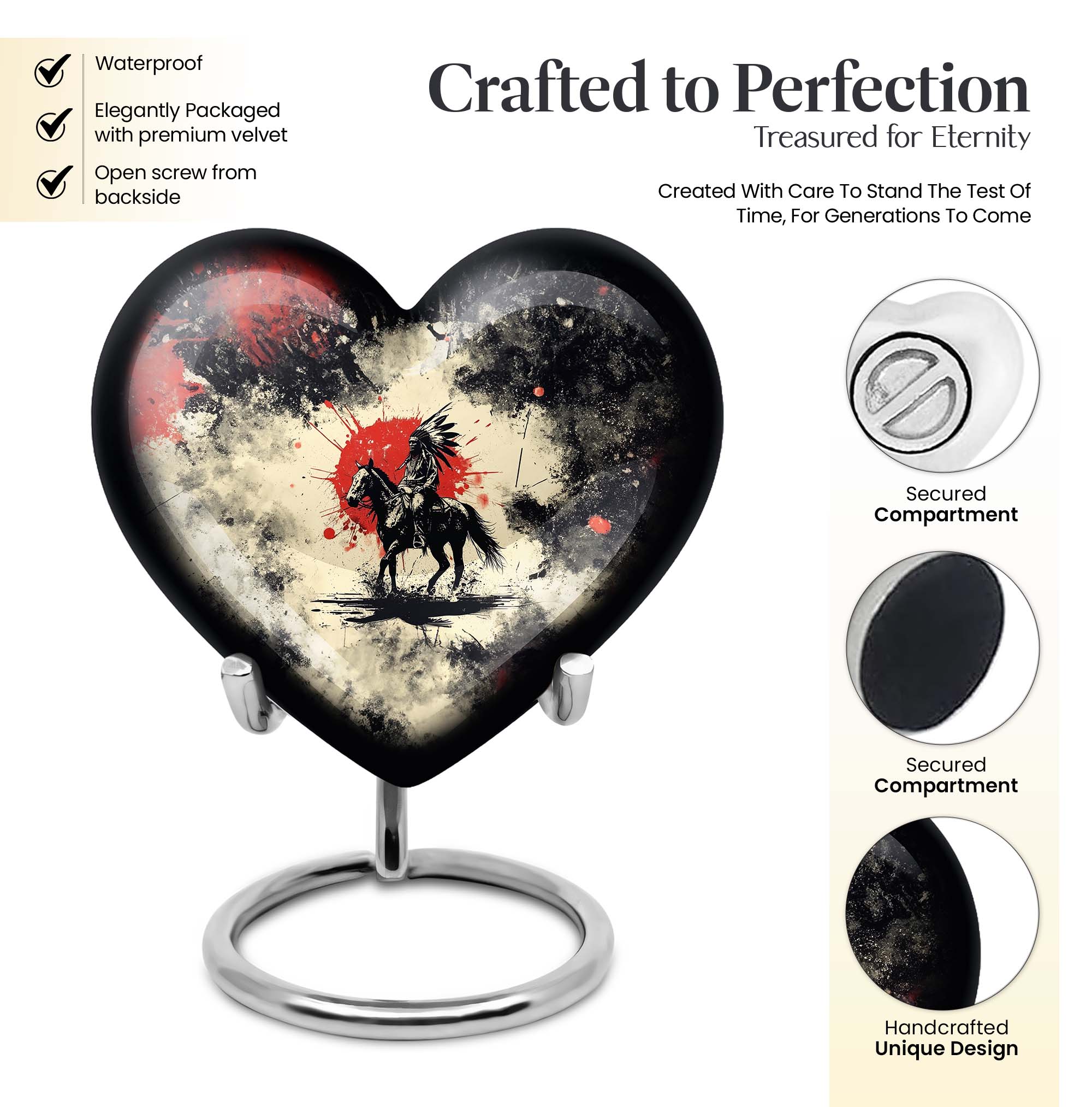 This Native American urn, while equally befitting as an adult male cremation urn, carries an abstract yet unmistakable theme of enduring love. Its large size and ethereal Heart Urn design express deep feelings of love and respect for your departed loved one. Standing tall at 10 inches in height, this aluminum crafted memorial urn serves as a sentimental, long-lasting tribute to honor human ashes. Weighing 3.3 pounds, the urn is voluminous, having a storage capacity of 200 cubic inches. Personalize this burial vessel to stand as a unique testament of your cherished memories, allowing you to engrave names meaningfully. Complementing the package is a velvet pouch that serves as a snug condition for safe-keeping the cherished remains. Taken as a whole, this funeral or cremation urn for adult ashes, women or men, redefines our perception of memorial urns, introducing a sensitive touch to a time of sorrow.