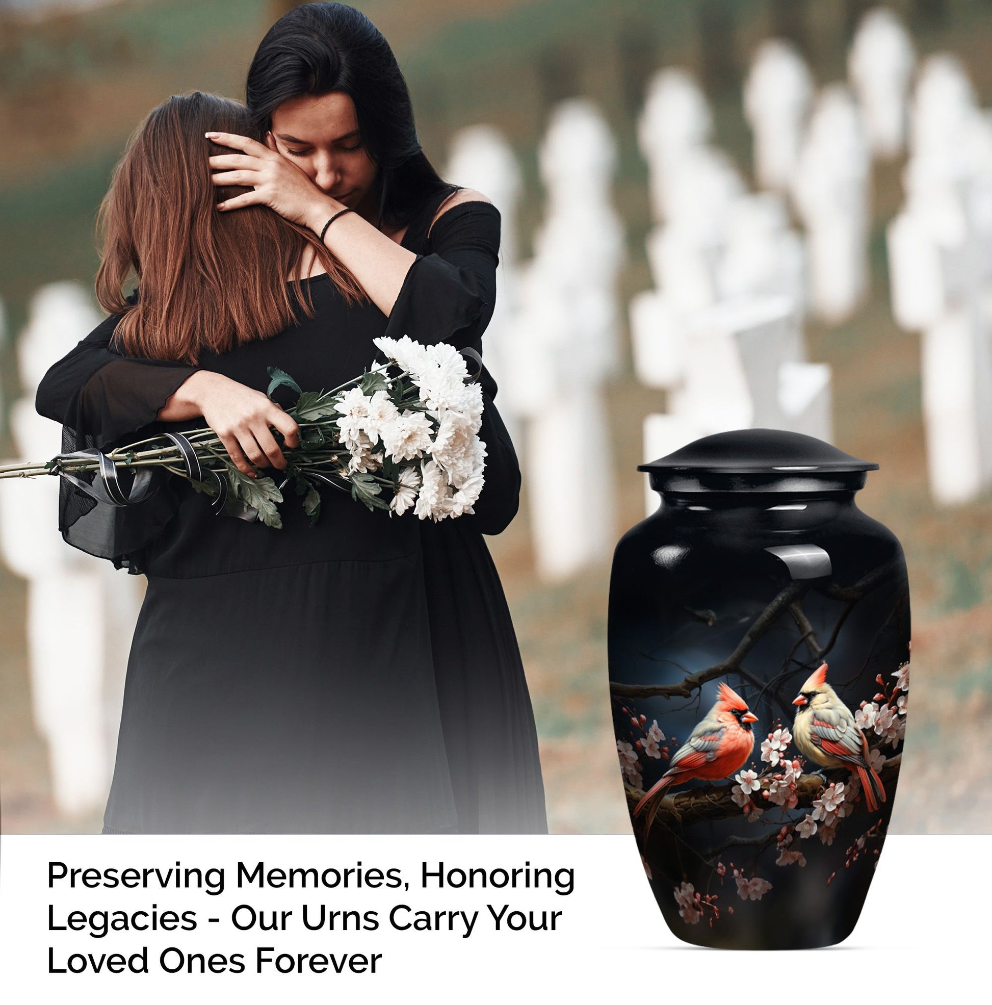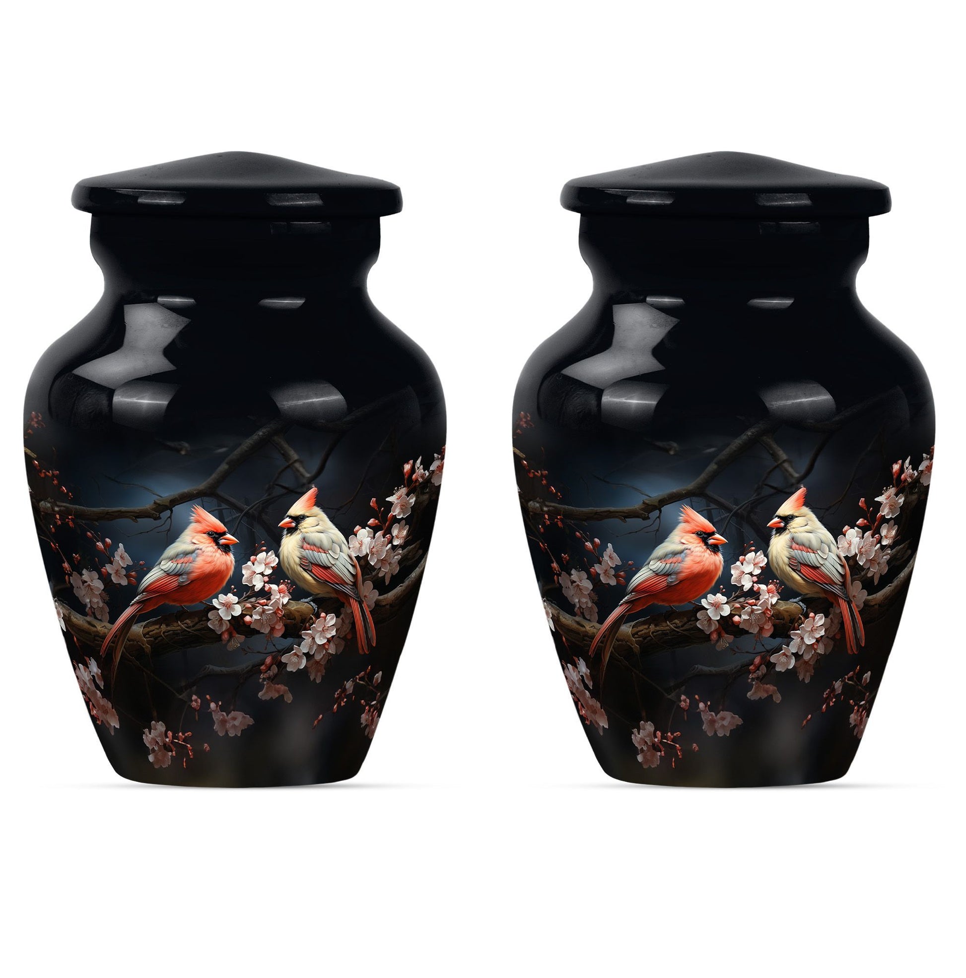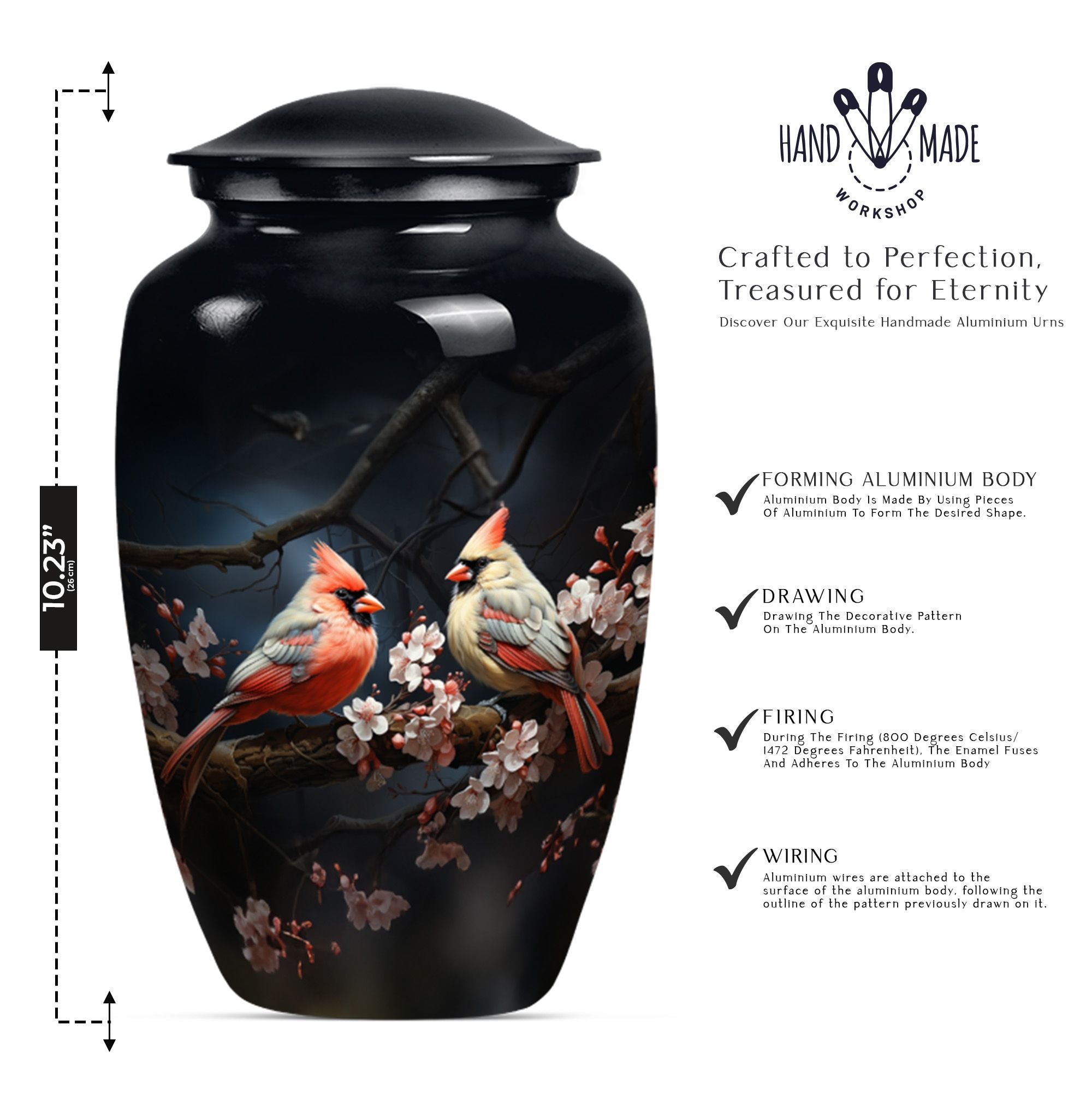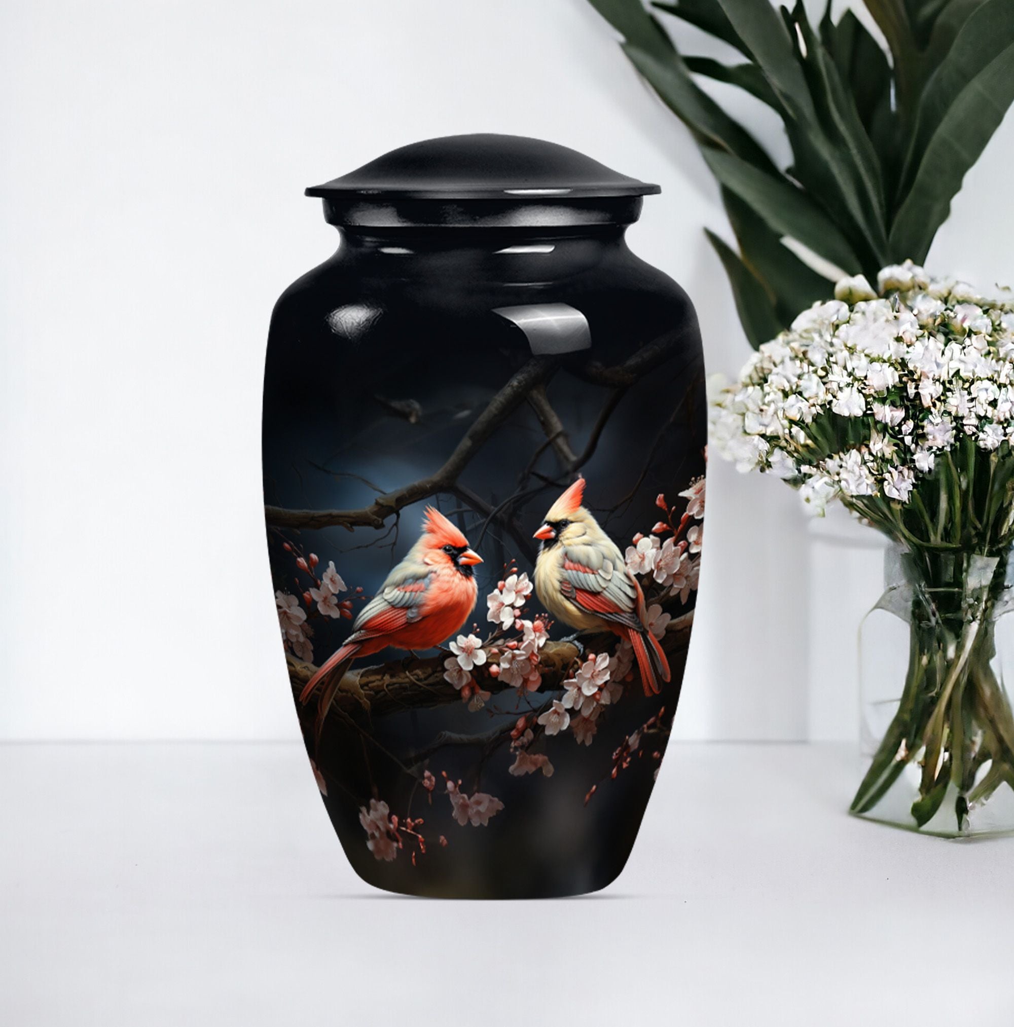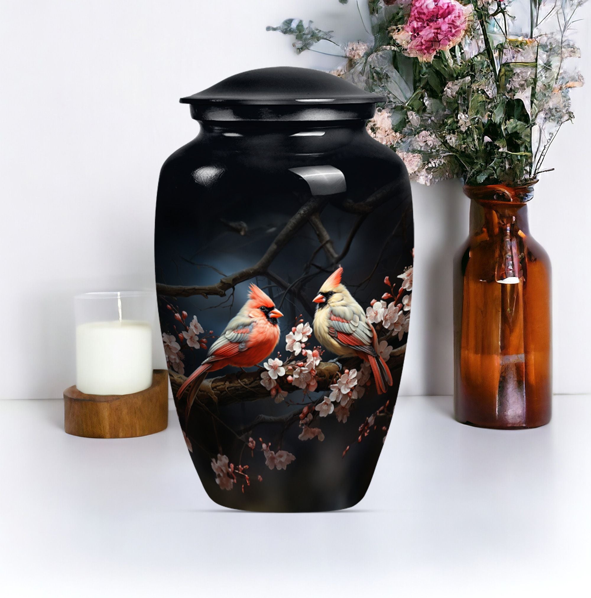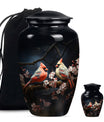 Discover the Cardinal bird urn, a timeless and tasteful memorabilia for your loved ones in the form of funeral urns, specifically designed for an adult male dad. This urn, standing 10 inches tall, is an exemplary specimen in the large urns category that can contain approximately 200 cubic inches of matter. Crafted meticulously with superior quality aluminium, it weighs a substantial but not overbearing 3.3 pounds. Adding to its exclusivity, each urn can be personalized with engraved names, making it even more special and close to your heart. Along with the urn, a gentle velvet pouch is provided for containing ashes, safeguarding them with dignity and respect. The theme captures the emotional essence of a wolf howling, symbolizing strength, freedom, and the existence of strong familial connections. As one of the sophisticated memorial urns, it is also suitable as cremation urns for mom or any adult woman. This urn balances ceremonial respect with elegant design, serving as a fitting tribute to the memories of your loved ones.