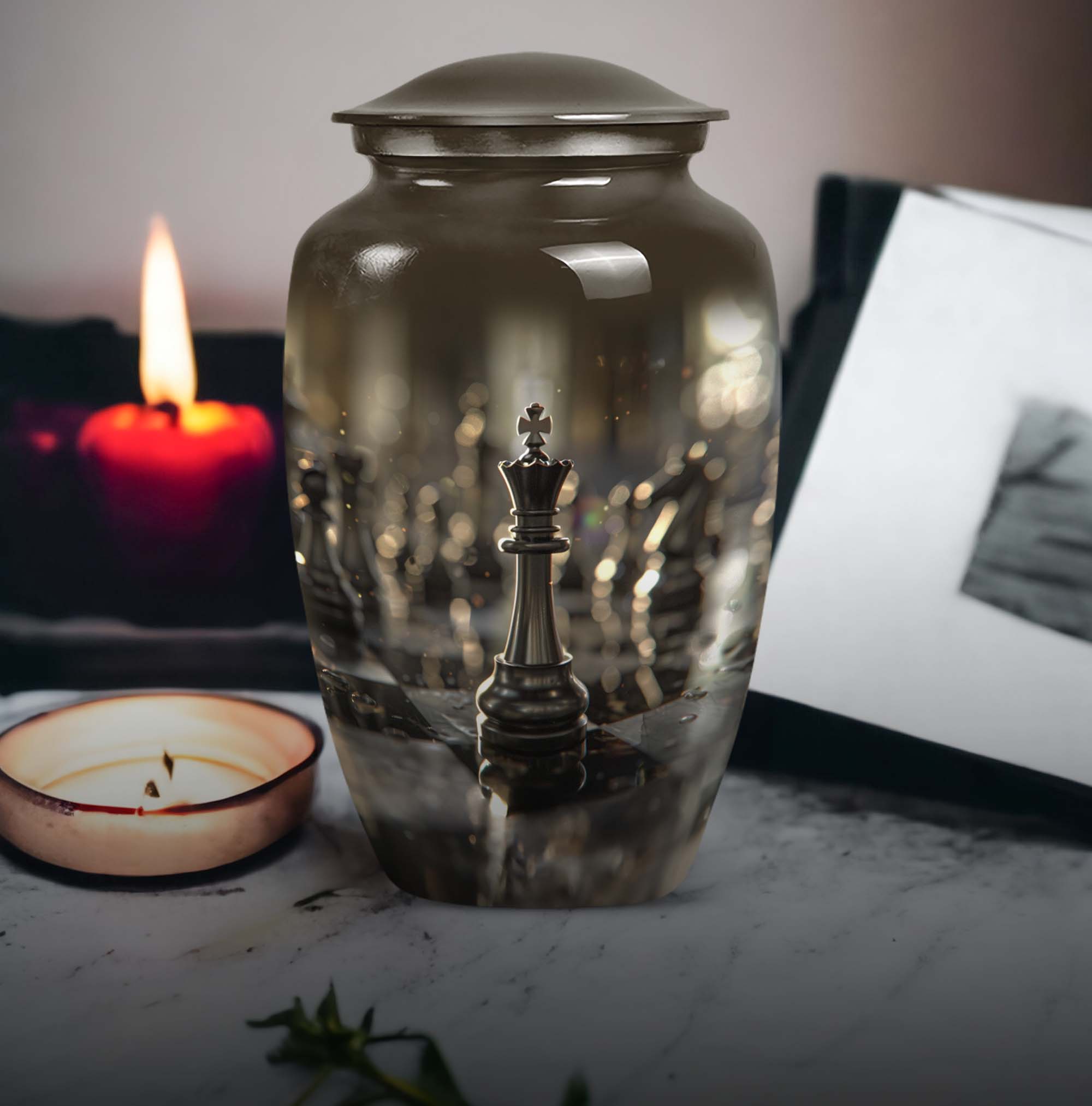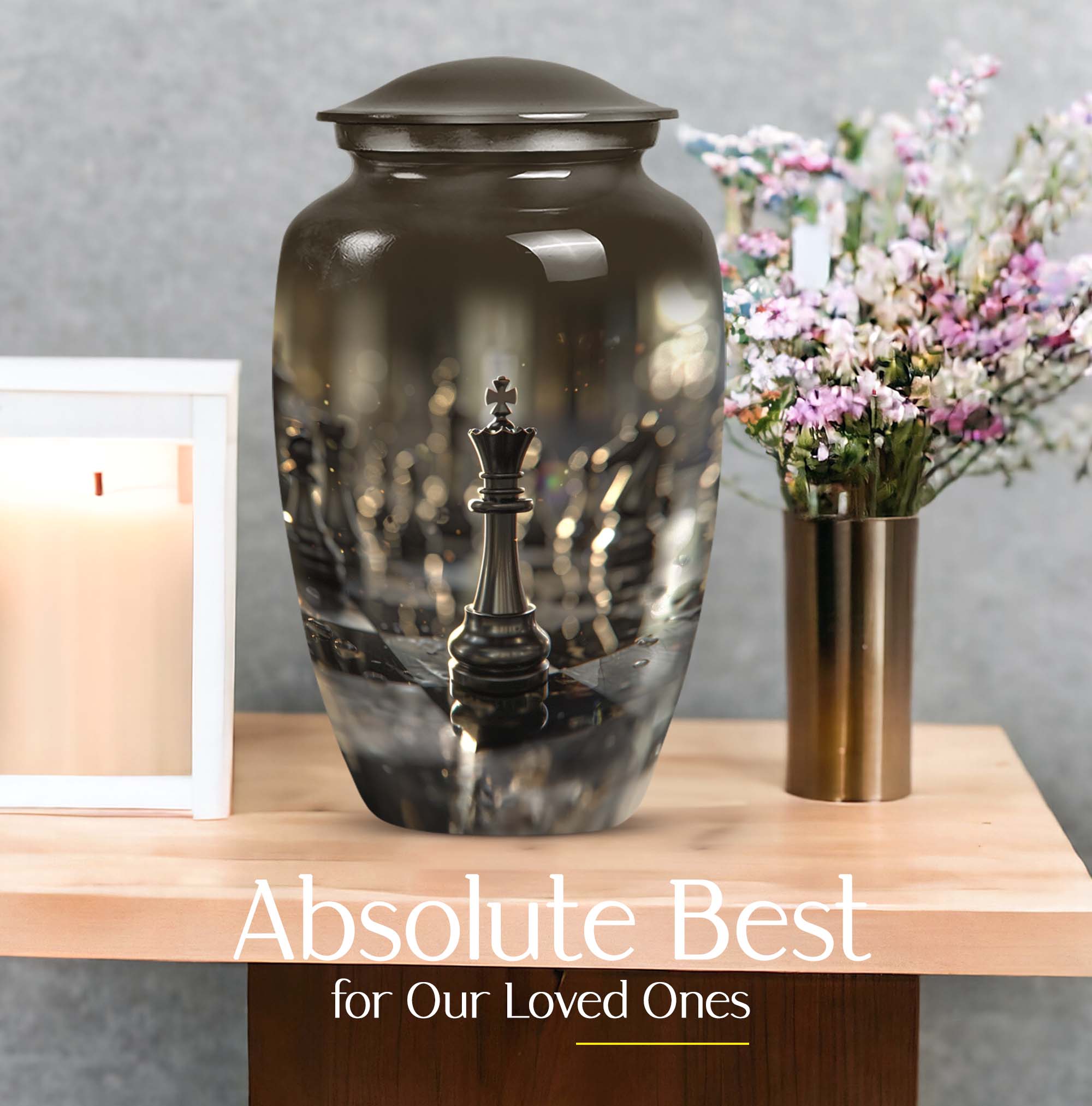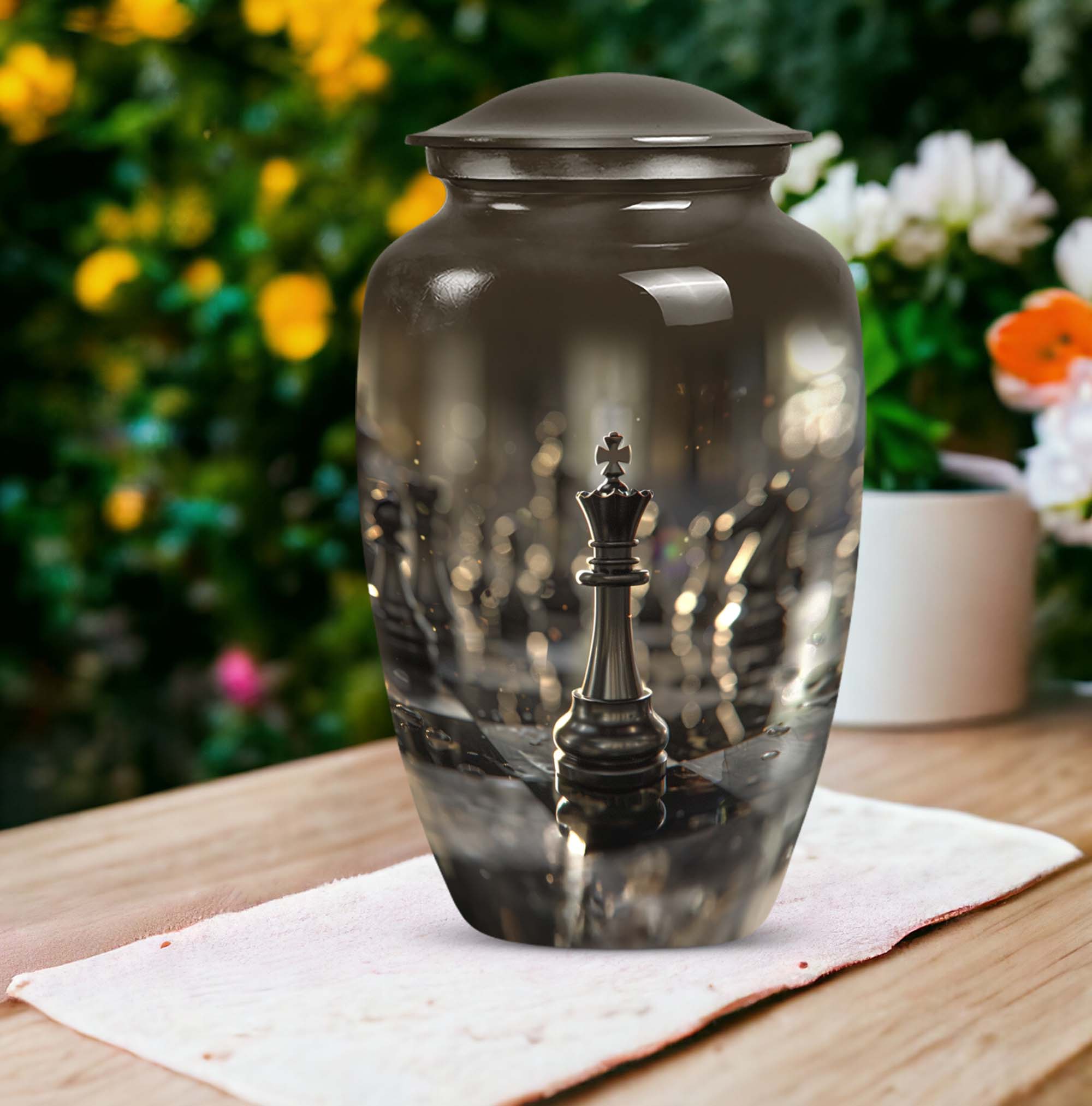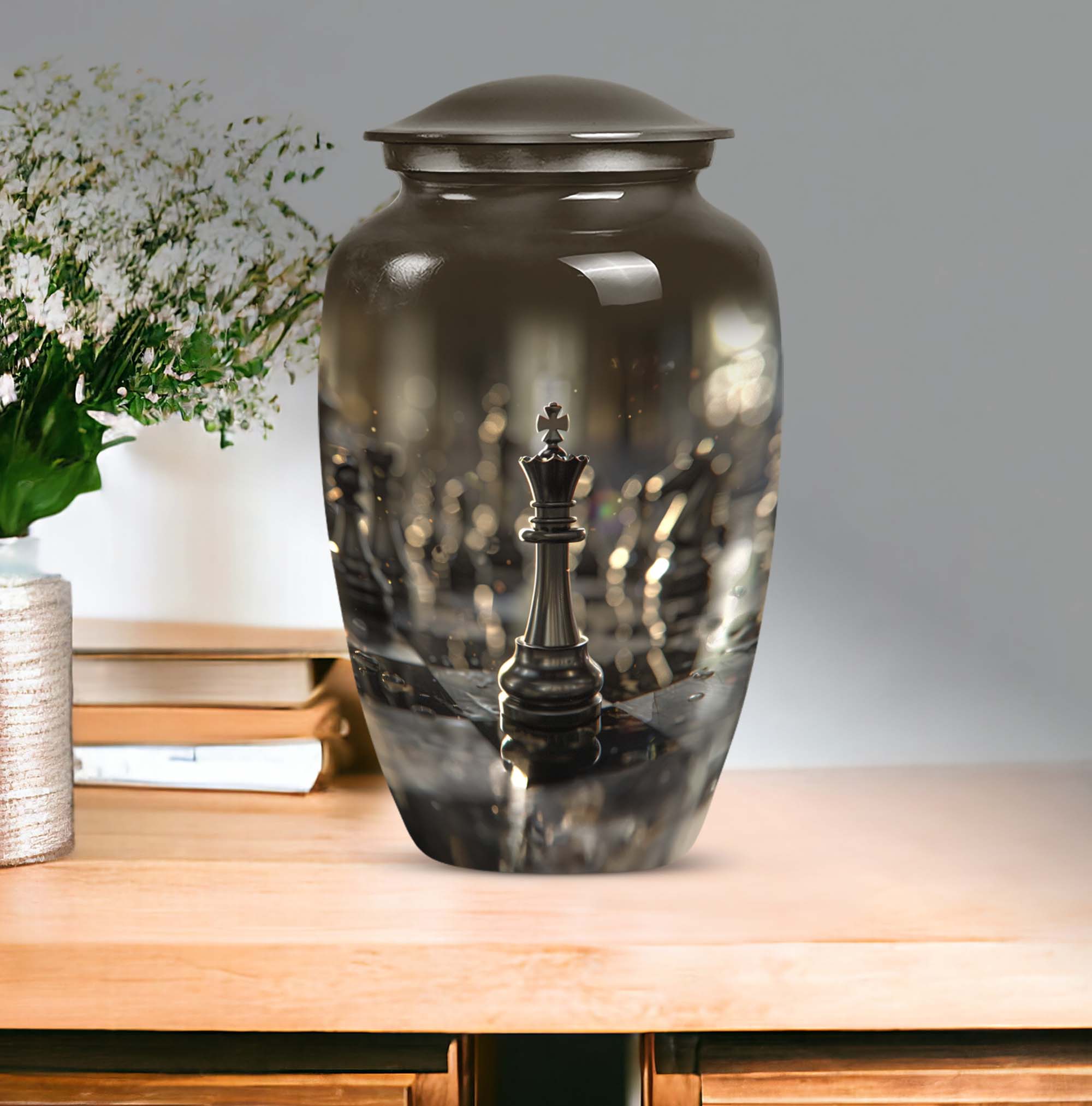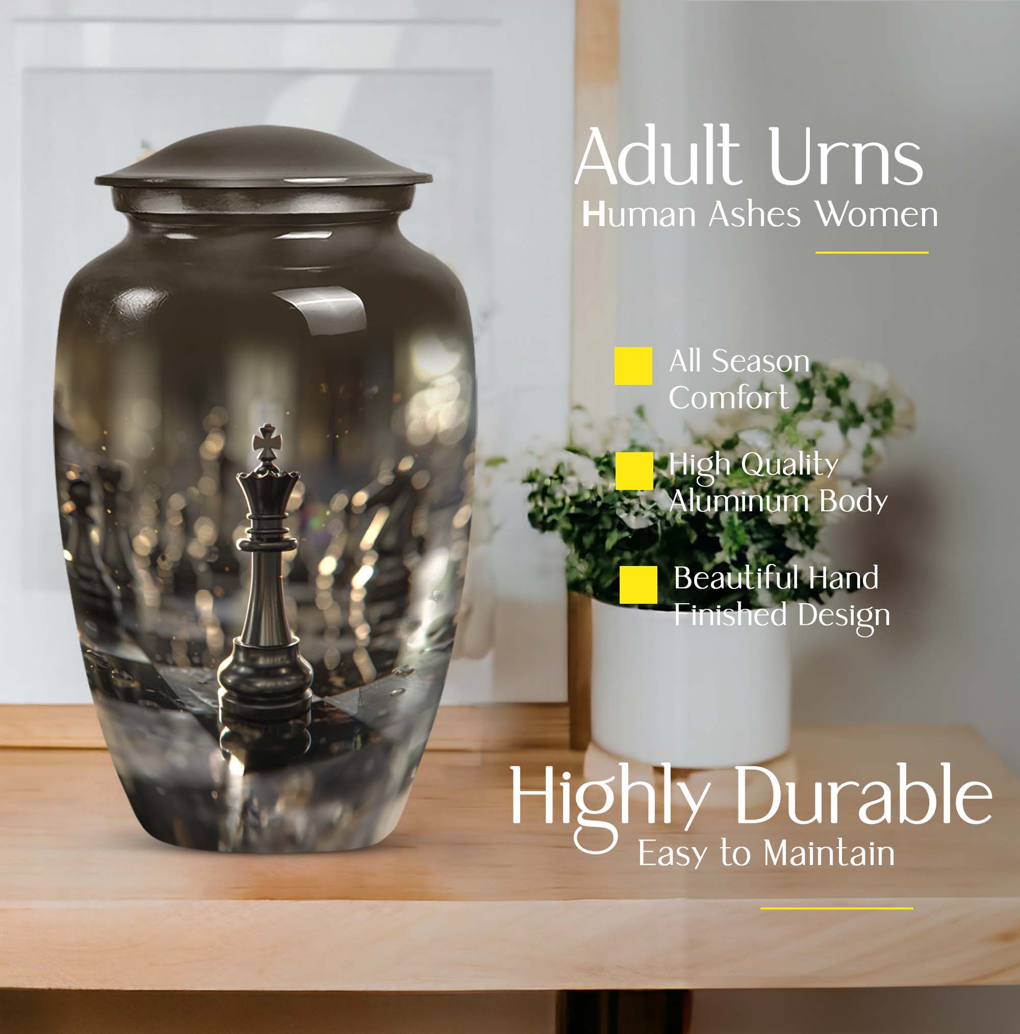 Celebrate the loss of your beloved with this authentic 10 inch Chess Urn, a distinctive memorial urn specifically fashioned for women's ashes. This large urn, carefully crafted from superior aluminium material, makes for a long-lasting remembrance. It encapsulates up to 200 cubic inches of ash, indicating it's suitable for individuals weighing up to 200 pounds prior to cremation. The memorial urns weigh 3.3 pounds and measure 10 inches in height, making them a fitting tribute symbol that can be placed in any favorite spot. This product comes complete with a velvet pouch, ensuring the containment of the ashes is done with the utmost respect. Customize your urn by engraving names as a special touch to this significant memorial. Moreover, it's perfect for ground burial and makes a classic yet abstract statement. Our urns take the term 'memorial urns' to a whole new level, proving that even in memorialization, style and dignity can be upheld.