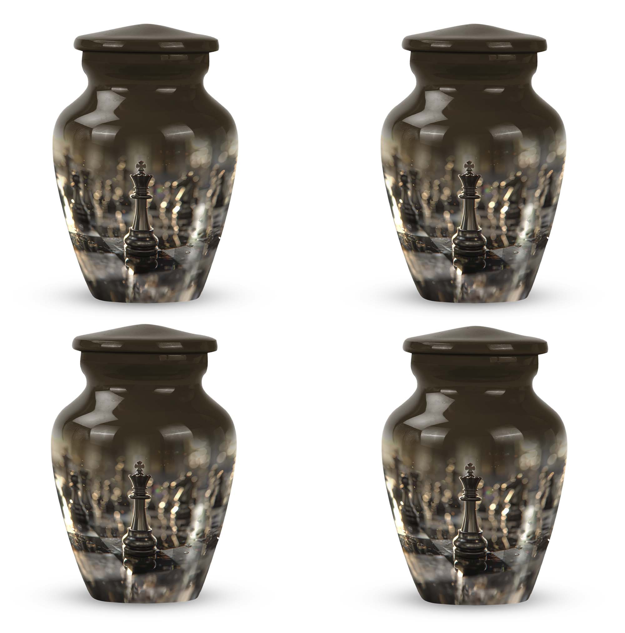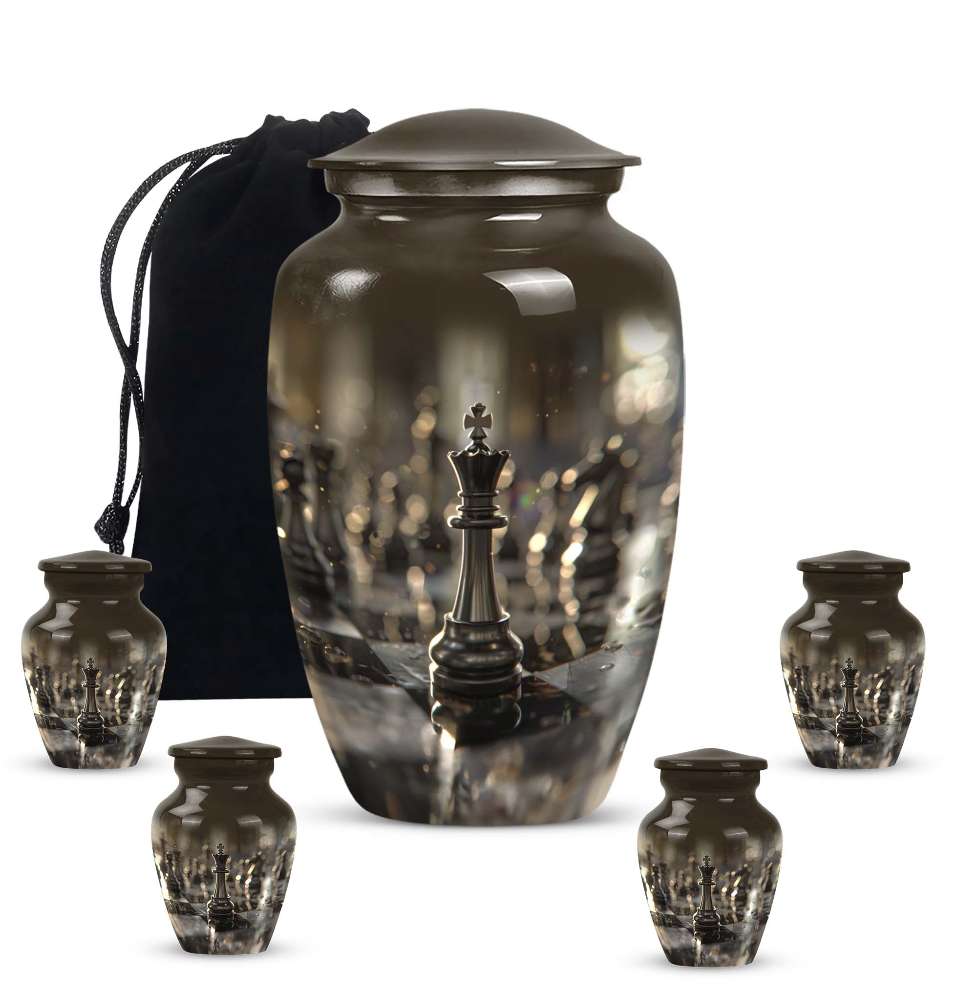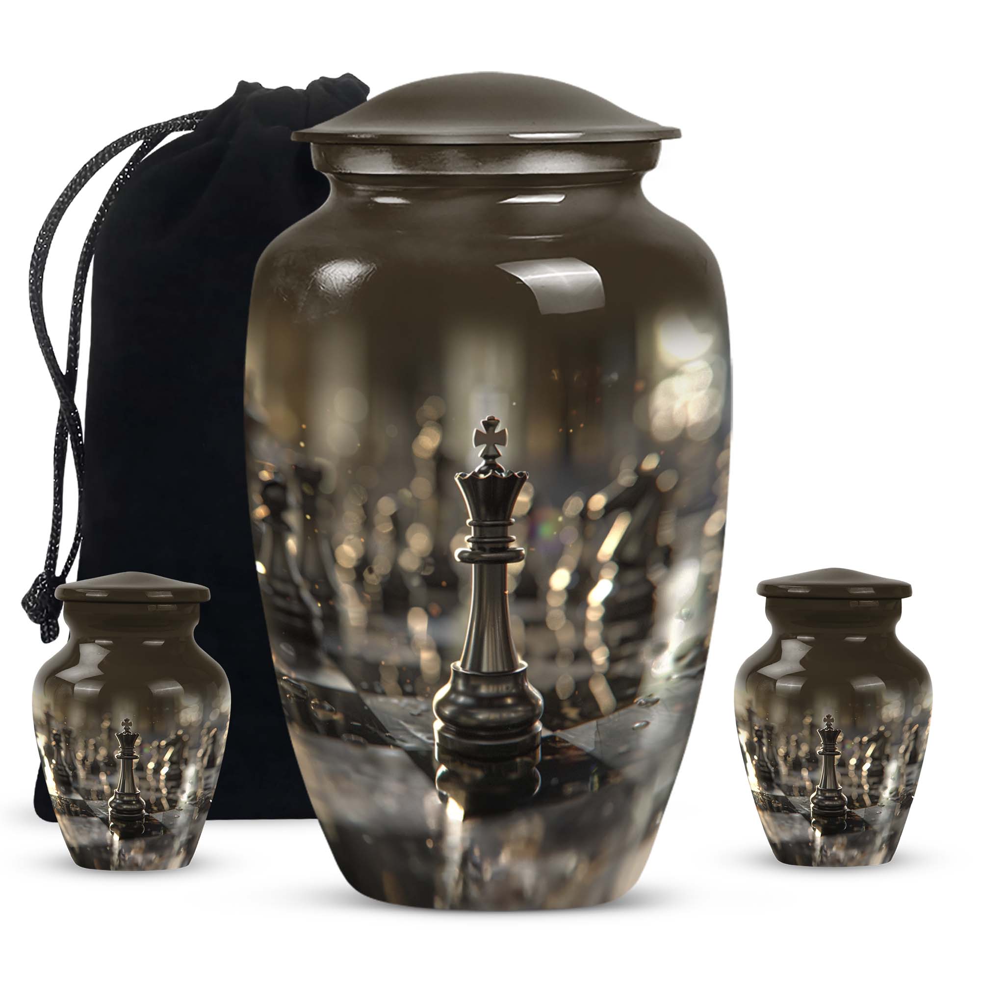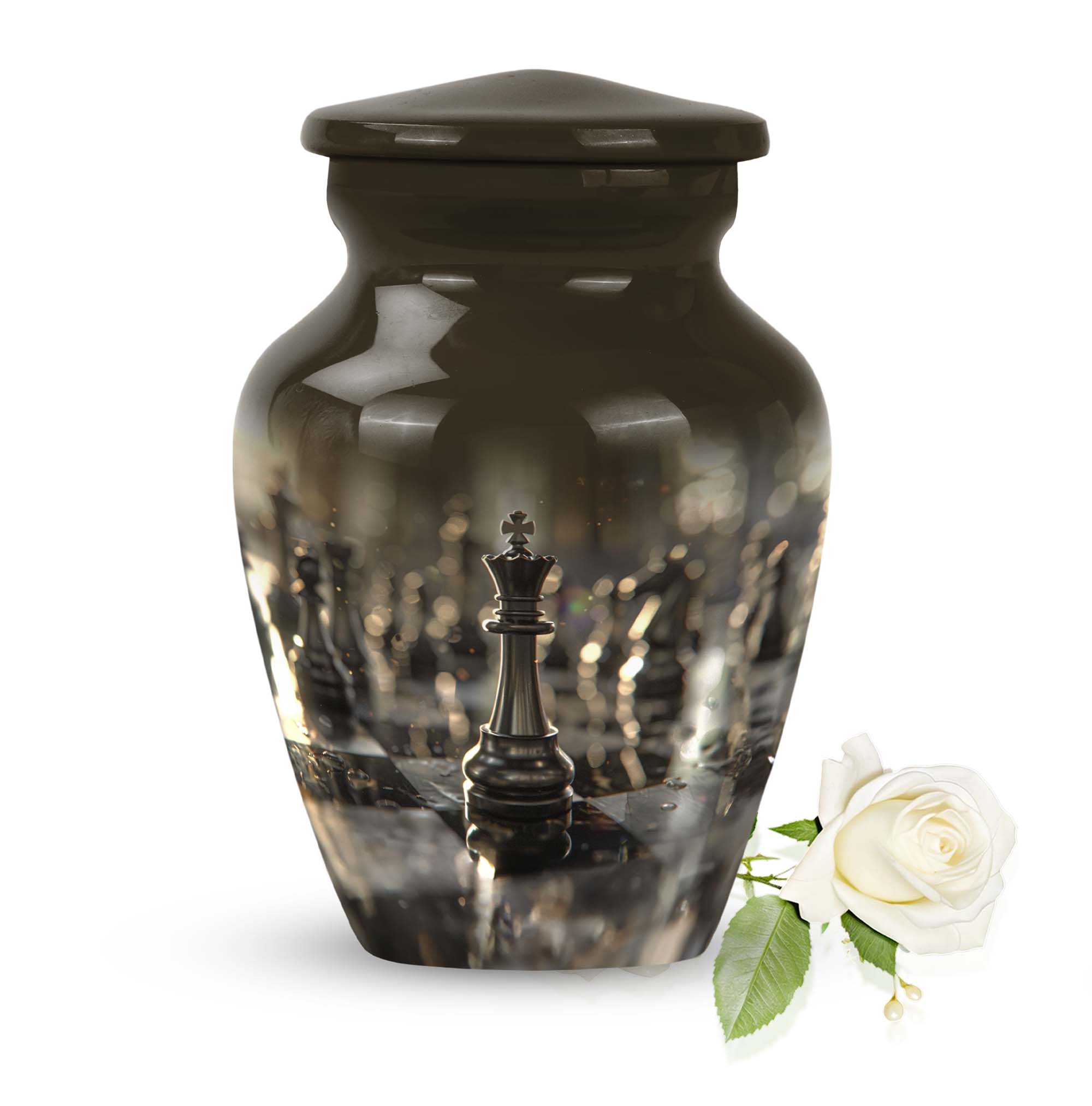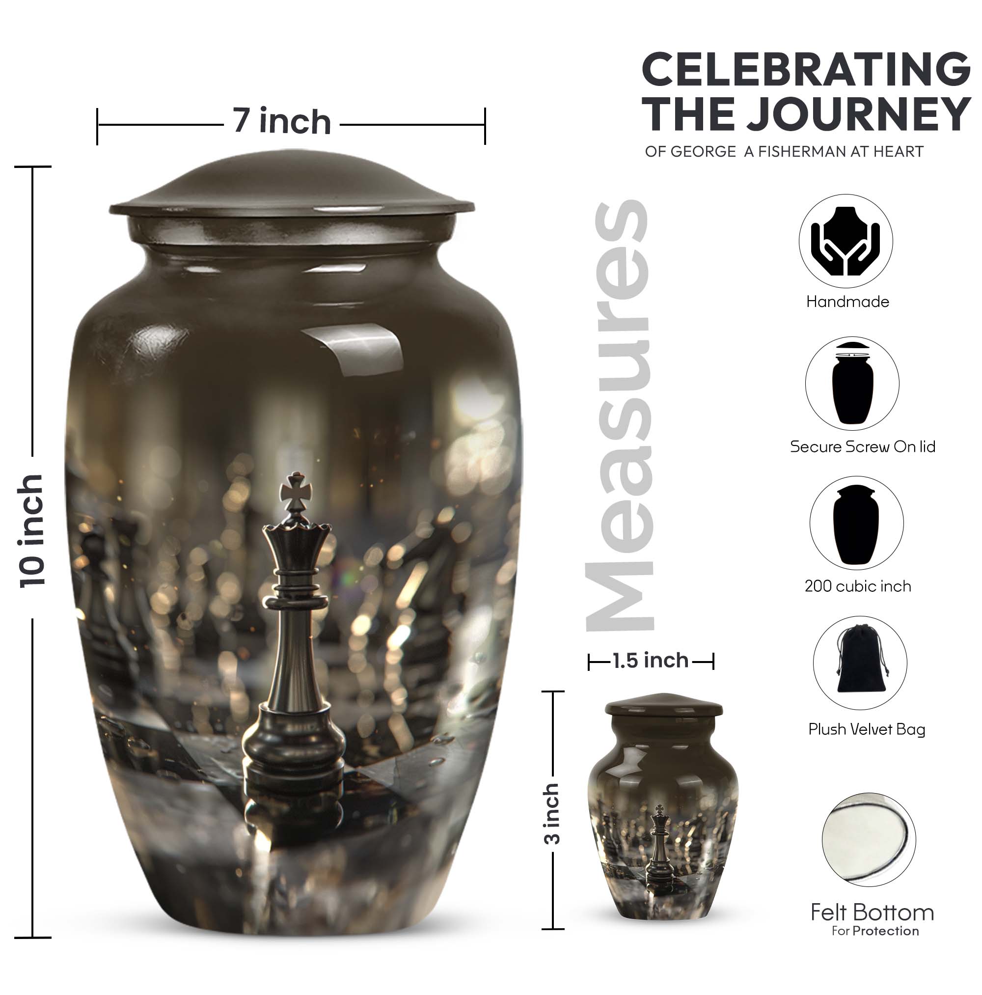 Celebrate the loss of your beloved with this authentic 10 inch Chess Urn, a distinctive memorial urn specifically fashioned for women's ashes. This large urn, carefully crafted from superior aluminium material, makes for a long-lasting remembrance. It encapsulates up to 200 cubic inches of ash, indicating it's suitable for individuals weighing up to 200 pounds prior to cremation. The memorial urns weigh 3.3 pounds and measure 10 inches in height, making them a fitting tribute symbol that can be placed in any favorite spot. This product comes complete with a velvet pouch, ensuring the containment of the ashes is done with the utmost respect. Customize your urn by engraving names as a special touch to this significant memorial. Moreover, it's perfect for ground burial and makes a classic yet abstract statement. Our urns take the term 'memorial urns' to a whole new level, proving that even in memorialization, style and dignity can be upheld.