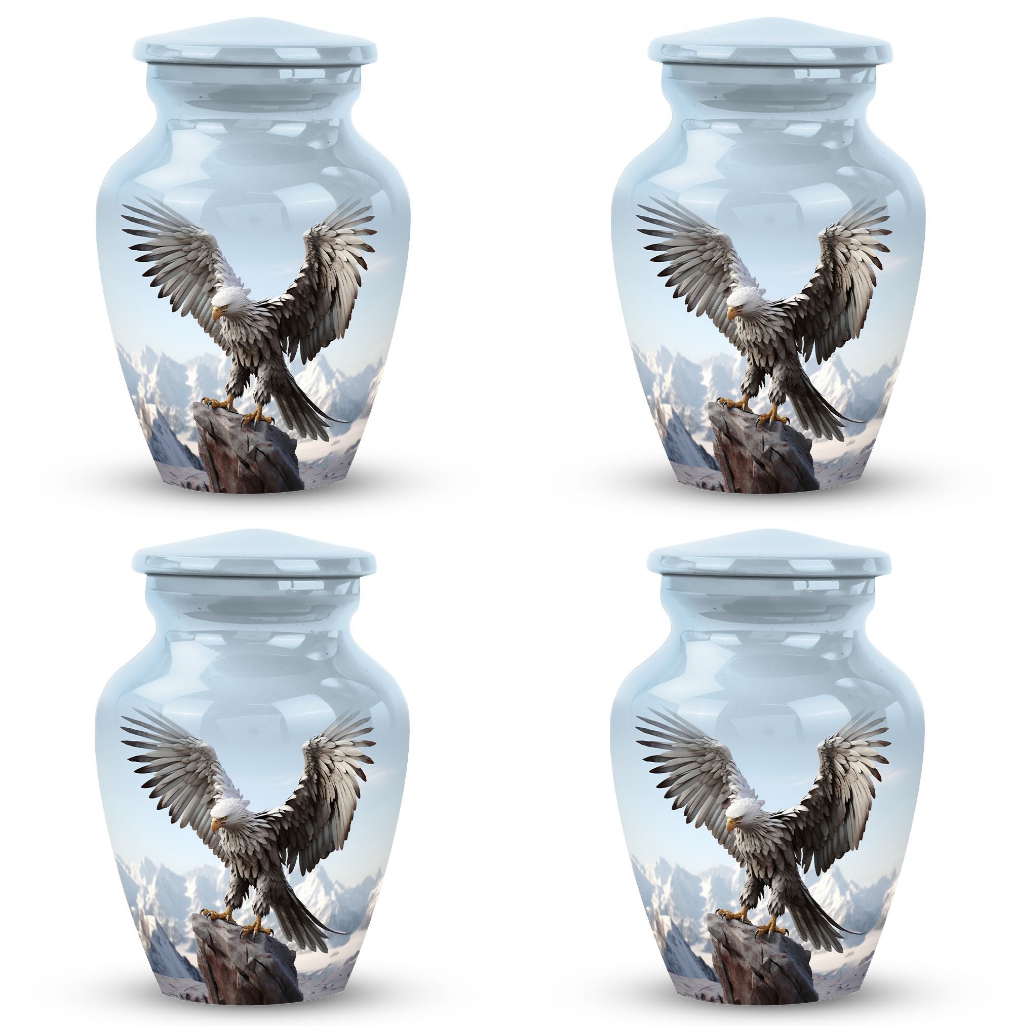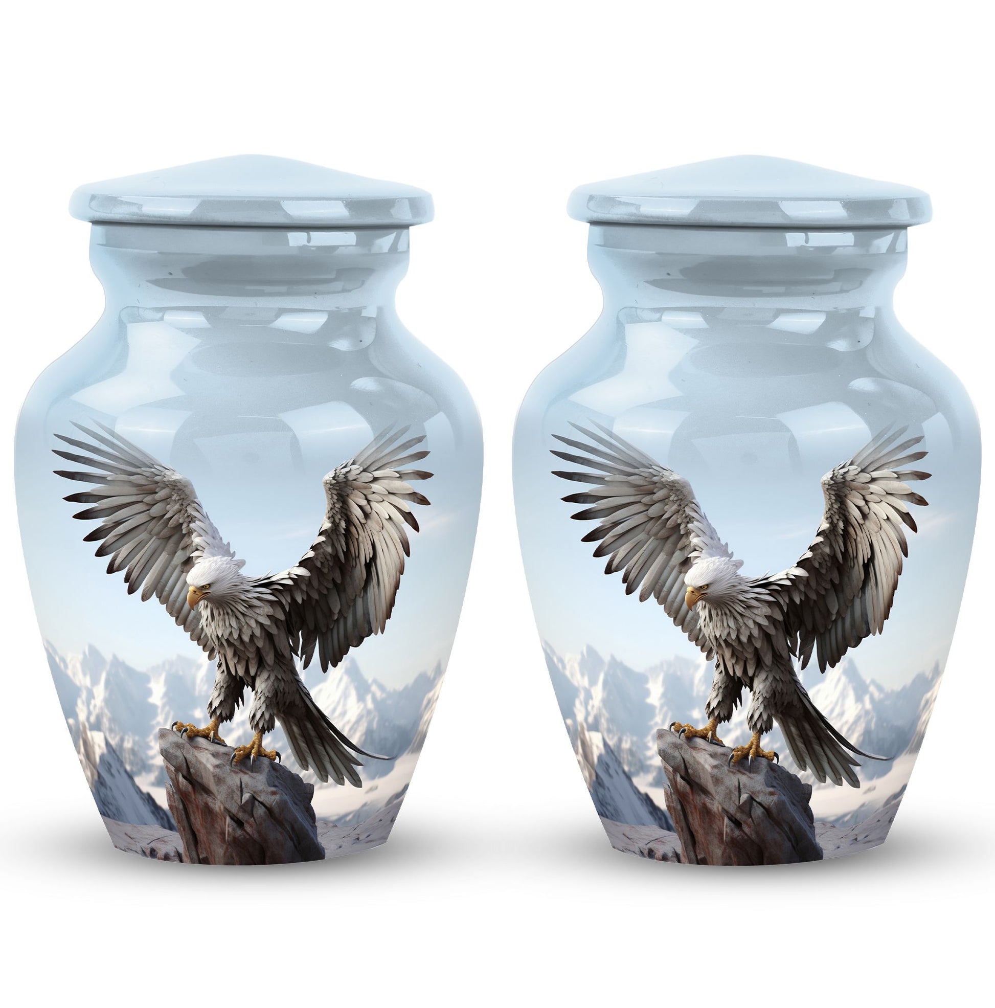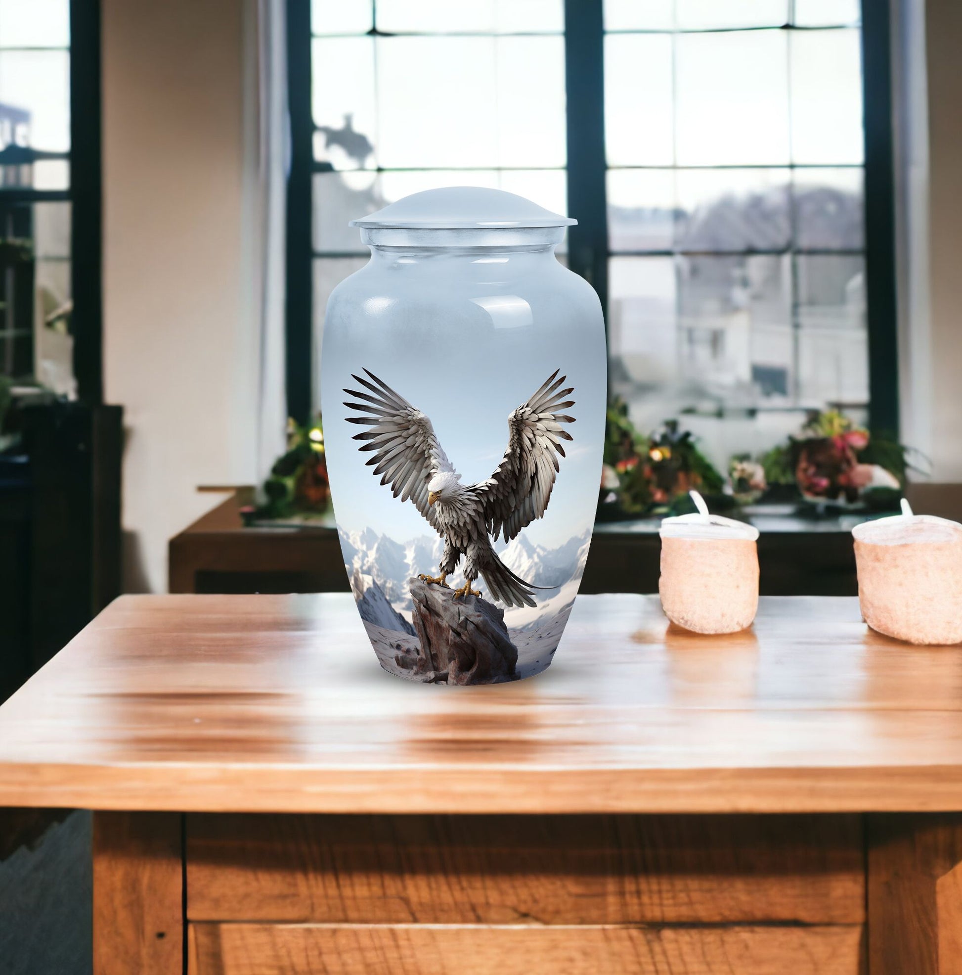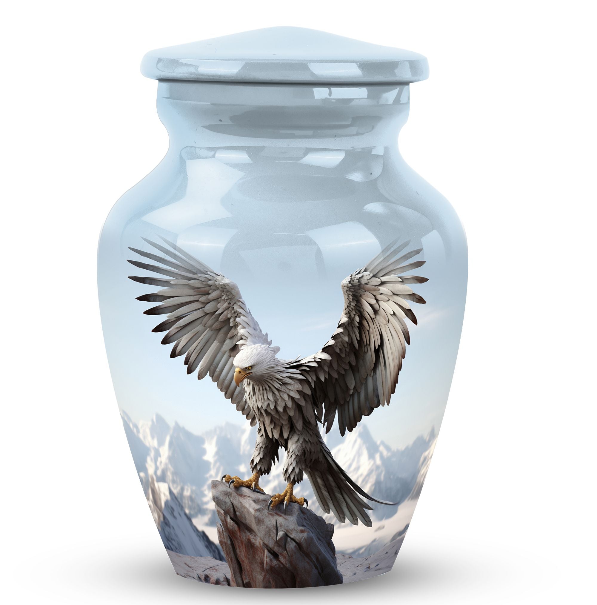 An Eagle Urn for Ashes, a cremation urn of distinguished design. This Large Urn is crafted from high-quality aluminium, symbolizing strength and durability, and has a weight of 3.3 pounds. Its stately proportions are significant, standing 10 inches in height with a substantial capacity of 200 cubic inches, ample enough to store human remains. Its majestic size adds to its appeal, making it an attractive decorative urn. The Urn's distinguished and classic features make it an appropriate choice for any memorial ceremony. Included in your purchase is a velvet pouch for containment of ashes, adding a thoughtful and respectful touch to this cremation urn. There is also the option to further personify this urn by engraving names, adding further intimacy to this lasting memorial. This urn is a heartfelt gesture of remembrance, a perfect memorial object for those cherished loved ones. It invokes remembrance, encouraging fond and loving memories of the departed. Search terms such as Personalized Urns, Urns for Ashes for Dad, Urns for Human Remains make this urn easily discoverable for our valued customers.