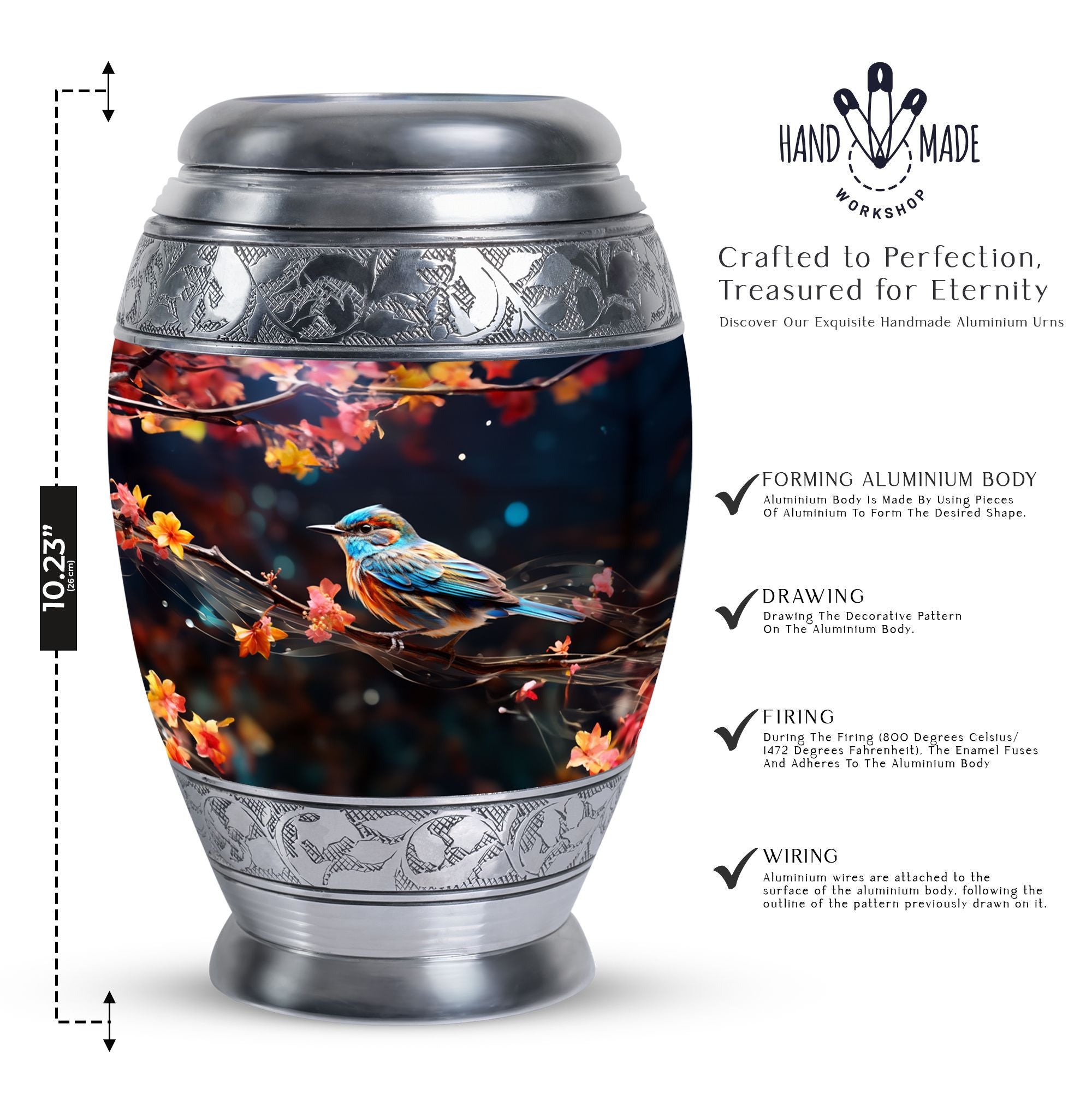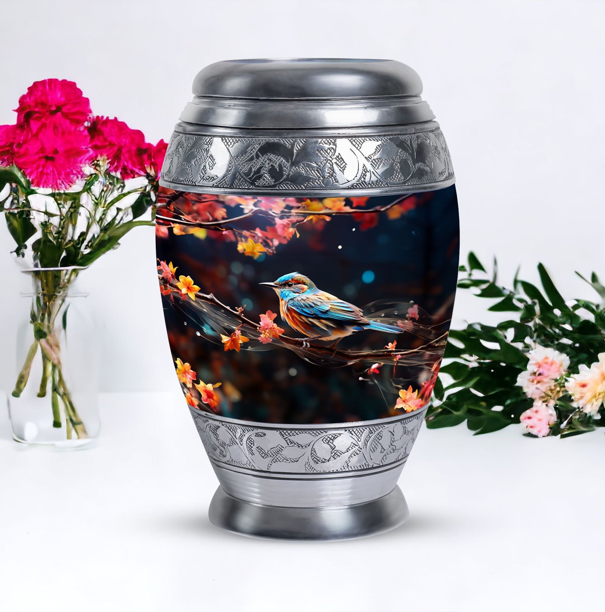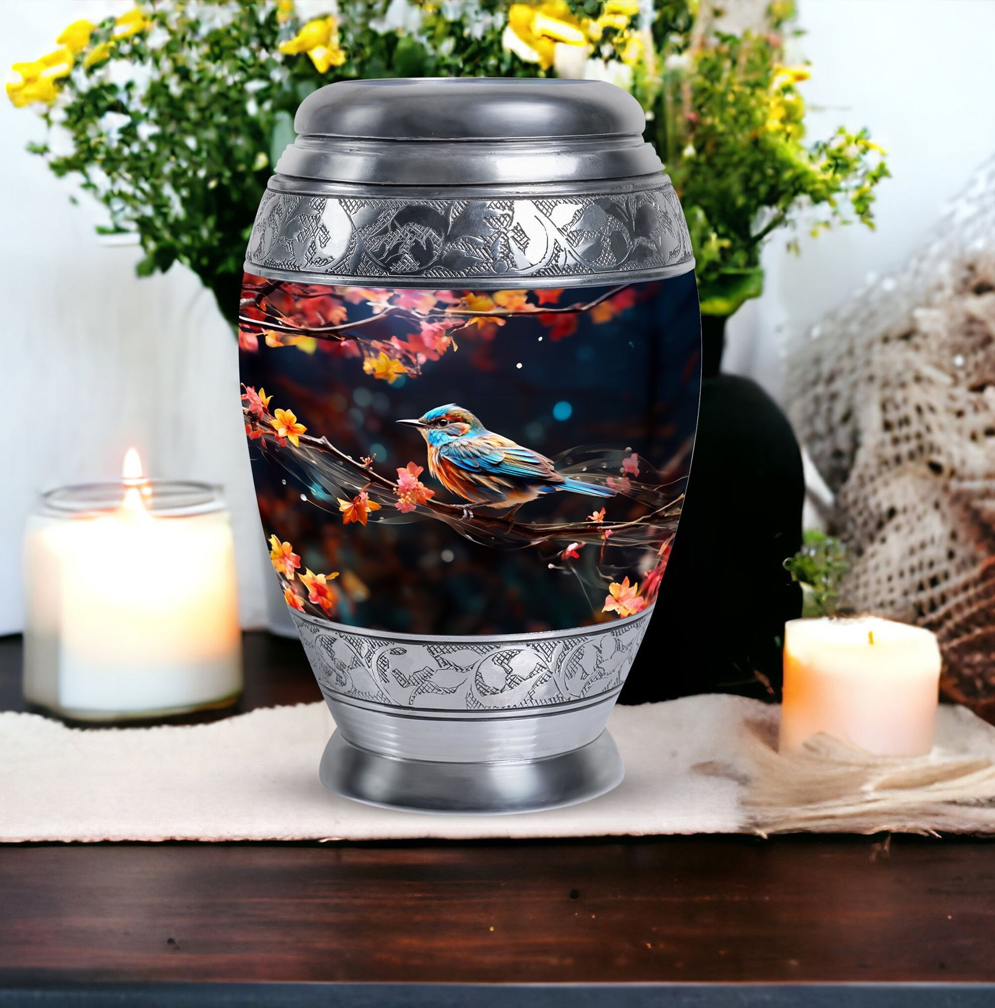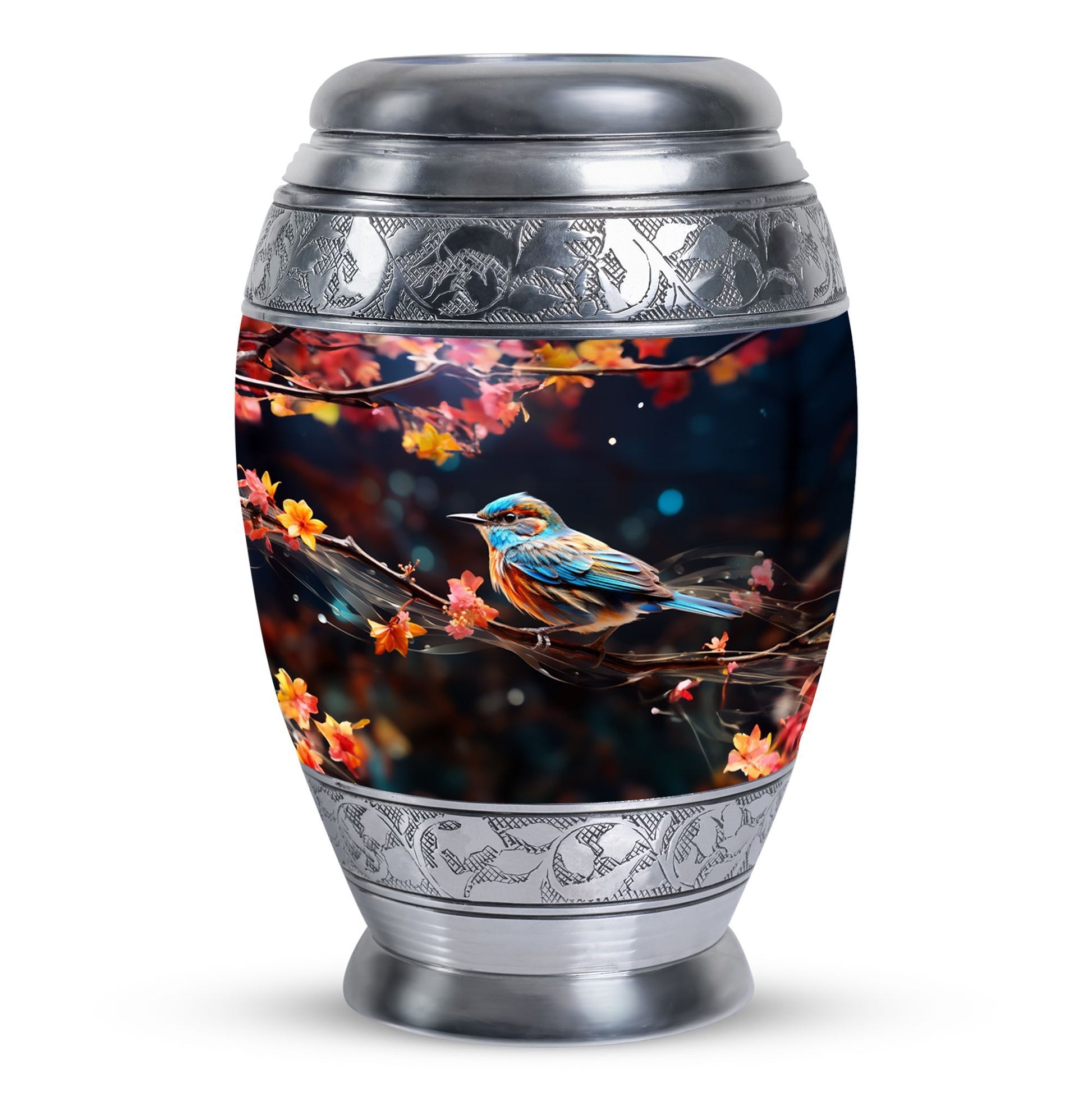 Introduce a serene final resting place with our elegant Sparrow Urns for Ashes. Constructed meticulously from aluminium, they carry an air of grace and respect. These large urns, weighing just 3.3 pounds, with dimensions of 10 inches in height, are equipped to securely hold up to 200 cubic inches of ashes, perfectly catering to your needs. Each urn comes with a velvet pouch, offering an additional level of dignified containment for the ashes. A significant feature of these products is customization - personalize your memorial urns with engraved names, adding a touching tribute. Sized at 3 inches, these personalized urns blend in seamlessly at the memorial ceremony, without drawing undue attention. Whether you're searching for modern urns or modern cremation urns, our classic aluminium urn design offers an appealing choice. Designed with care and responsibility, these urns offer a beautiful way to remember and honor your loved ones.