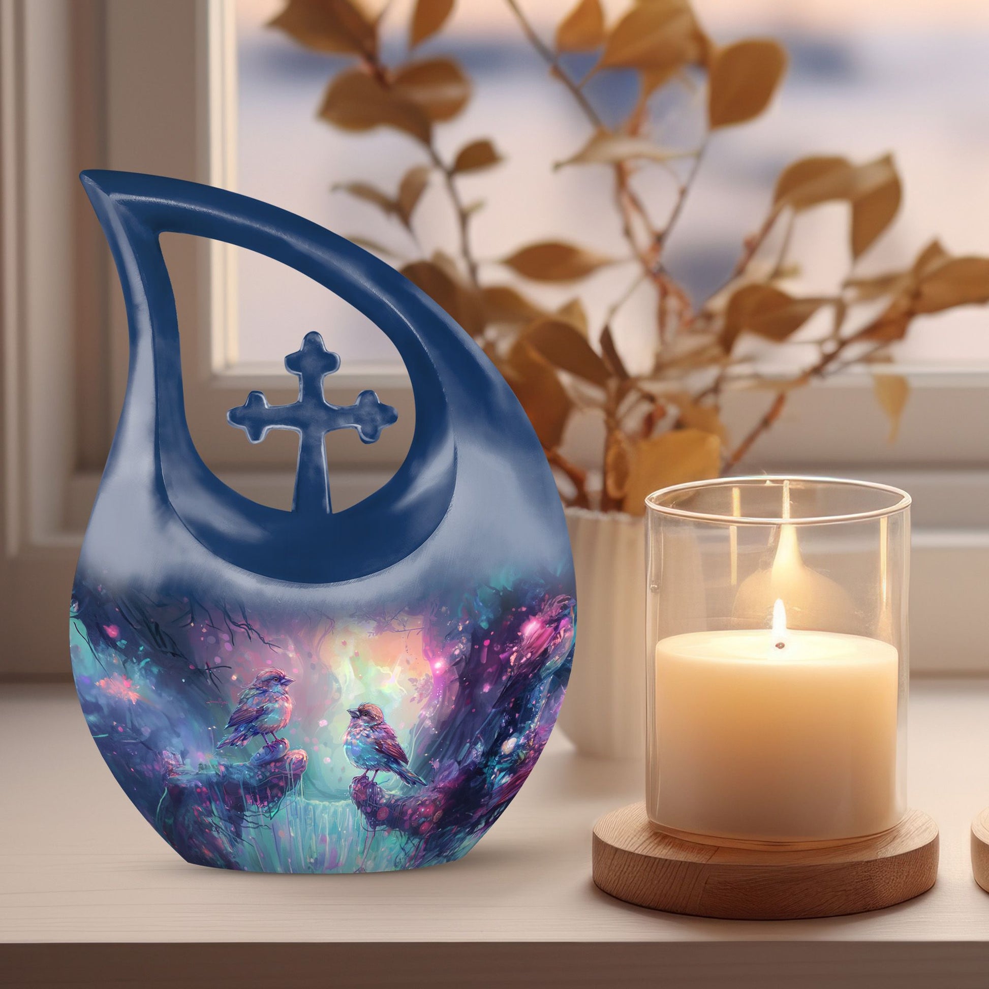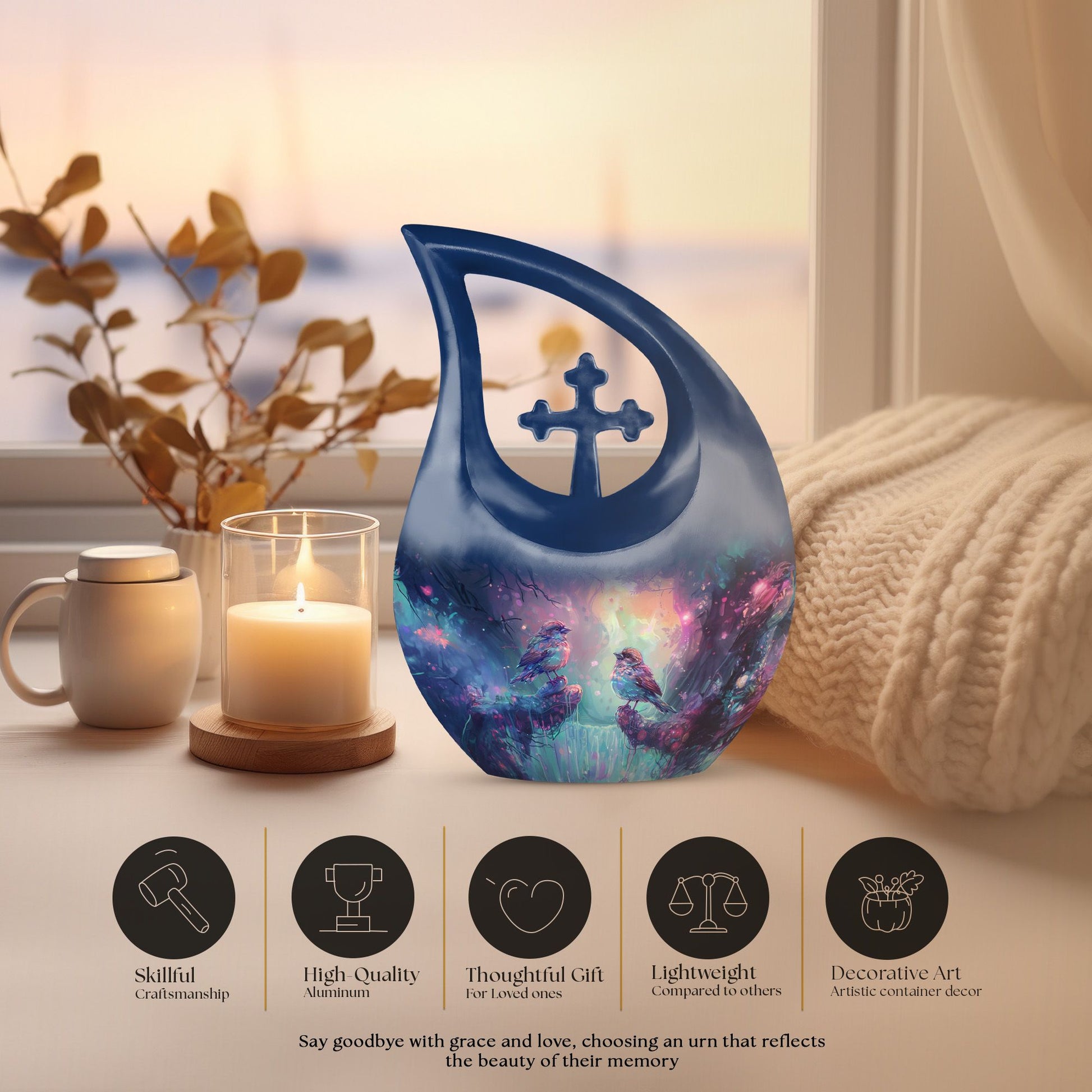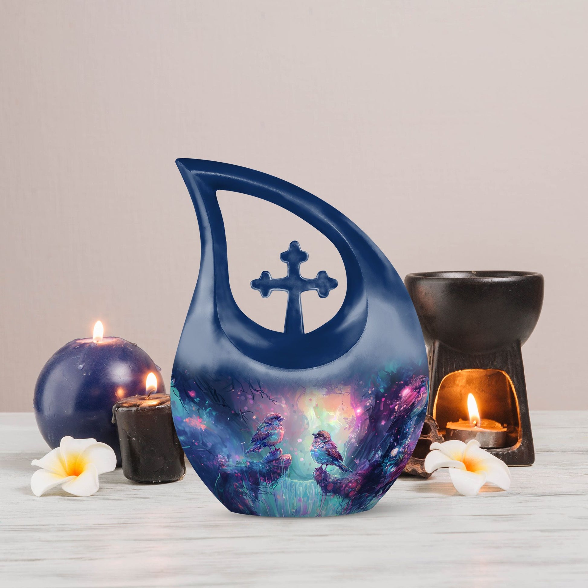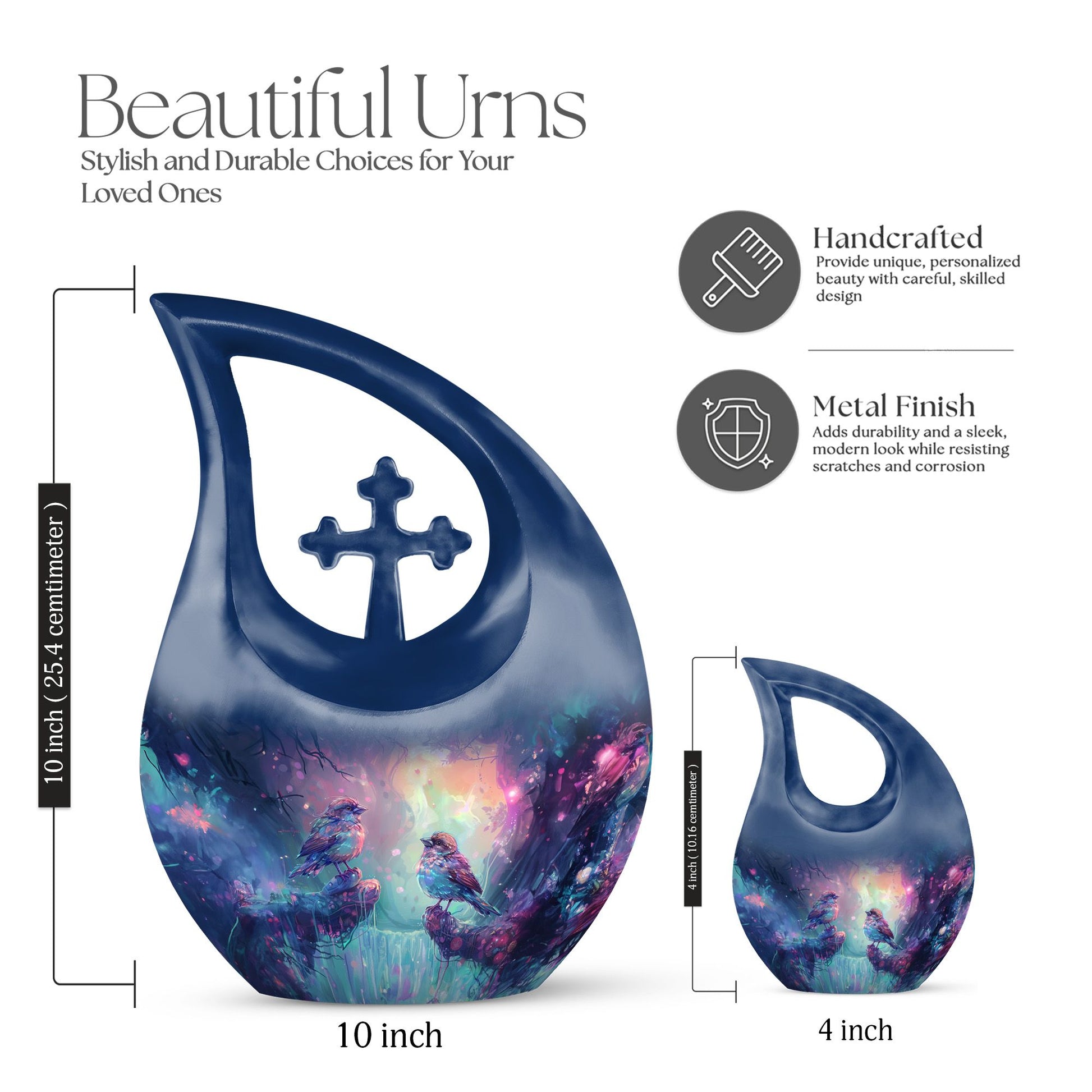 Immerse yourself in peaceful remembrance with the striking Magical Forest Sparrow Urn. Sized at 10 inches, this beautiful piece is not just another memorial urn. It's a confluence of enchantment and solace - an embodiment of a sublime tribute. Crafted from durable aluminium, the urn weighs in at 3.3 pounds and can hold up to 200 cubic inches of ashes. The urn comes in a unique 'Cross Drop' theme, promising durability along with an unmatched aesthetic flair. Included with the urn is a velvet pouch, ensuring dignified containment of your loved one's ashes. Moreover, personalization options exist; get your loved ones’ names stylishly engraved on it. This beautiful urn is ideal for adult or senior individuals looking for elegant, special urns for ashes, including those seeking beautiful urns for mom, top cremation urns or exquisite female urns.