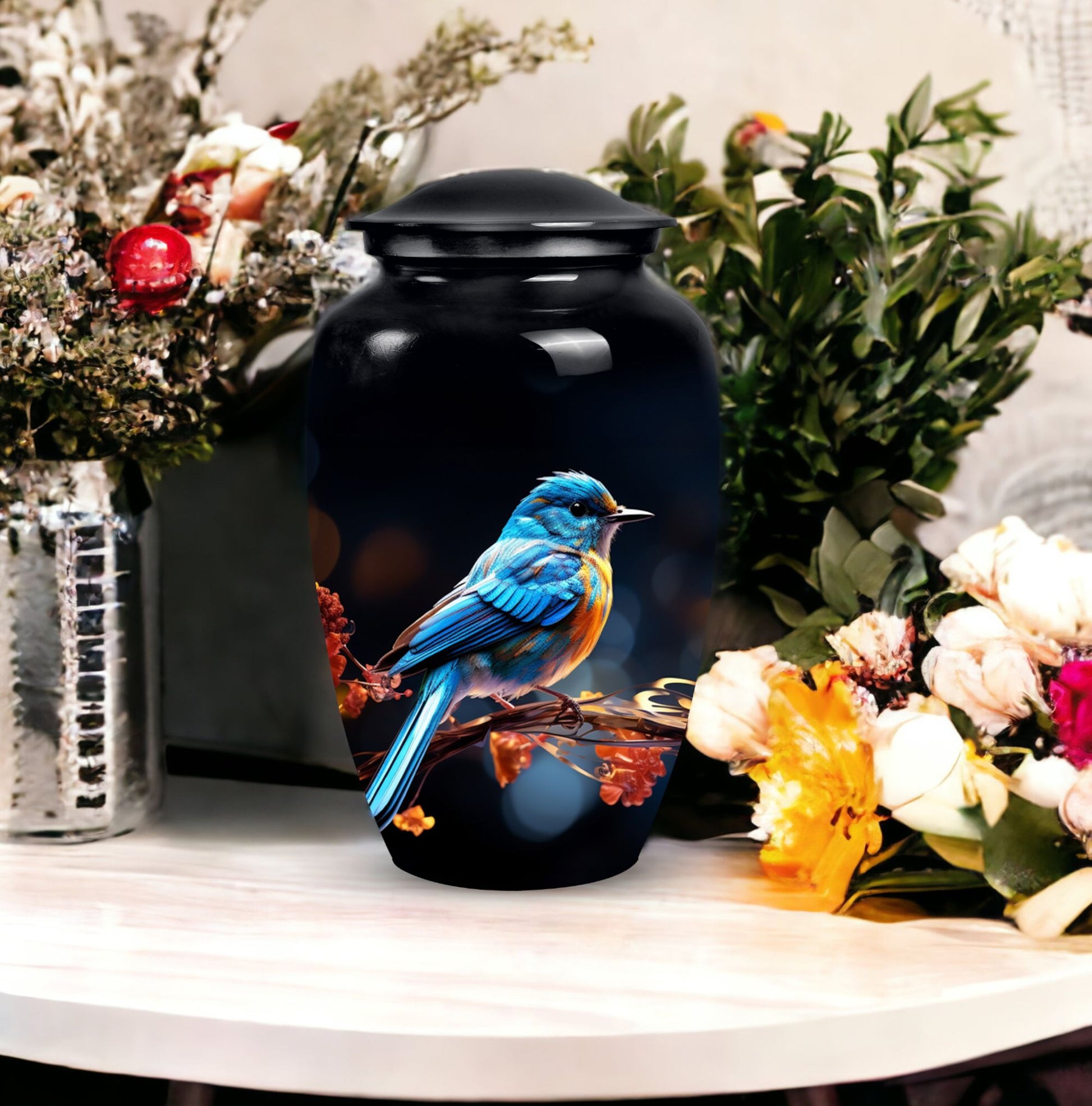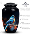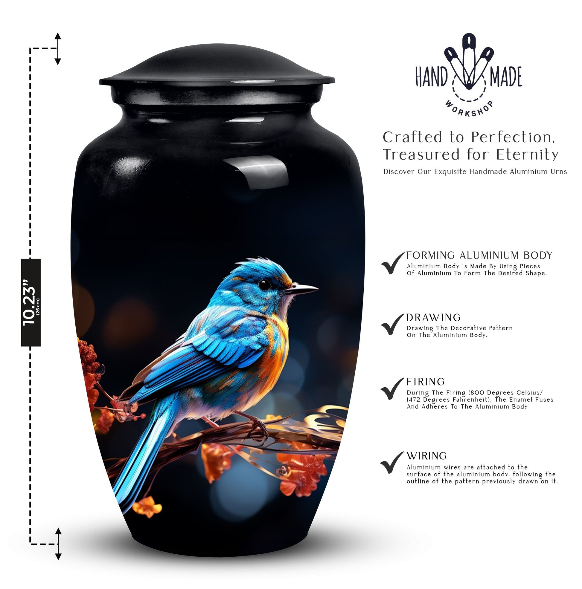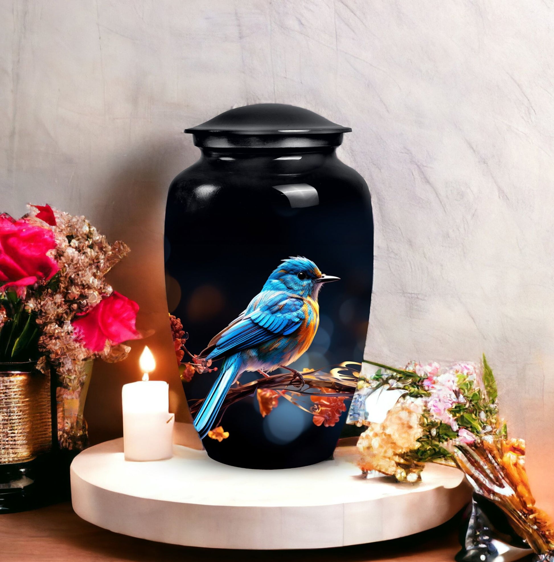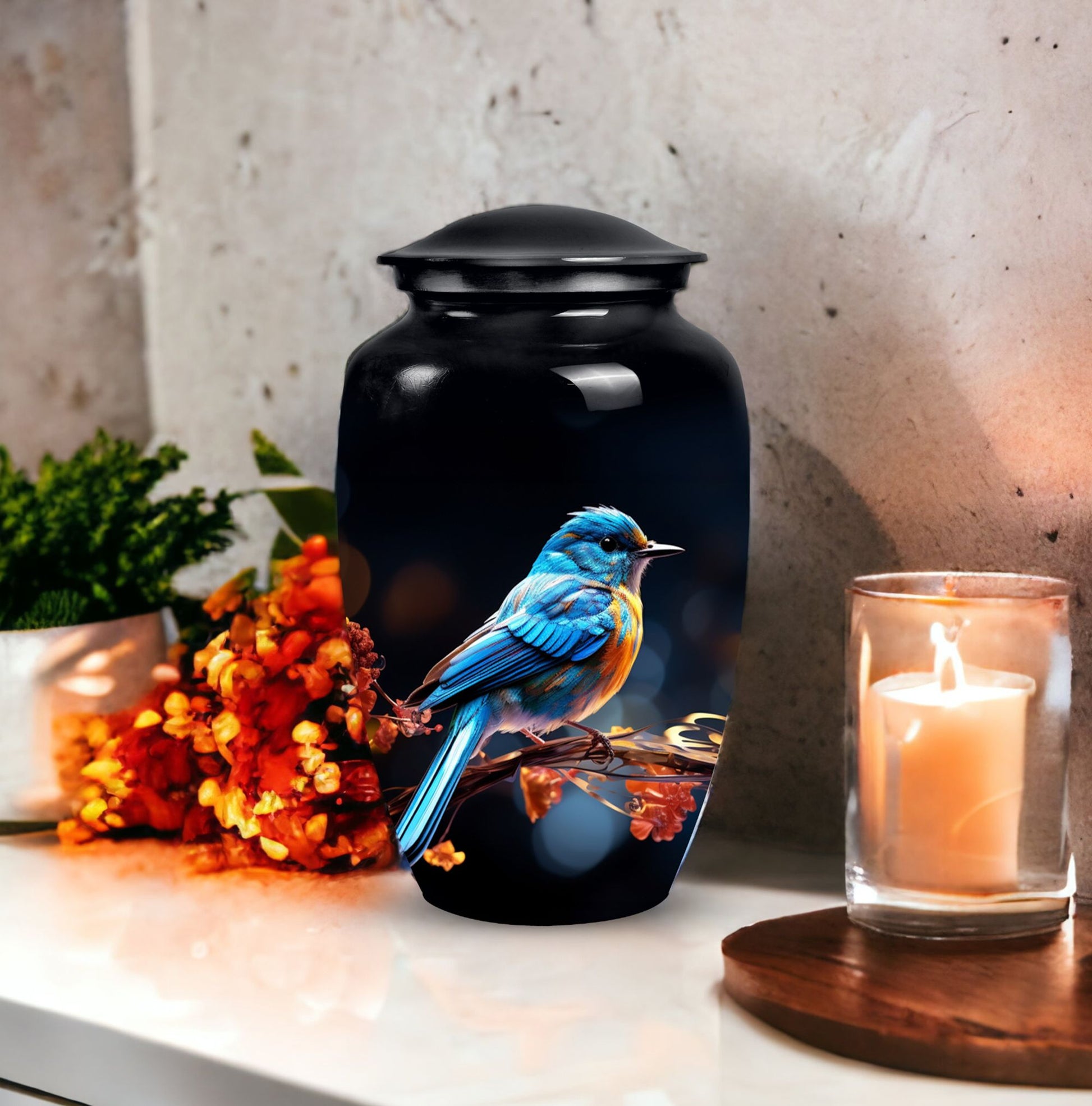 Experience the serene beauty of our Sparrow Urn, an exceptional piece from our unique urns collection. Crafted from durable metal, this cremation urn serves as a cherished memorial, encapsulating the essence of those who've embarked on their final journey. The emblem of a sparrow enhances its aesthetics, making it a beautiful commemoration. The Sparrow Urn is of medium size, designed to safely secure human ashes with the utmost dignity. Its compact nature creates an easy to carry, portable urn for human ashes, that's ideal for remembrance ceremonies. Given its sturdiness, this urn is also suitable for burial in ground, providing an enduring tribute. With the Sparrow Urn, ensure your loved ones are remembered with respect. Its unique charm adds a graceful touch to any memorial ceremony. A truly dignified representation, the Sparrow Urn stands as a testament to life well-lived and well-loved.