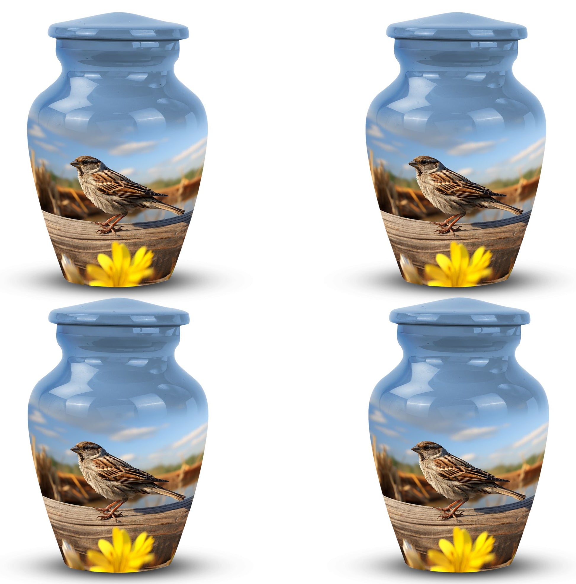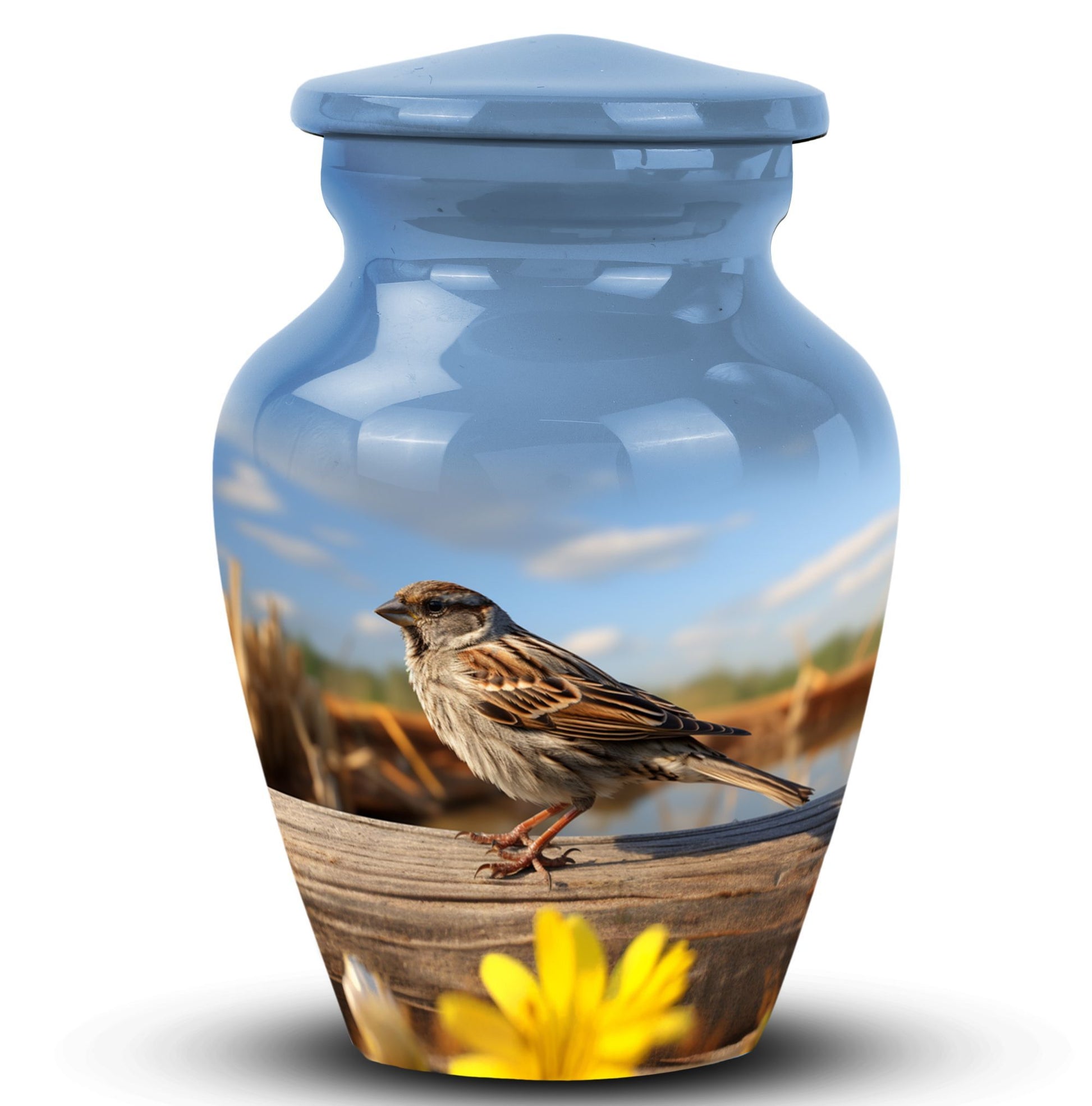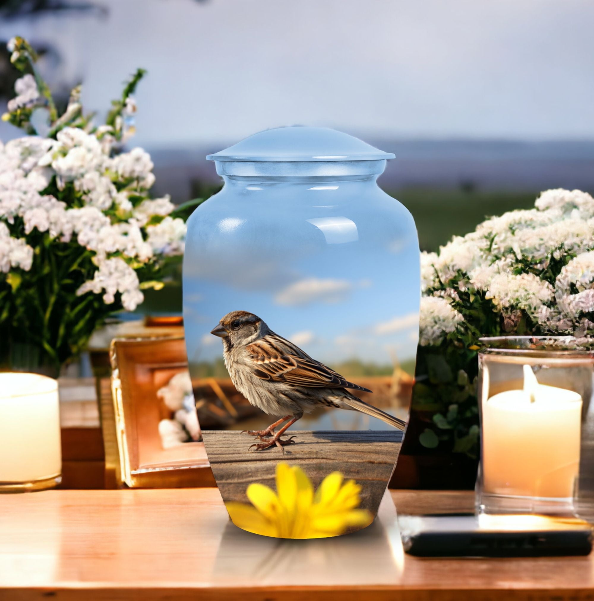 Find solace and tranquility with our meticulously crafted Sparrow Urns for Human Ashes. Ideal for adults or seniors, the urn has the capacity to contain 200 cubic inches of cremation ashes. This Large Urn stands 10 inches tall, cradling its contents in an intimate yet dignified manner. Fashioned and molded from premium quality aluminium, it ensures both durability and sturdy build, weighing a substantial 3.3 pounds. Accompanied by a soft velvet pouch, the containment of remainings become a streamlined process. To add a more heartfelt touch, customization is available for our customers, where engraved names can be adorned on the urn, personalizing your commemoration. Exploring themes of life, death, and remembrance, our series of Urns for Cremation Ashes creates a soothing transition, supporting your journey of bereavement. With an embodiment of your loved one's spirit, every Large Urn is more than a simple ashes holder or burial urn; it constitutes a significant token of remembrance, keeping memories alive.