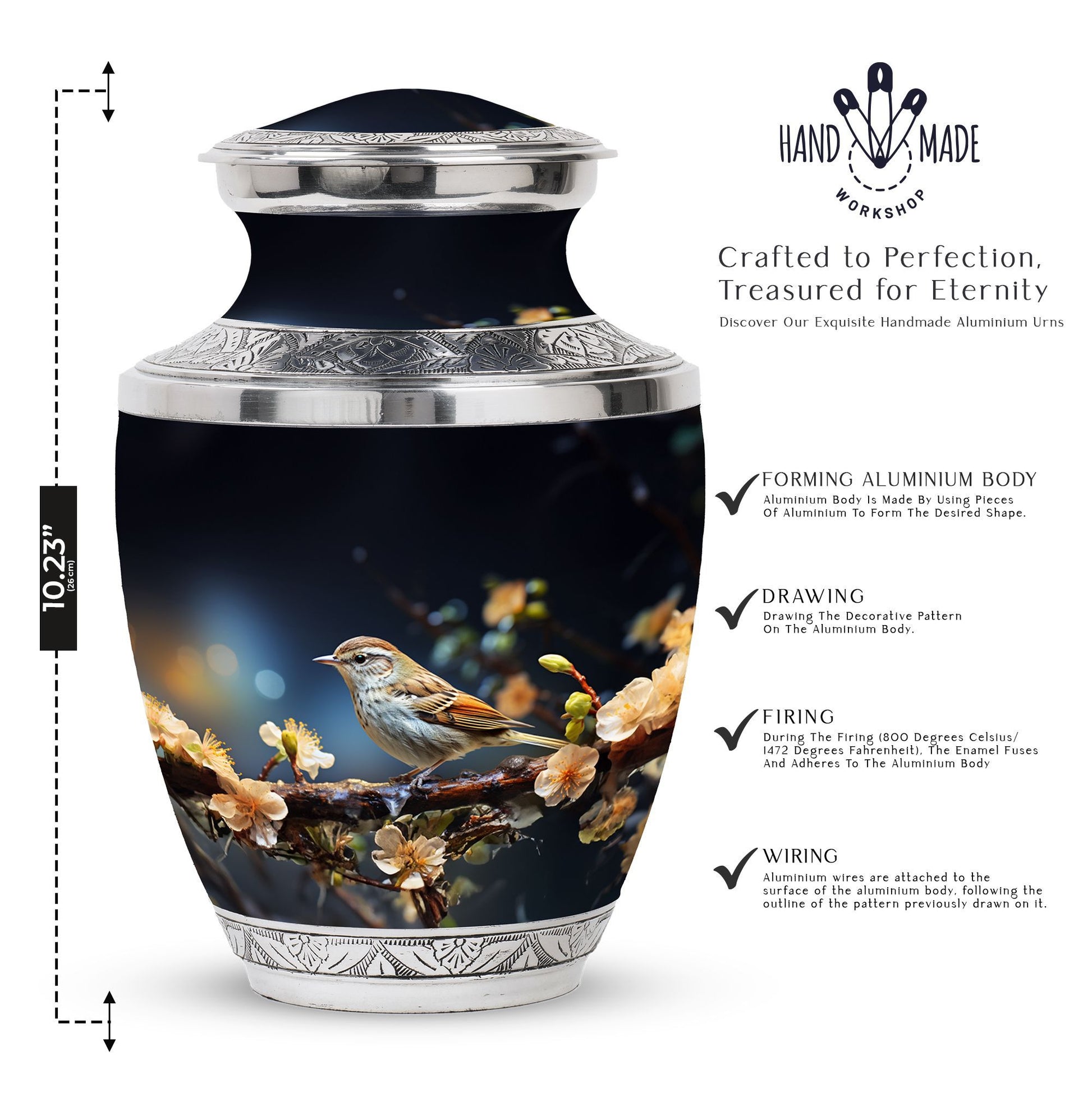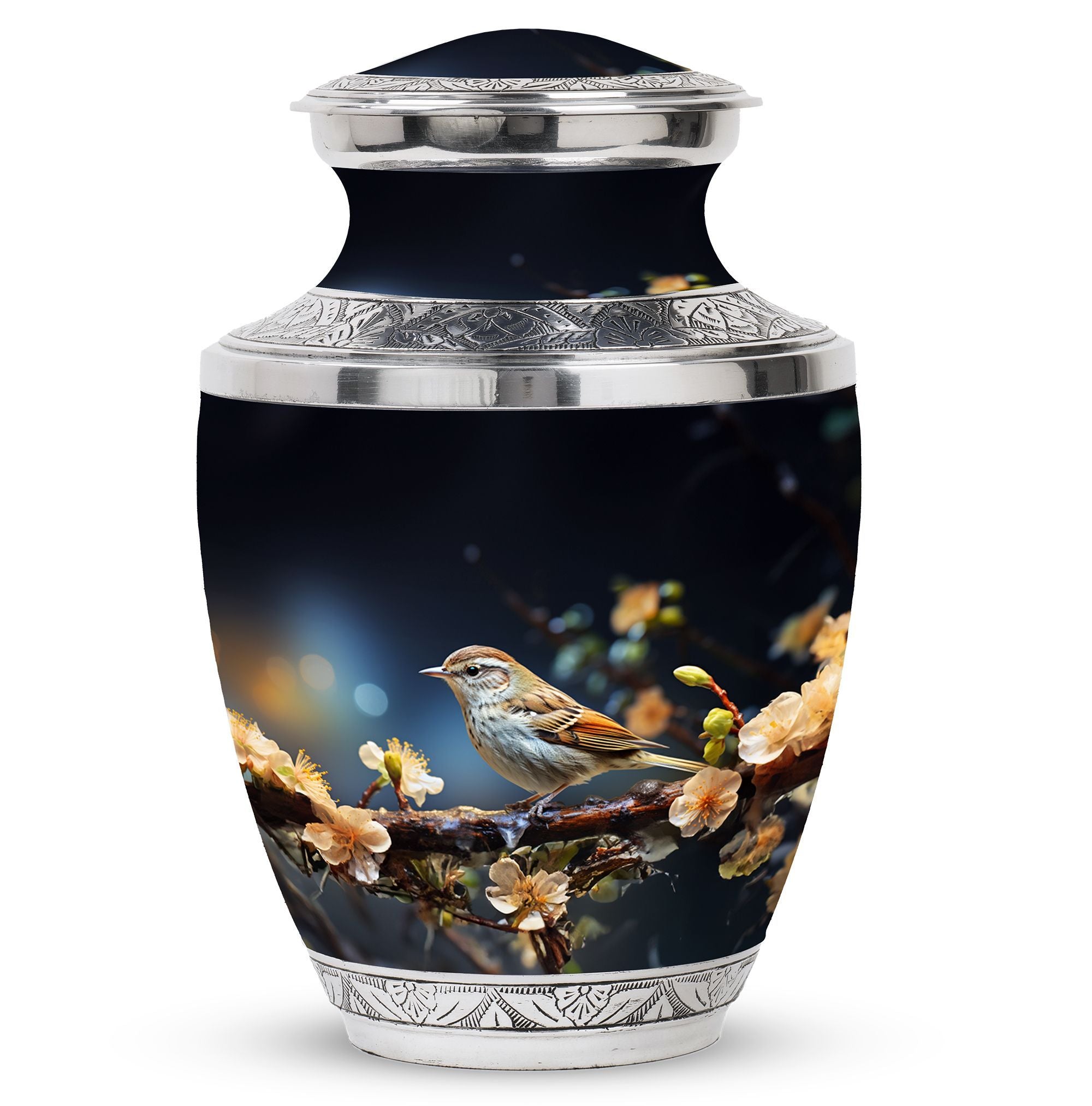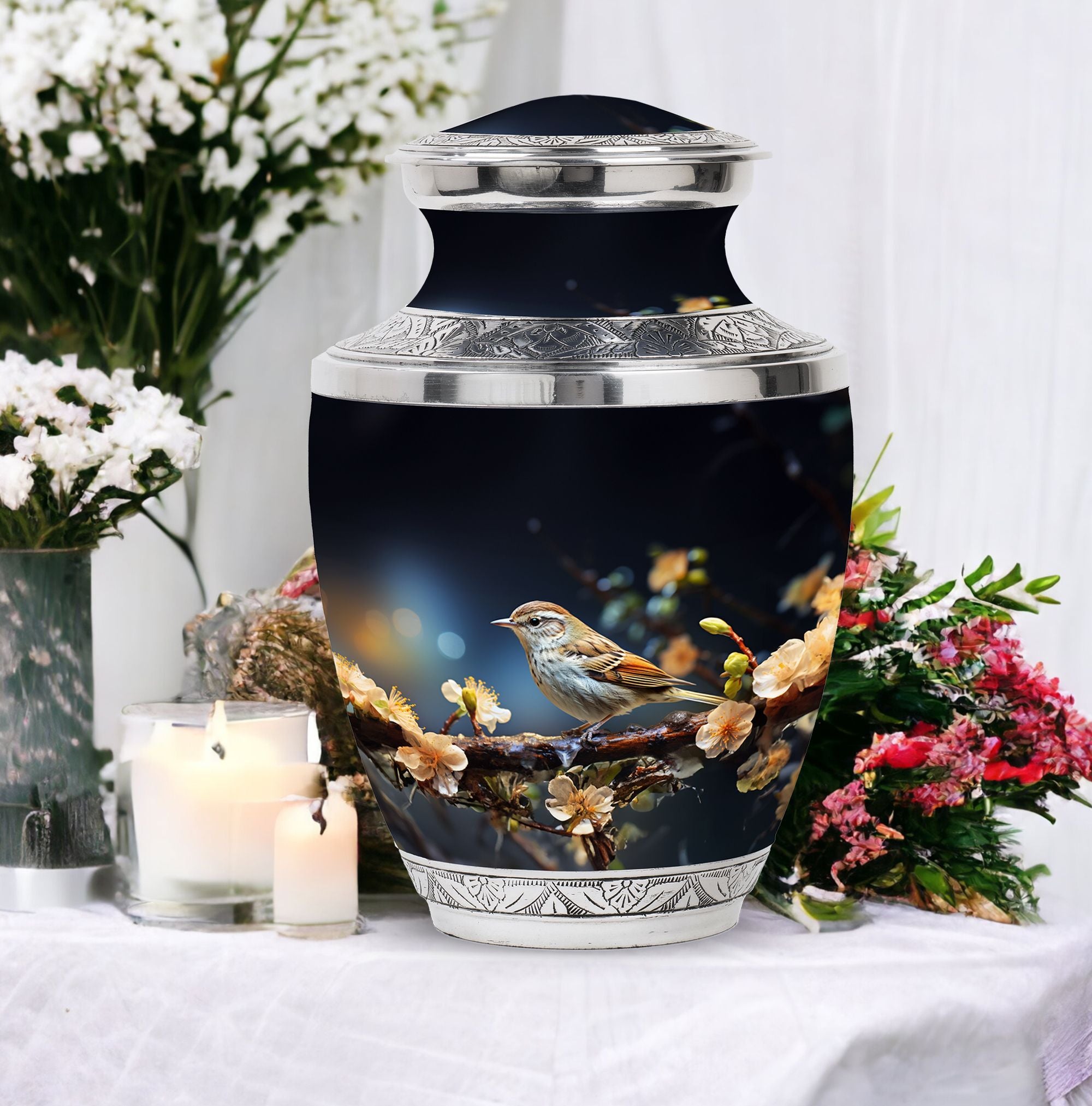 Holding the esteemed honor of cherishing the memories of your loved ones, our Sparrow Urn is a poignant choice for Funeral Urns. With a dimension of 10 inches in height and a capacity of 200 cubic inches, it's similar to the Cremation Urns For Ashes often sought-after by consumers. Handcrafted meticulously with immaculate detail, it's made from durable Aluminium and possesses a substantial feel given its weight of 3.3 pounds. Its compact size of 3 inches makes it a respectful tribute to those dearly departed, yet functional in terms of storage ease. Moreover, this large urn comes with a velvet pouch, ensuring the containment of ashes is done with utmost respect and dignity. For those seeking a unique touch, customization is available, allowing for engraved names to further personalise this timeless memento.