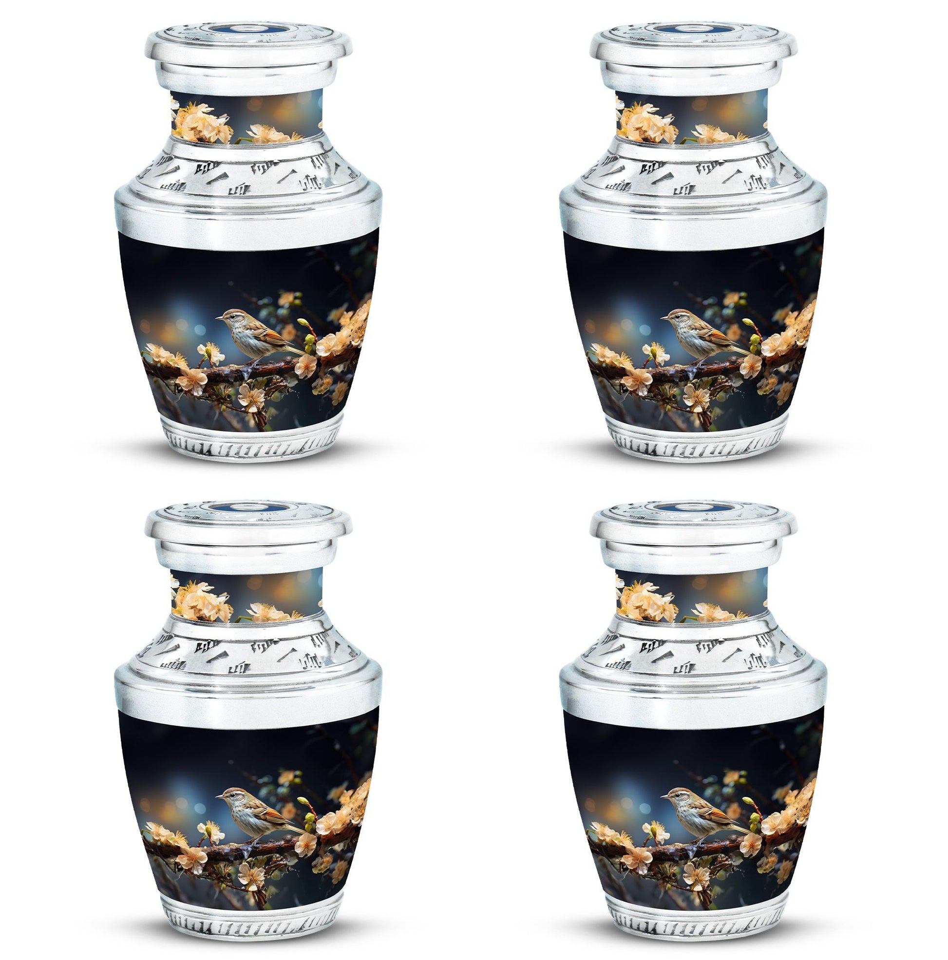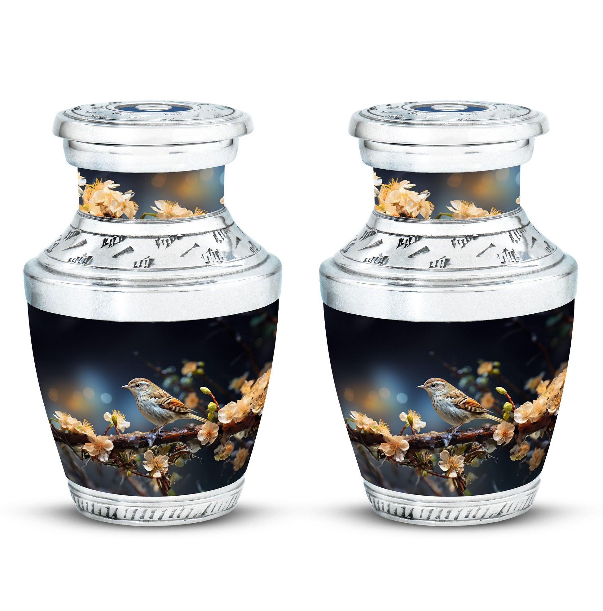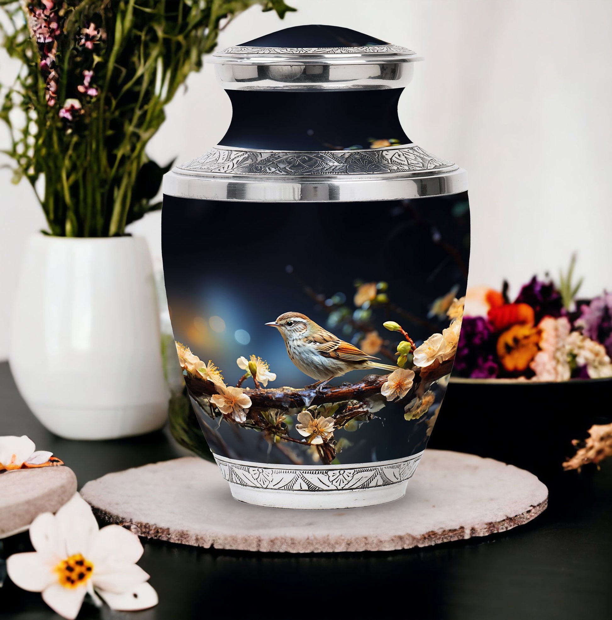 Holding the esteemed honor of cherishing the memories of your loved ones, our Sparrow Urn is a poignant choice for Funeral Urns. With a dimension of 10 inches in height and a capacity of 200 cubic inches, it's similar to the Cremation Urns For Ashes often sought-after by consumers. Handcrafted meticulously with immaculate detail, it's made from durable Aluminium and possesses a substantial feel given its weight of 3.3 pounds. Its compact size of 3 inches makes it a respectful tribute to those dearly departed, yet functional in terms of storage ease. Moreover, this large urn comes with a velvet pouch, ensuring the containment of ashes is done with utmost respect and dignity. For those seeking a unique touch, customization is available, allowing for engraved names to further personalise this timeless memento.