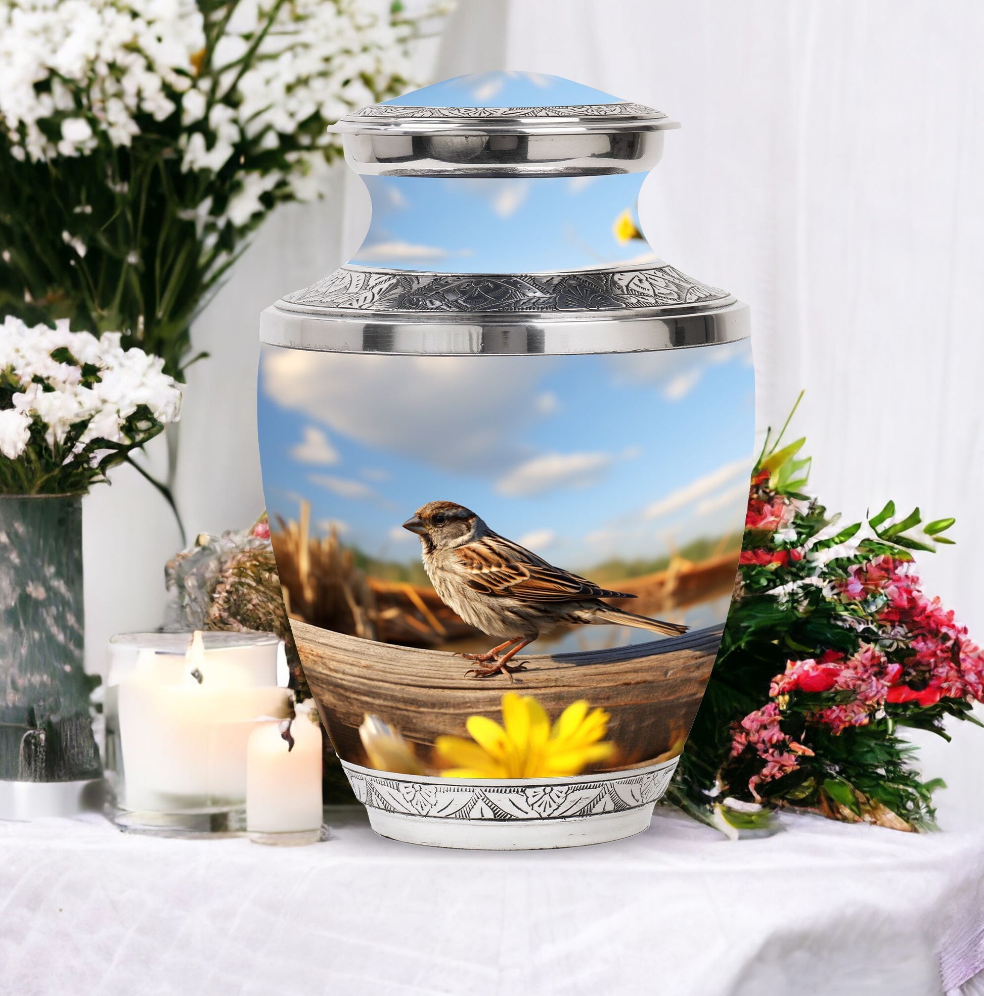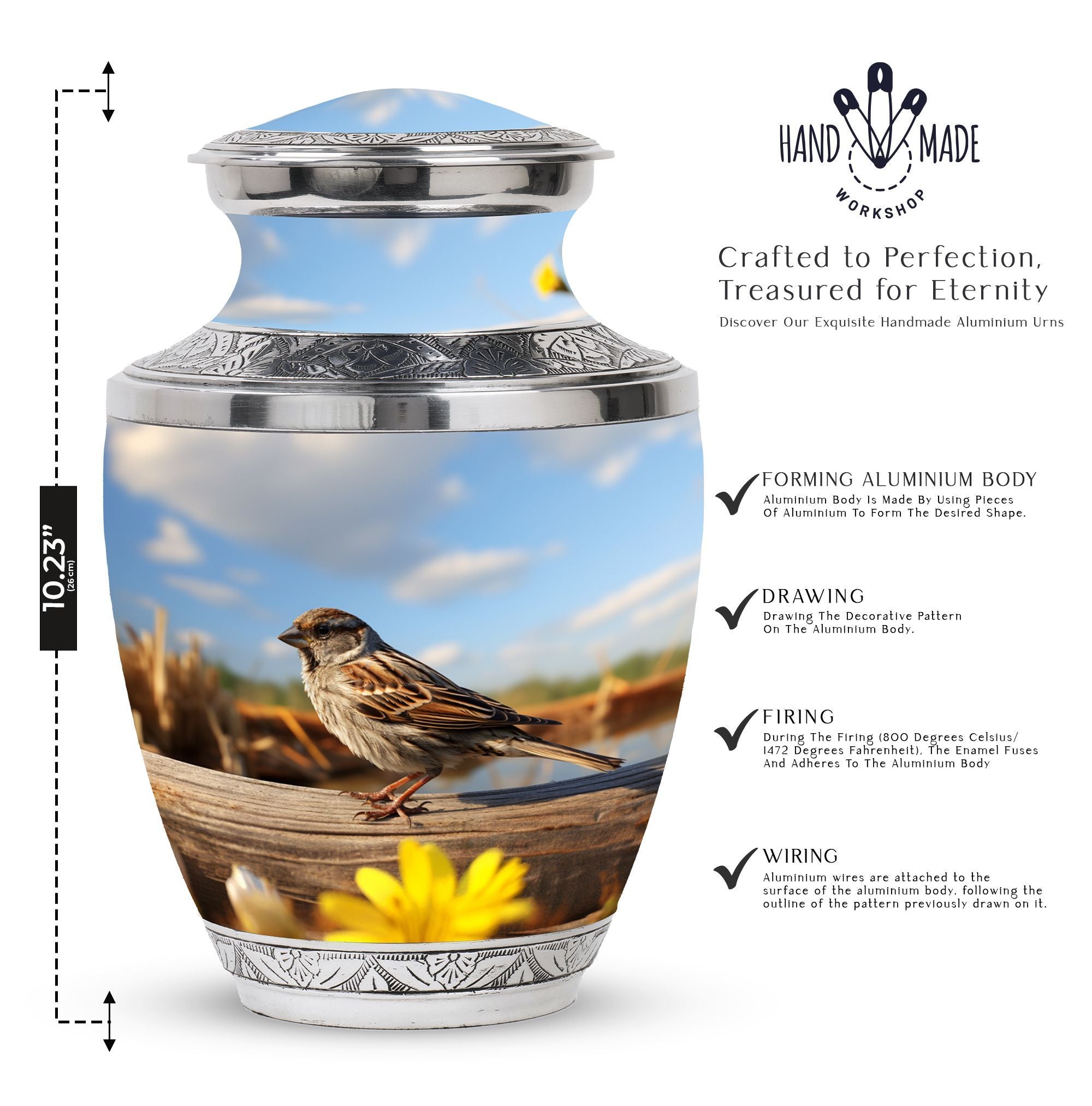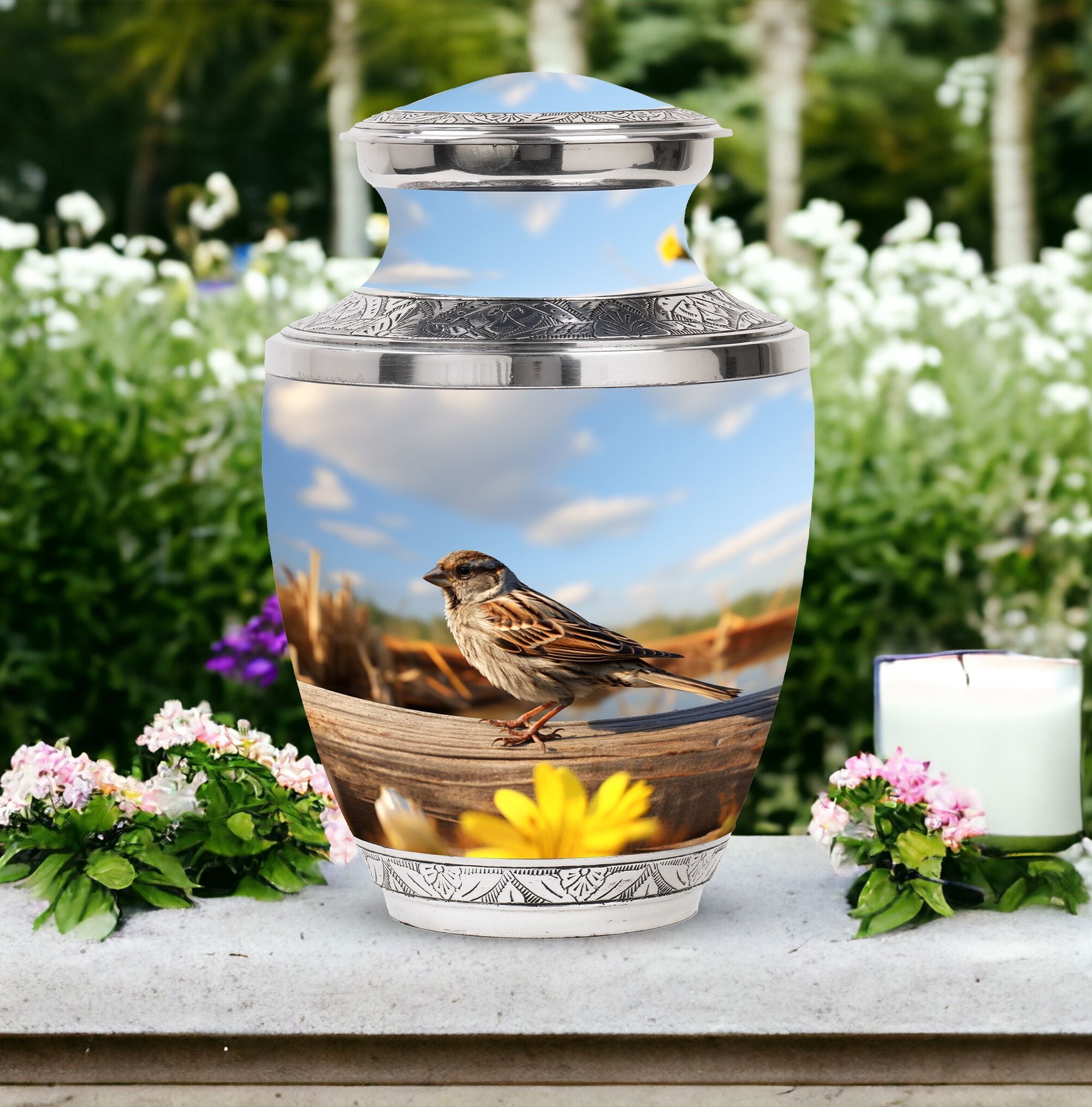 Delve into the realm of reverence and honor with the enigmatic Sparrow Urn for Human Ashes. This cremation urn demonstrates uncomplicated grace in its design and showcases a burly and durable Aluminium structure. Boasting a capacity of 200 cubic inches, this substantial urn effortlessly assimilates the ashes and stands tall at a height of 10 inches. Weighing in at 3.3 pounds, the urn is complemented by a velvet pouch, included in the package, which serves to contain the cremation ashes securely. The Sparrow Urn further offers a unique twist to memorializing loved ones, offering customization to etch names onto its solemn and dignified facade. Its size of 3 inches promotes pristine attention to detail. This urn coalesces the tranquility of the Modern Urns combined with the sacred charm of Burial Urns, ensuring a cherished resting place for your loved ones. The Sparrow Urn is an homage to memorable bonds, a silent echo of heartfelt farewell.