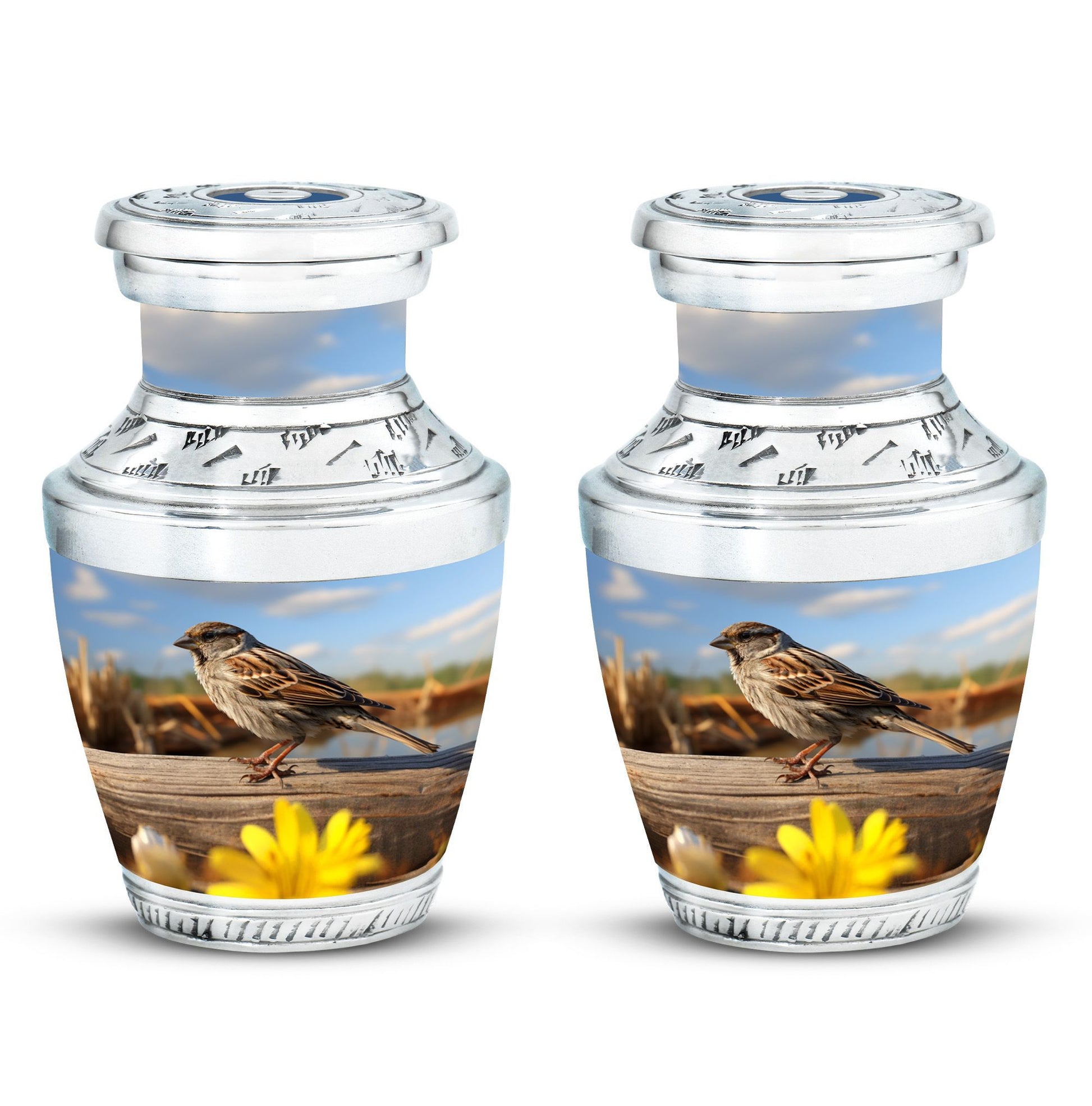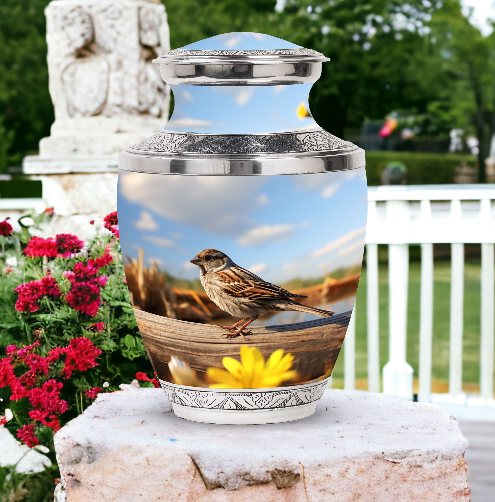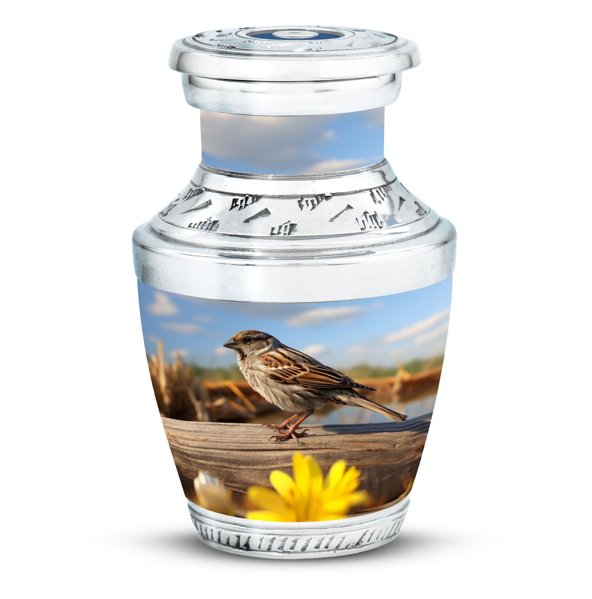 Delve into the realm of reverence and honor with the enigmatic Sparrow Urn for Human Ashes. This cremation urn demonstrates uncomplicated grace in its design and showcases a burly and durable Aluminium structure. Boasting a capacity of 200 cubic inches, this substantial urn effortlessly assimilates the ashes and stands tall at a height of 10 inches. Weighing in at 3.3 pounds, the urn is complemented by a velvet pouch, included in the package, which serves to contain the cremation ashes securely. The Sparrow Urn further offers a unique twist to memorializing loved ones, offering customization to etch names onto its solemn and dignified facade. Its size of 3 inches promotes pristine attention to detail. This urn coalesces the tranquility of the Modern Urns combined with the sacred charm of Burial Urns, ensuring a cherished resting place for your loved ones. The Sparrow Urn is an homage to memorable bonds, a silent echo of heartfelt farewell.