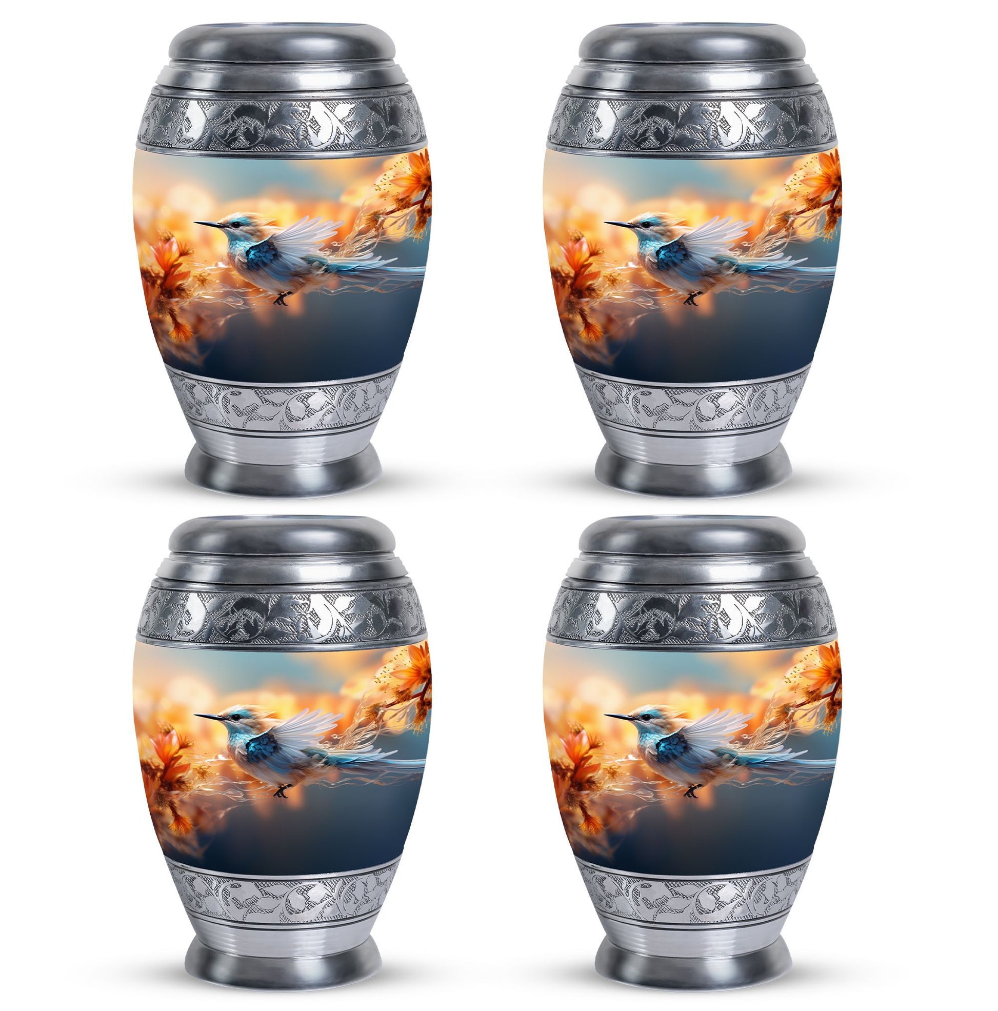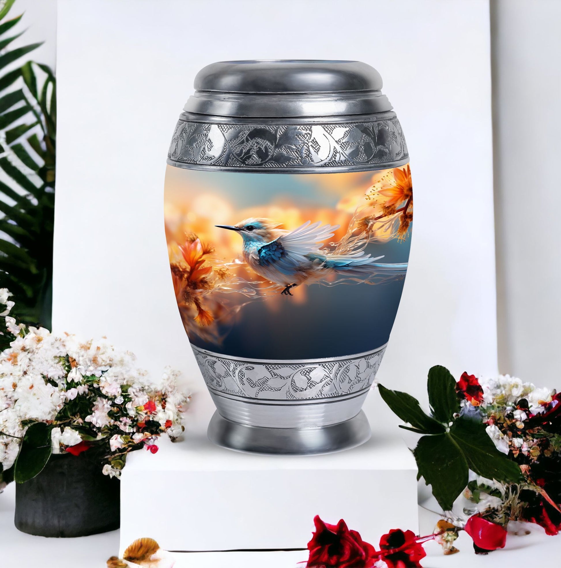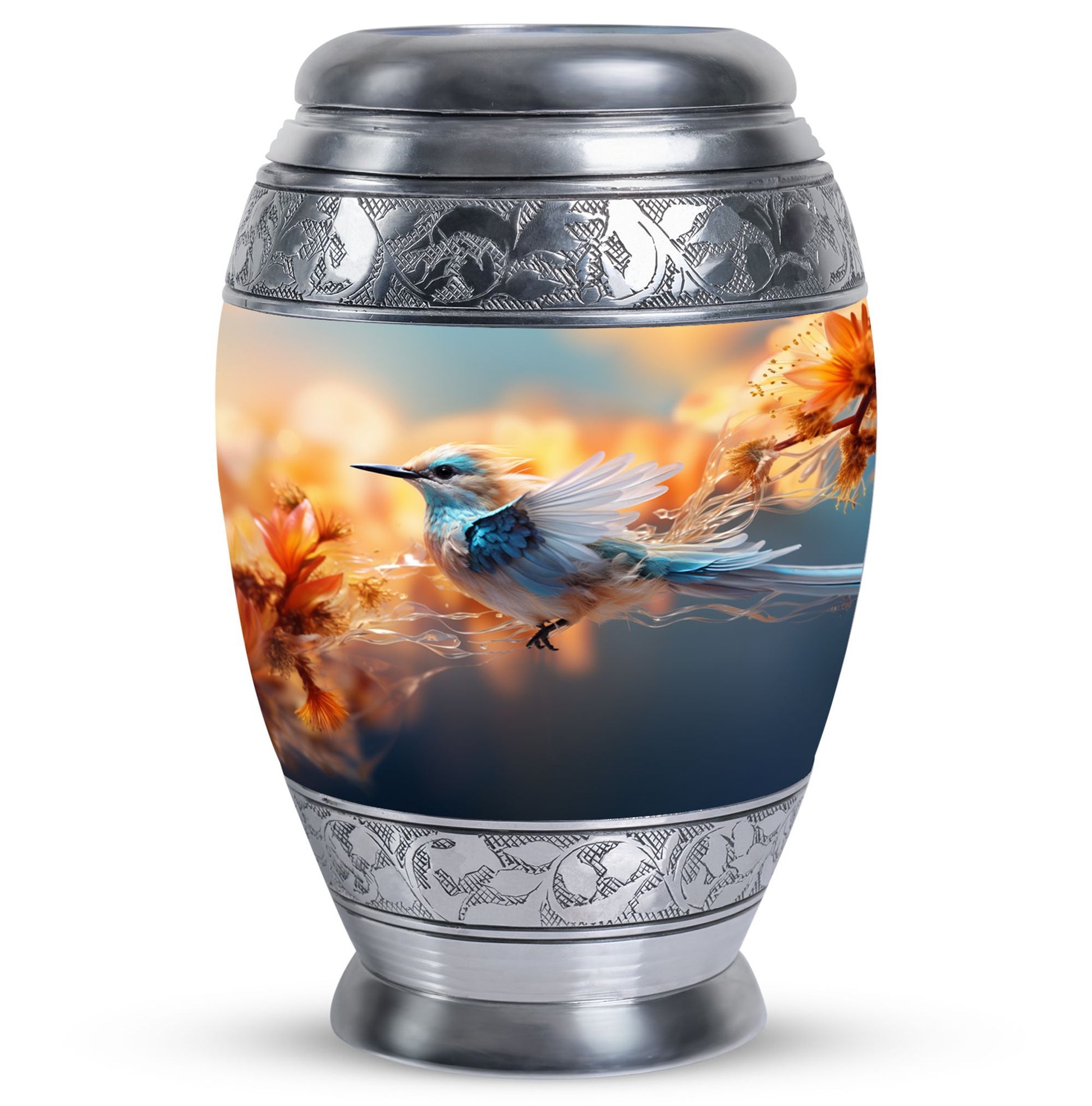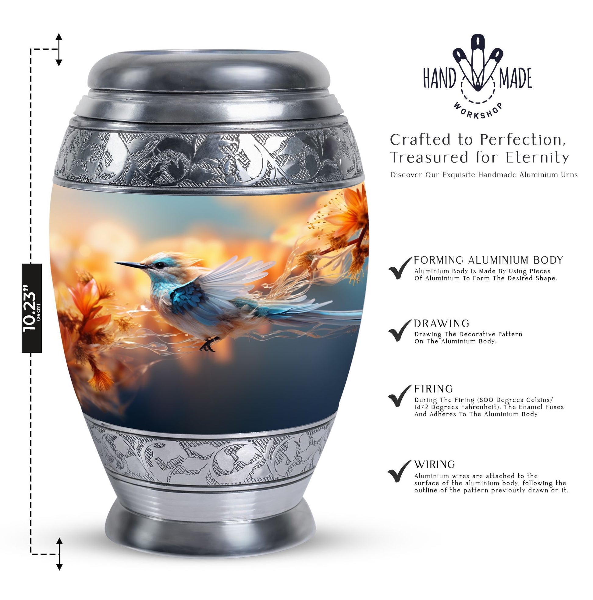 In commemoration of your beloved, our Sparrow Urns for Ashes is a respectful and fitting tribute to their memory. These large 3-inch urns for ashes for adults are crafted from durable aluminium and hand-finished to ensure a high level of quality and attention to detail. With a weight of 3.3 pounds and standing proud at a height of 10 inches, it can comfortably contain up to 200 cubic inches in capacity. Our cremation urns go the extra mile in offering you the chance to personalize your chosen piece with the engraving of names. Each urn also includes a luxurious velvet pouch, providing an extra layer of protection and a solemn touch to the containment of ashes. Whether you’re in search of urns for cremated remains or specific urns for moms, dads, or anyone dear to you, this classic urn design serves as the perfect eternal resting place.