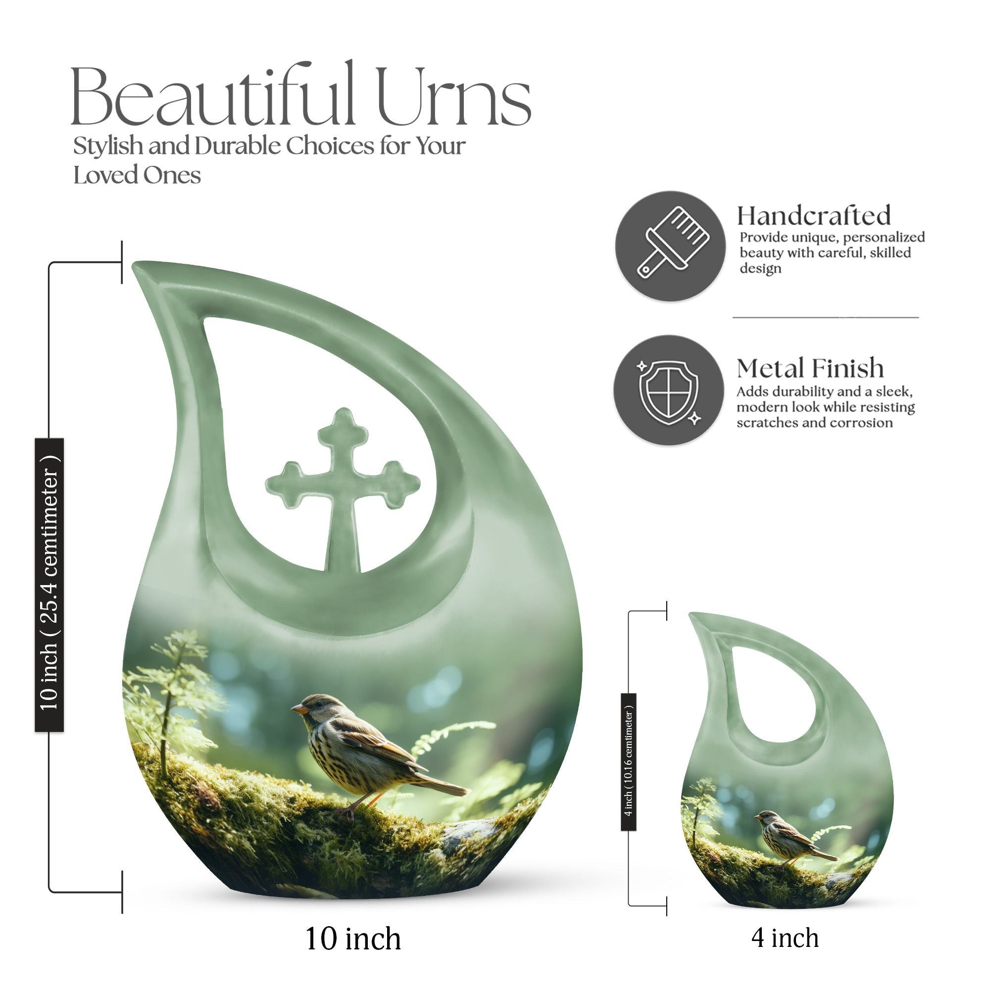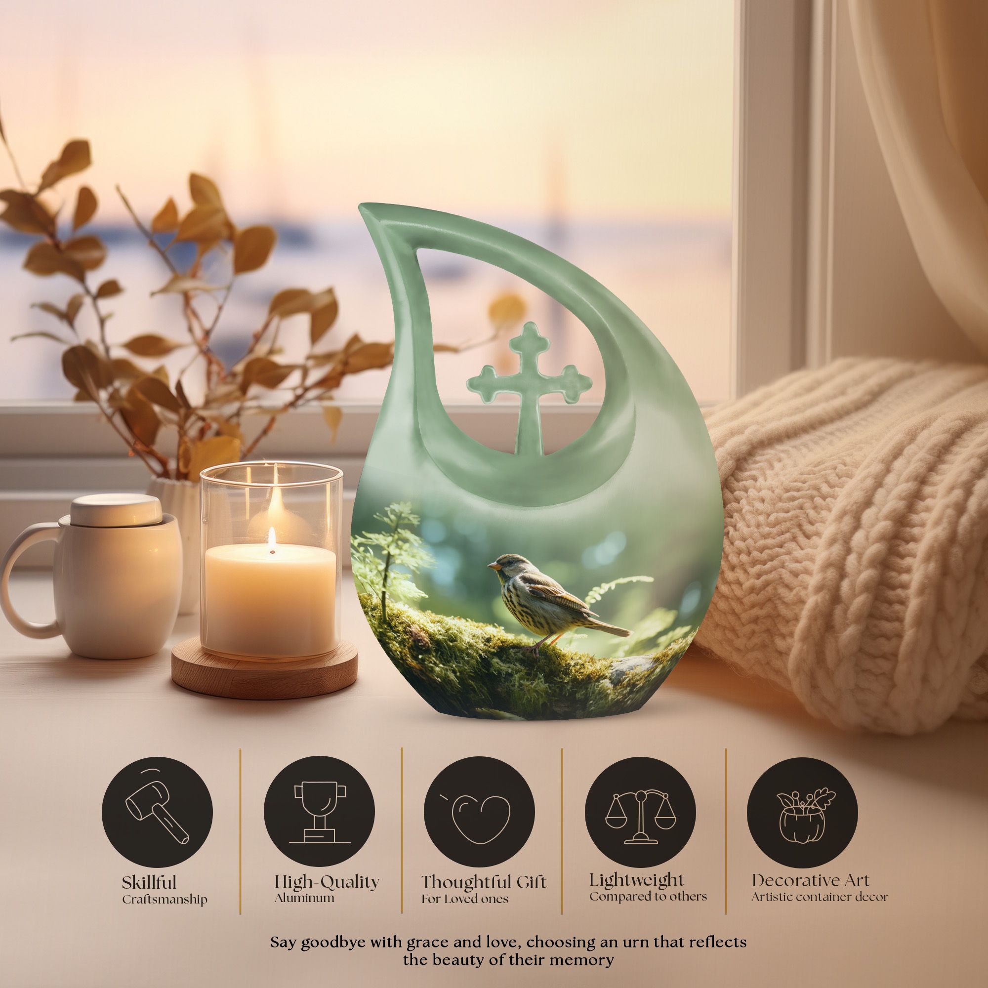 • Design: Light green teardrop urn with detailed finch motif in silver tones