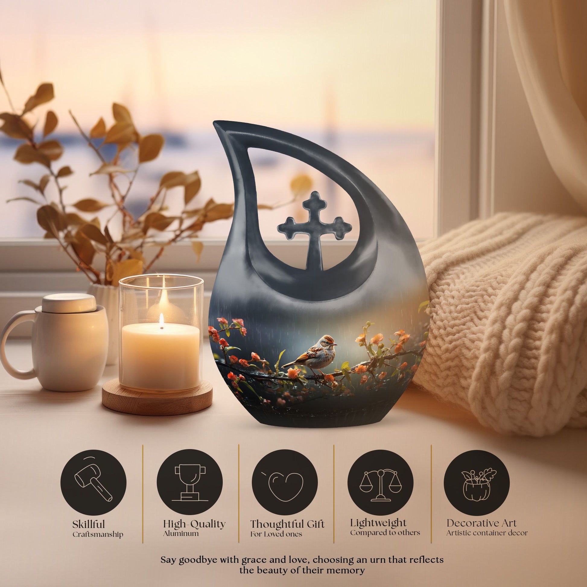 Handcrafted from durable aluminum, this cremation urn for humans features a graceful black teardrop shape adorned with a sparrow resting on a rain-touched branch — a poetic symbol of rest and renewal. Whether chosen as a cremation urn adult human or cremation urn human ash, it combines strength with artistic beauty. Families who prefer cremation urns for human ashes adult black will find this urn both dignified and emotionally resonant.