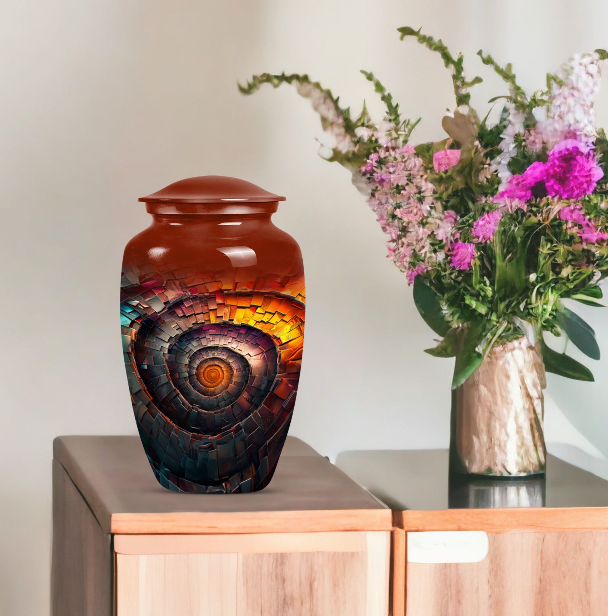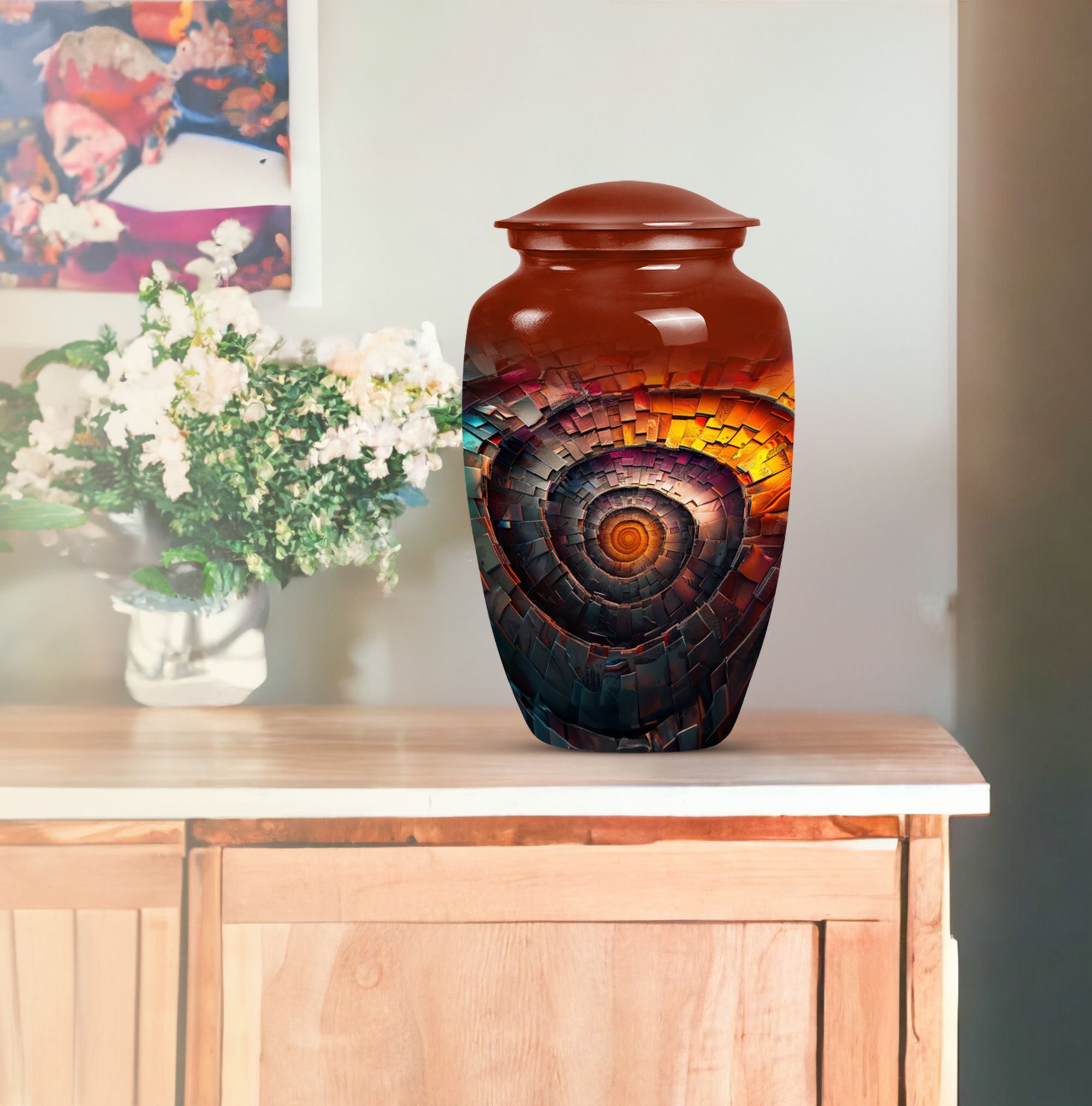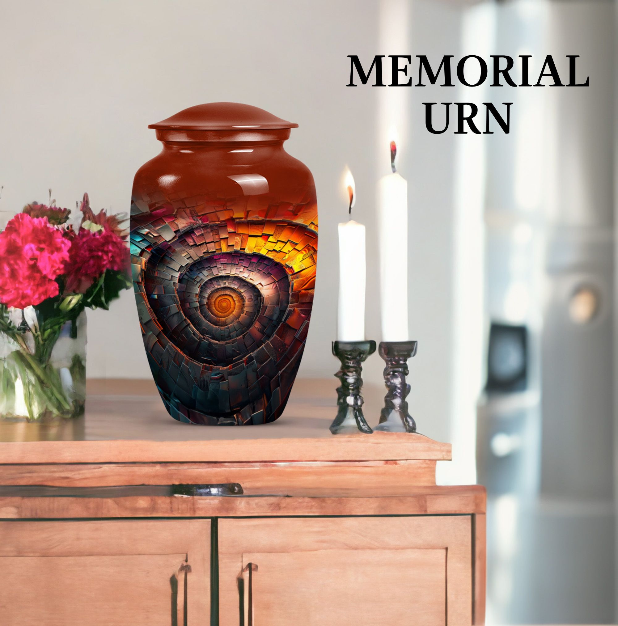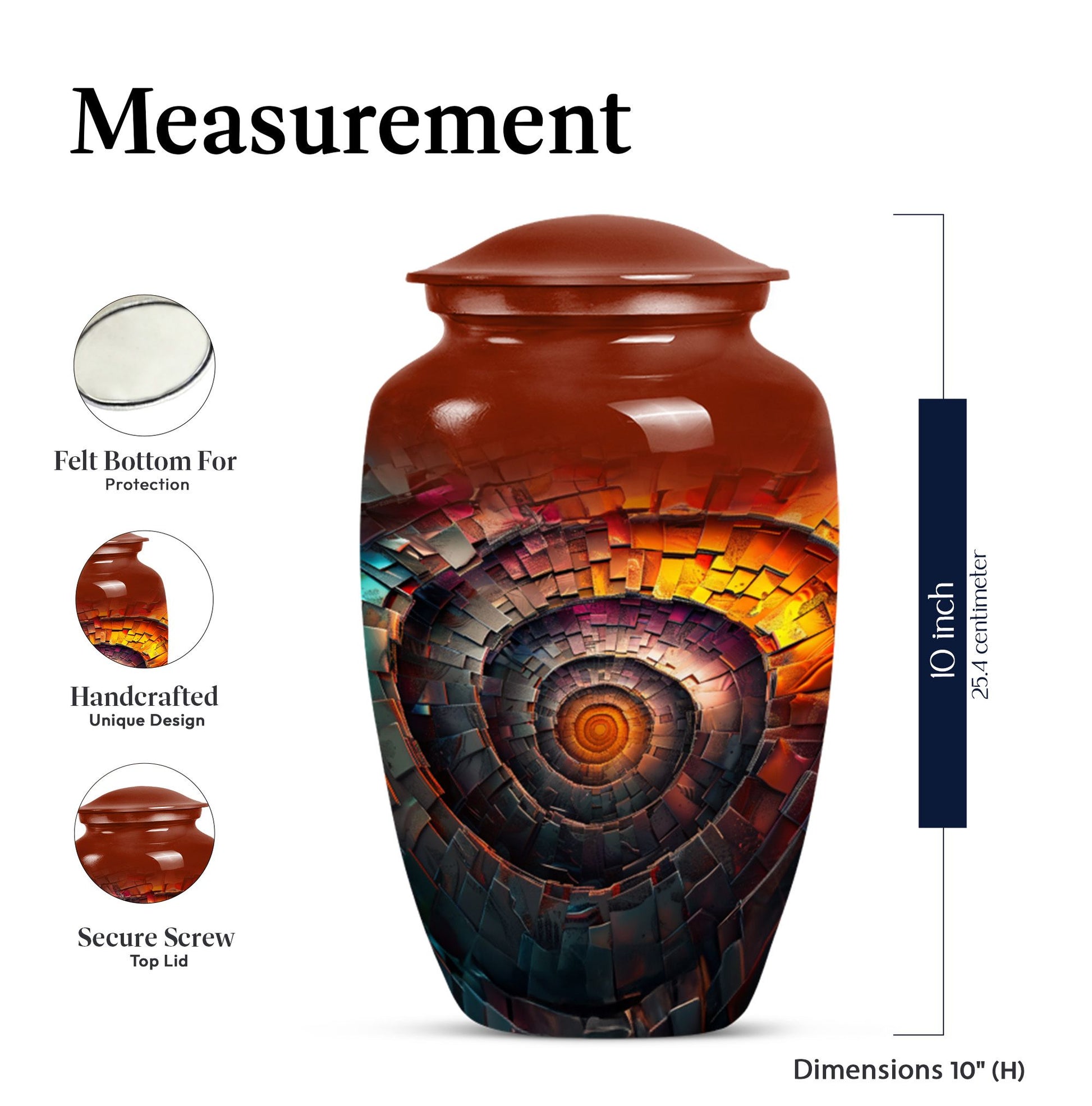 This 10-inch Classic Urn, an impressive option among our memorial urns, will respectfully hold your loves ones remains with dignity. As a spiral urn, it offers an aesthetic appeal with an abstract theme and a sleek aluminium finish. This large urn has a considerable capacity of 200 cubic inches, perfect for memorializing a strong personality. The urn weighs a sturdy 3.3 pounds and stands 10 inches tall, physically reflecting its symbolic importance. This cremation urn is ideal for men, demonstrating masculine strength even in final resting. The package includes a soft velvet pouch for the containment of ashes, preserving them over time. To enhance its value, personal customization with engraved names can also be applied, enabling customers to pay a unique tribute to their departed loved ones. For those in search of burial urns for cremation ashes, this urn offers a comprehensive solution, blending in seamlessly with any interior decor due to its classic design. Whether it's for an urn ash funeral service or a crypt, this shaped urn box serves multiple purposes beyond a standard funeral cremation urn.