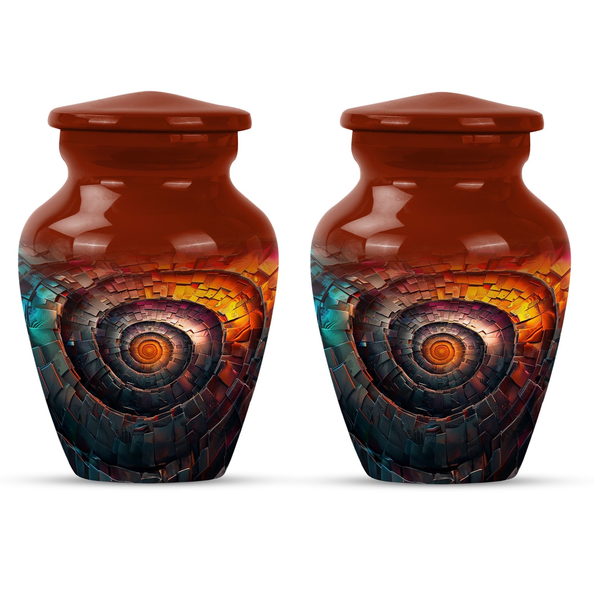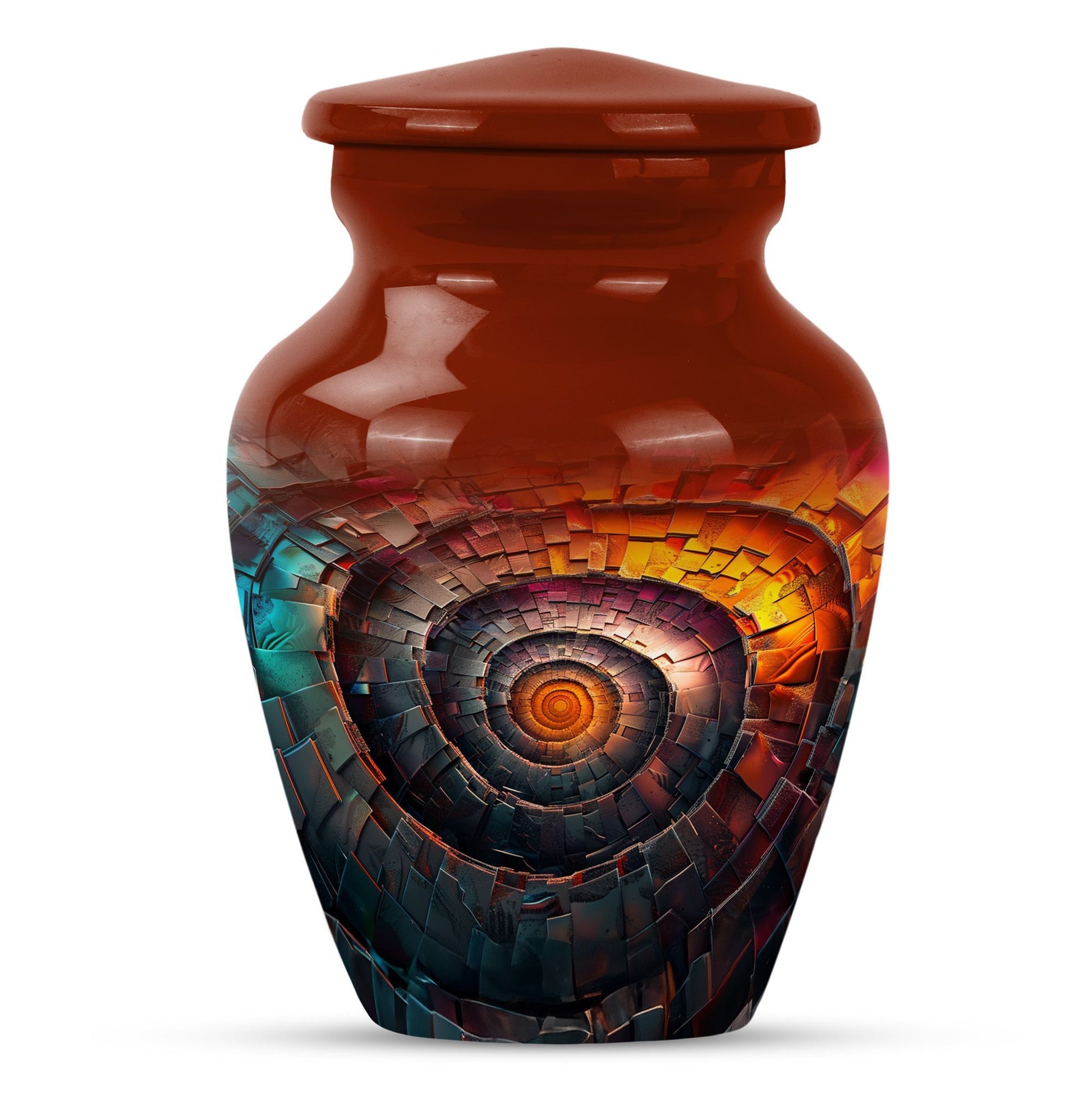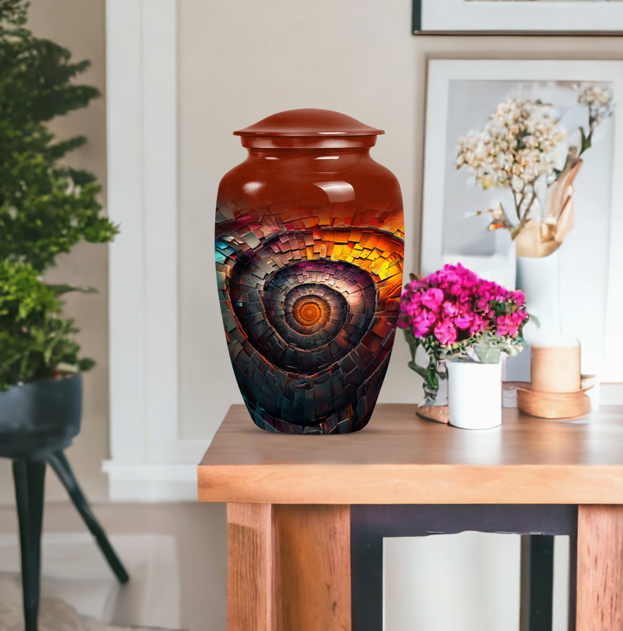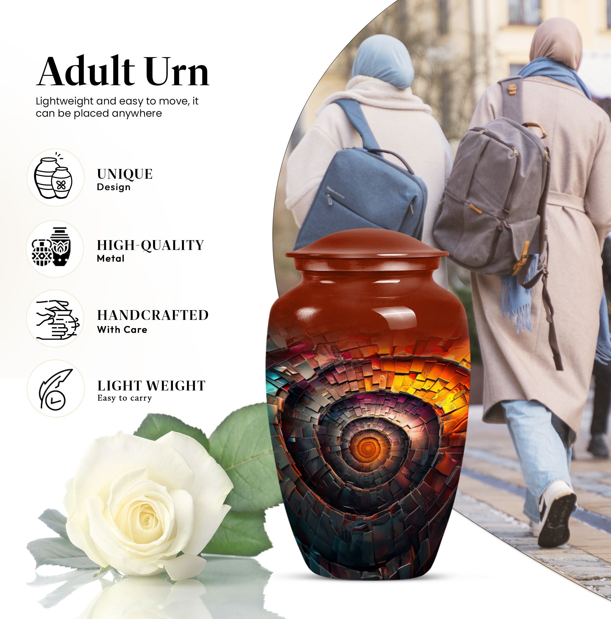 This 10-inch Classic Urn, an impressive option among our memorial urns, will respectfully hold your loves ones remains with dignity. As a spiral urn, it offers an aesthetic appeal with an abstract theme and a sleek aluminium finish. This large urn has a considerable capacity of 200 cubic inches, perfect for memorializing a strong personality. The urn weighs a sturdy 3.3 pounds and stands 10 inches tall, physically reflecting its symbolic importance. This cremation urn is ideal for men, demonstrating masculine strength even in final resting. The package includes a soft velvet pouch for the containment of ashes, preserving them over time. To enhance its value, personal customization with engraved names can also be applied, enabling customers to pay a unique tribute to their departed loved ones. For those in search of burial urns for cremation ashes, this urn offers a comprehensive solution, blending in seamlessly with any interior decor due to its classic design. Whether it's for an urn ash funeral service or a crypt, this shaped urn box serves multiple purposes beyond a standard funeral cremation urn.