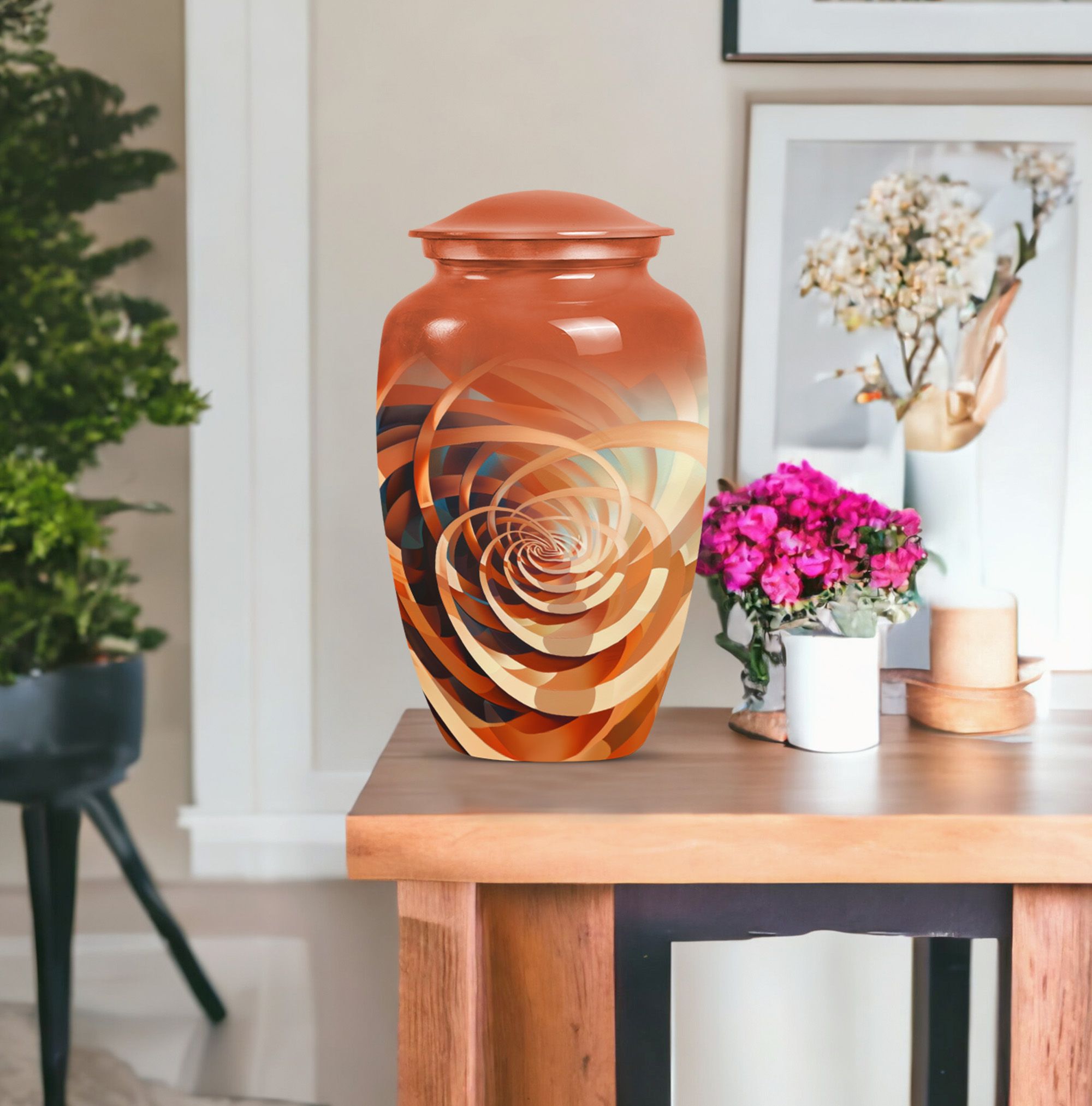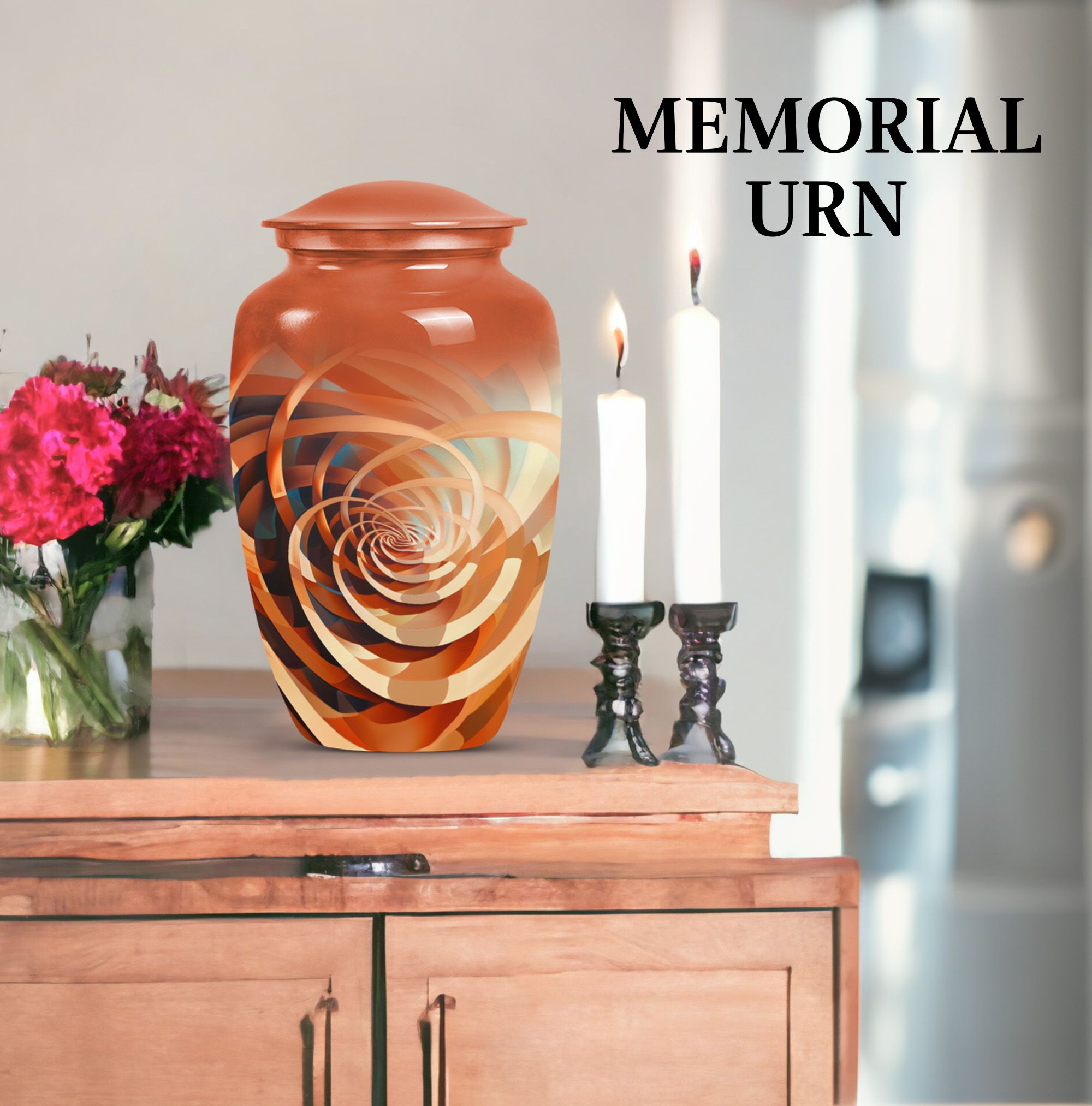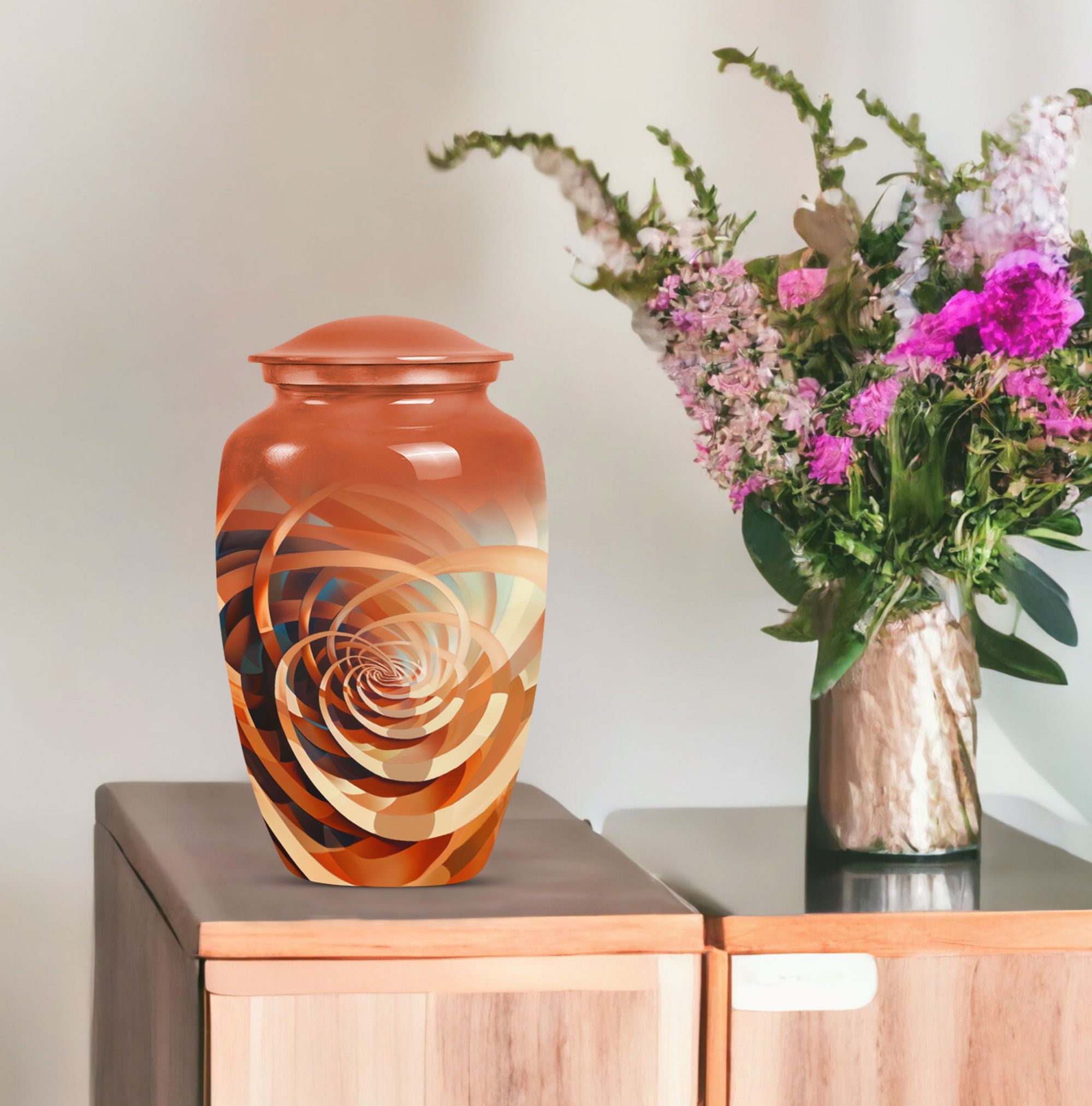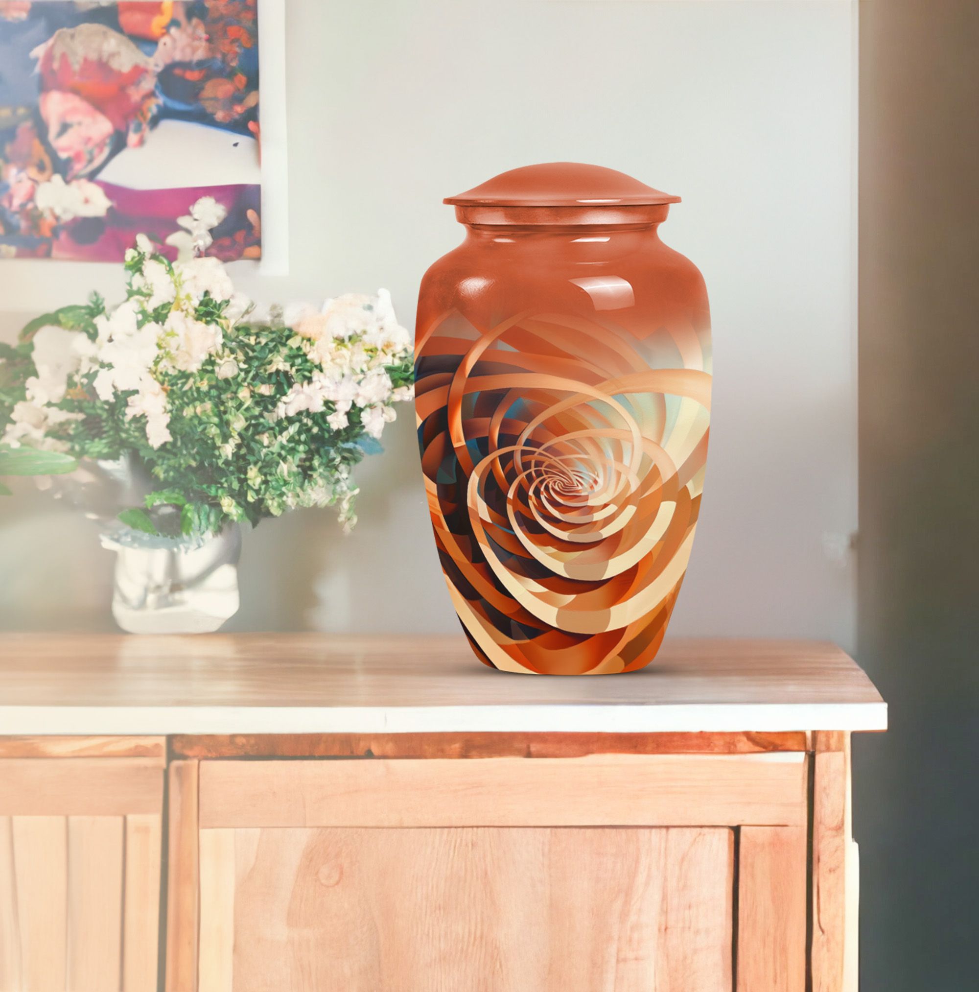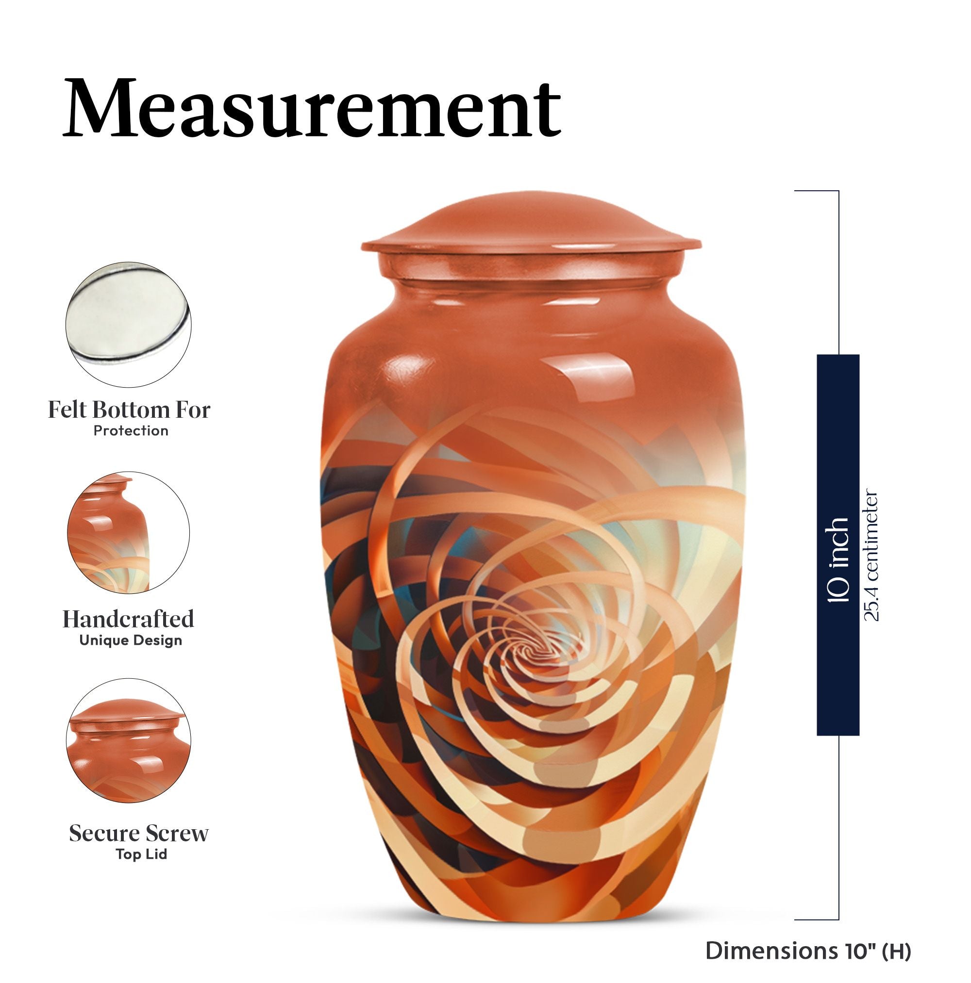 Immerse yourself in the act of memorializing with our meticulously handcrafted spiral Urn, a thoughtful way to commemorate loved ones. This unique cremation urn, made of high-quality Aluminium, stands at 10 inches in height and features a capacity of 200 cubic inches - ideally suited for preserving precious human ashes. The urn is delivered along with a supple velvet pouch, intended to hold the ashes securely. Its 3.3 pounds weight ensures stability, and despite its large size, it maintains an elegant aesthetic. We offer personalization for this piece with engraved names, adding an emotional touch to this abstract-themed memorial large urns for human ashes. Often sought out by those seeking cremation urns for men, it is also a noteworthy choice for preserving ashes of adult females. Show your respect, love, and remembrance uniquely.