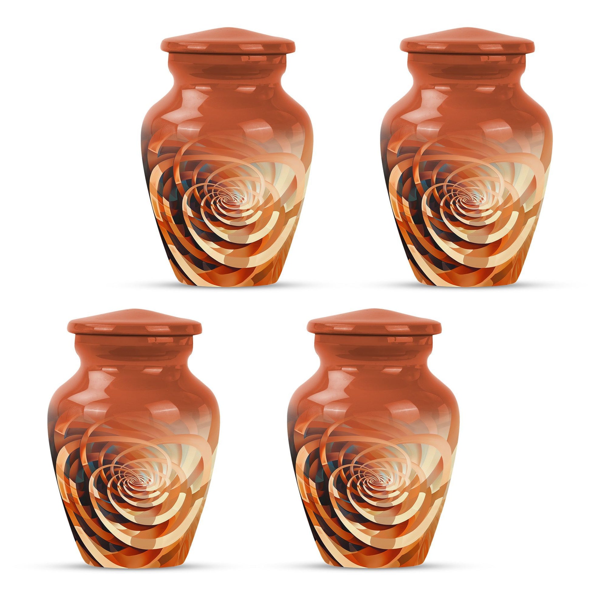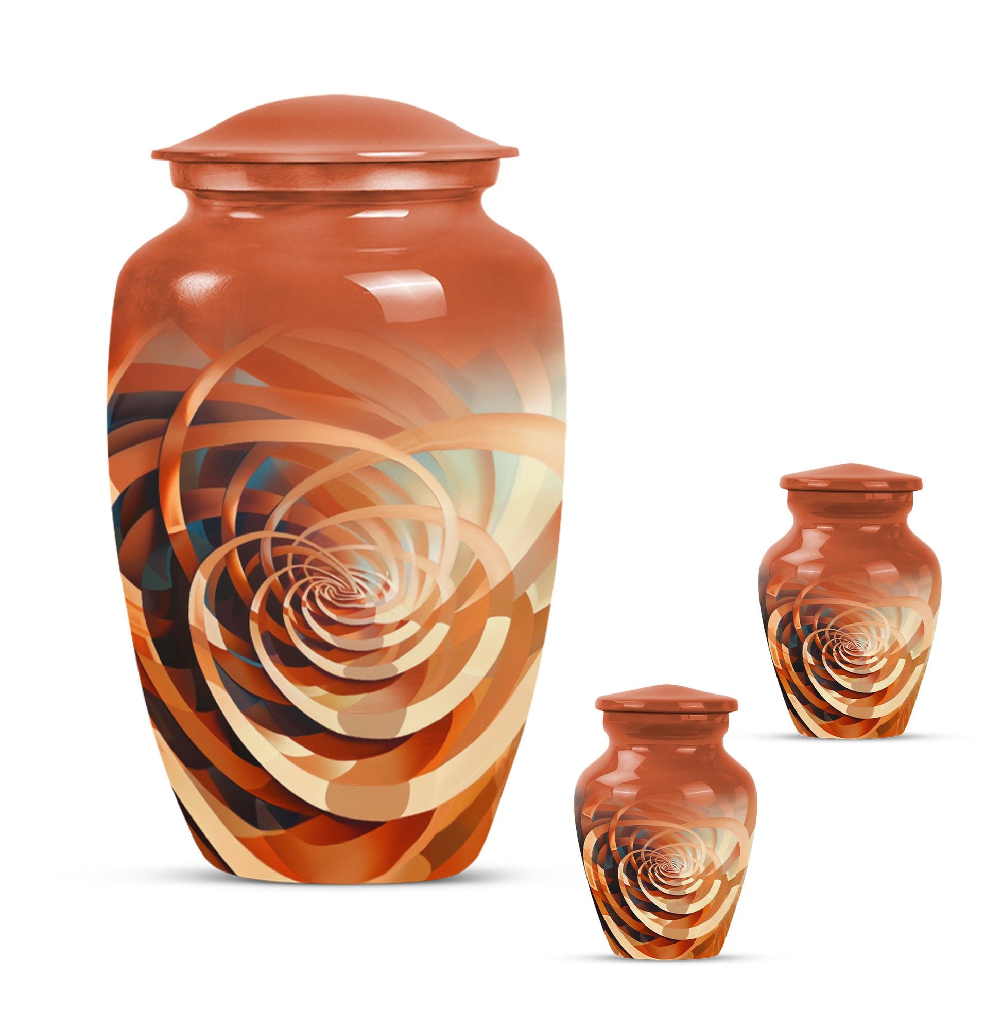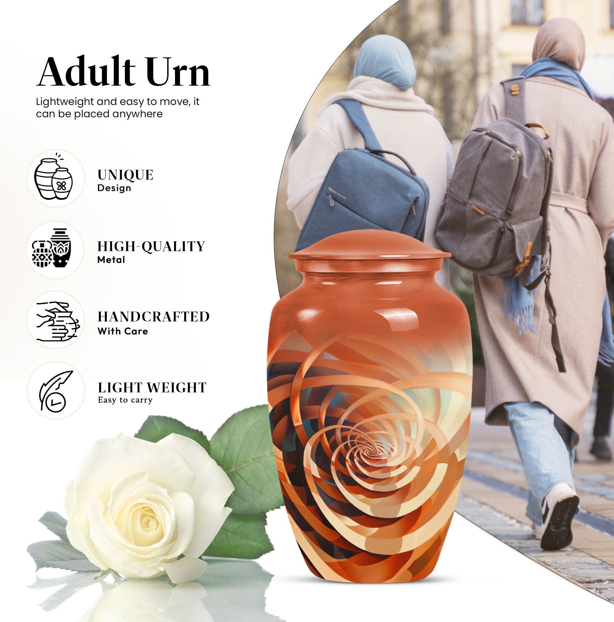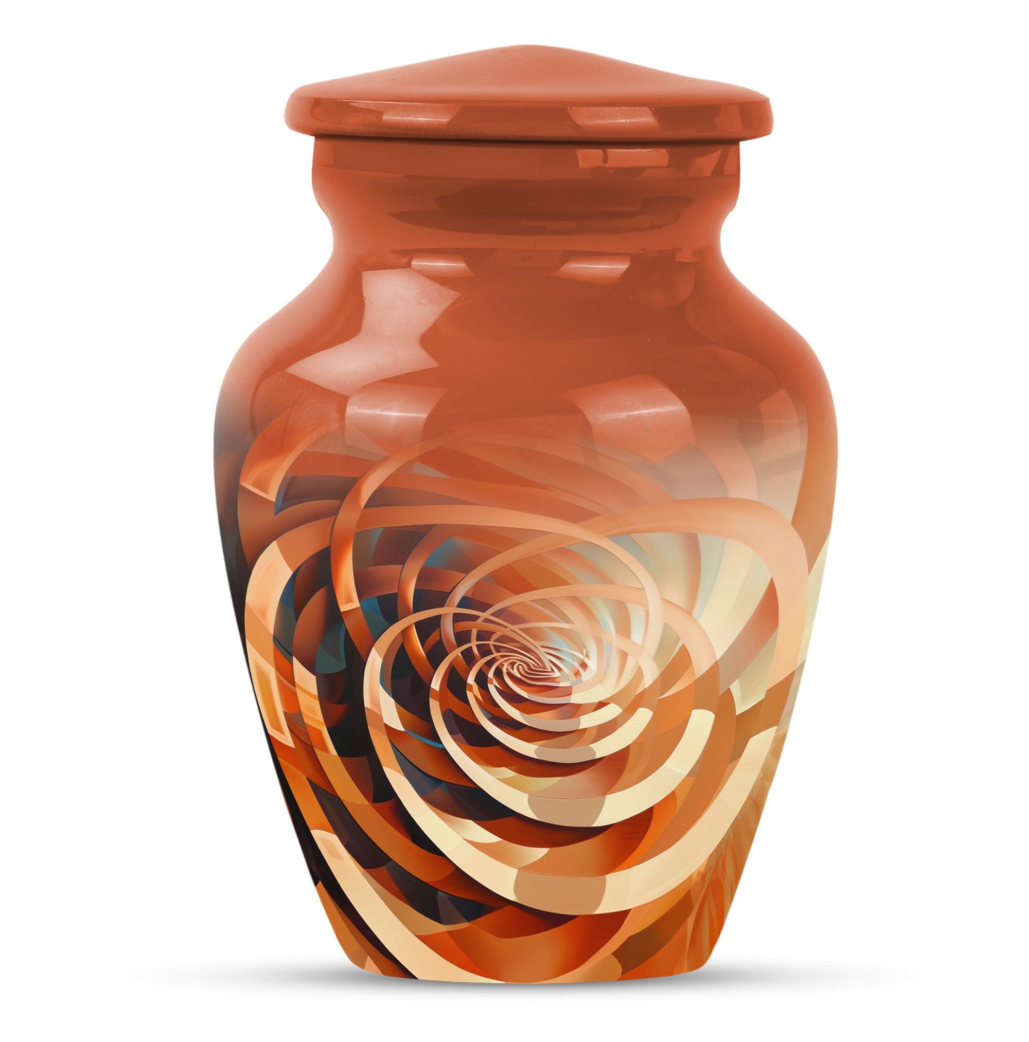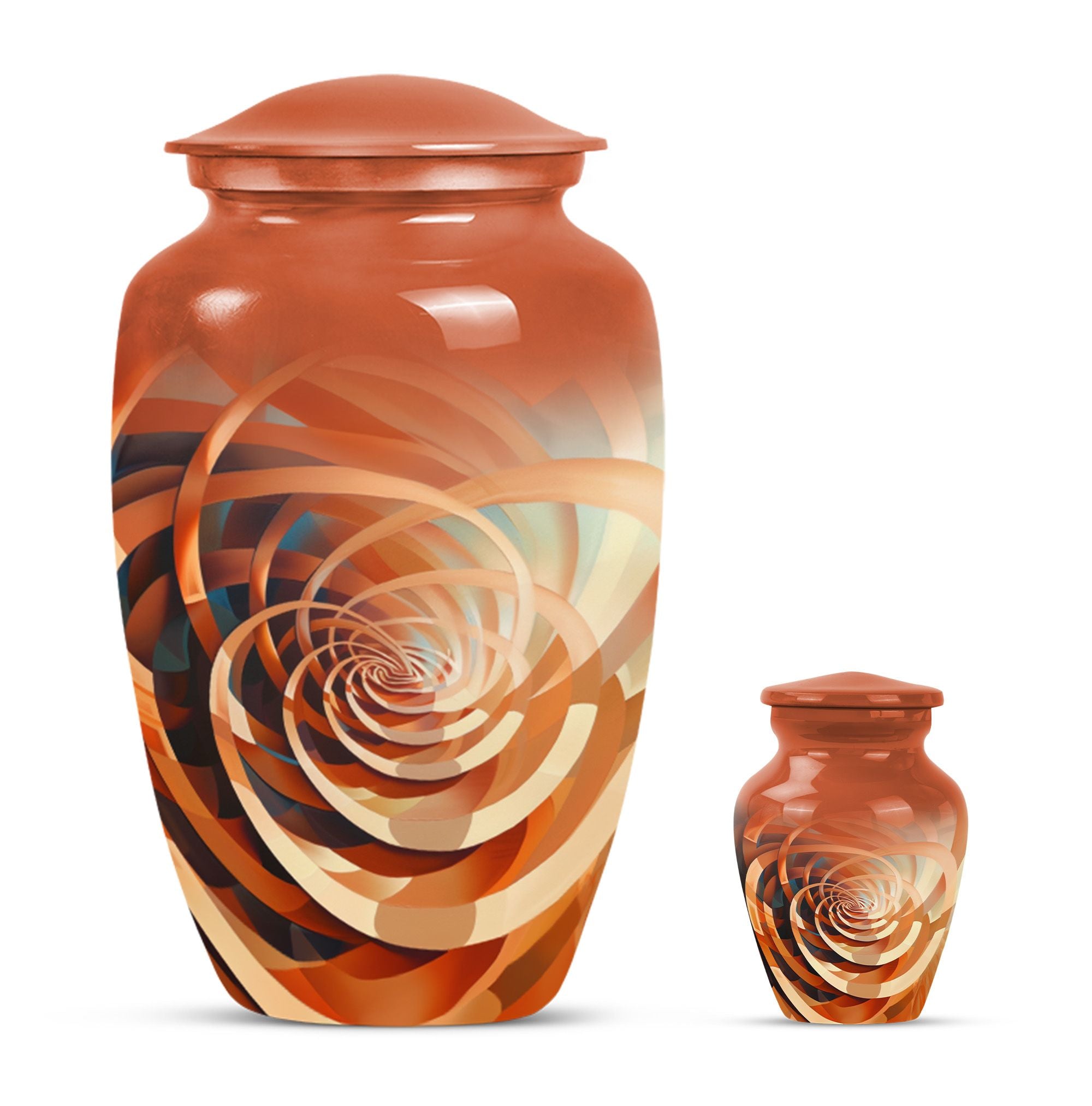 Immerse yourself in the act of memorializing with our meticulously handcrafted spiral Urn, a thoughtful way to commemorate loved ones. This unique cremation urn, made of high-quality Aluminium, stands at 10 inches in height and features a capacity of 200 cubic inches - ideally suited for preserving precious human ashes. The urn is delivered along with a supple velvet pouch, intended to hold the ashes securely. Its 3.3 pounds weight ensures stability, and despite its large size, it maintains an elegant aesthetic. We offer personalization for this piece with engraved names, adding an emotional touch to this abstract-themed memorial large urns for human ashes. Often sought out by those seeking cremation urns for men, it is also a noteworthy choice for preserving ashes of adult females. Show your respect, love, and remembrance uniquely.