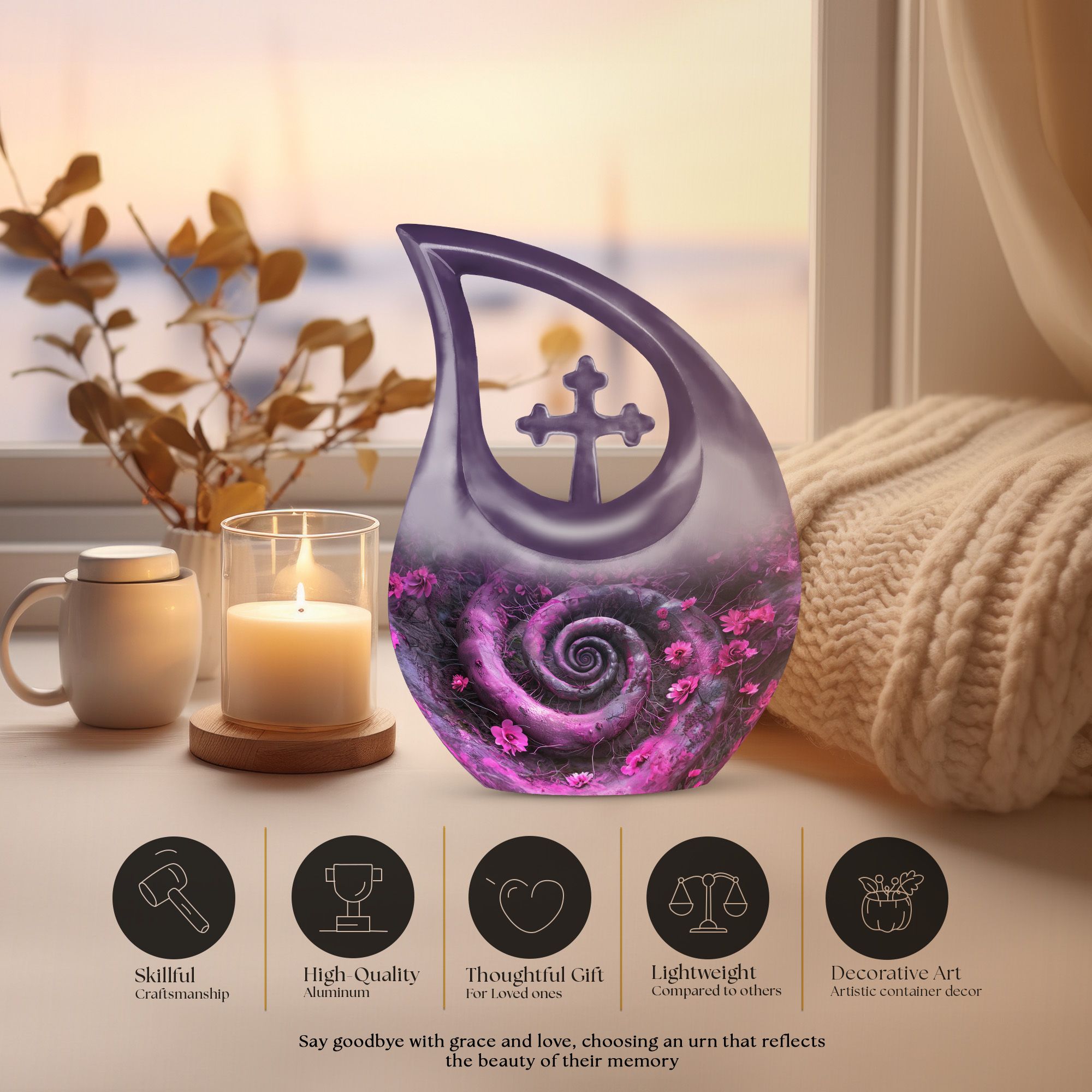 Crafted from durable aluminium, this personalized cremation urn features a vibrant purple finish with an elegant spiral pattern. The secure screw-top lid ensures the ashes remain protected at all times. Designed to serve as adult urns women select for memorial display or as men urns for human ashes, it offers versatility and style. Families looking for small urns women or ashes keepsake women options will appreciate its refined craftsmanship and adaptable design, suitable for both women adult urn needs and urn ashes men tributes.