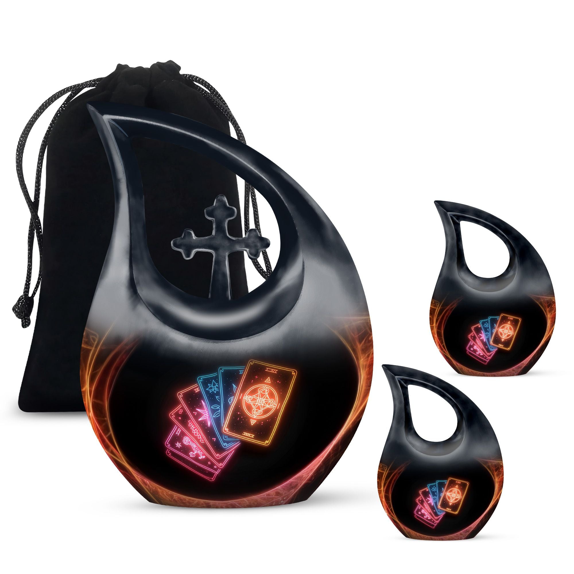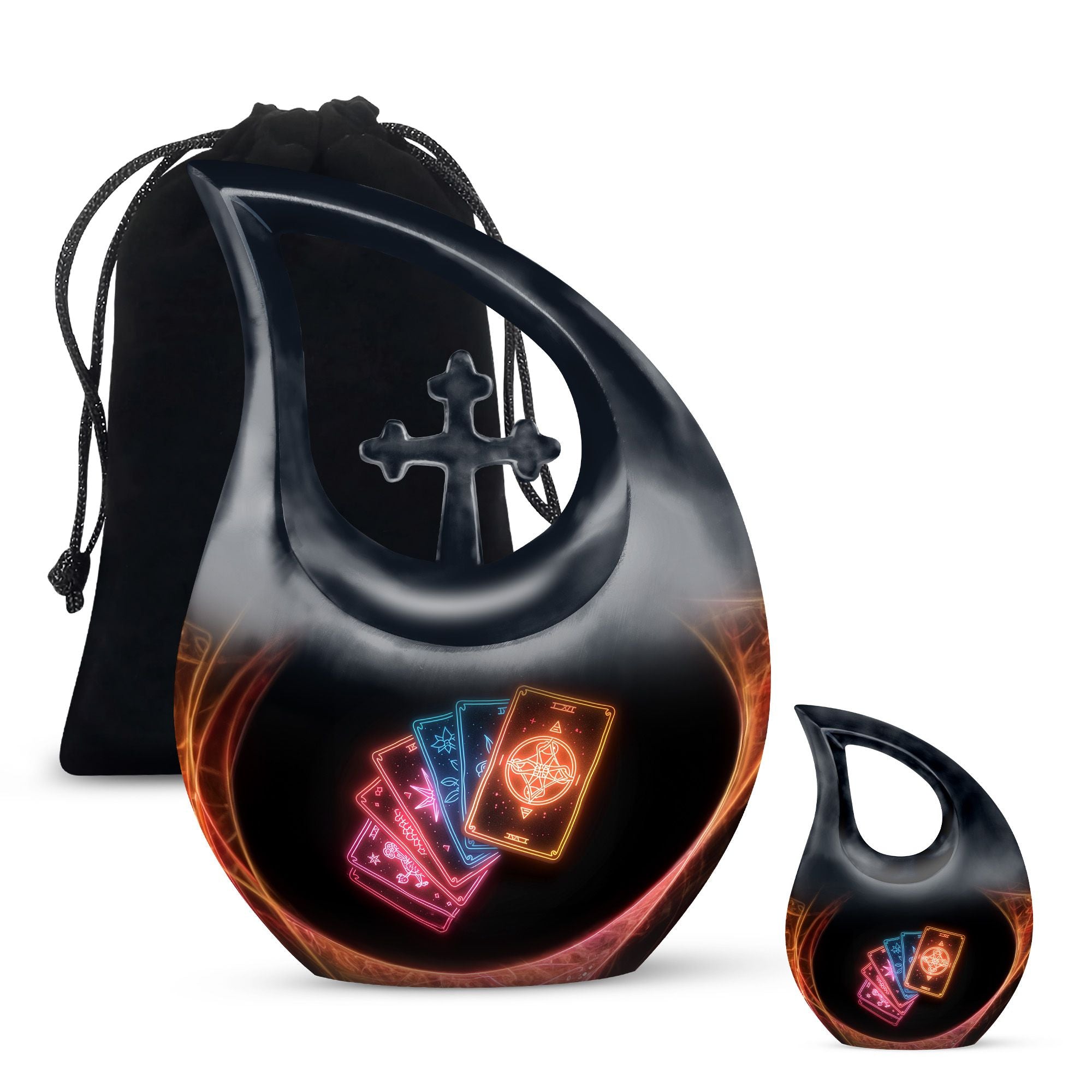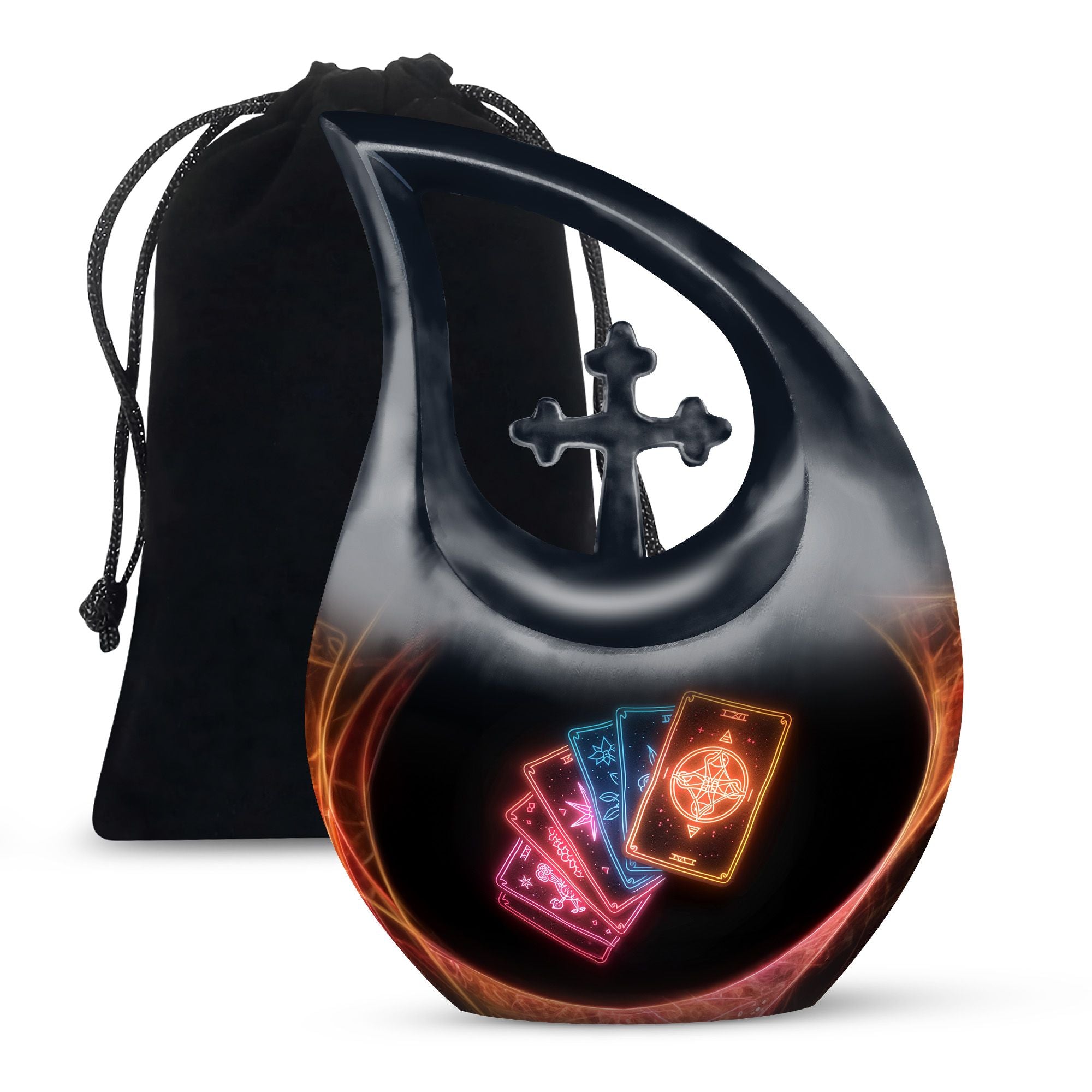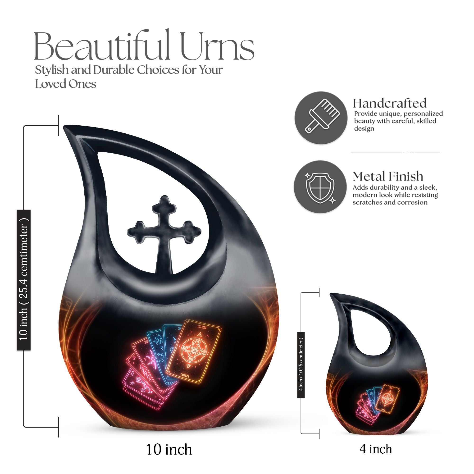 Embrace tranquility and honor the life of a loved one with our 10-inch Tarot Urn. This Cross Drop large urn embodies both beauty and the spiritual essence of life's journey. It is a perfect memorial option that encapsulates the emblem of love and faith. Crafted from high-quality Aluminium, it weighs a solid 3.3 pounds and stands 10 inches tall. The urn's capacity is a spacious 200 cubic inches, ready to respectfully hold the ashes. As part of our personal touch, we offer customization, enabling you to personalize these memorial urns with engraved names, adding a unique meaningful dimension to the commemoration. The package also includes a velvet pouch designed for the containment of your loved one's remains. This beautiful urn and funeral solution provides a versatile fit for usage indoors or as an outdoor urn, respectfully echoing the necessity of remembrance in everyone’s heart. So when you search for 'Urns For Cremated Remains' or 'Beautiful Urns', remember our Tarot Urn - a double urn that dignifies the passage of time with grace and respect.