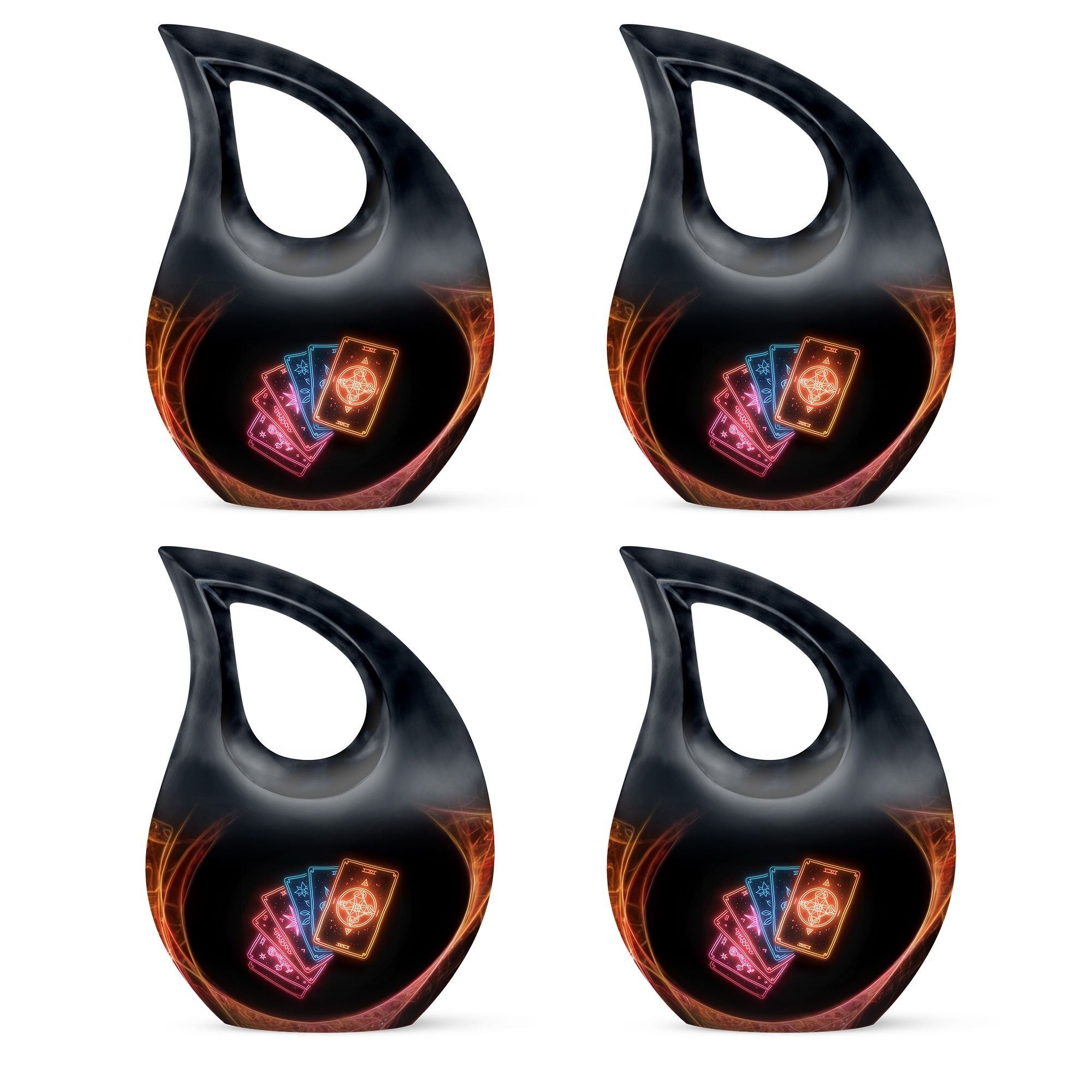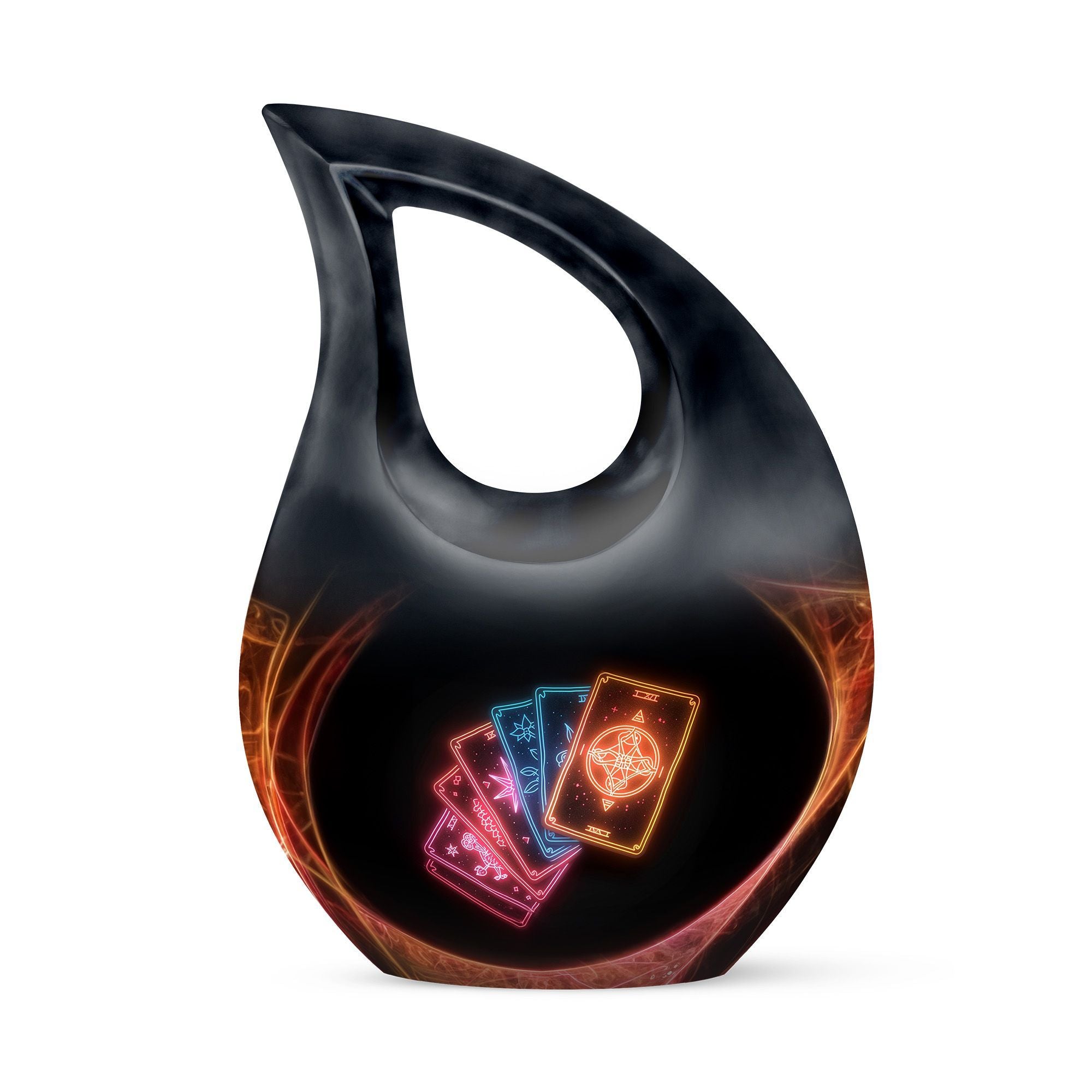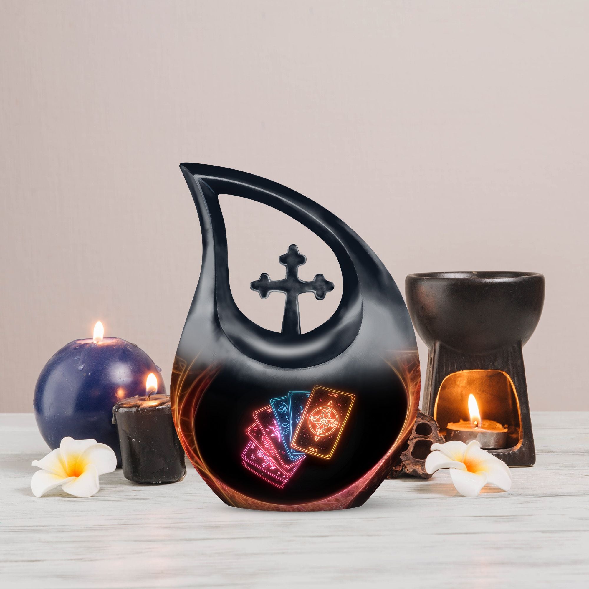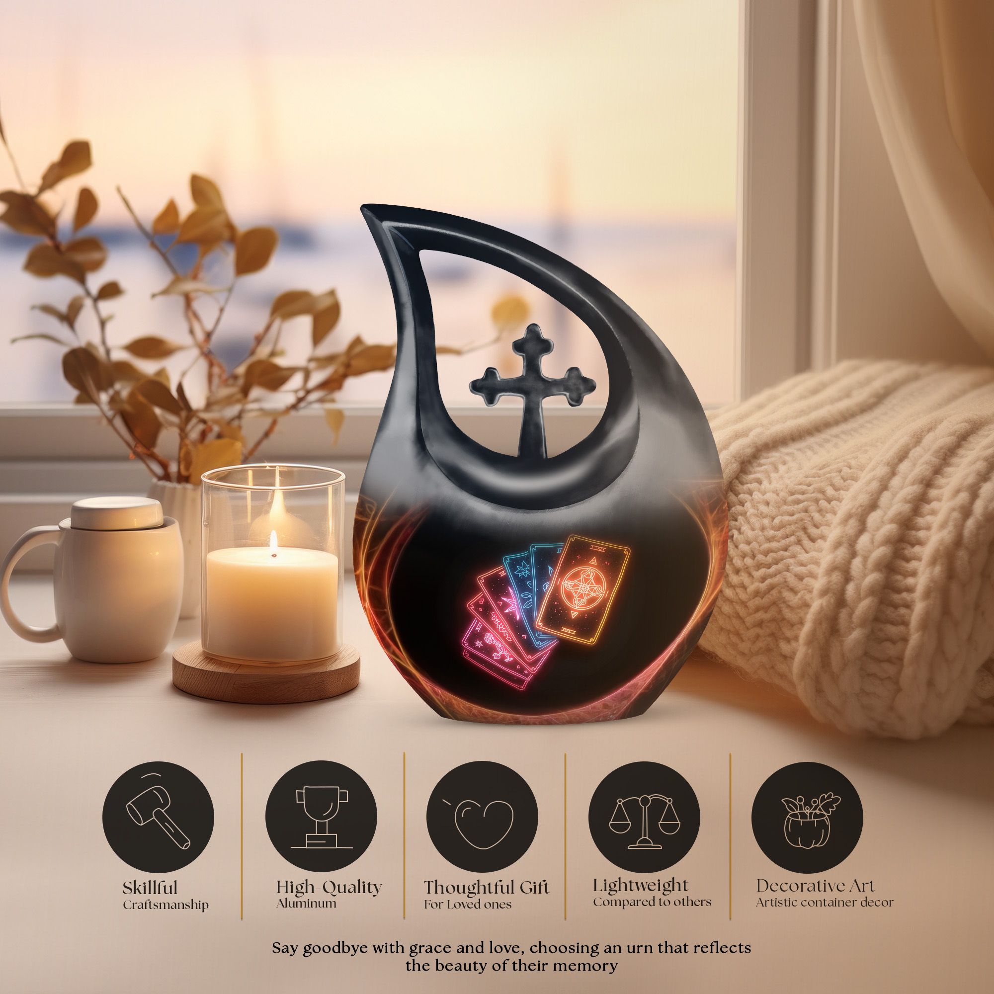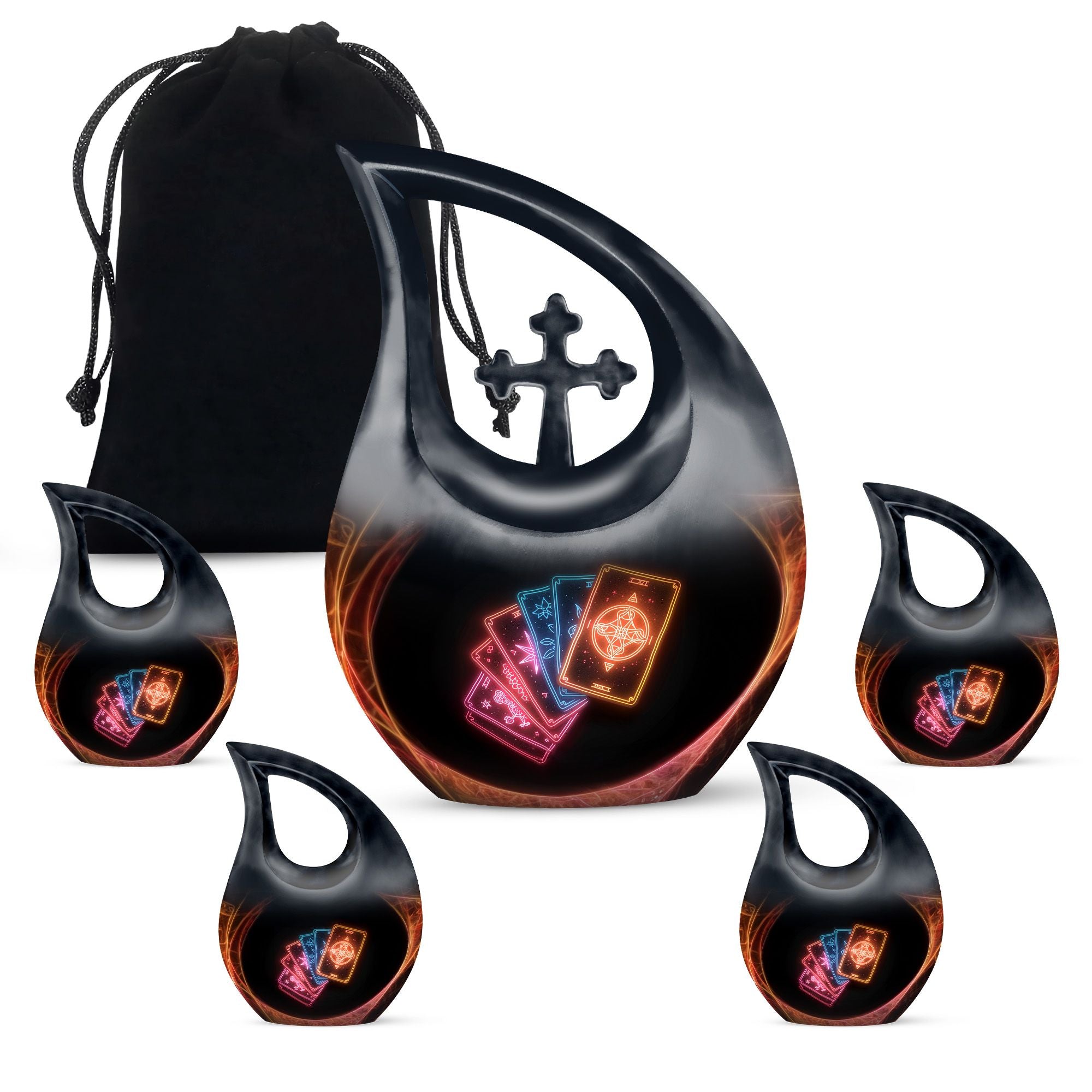 Embrace tranquility and honor the life of a loved one with our 10-inch Tarot Urn. This Cross Drop large urn embodies both beauty and the spiritual essence of life's journey. It is a perfect memorial option that encapsulates the emblem of love and faith. Crafted from high-quality Aluminium, it weighs a solid 3.3 pounds and stands 10 inches tall. The urn's capacity is a spacious 200 cubic inches, ready to respectfully hold the ashes. As part of our personal touch, we offer customization, enabling you to personalize these memorial urns with engraved names, adding a unique meaningful dimension to the commemoration. The package also includes a velvet pouch designed for the containment of your loved one's remains. This beautiful urn and funeral solution provides a versatile fit for usage indoors or as an outdoor urn, respectfully echoing the necessity of remembrance in everyone’s heart. So when you search for 'Urns For Cremated Remains' or 'Beautiful Urns', remember our Tarot Urn - a double urn that dignifies the passage of time with grace and respect.